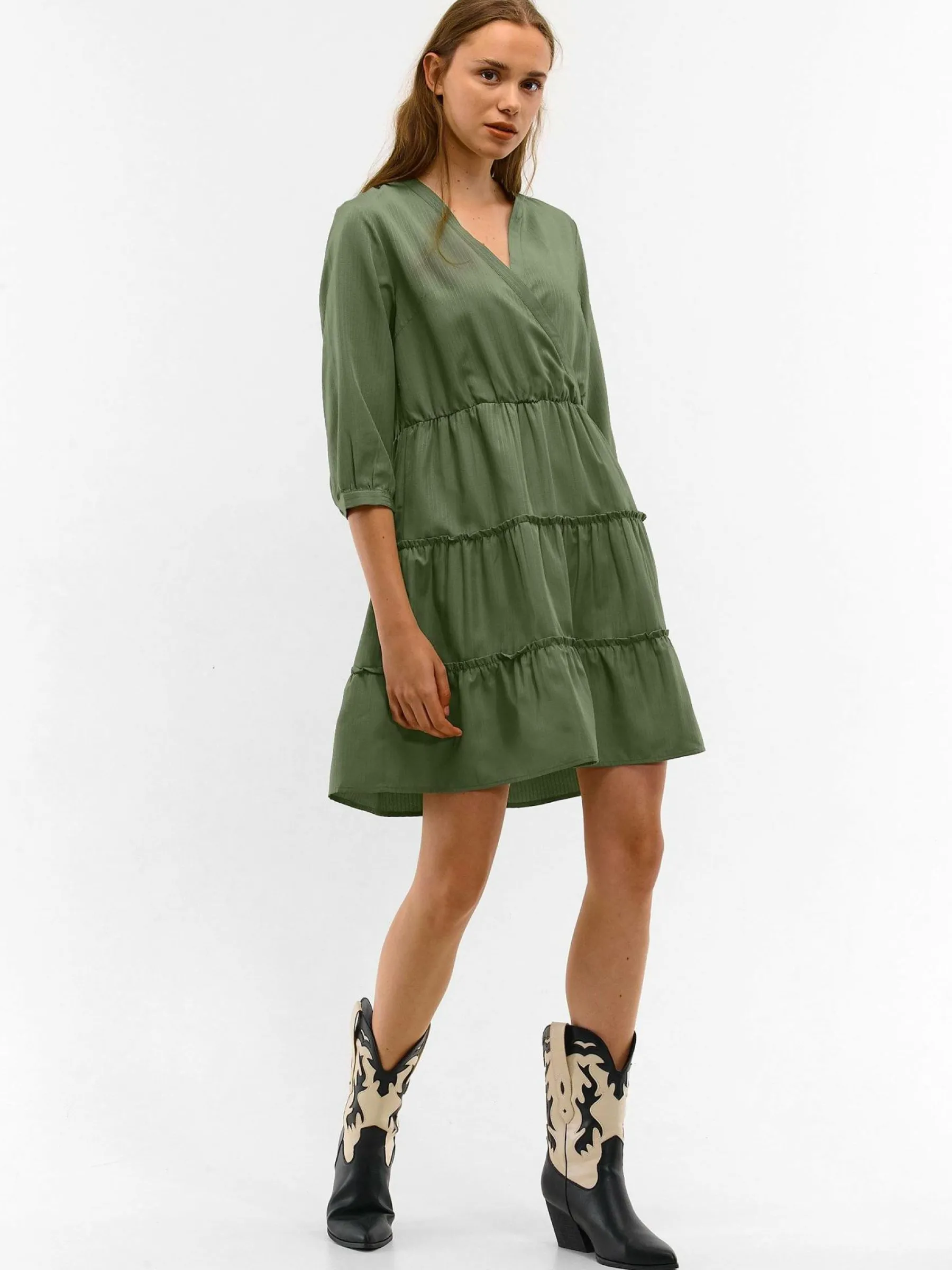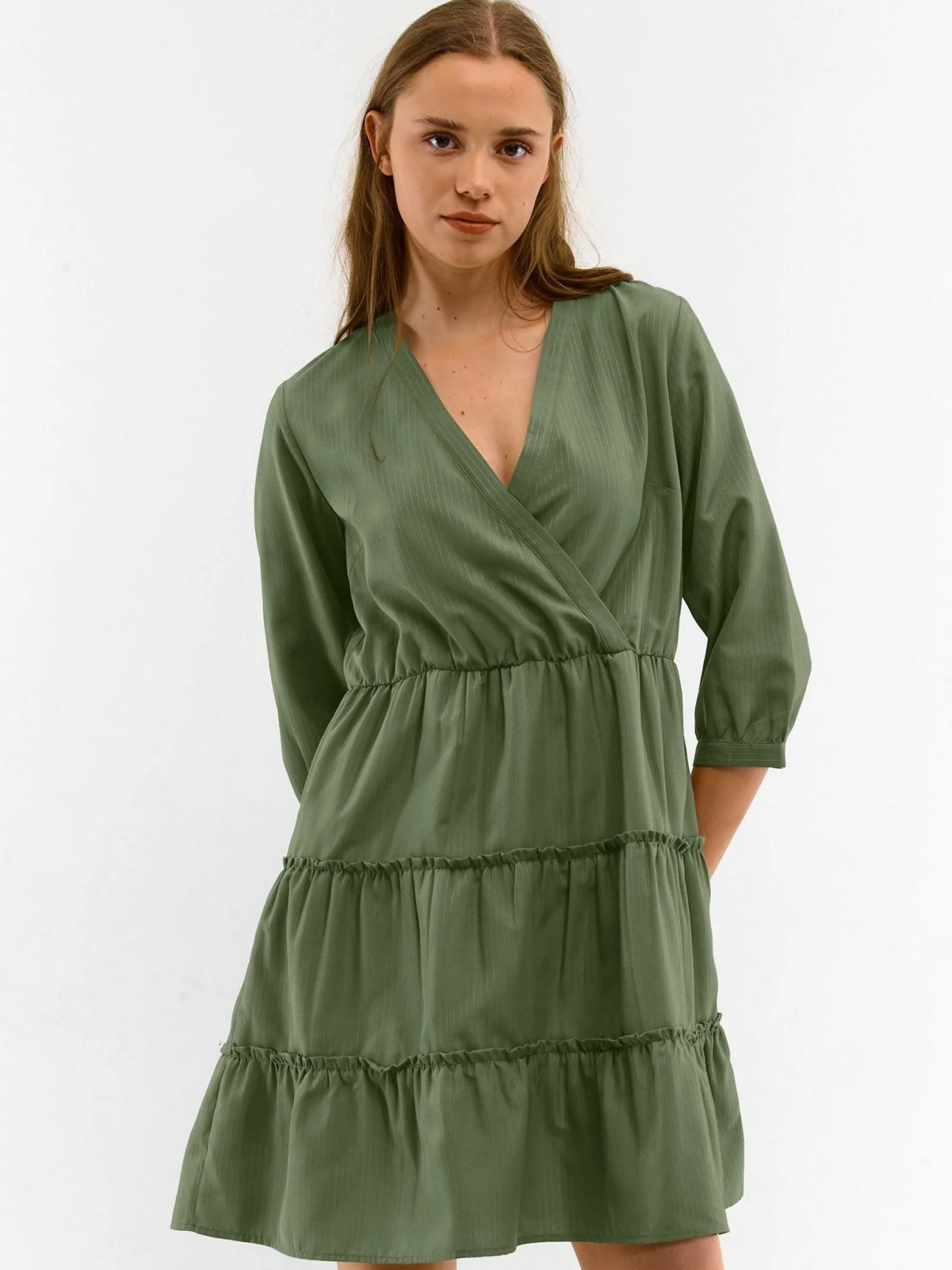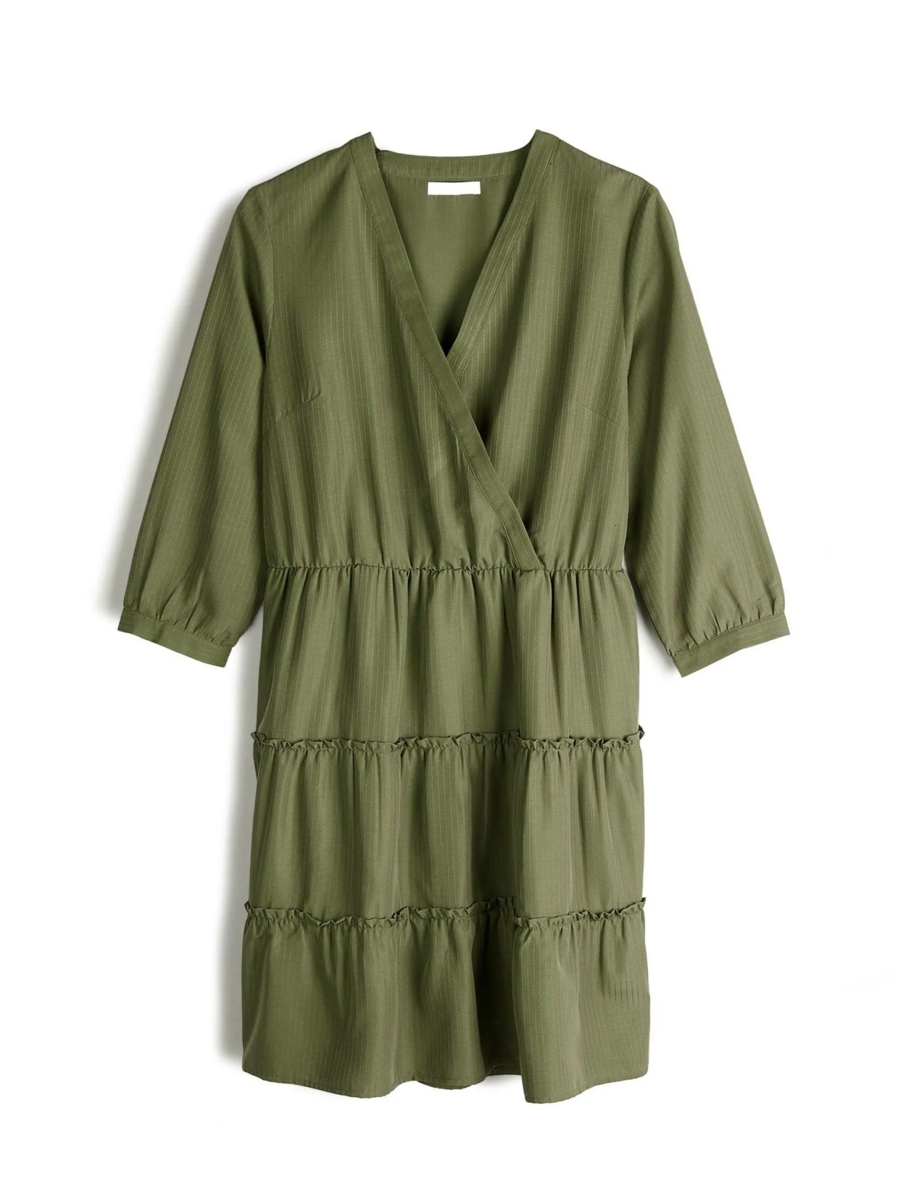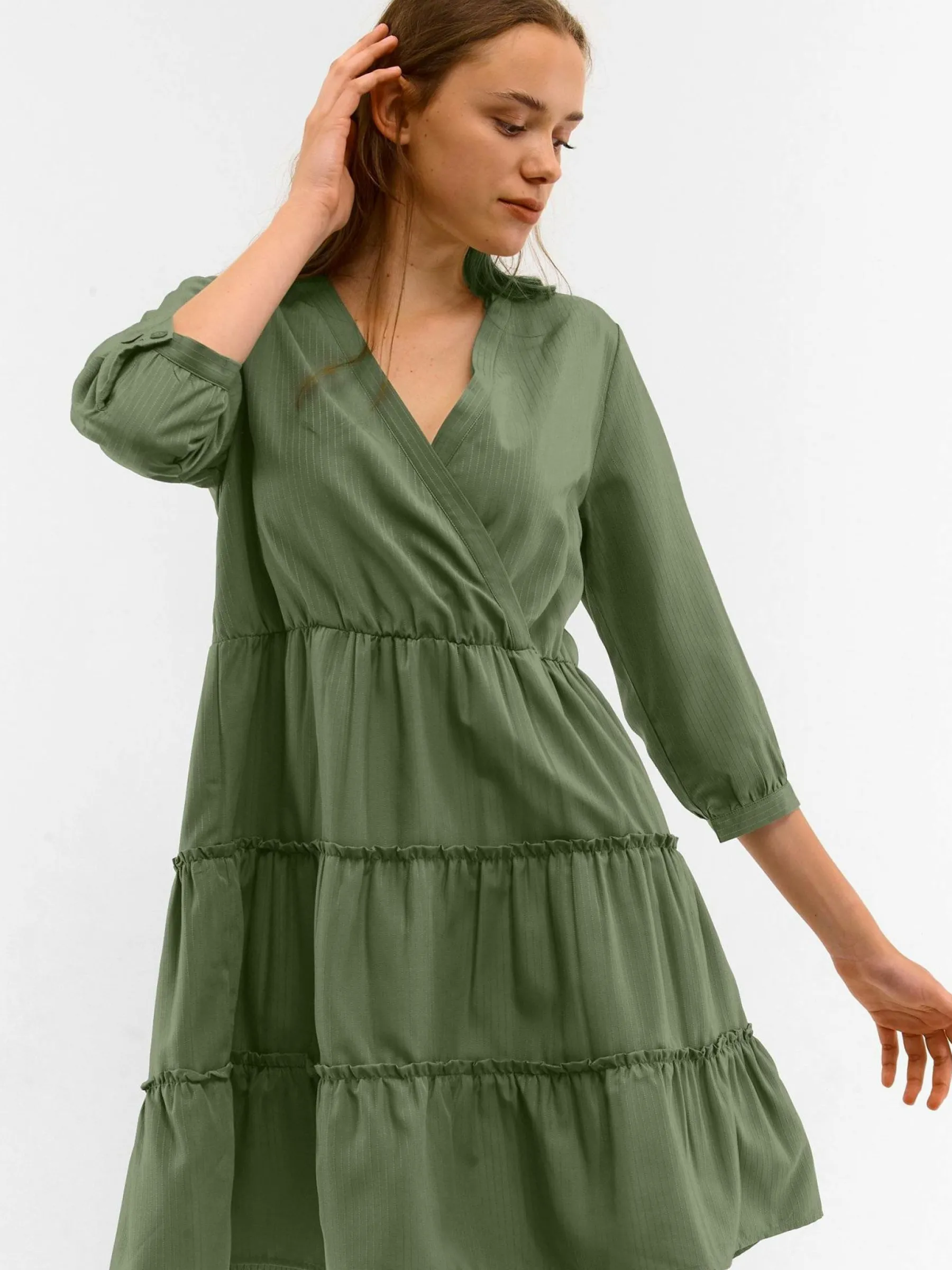Kolor: khakiKrój: z falbaną, kopertówkiTyp: sukienkaRekaw: rękaw 3/4Długość: miniPattern style: pojedynczy kolorD…