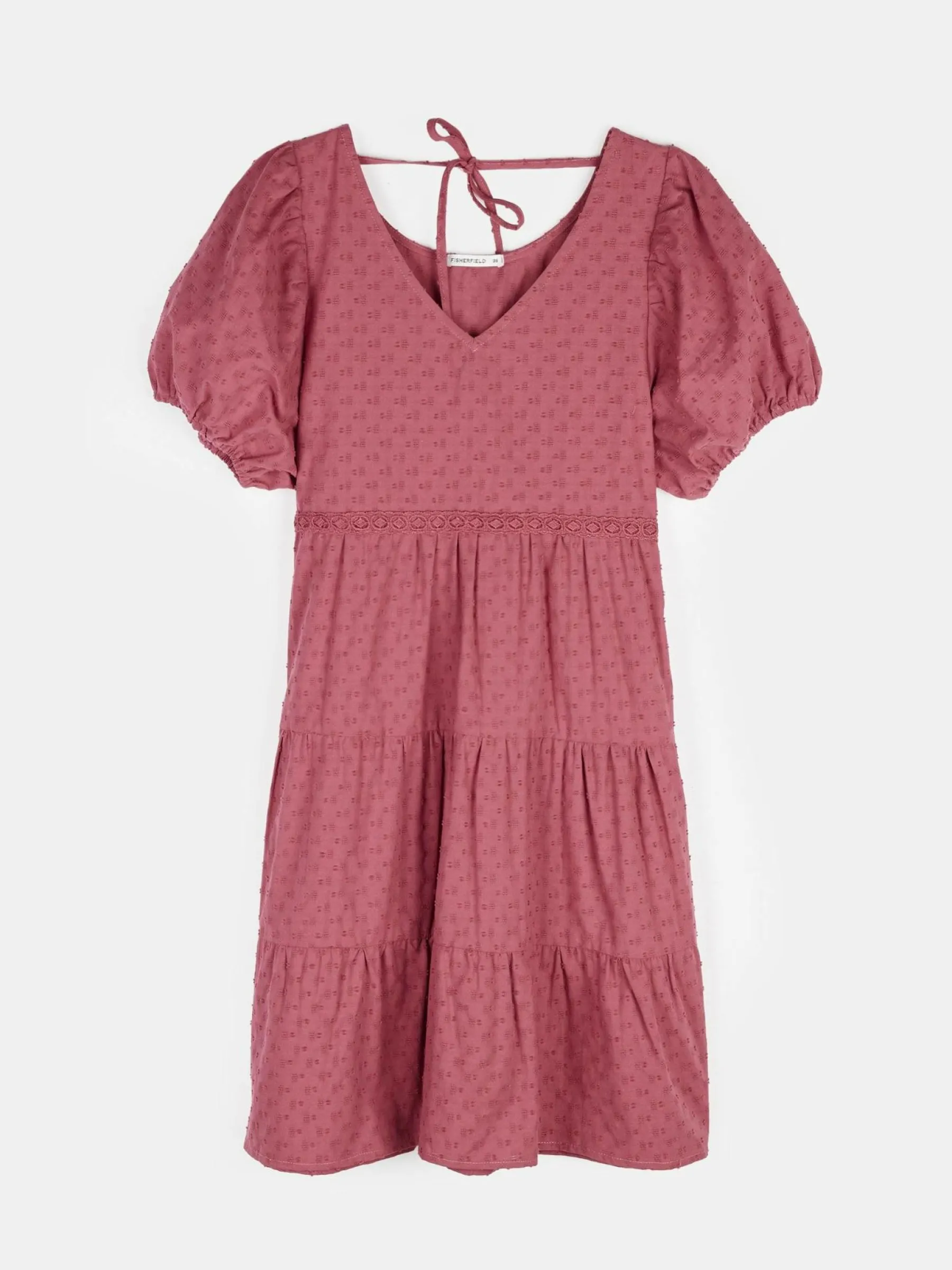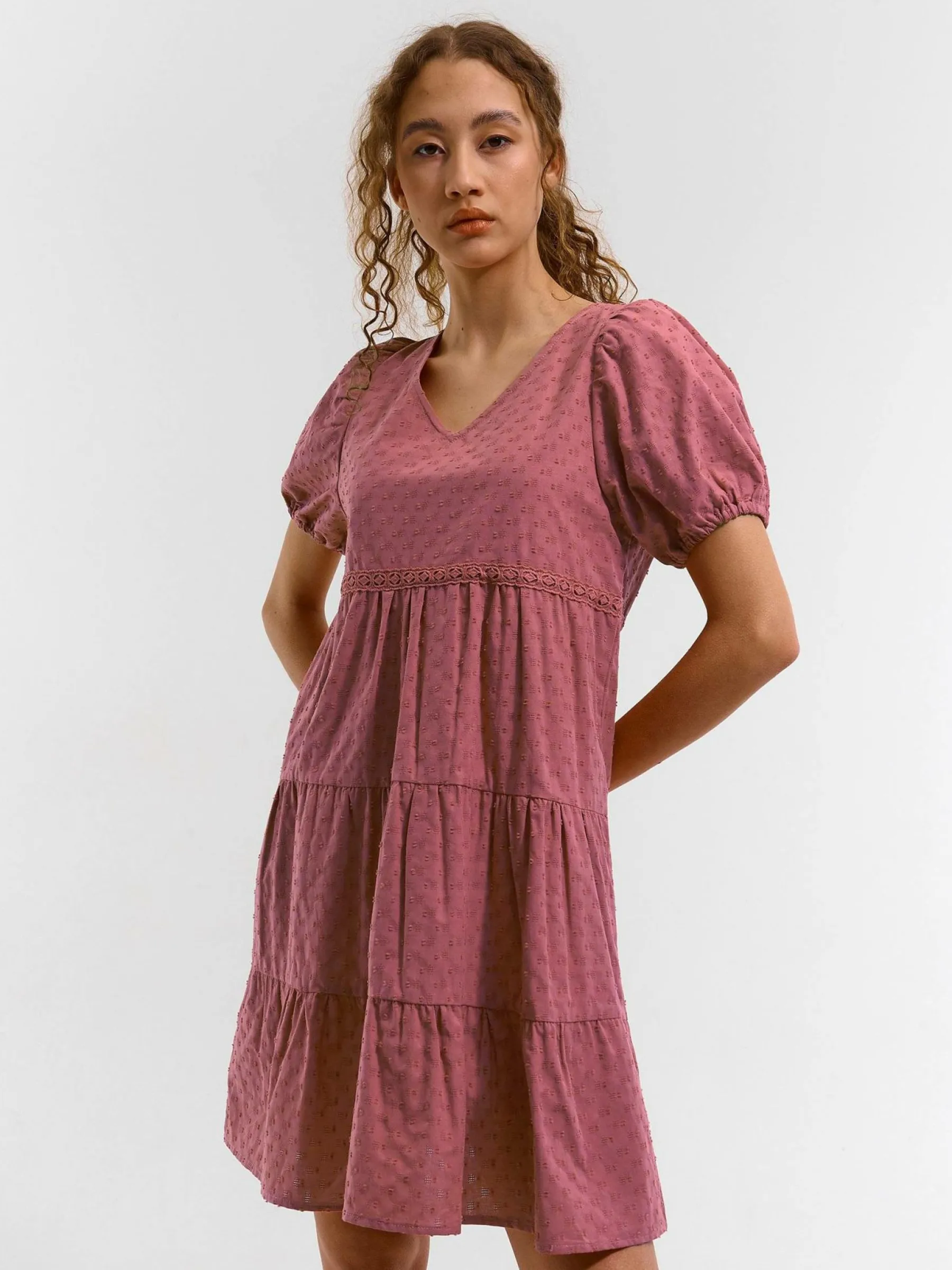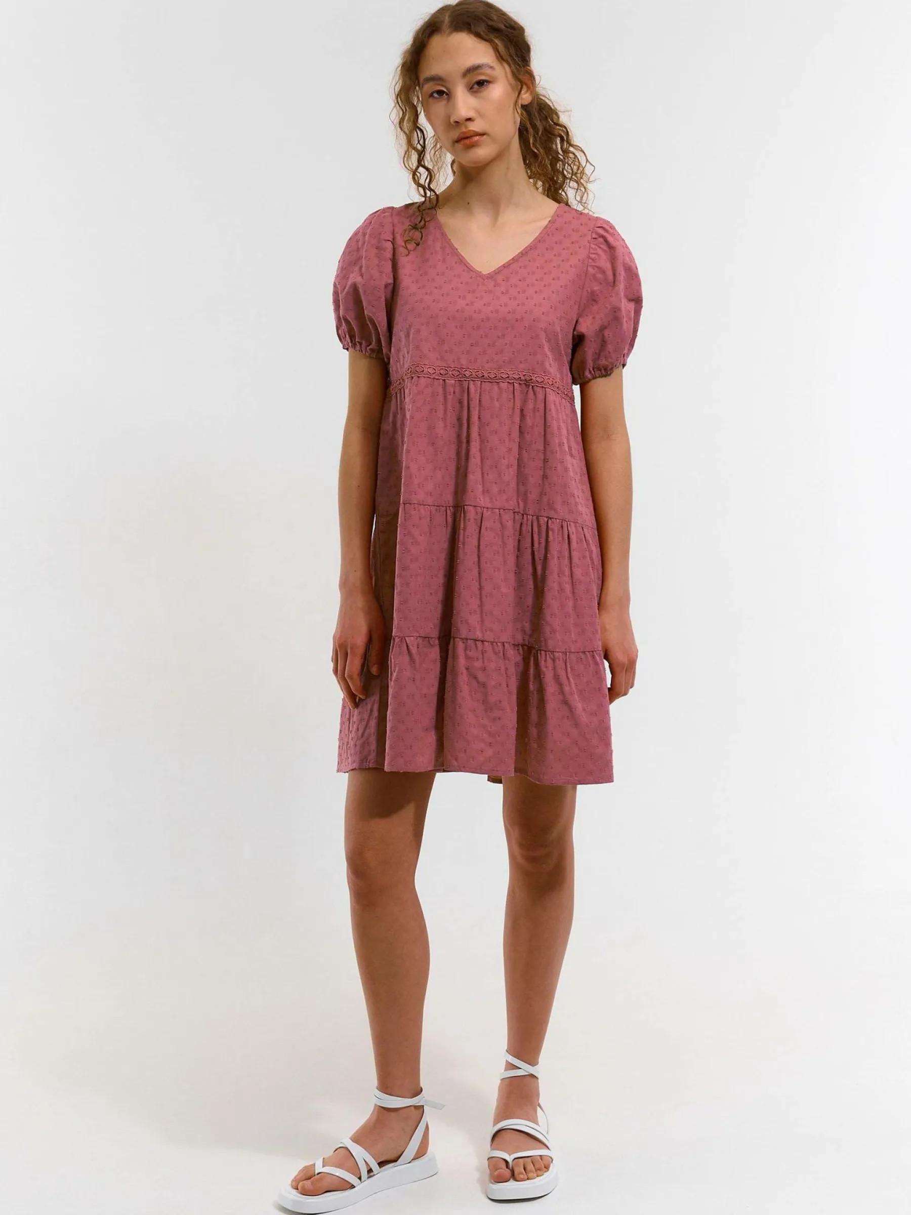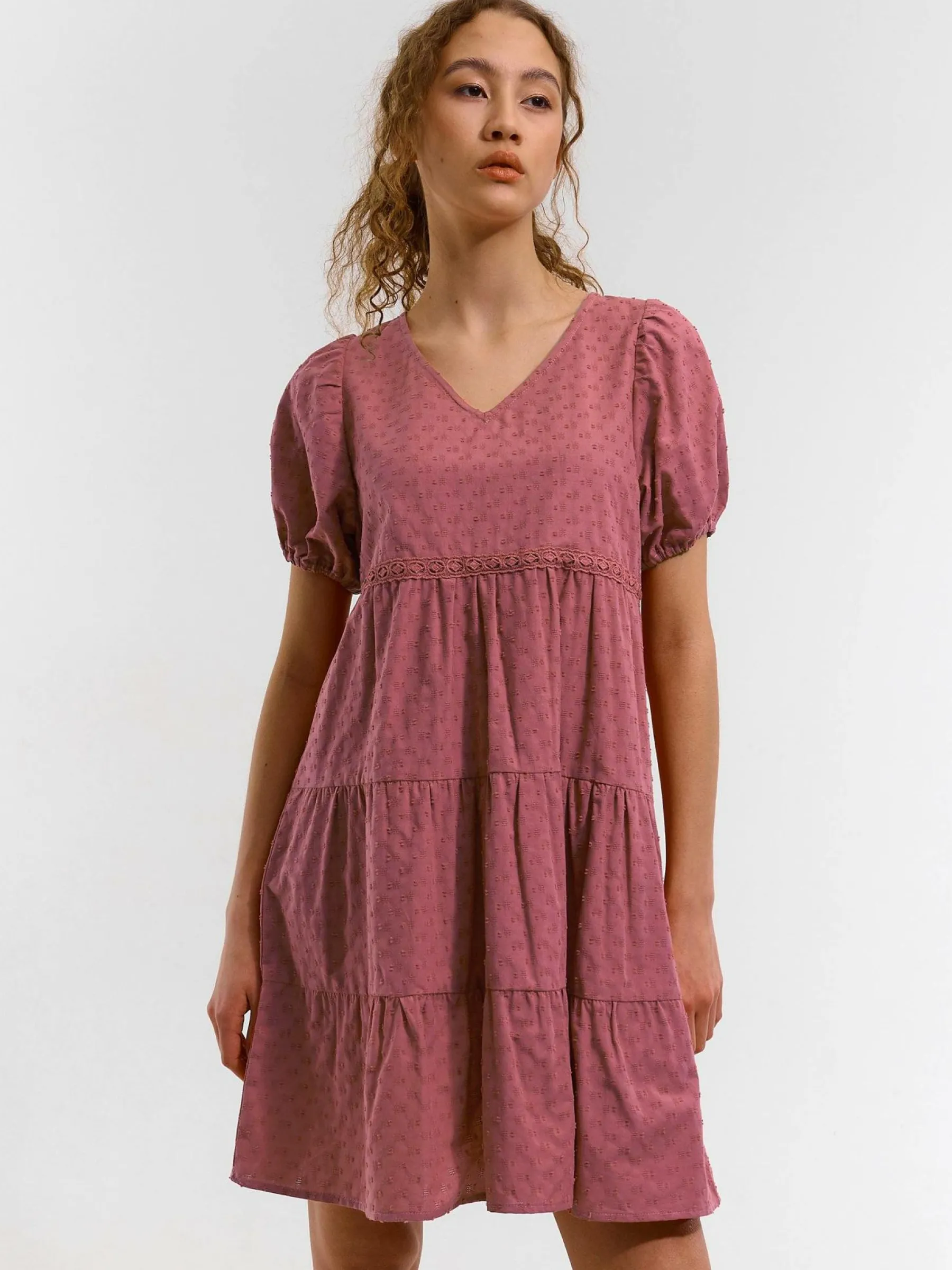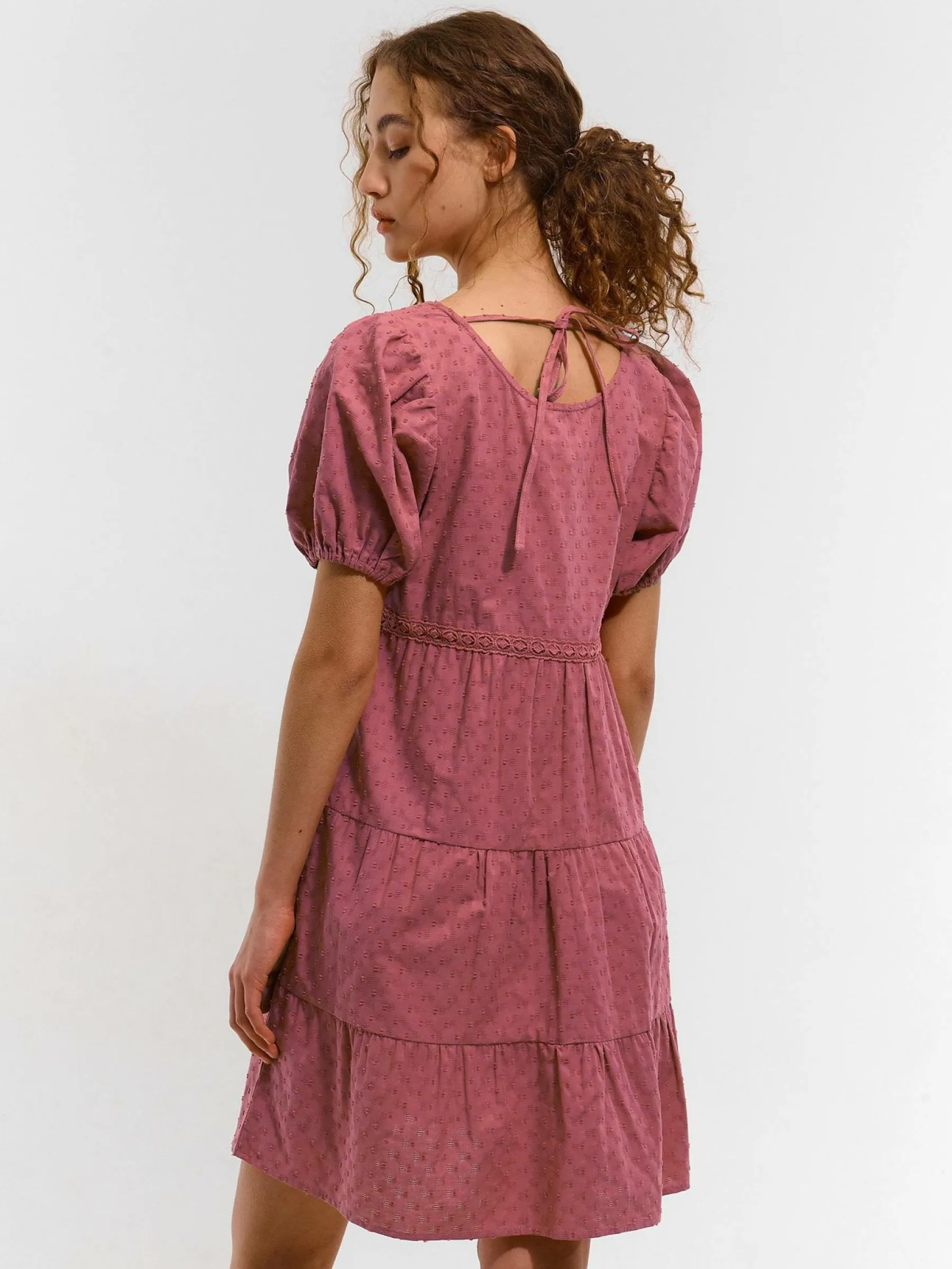 Kolor: różowyKrój: z falbanąTyp: sukienkaRekaw: krótki rękawDługość: miniPattern style: pojedynczy kolor, struk…