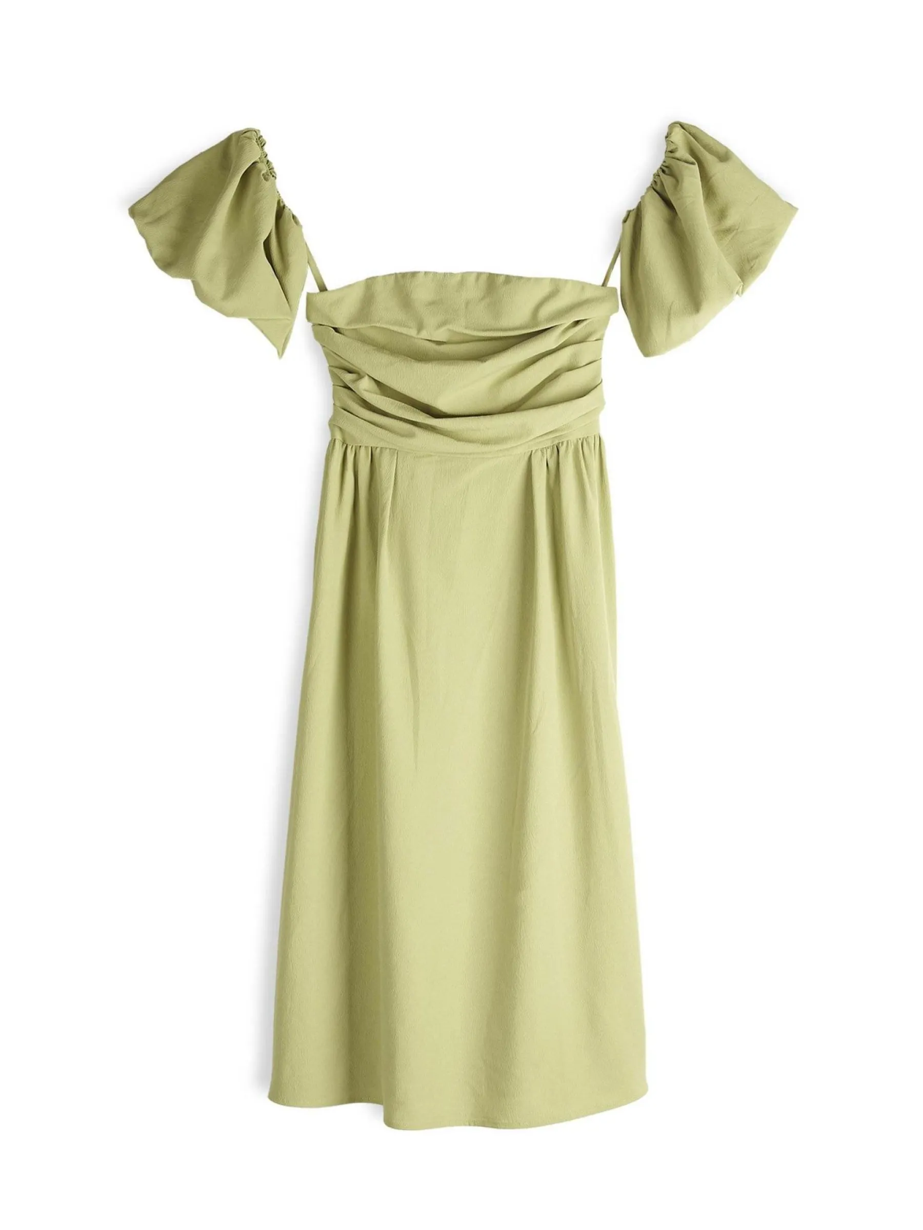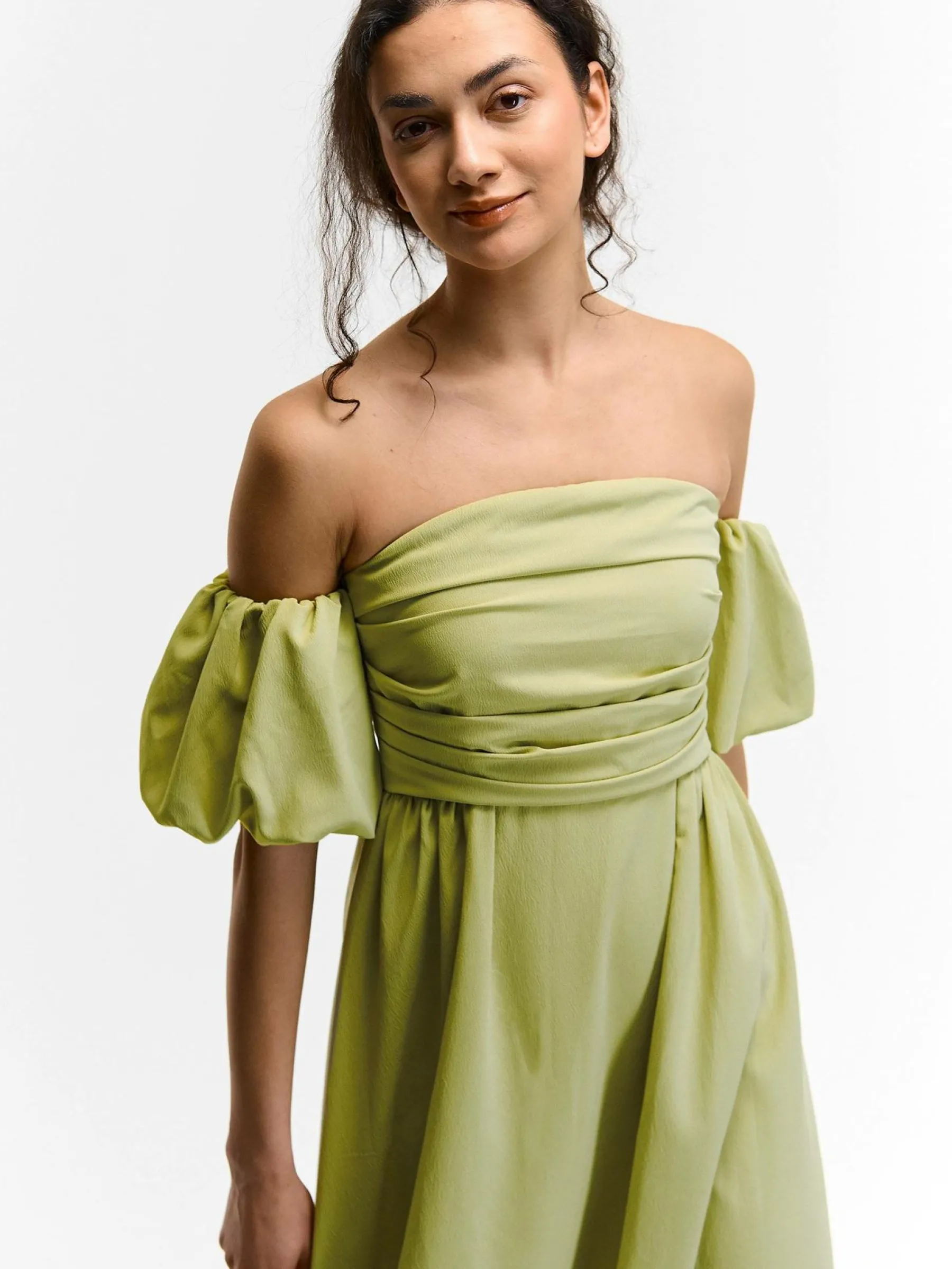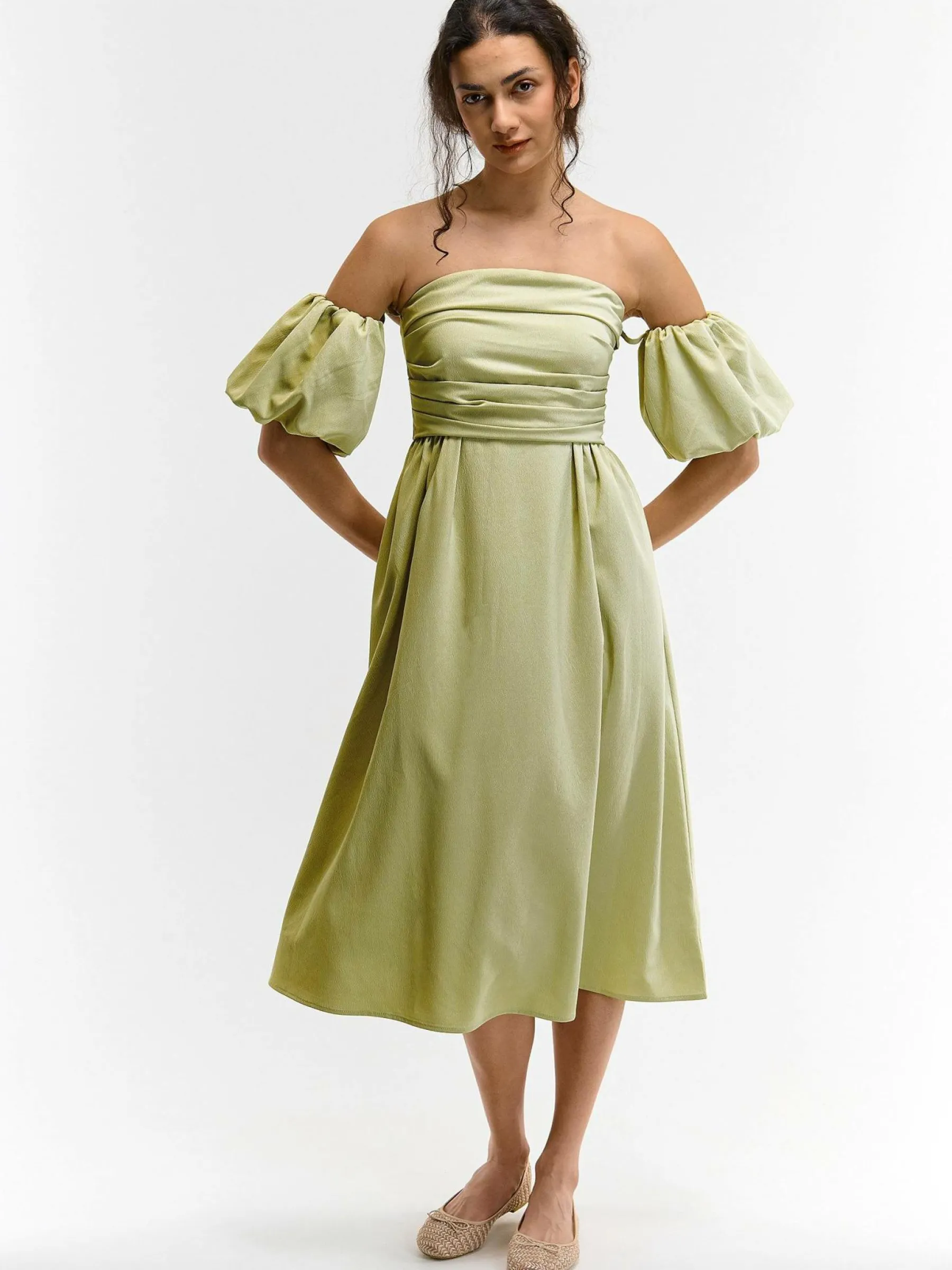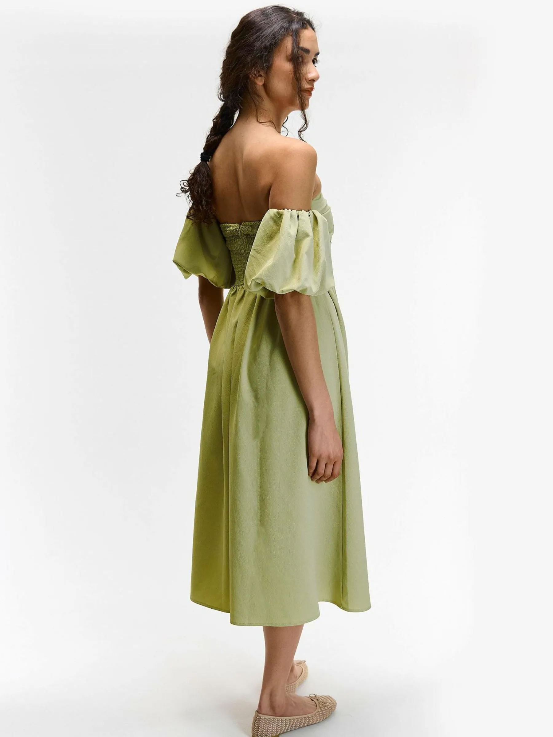 Kolor: zielonyKrój: z odkrytymi ramionamiTyp: sukienkaRekaw: krótki rękawDługość: midiPattern style: pojedynczy ko…