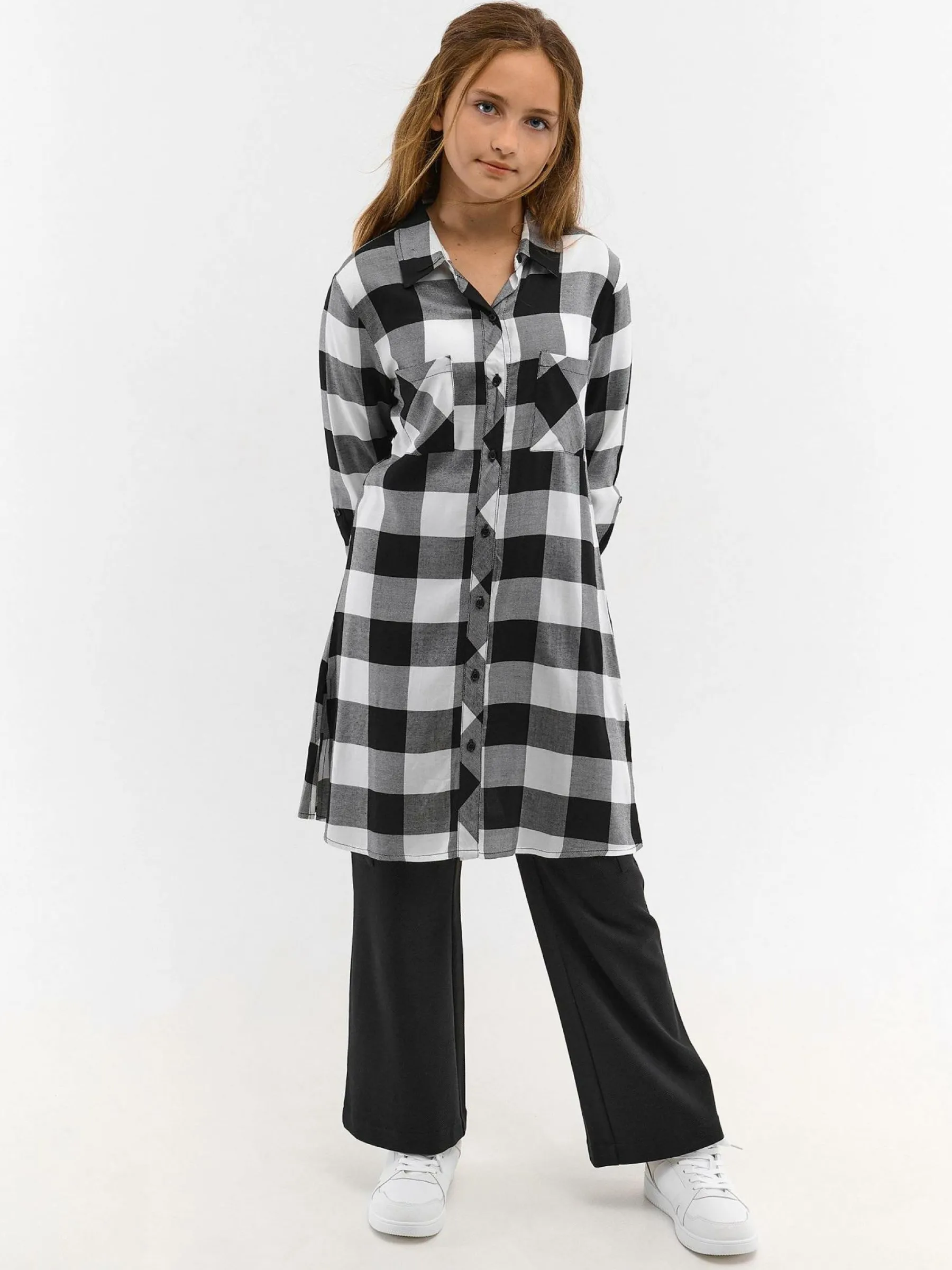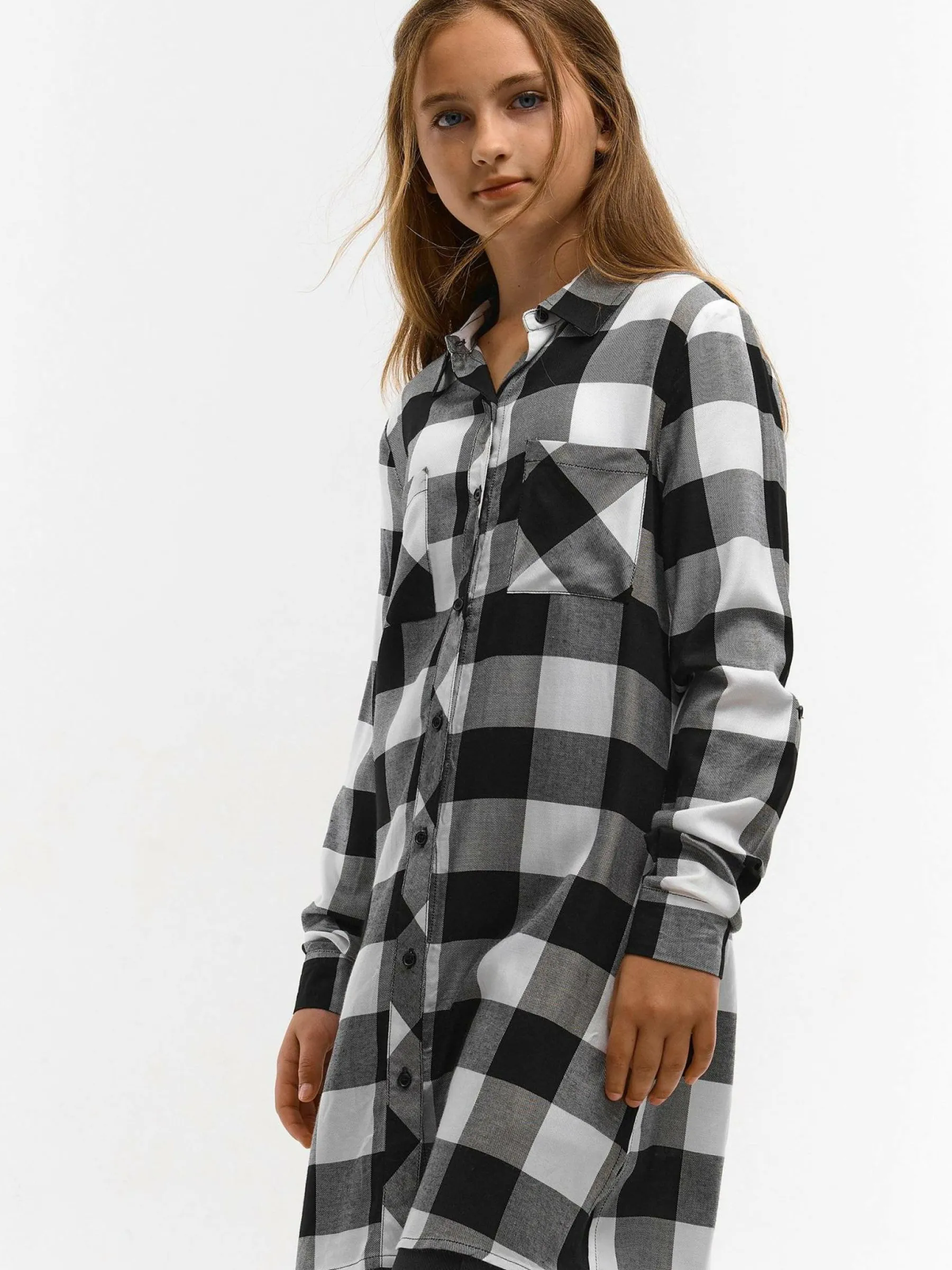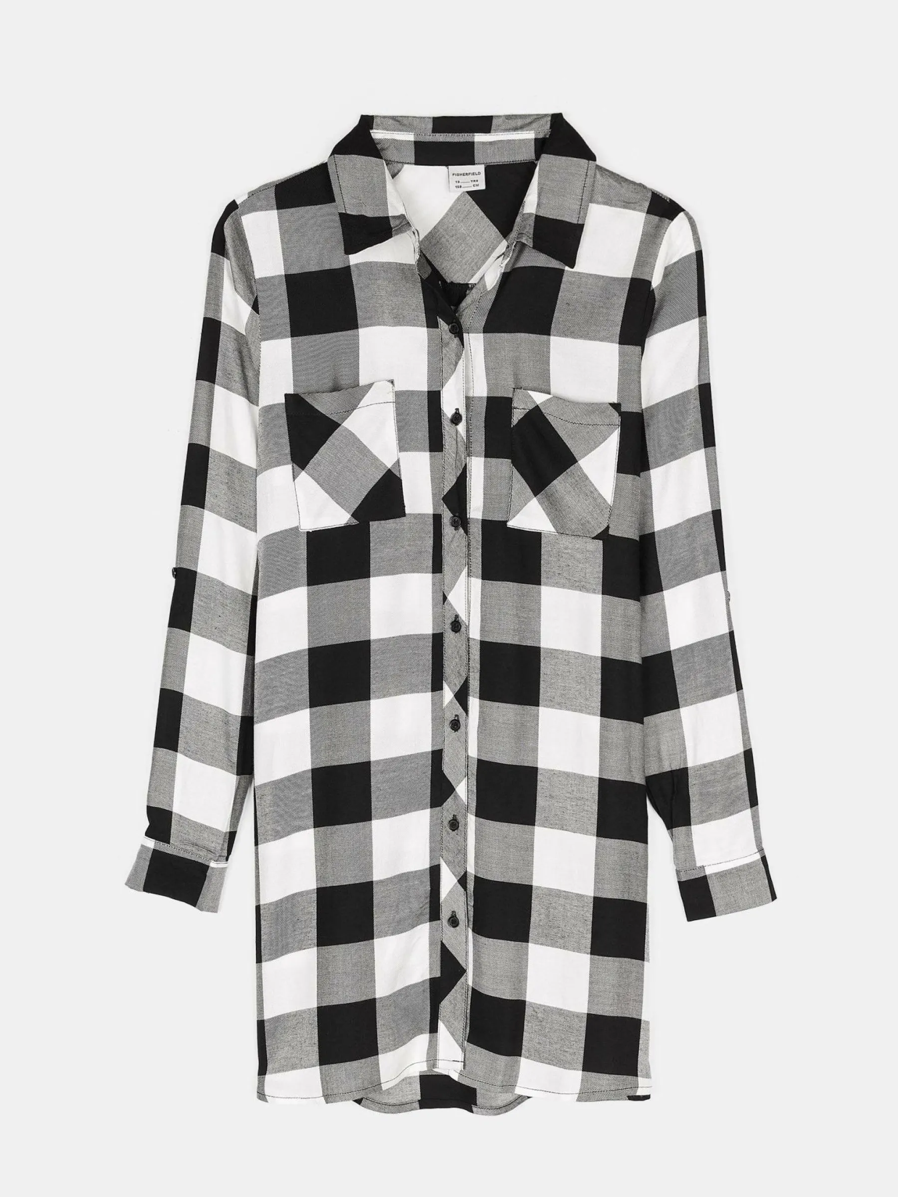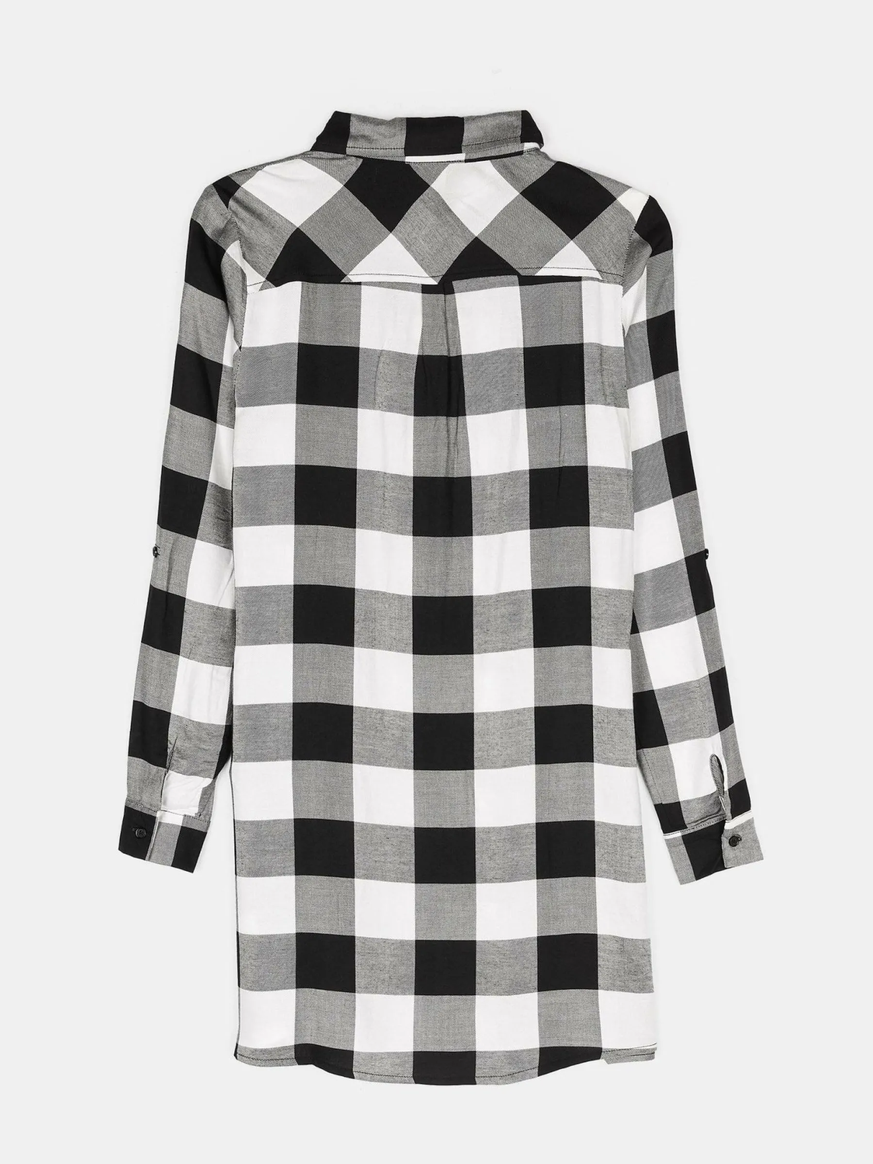 Kolor: czarnyKrój: podstawowyTyp: sukienkaRekaw: długi rękawDługość: miniPattern style: w krateDetal: na guzikiMat…