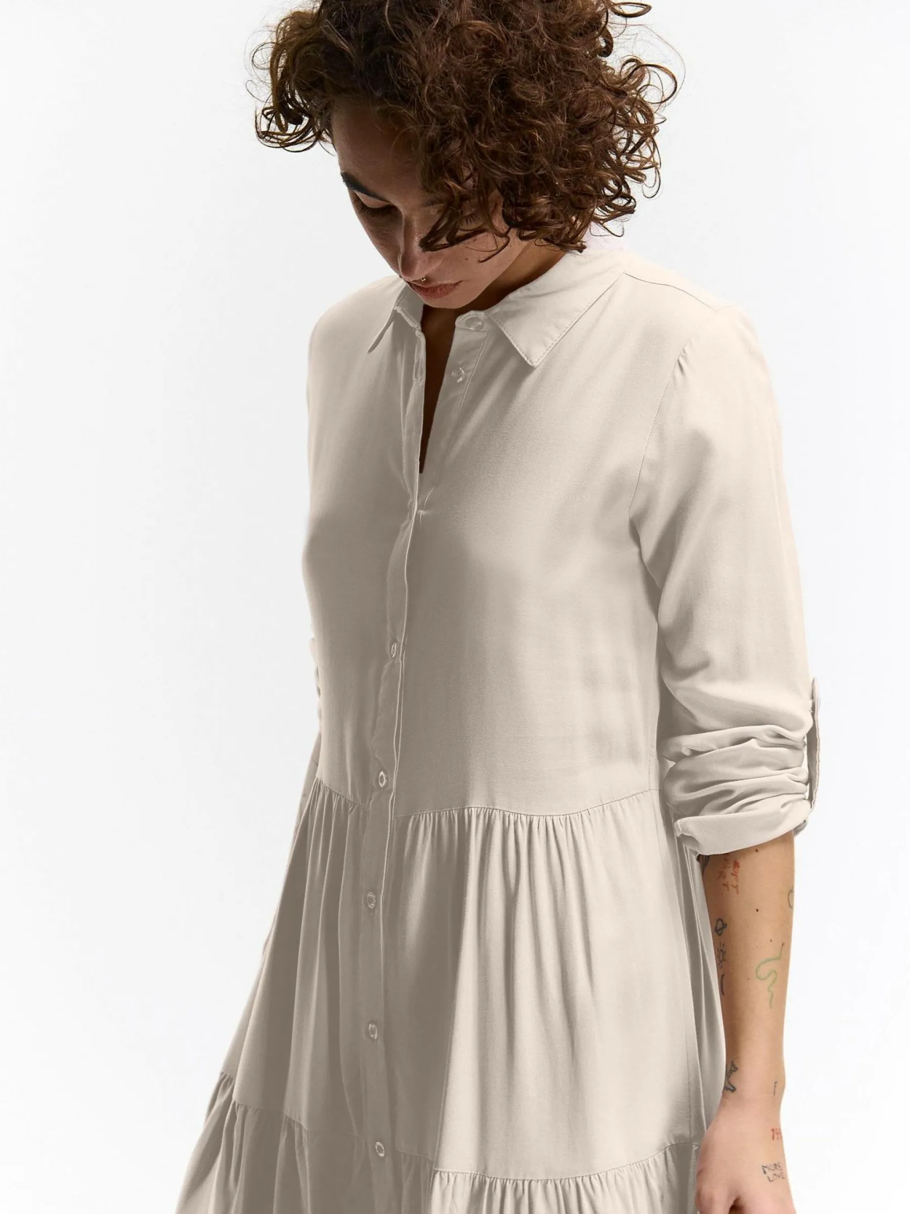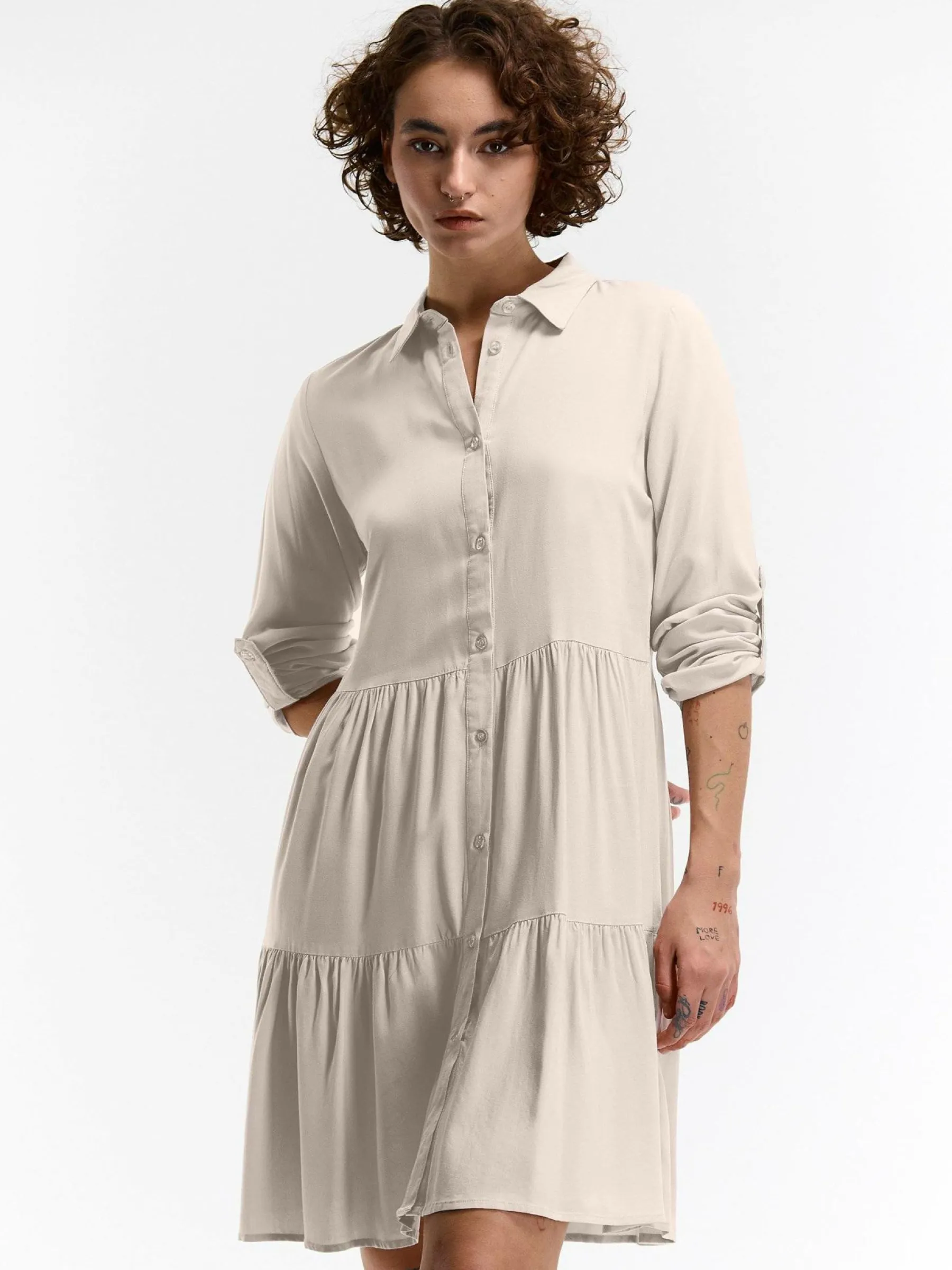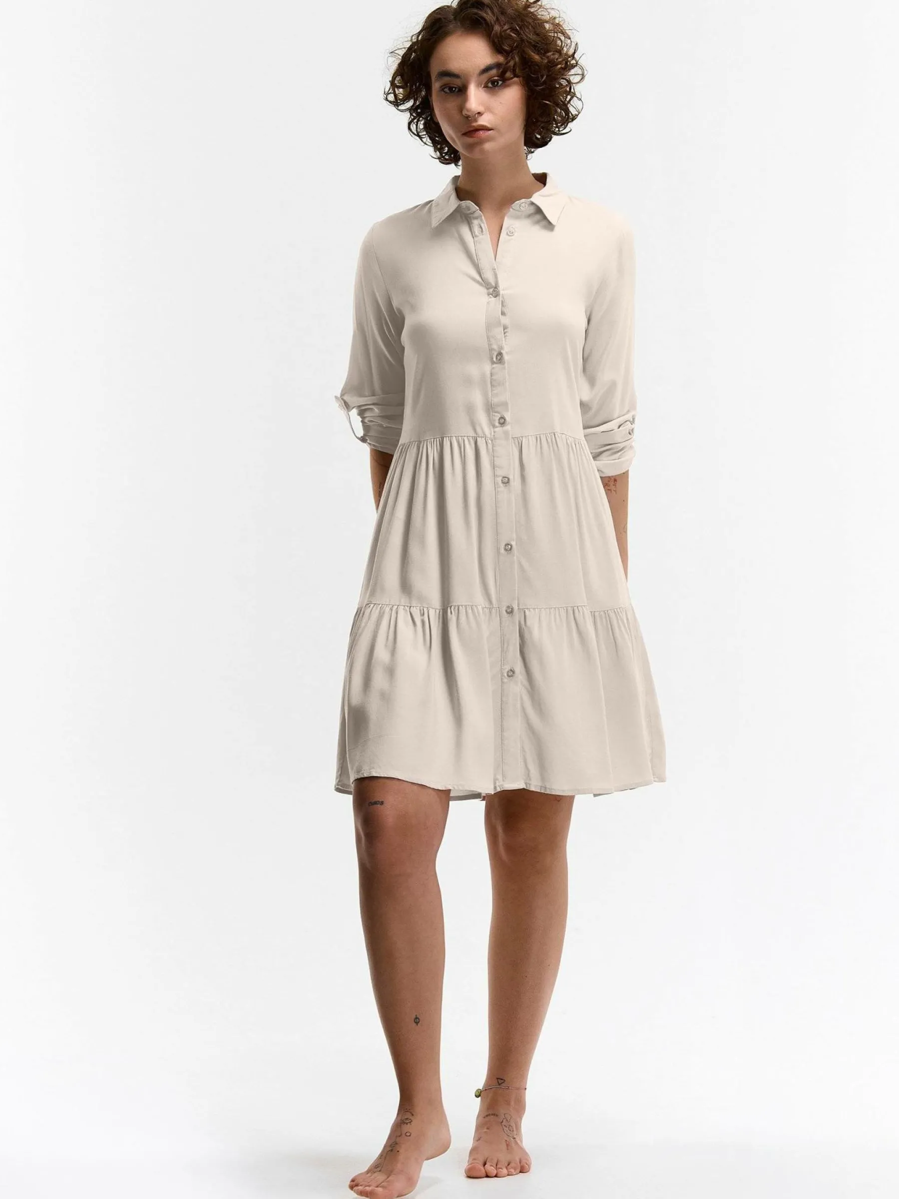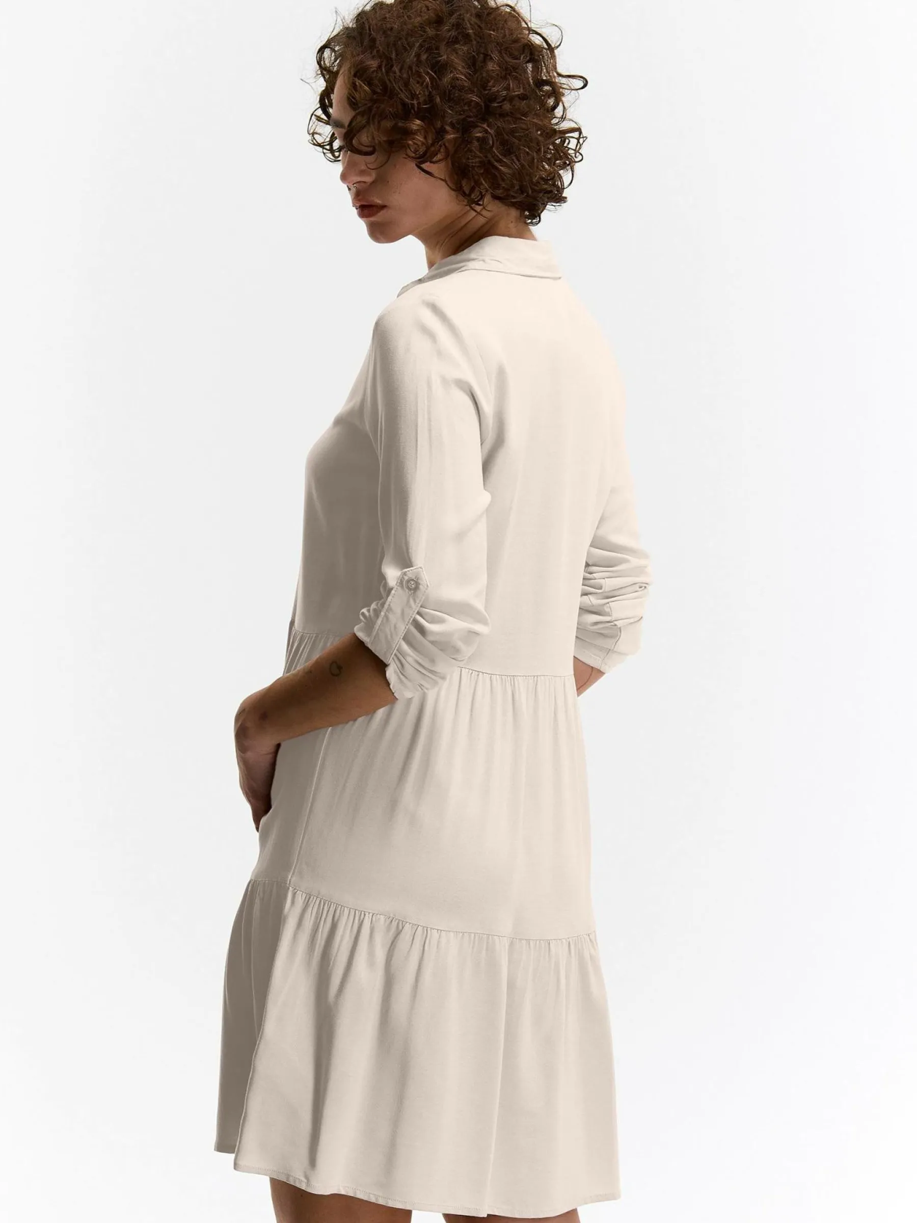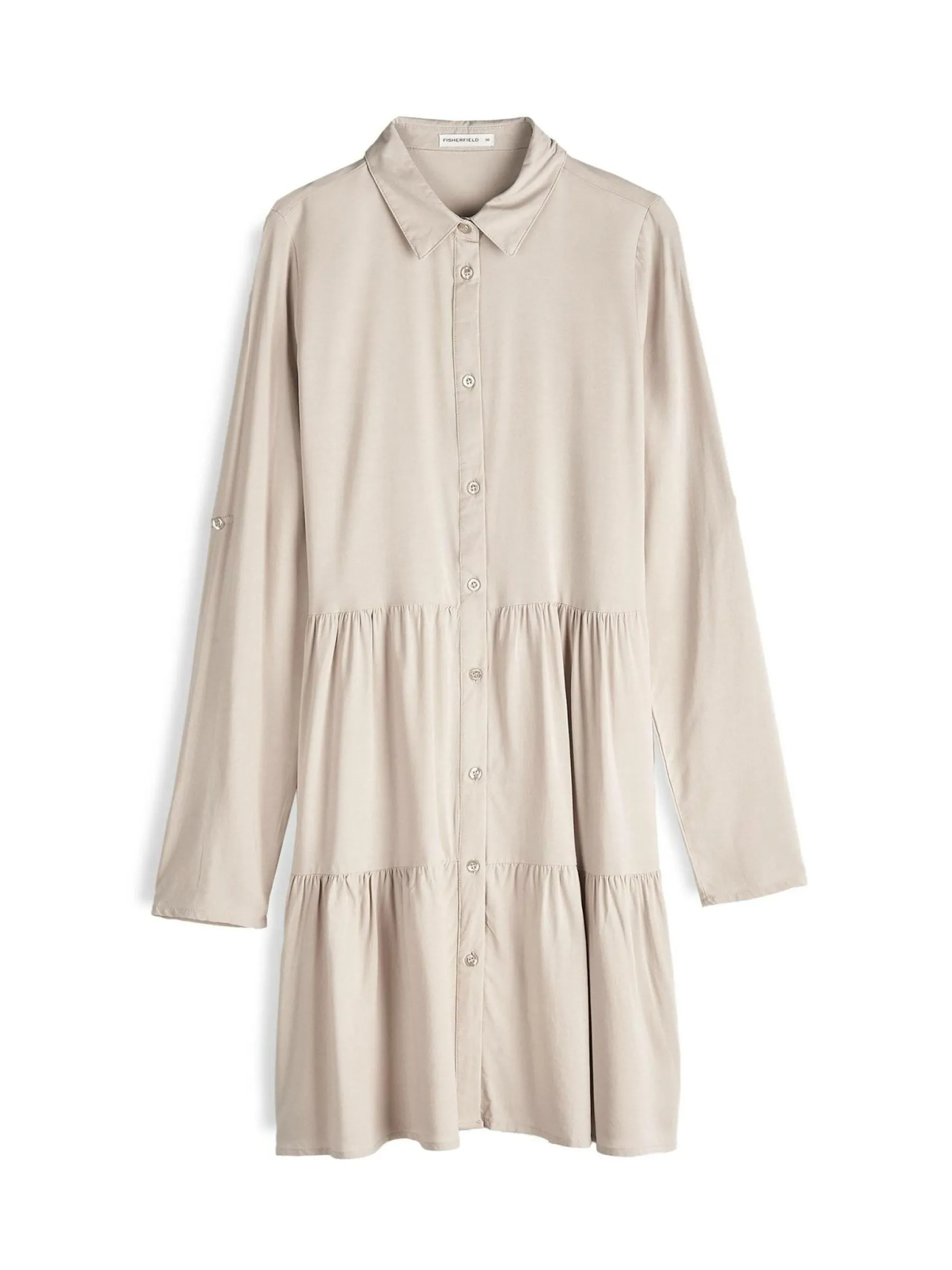 Kolor: beżowyKrój: koszulowe, z falbanąTyp: sukienkaRekaw: długi rękawDługość: miniPattern style: pojedynczy kol…