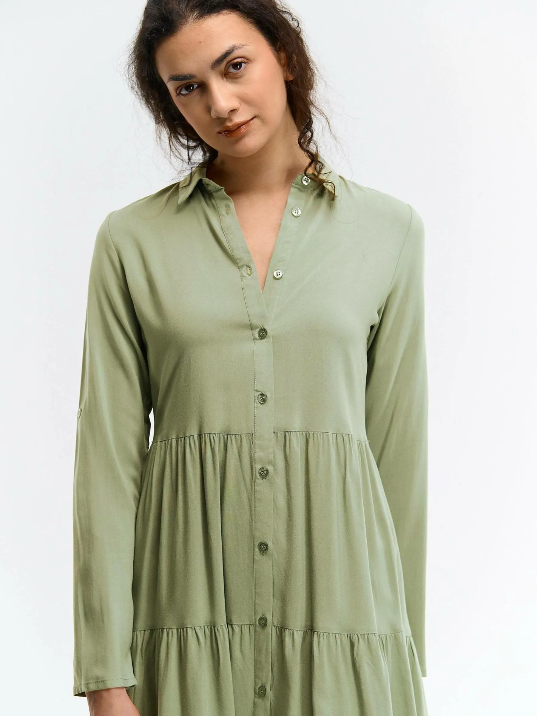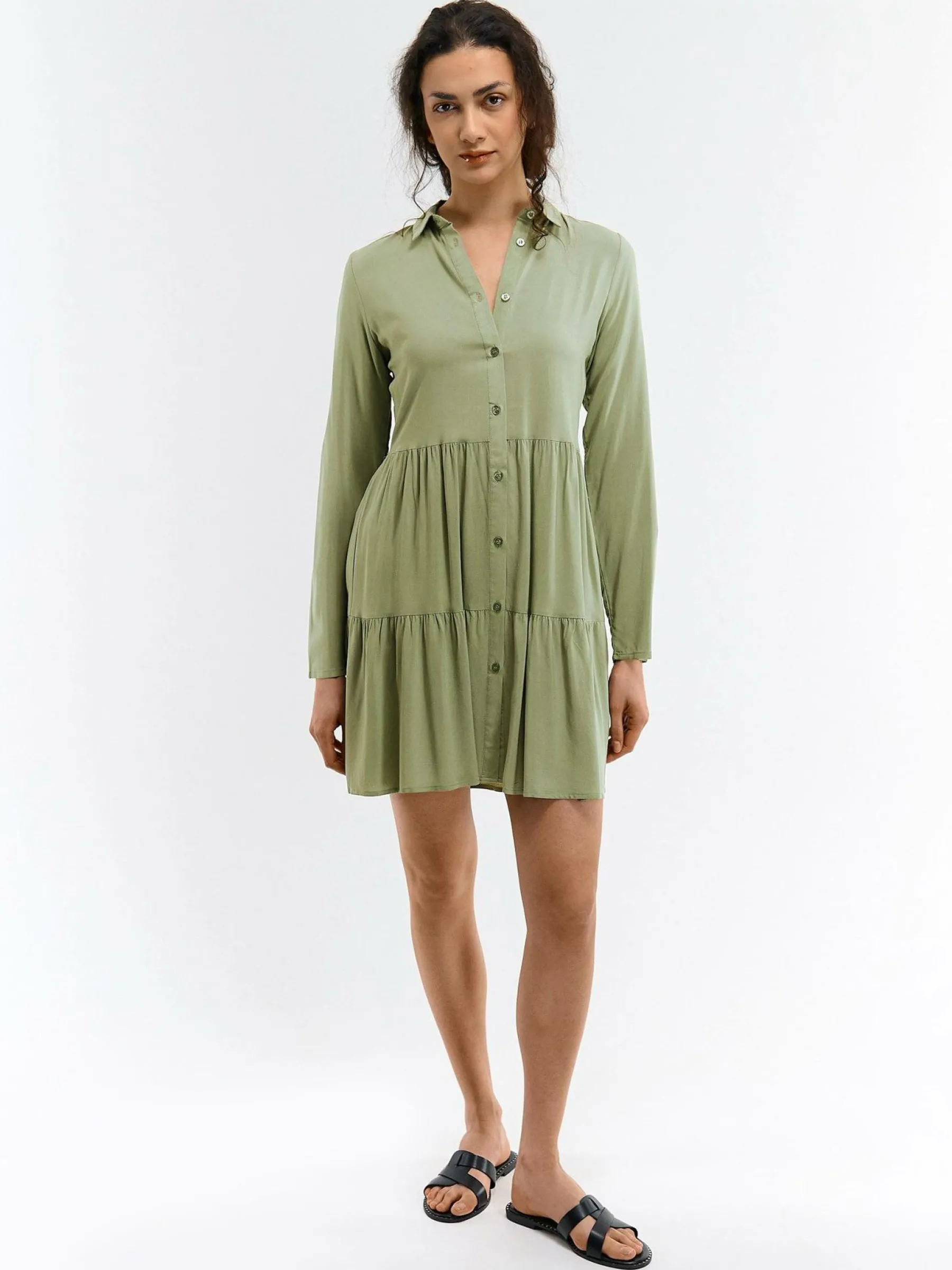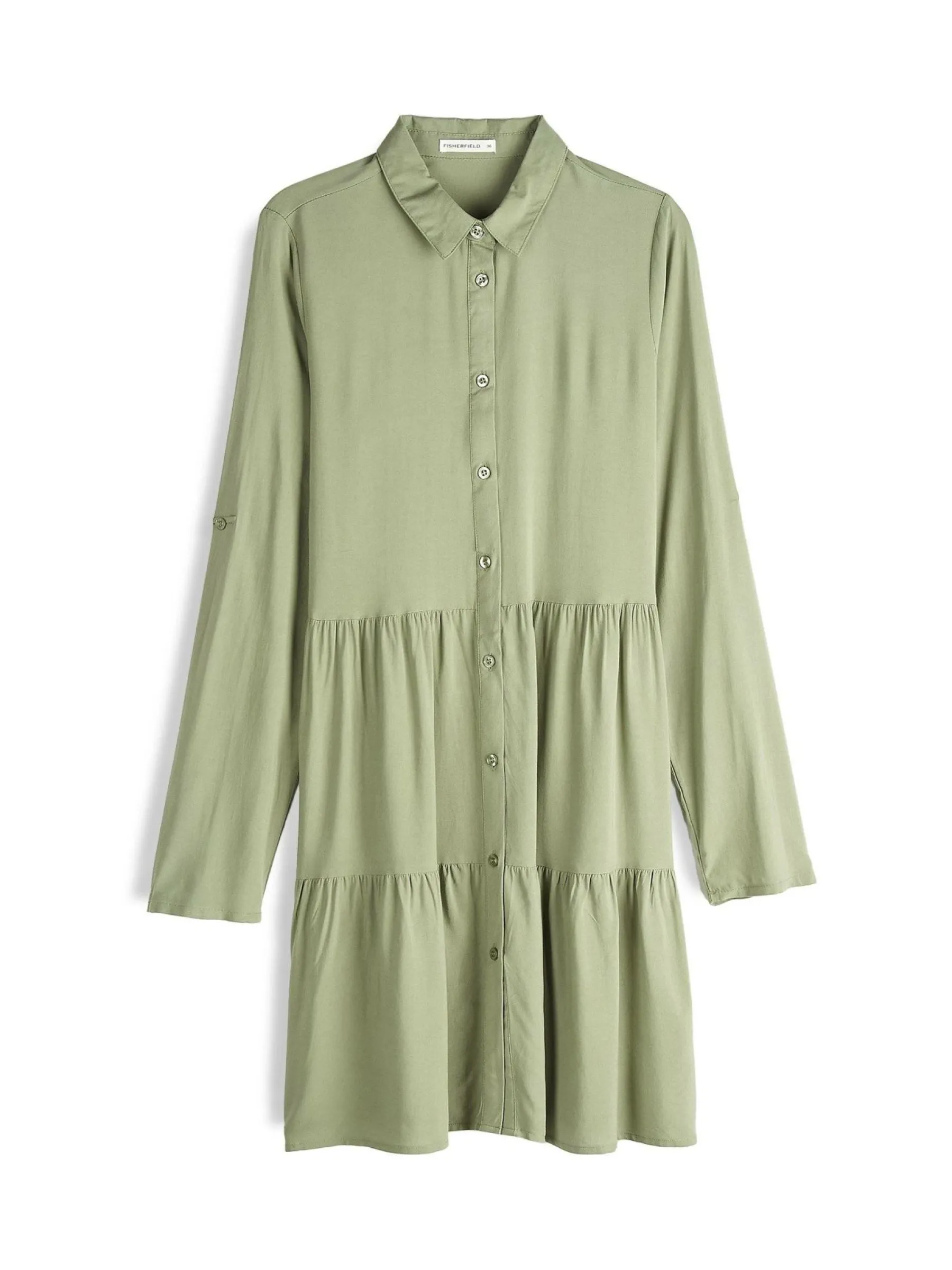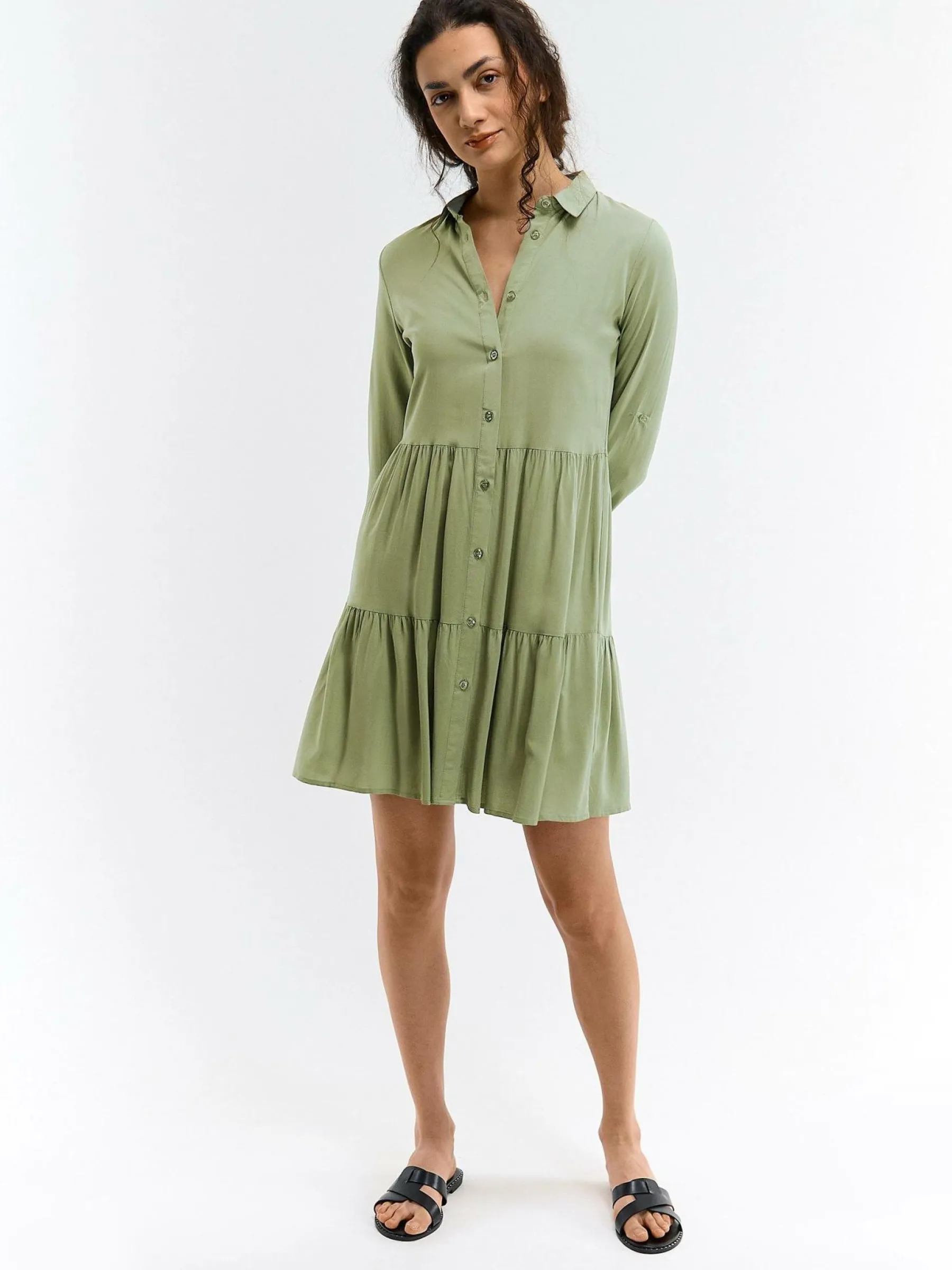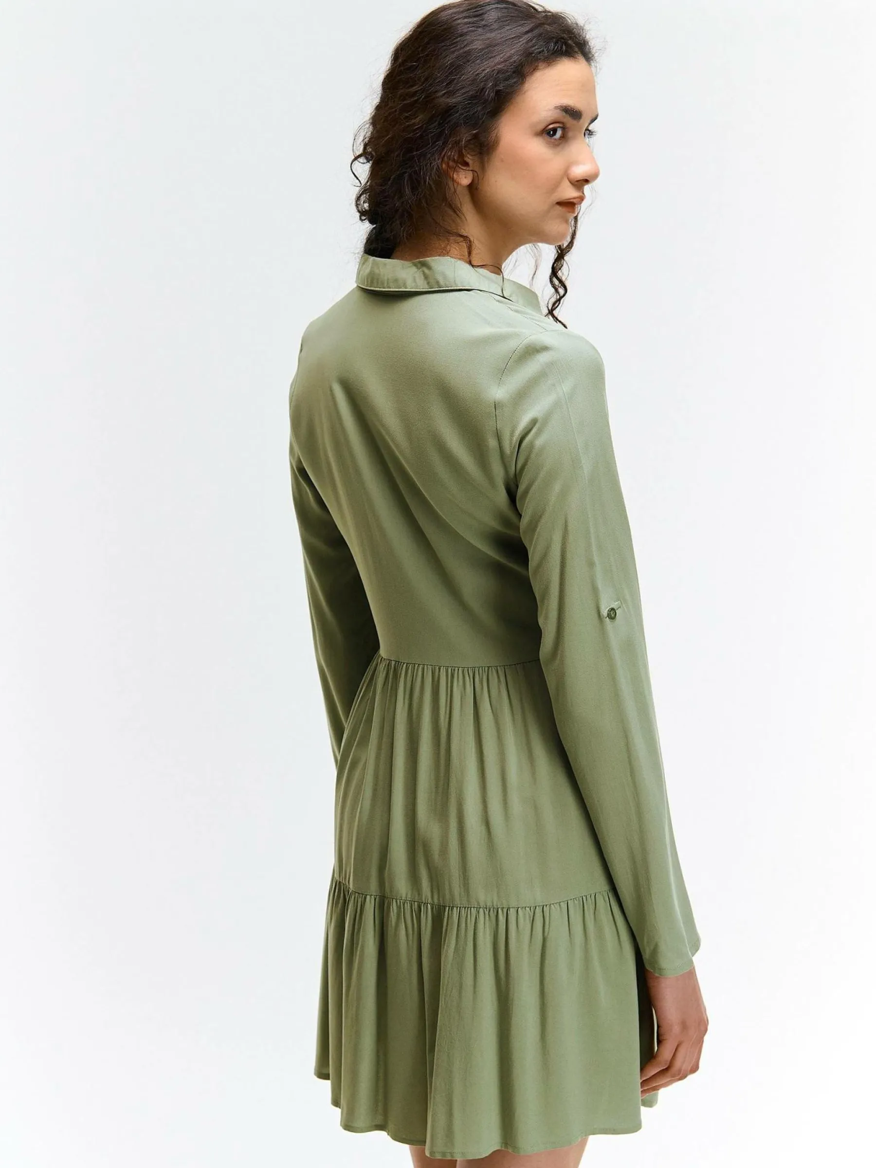 Kolor: zielonyKrój: koszulowe, z falbanąTyp: sukienkaRekaw: długi rękawDługość: miniPattern style: pojedynczy kol…