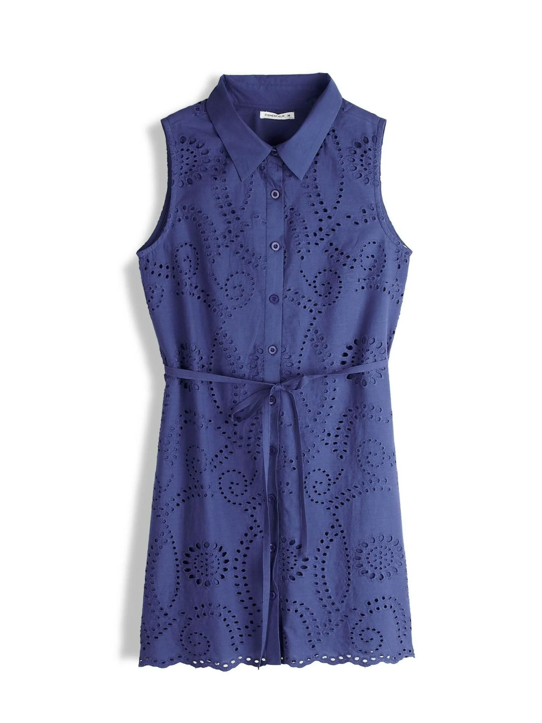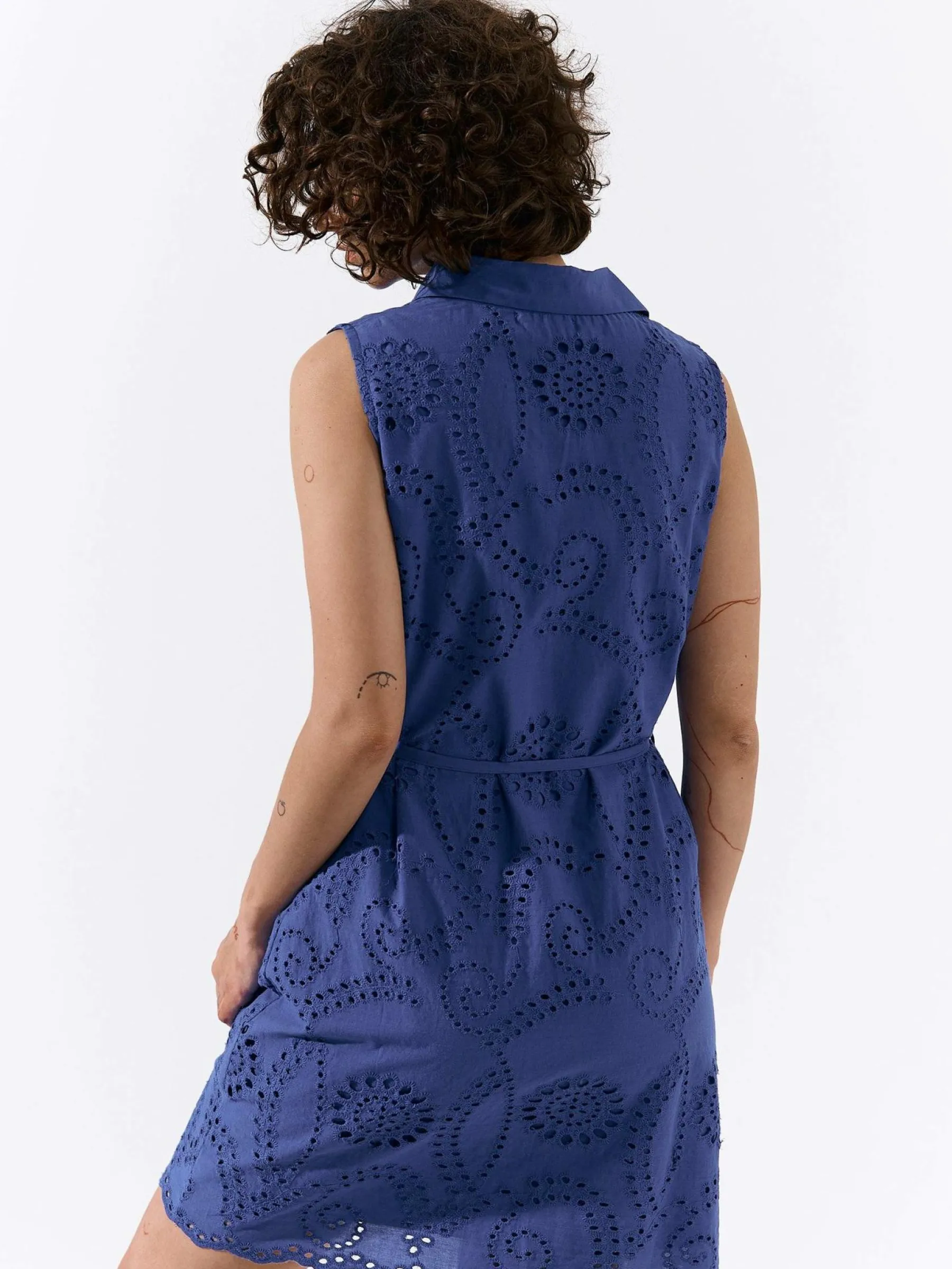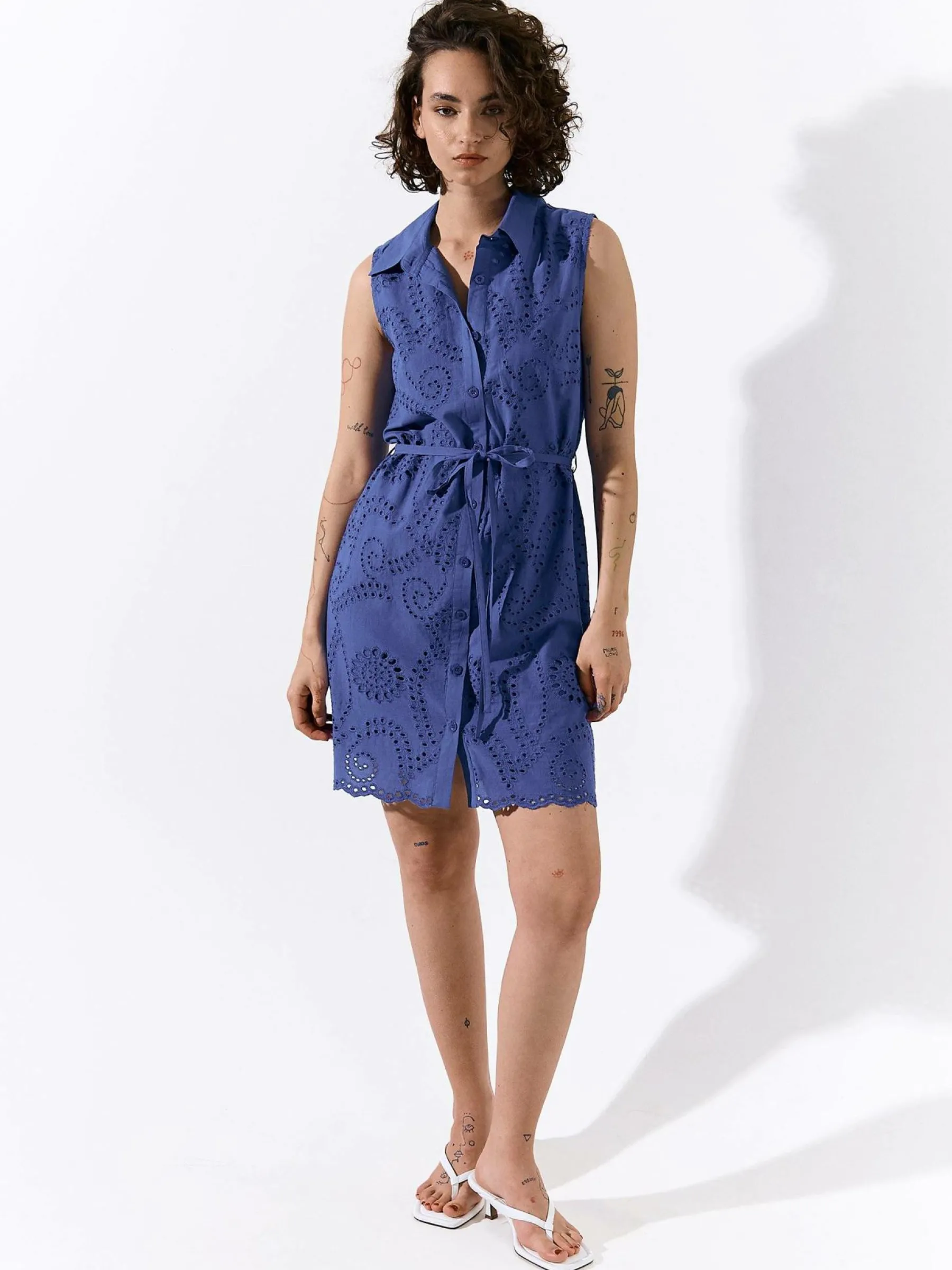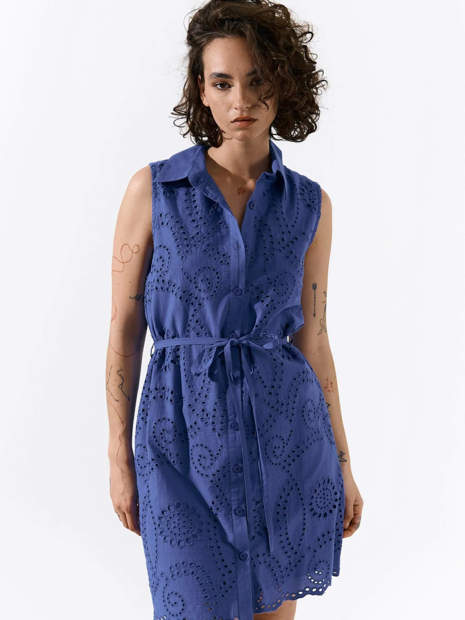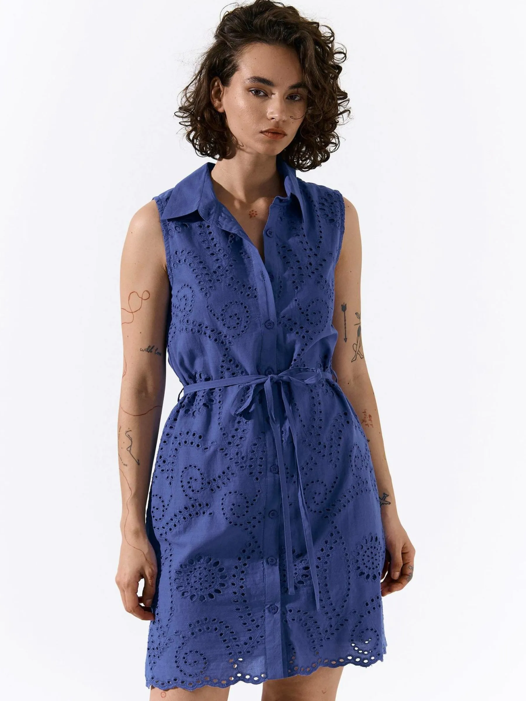 Kolor: niebieskiKrój: koszuloweTyp: sukienkaRekaw: bez rękawówDługość: miniPattern style: pojedynczy kolor, haftow…