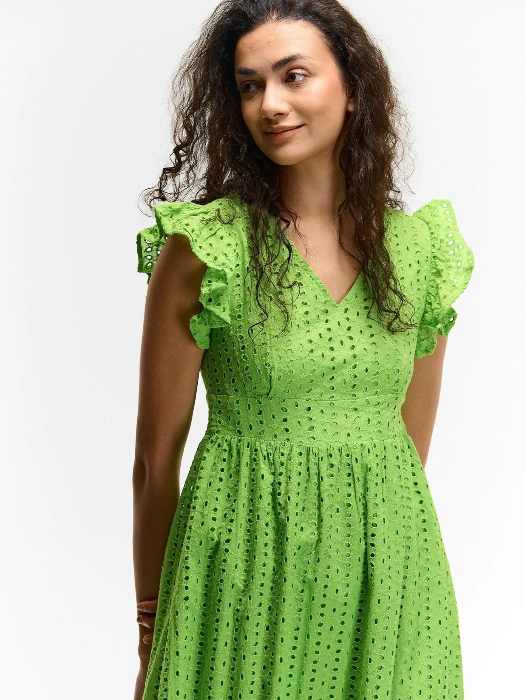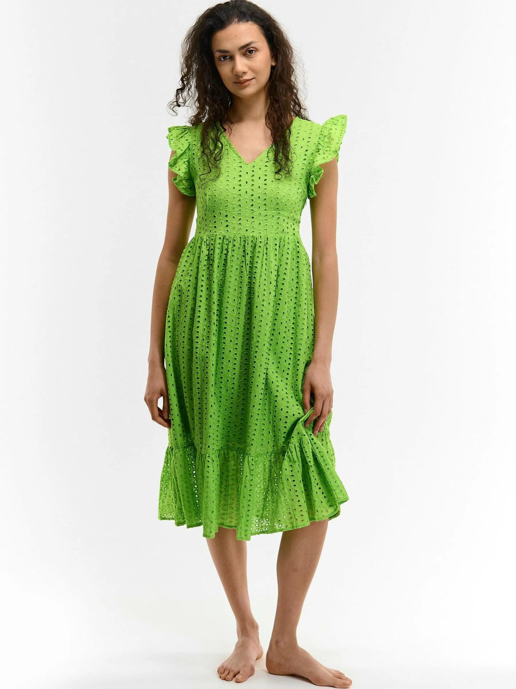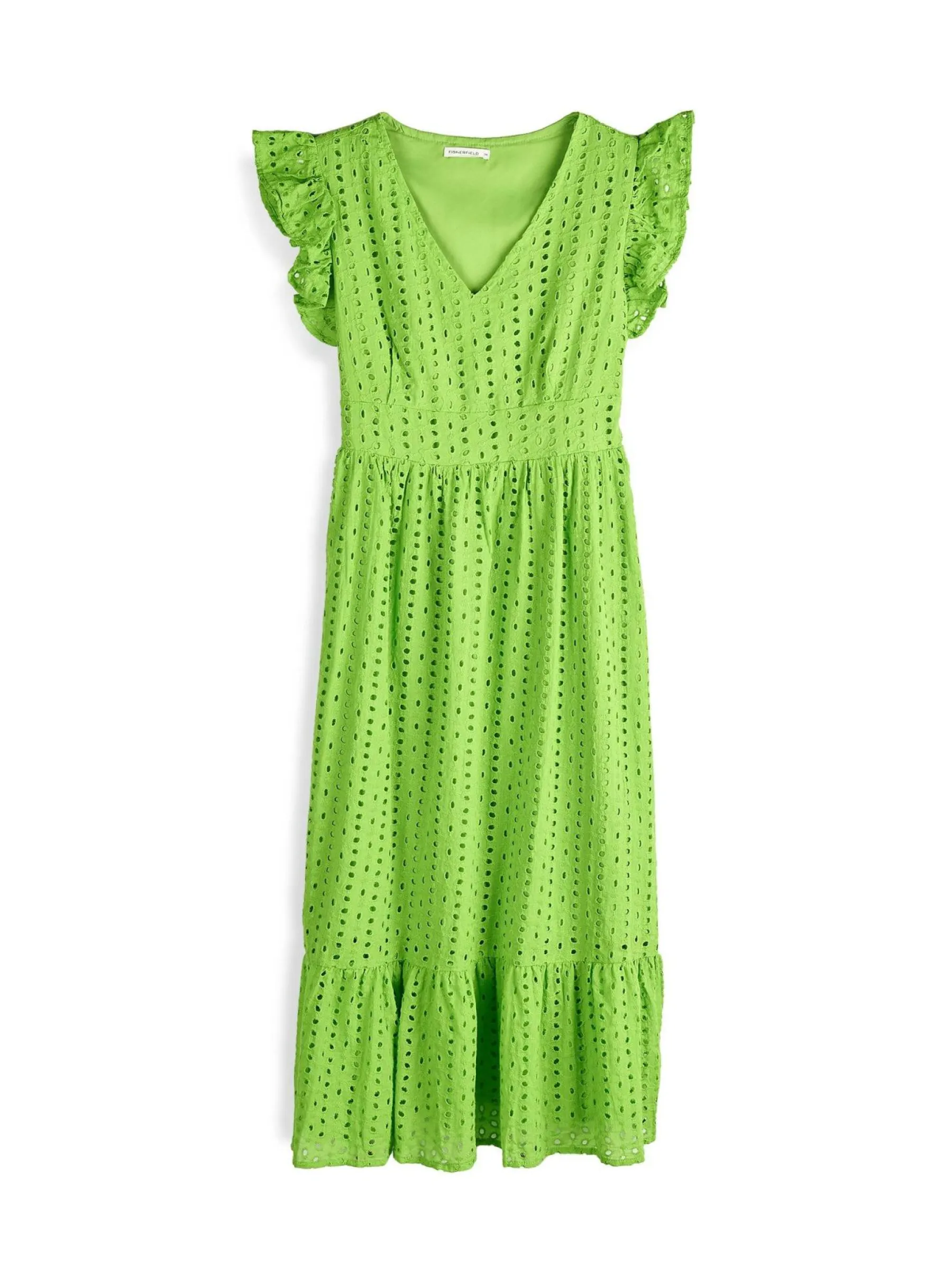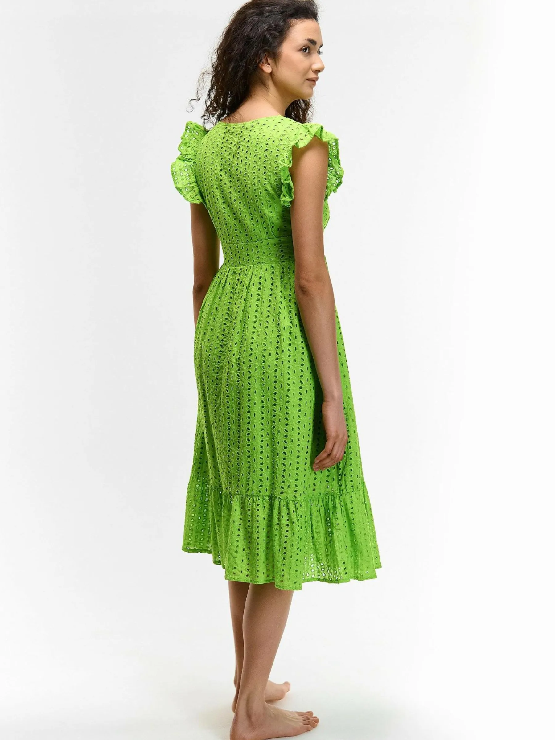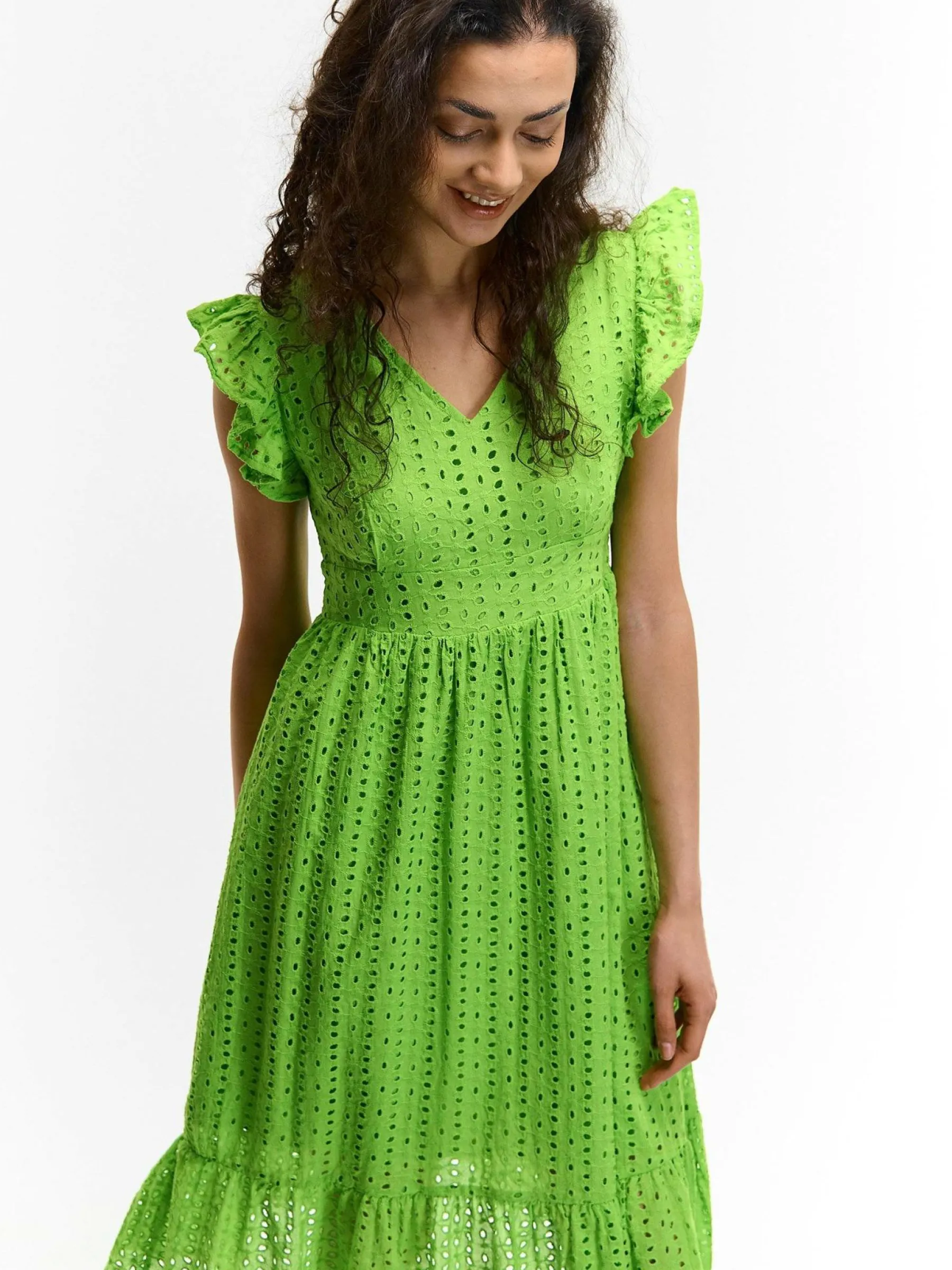 Kolor: zielonyKrój: z falbanąTyp: sukienkaRekaw: krótki rękawDługość: midiPattern style: pojedynczy kolor, haftow…