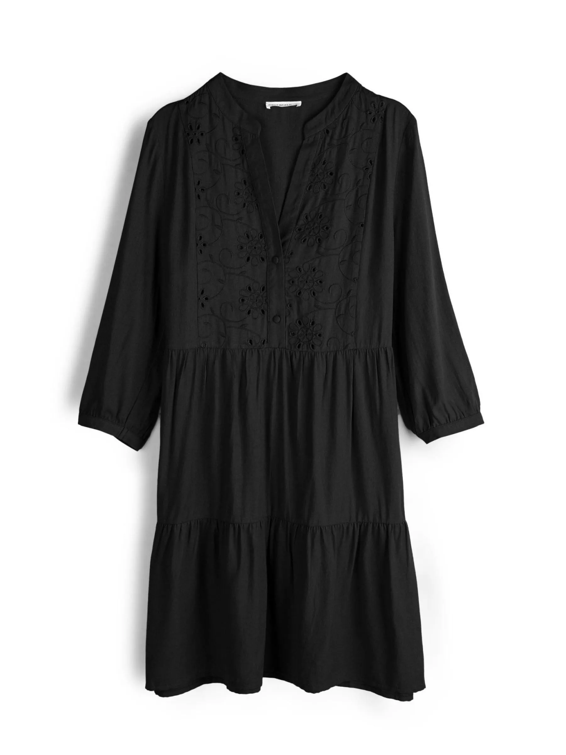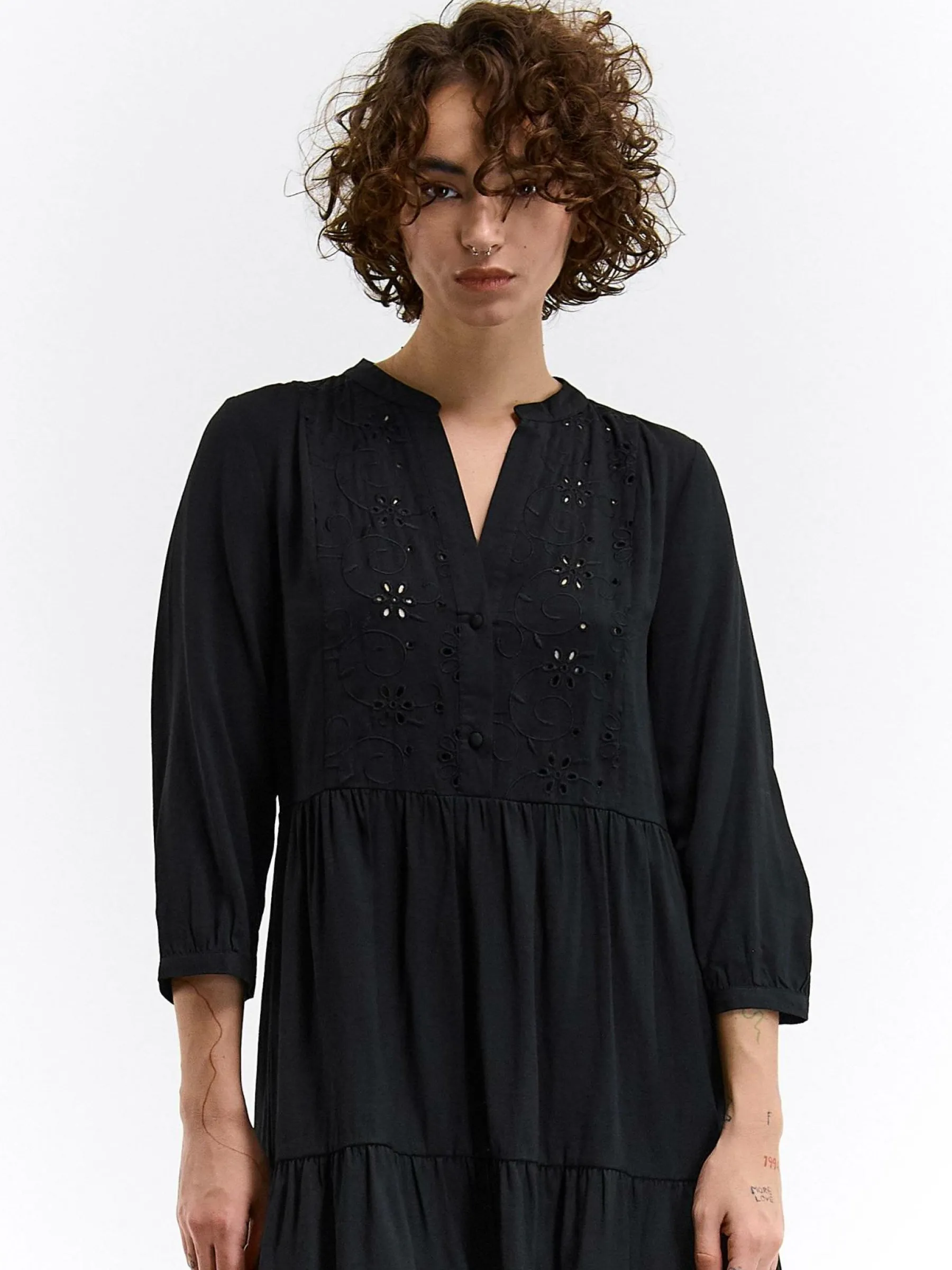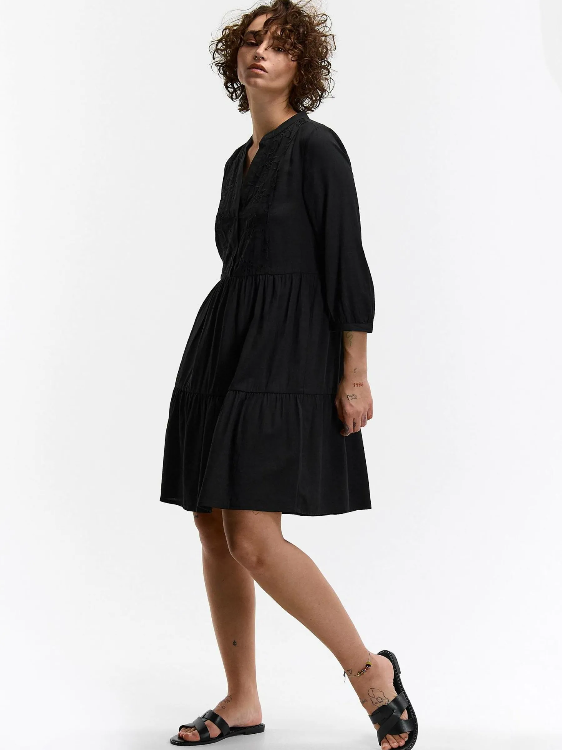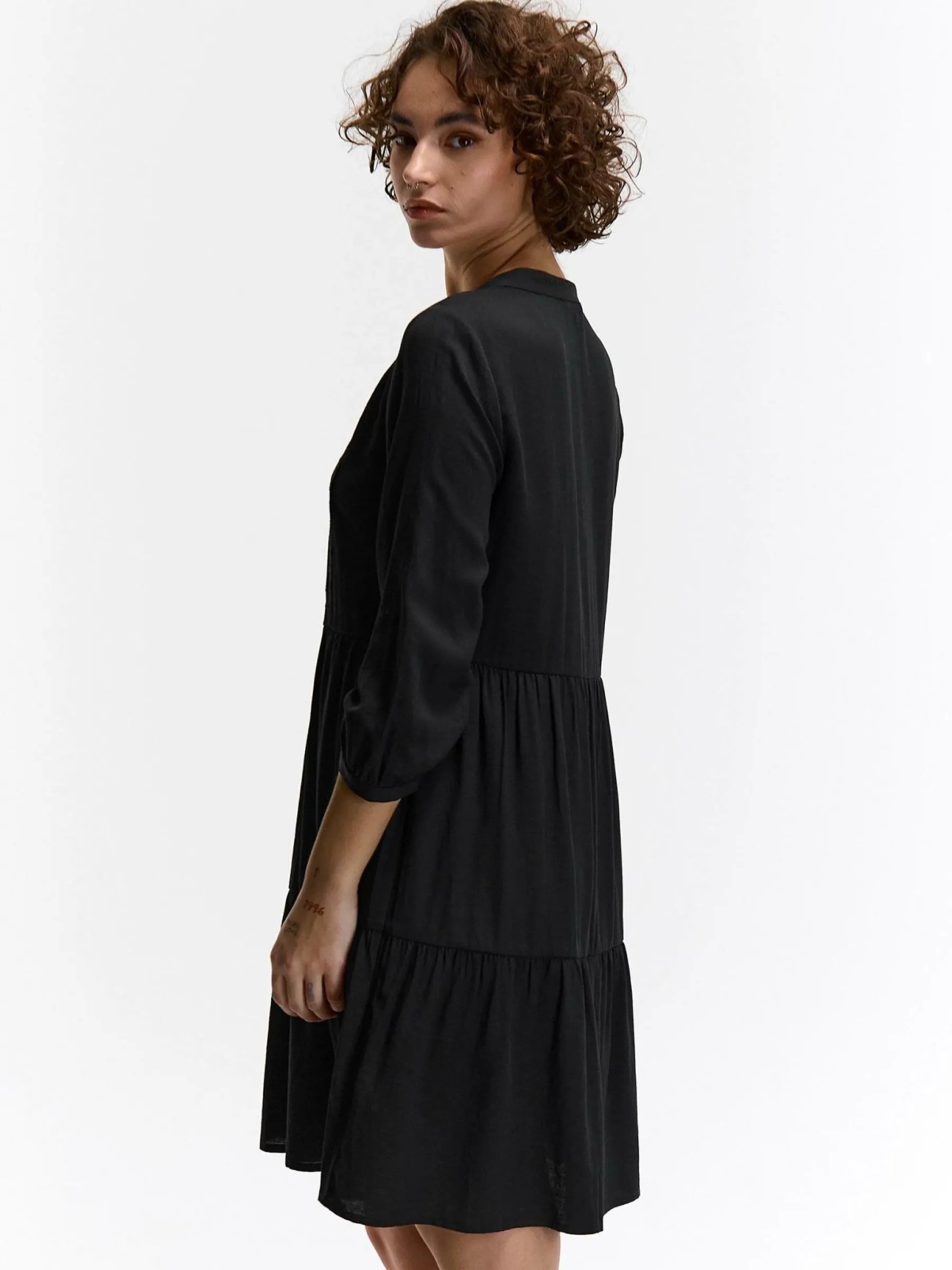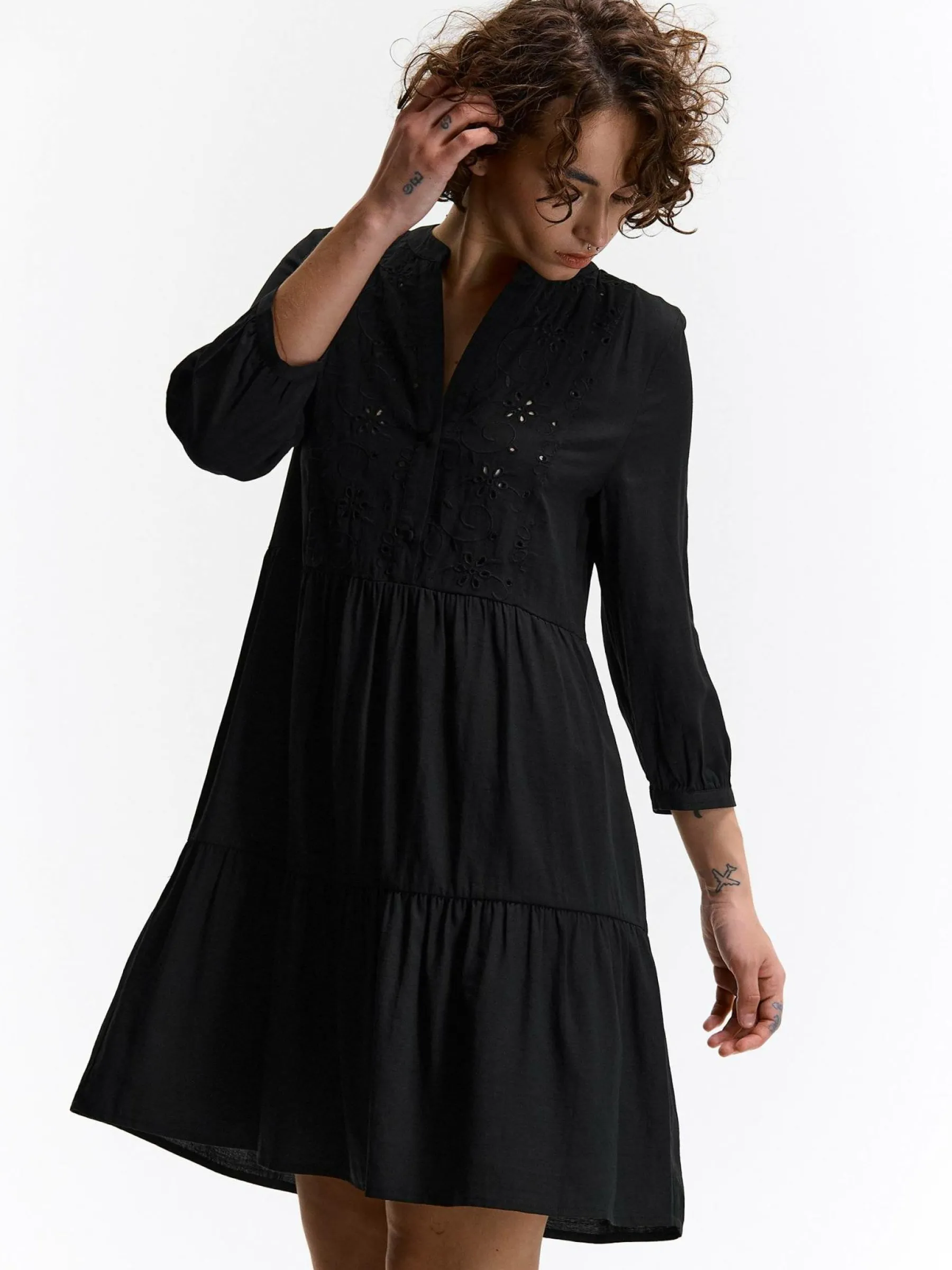 Kolor: czarnyKrój: z falbanąTyp: sukienkaRekaw: rękaw 3/4Długość: miniPattern style: pojedynczy kolor, haftowaneDe…