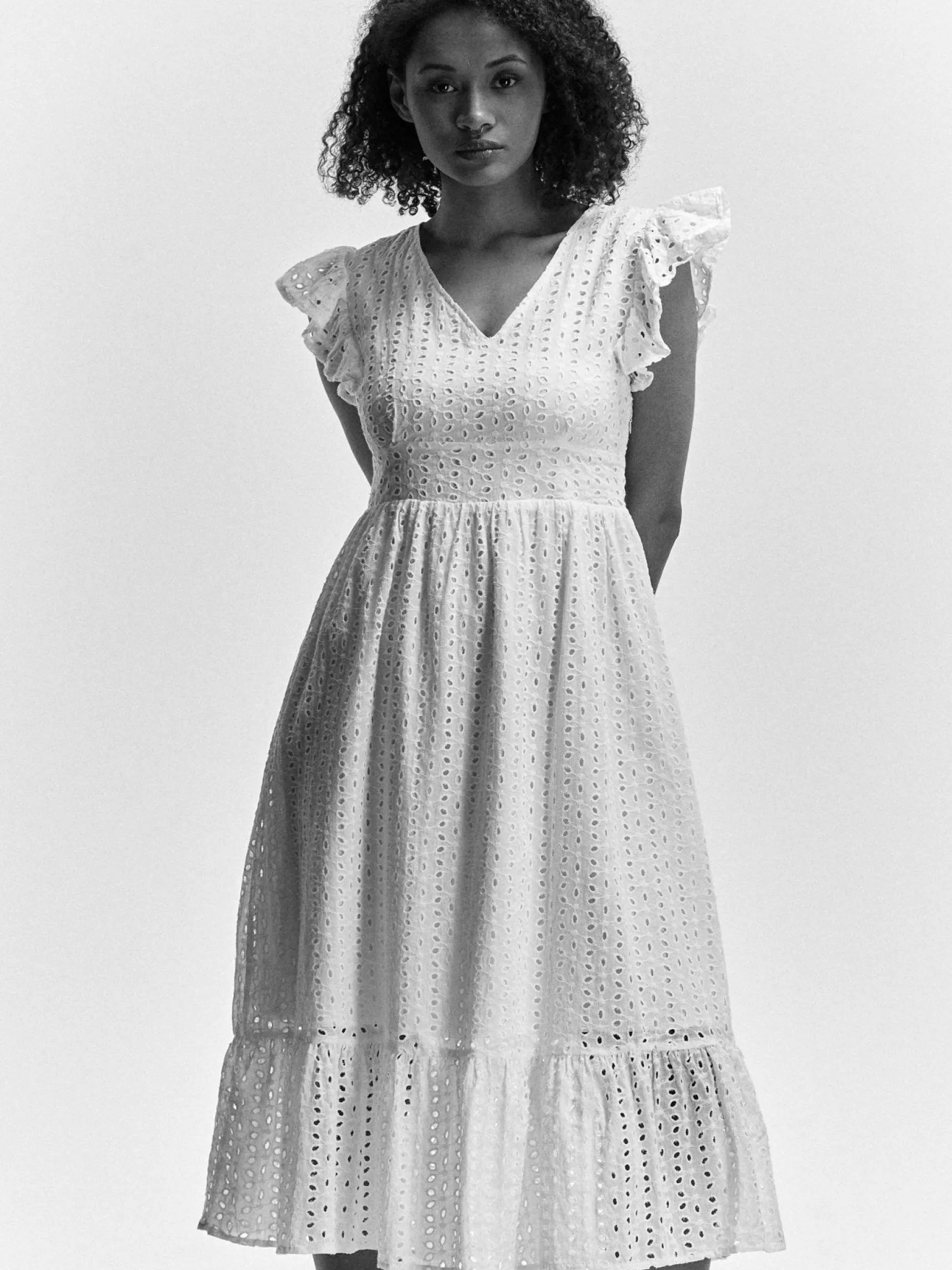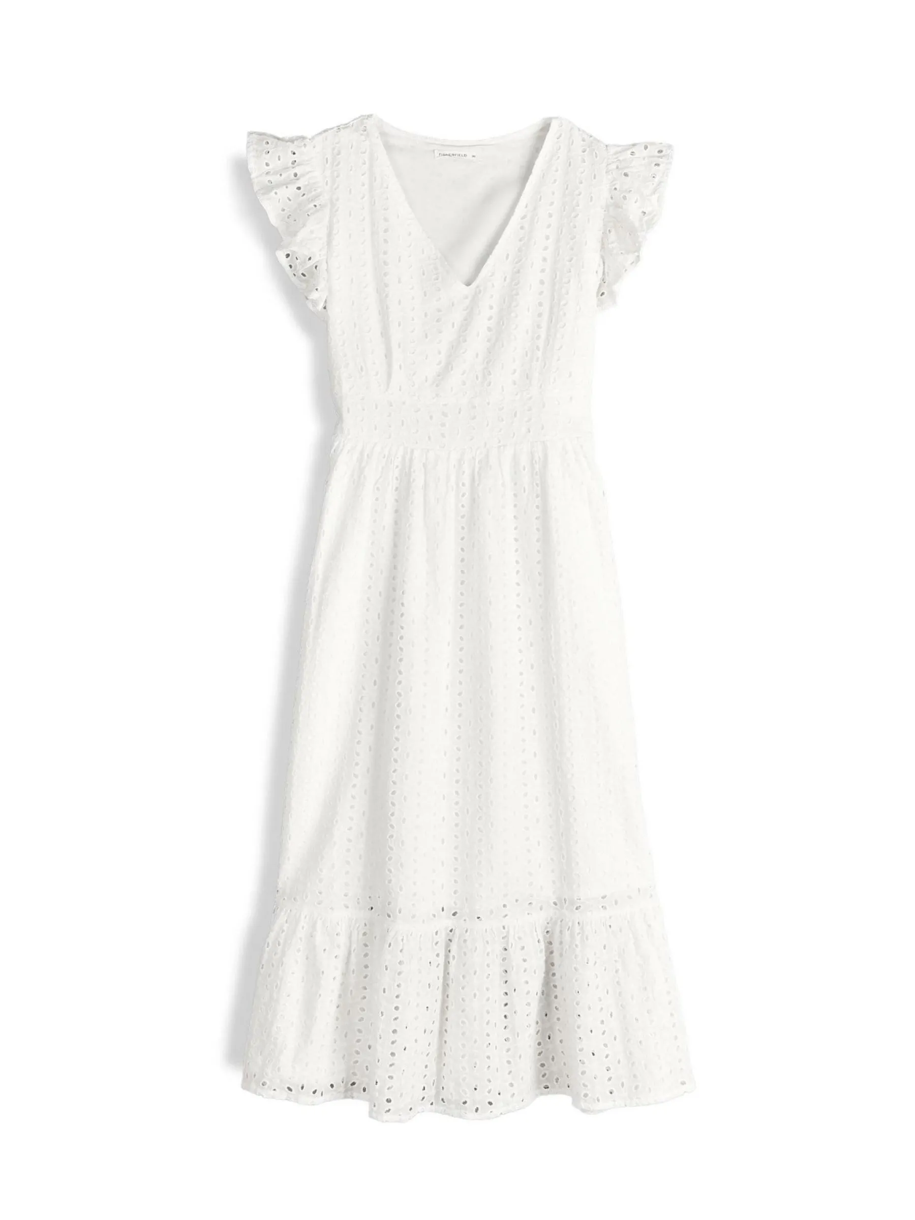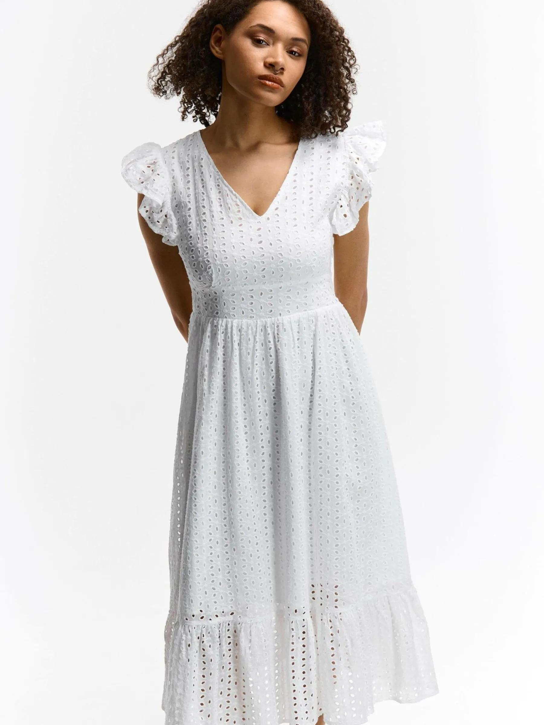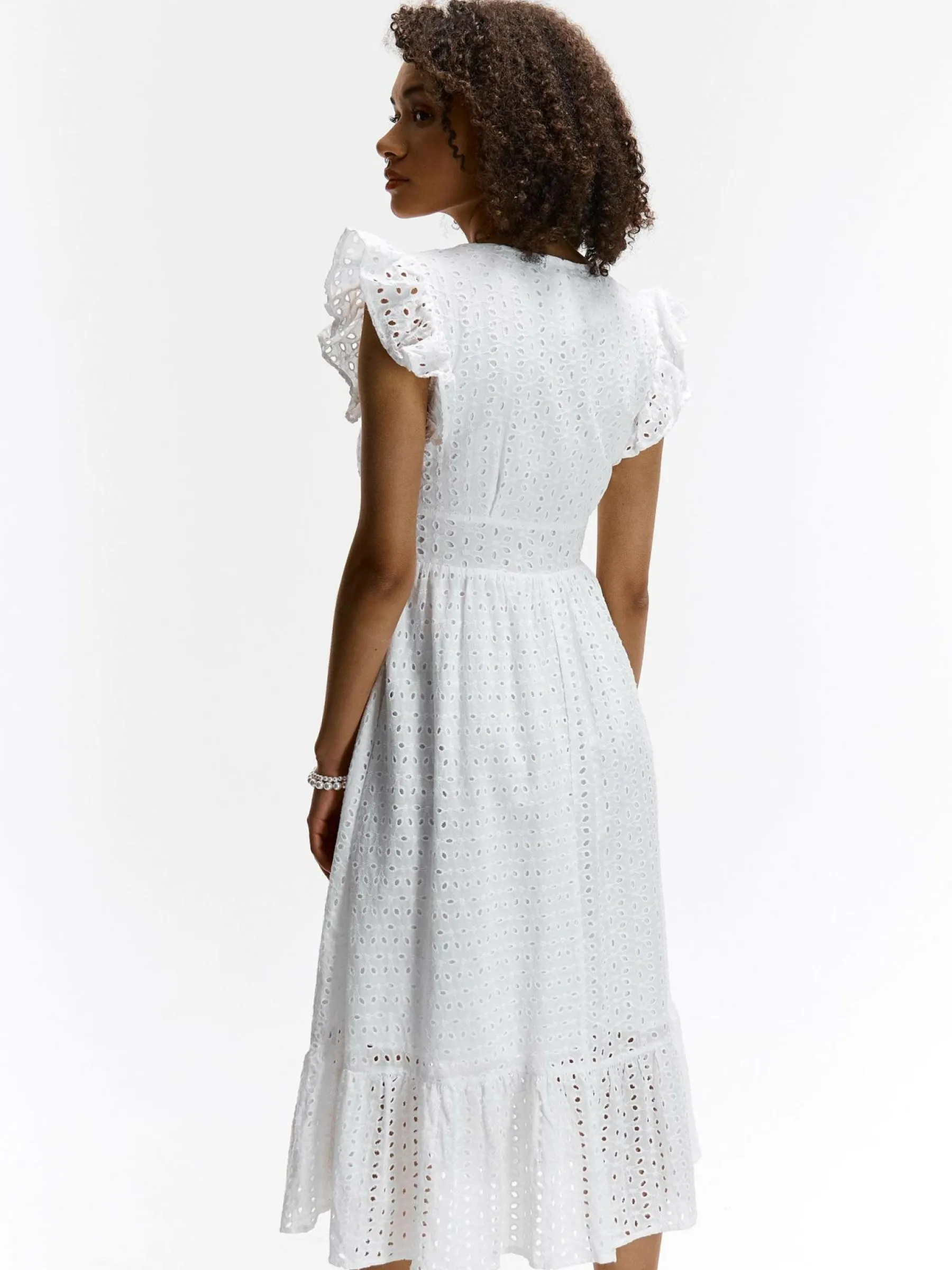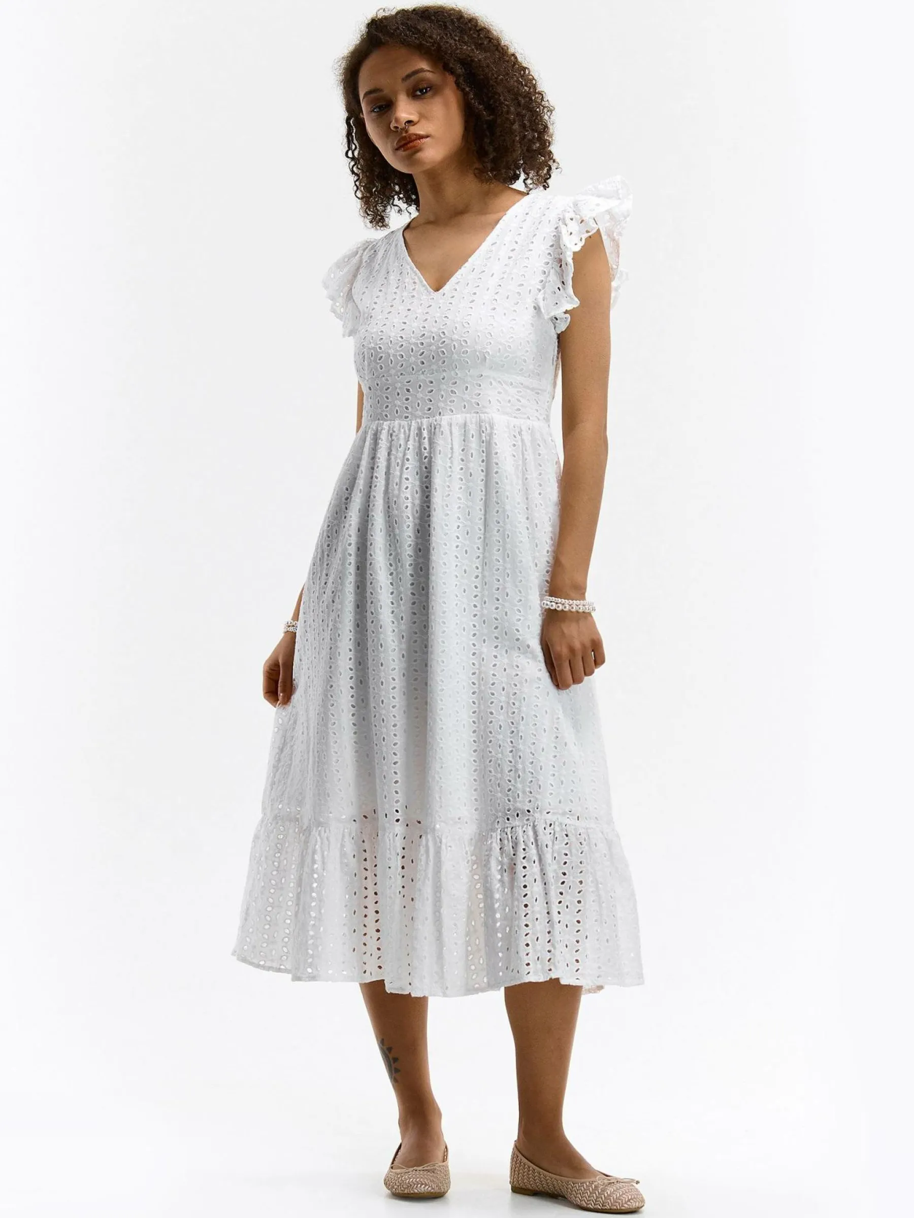 Kolor: białyKrój: z falbanąTyp: sukienkaRekaw: krótki rękawDługość: midiPattern style: haftowane, pojedynczy kol…