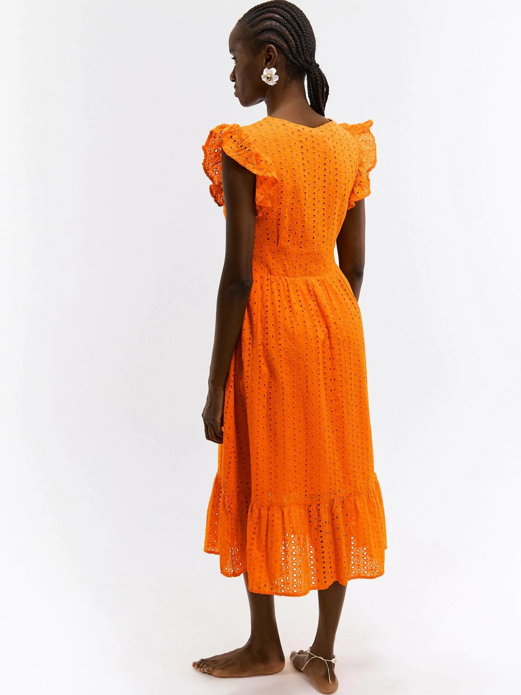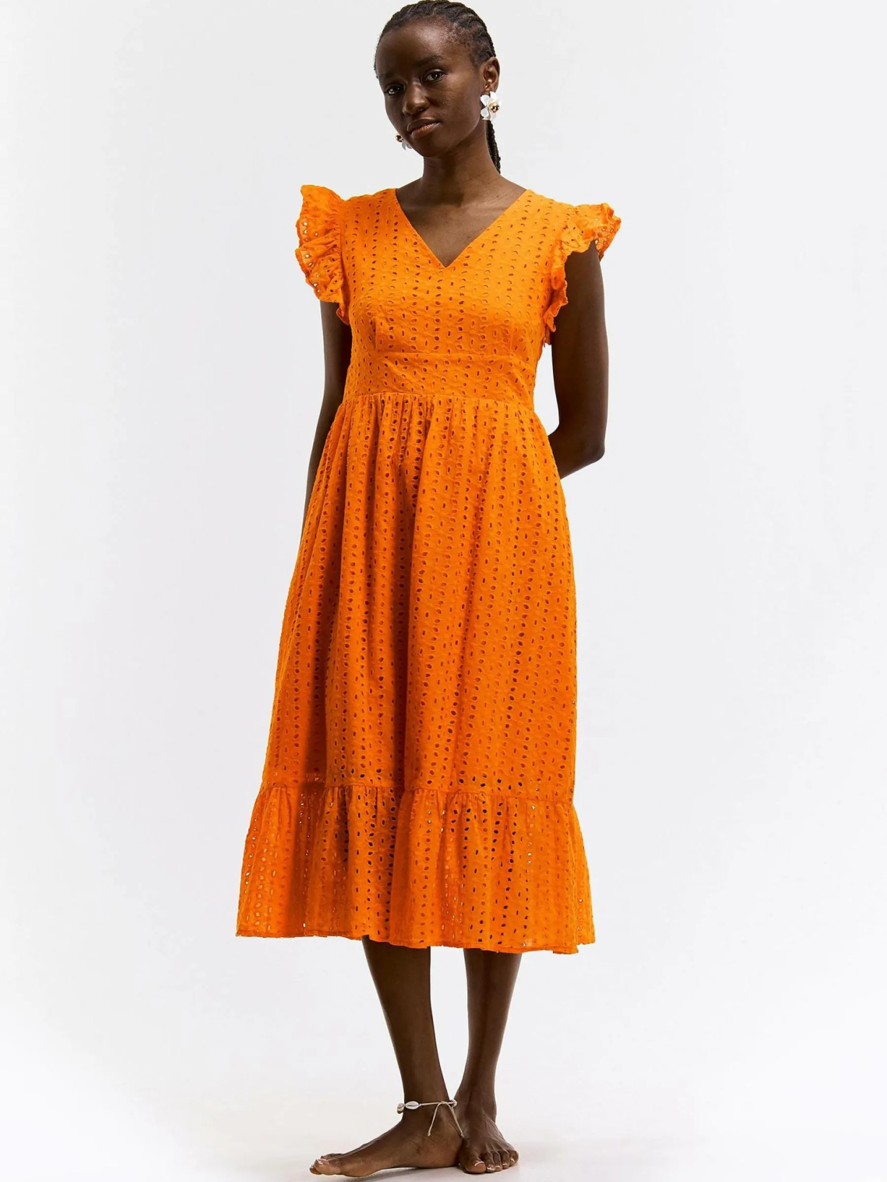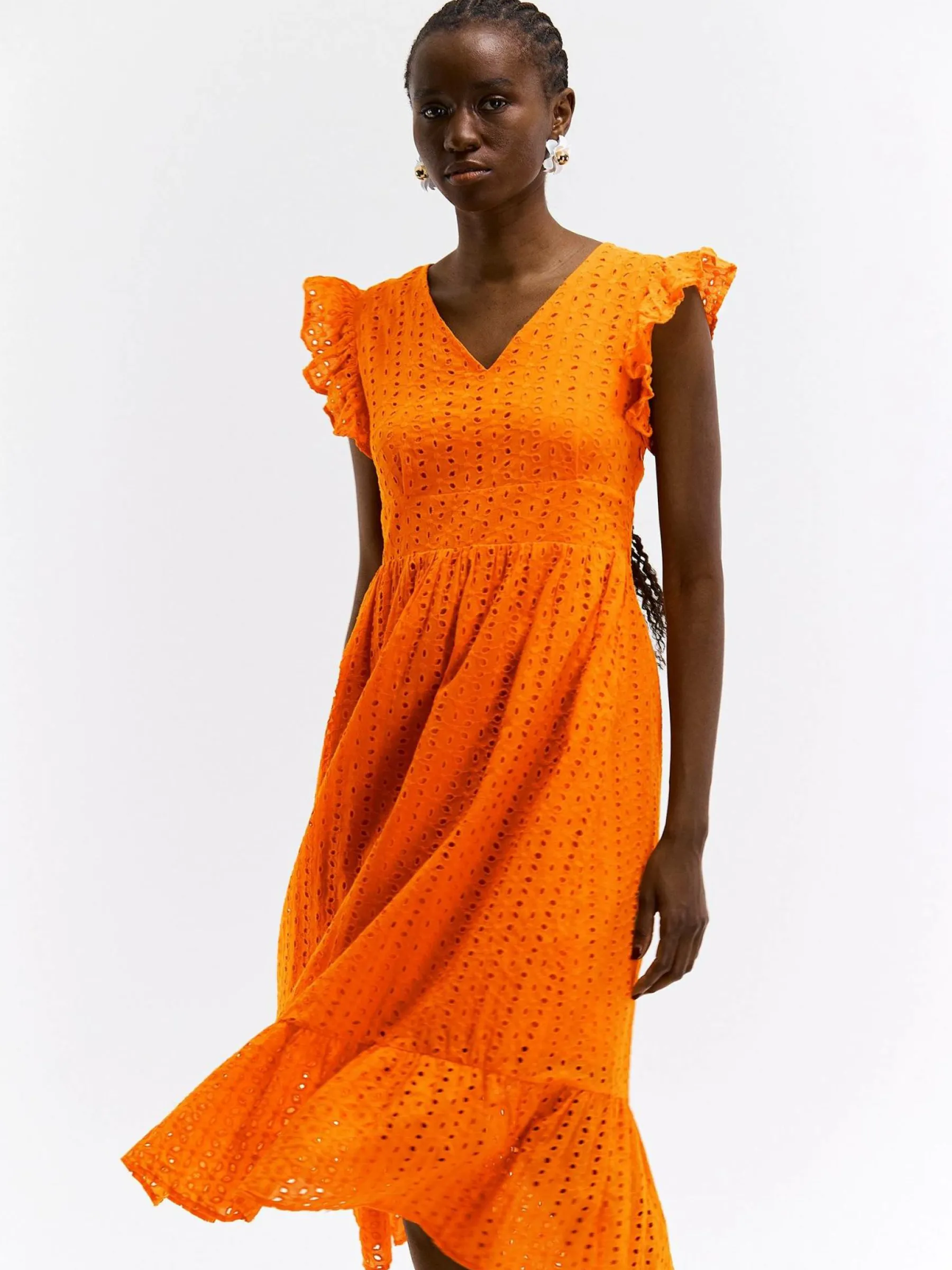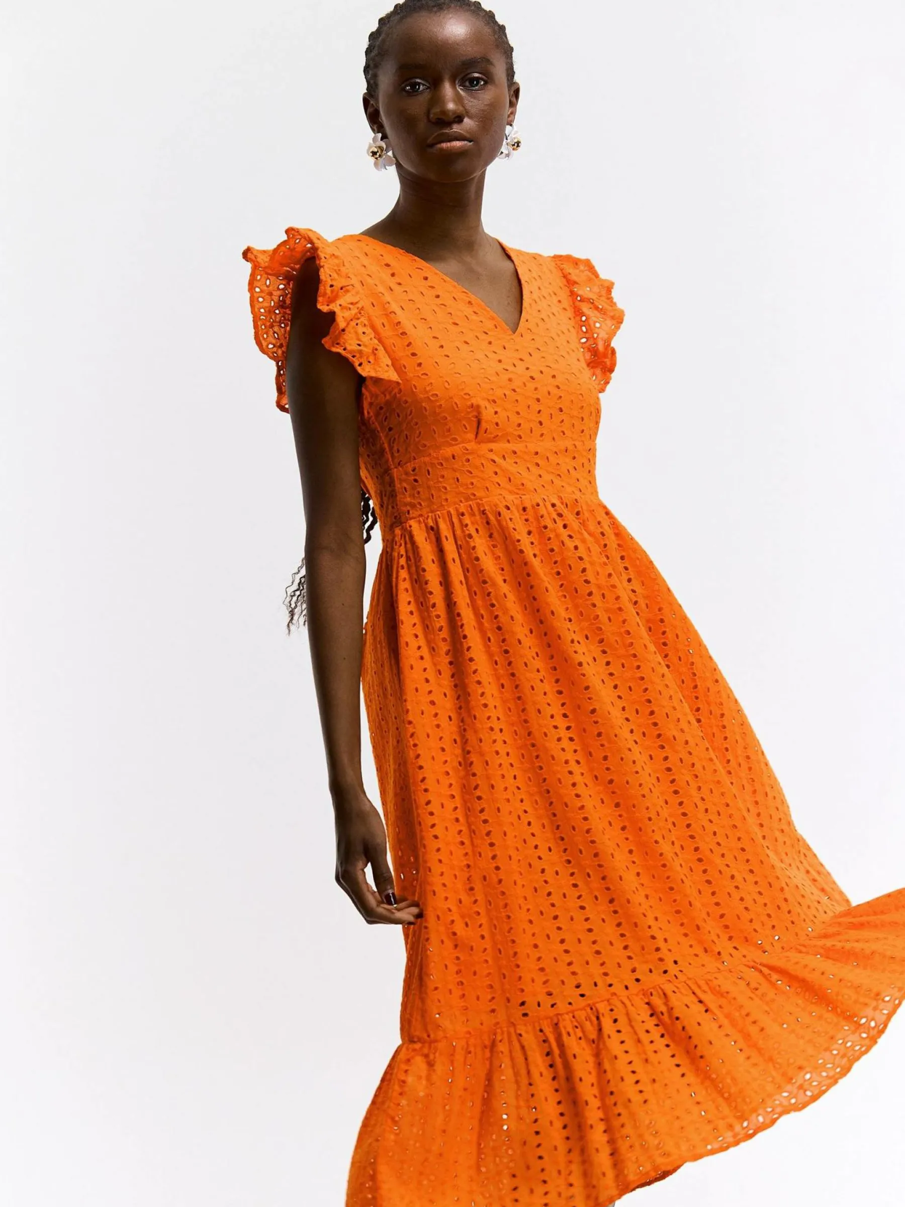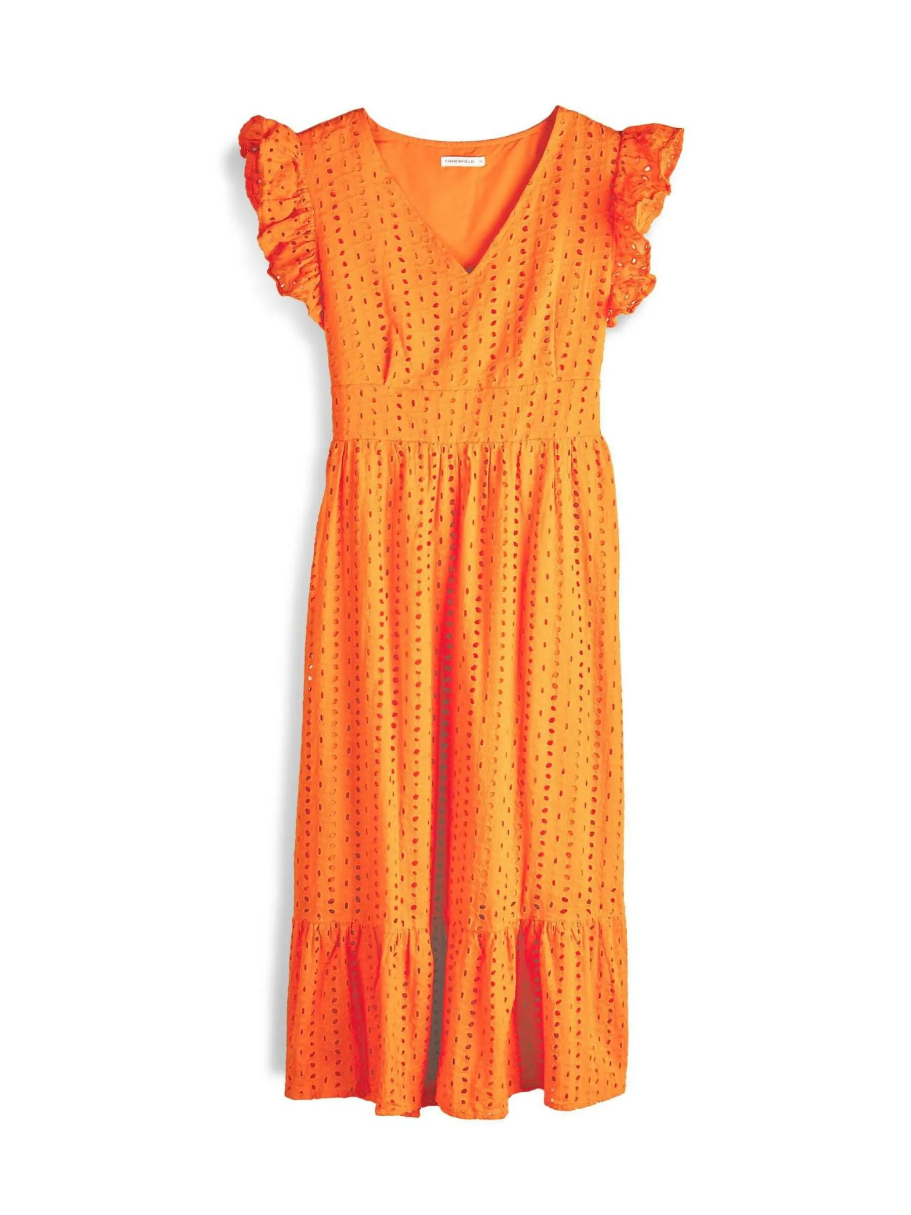 Kolor: pomarańczowyKrój: z falbanąTyp: sukienkaRekaw: krótki rękawDługość: midiPattern style: pojedynczy kolor, …