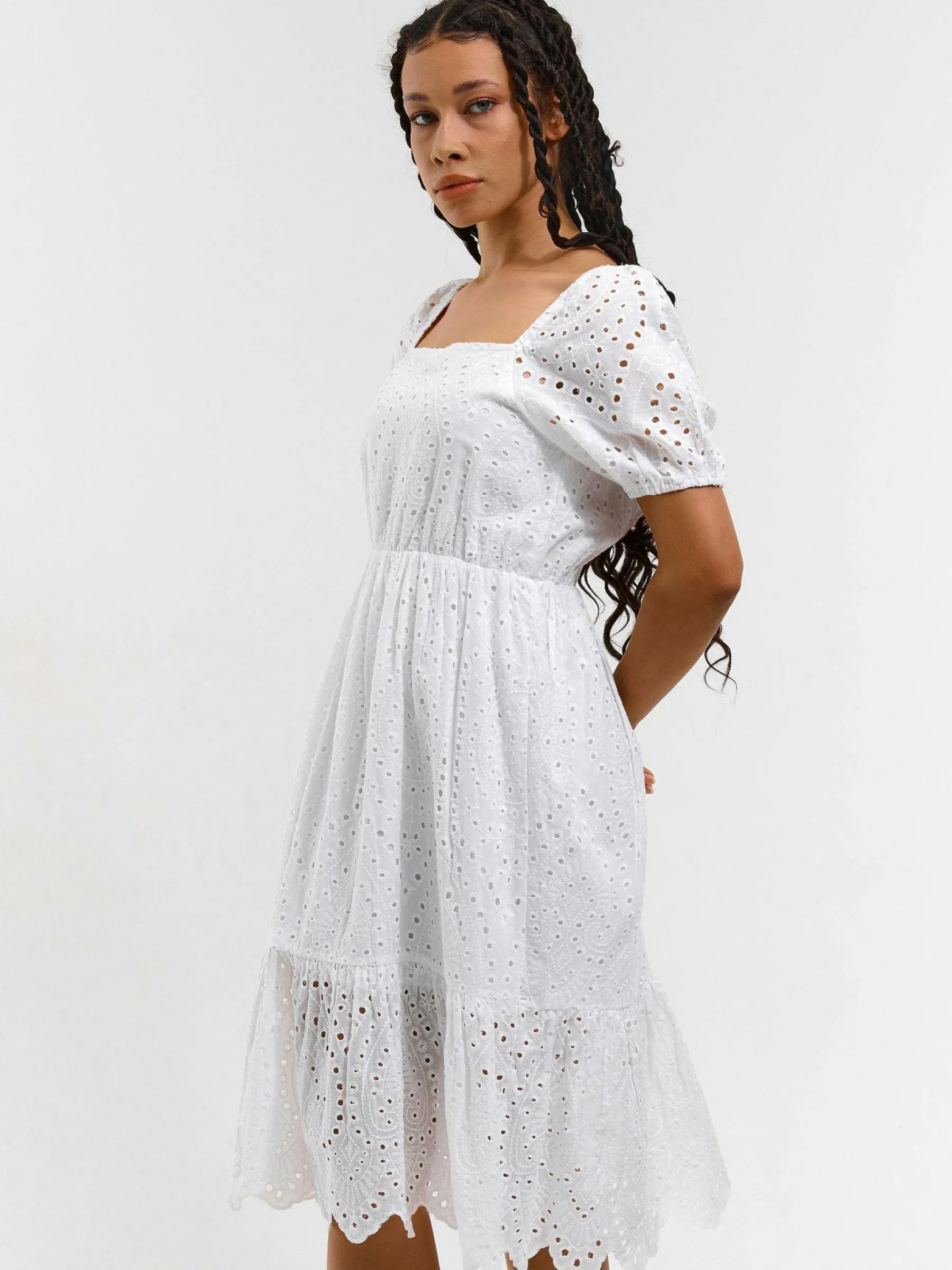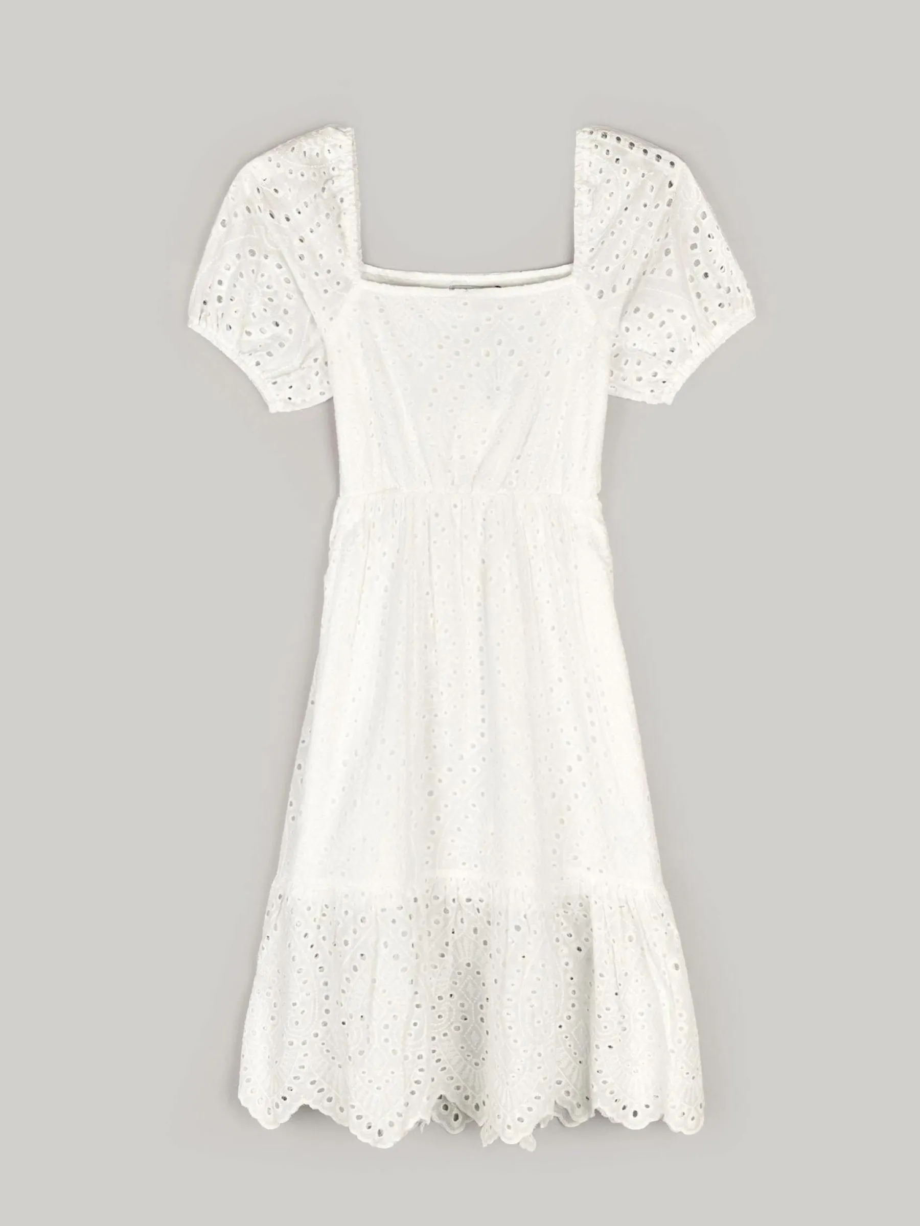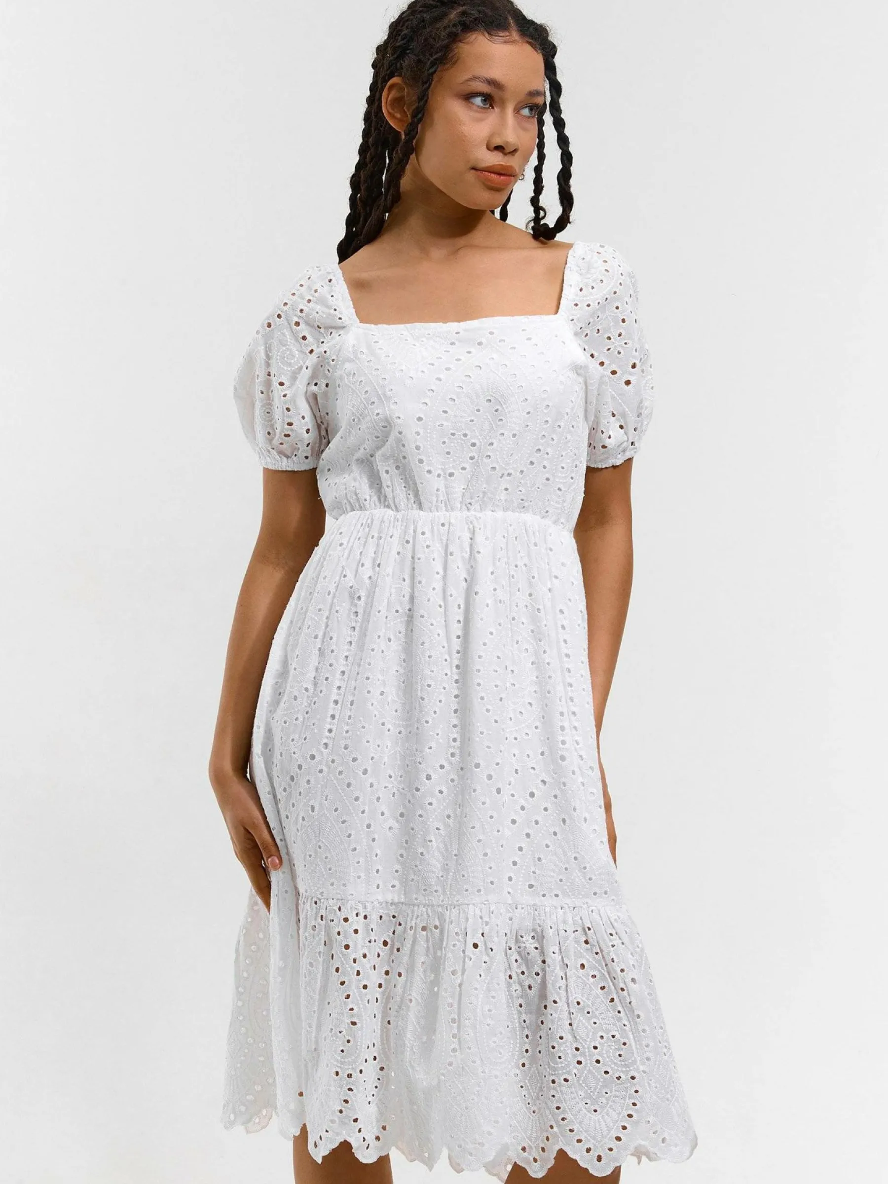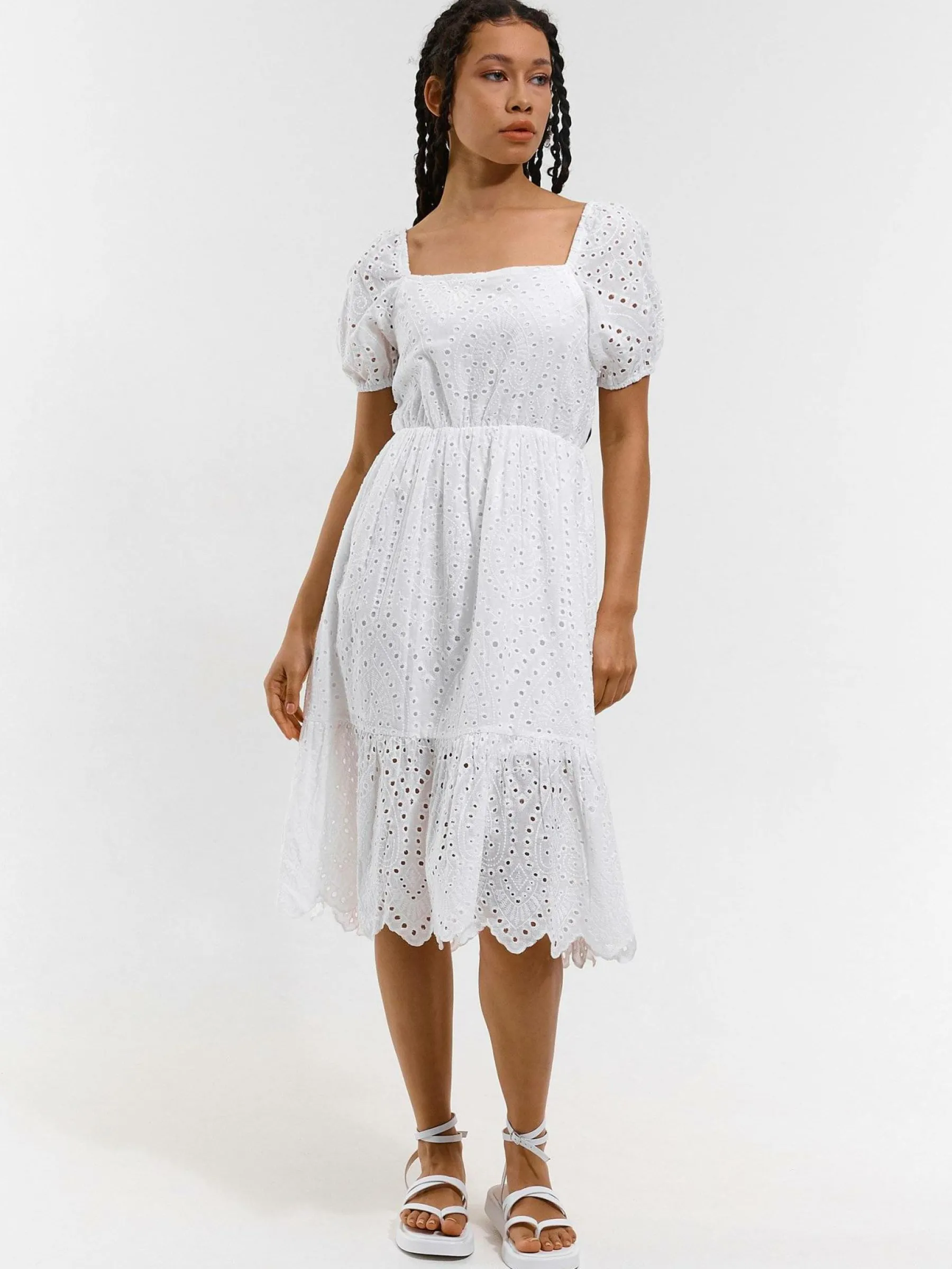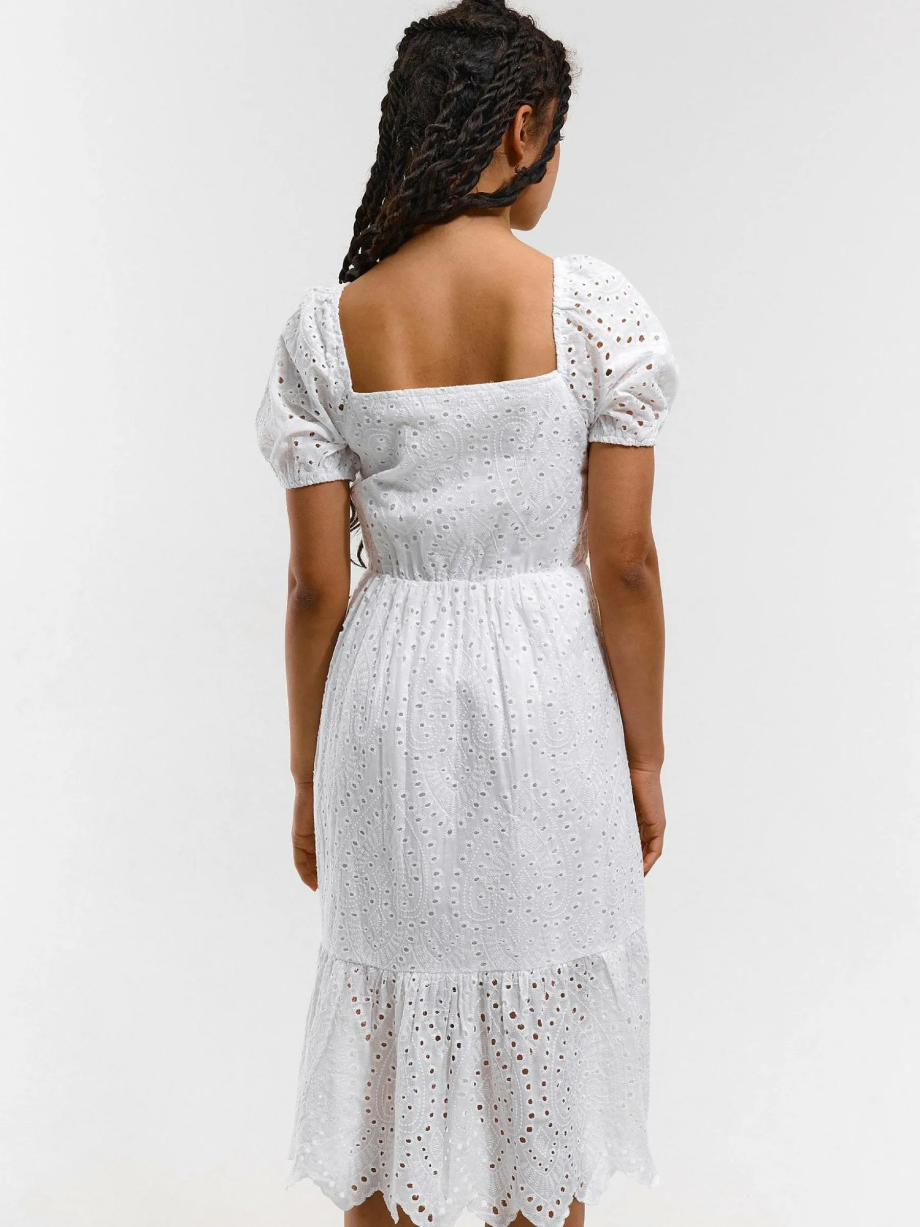 Kolor: białyKrój: z falbanąTyp: sukienkaRekaw: krótki rękawDługość: midiPattern style: haftowane, pojedynczy kol…