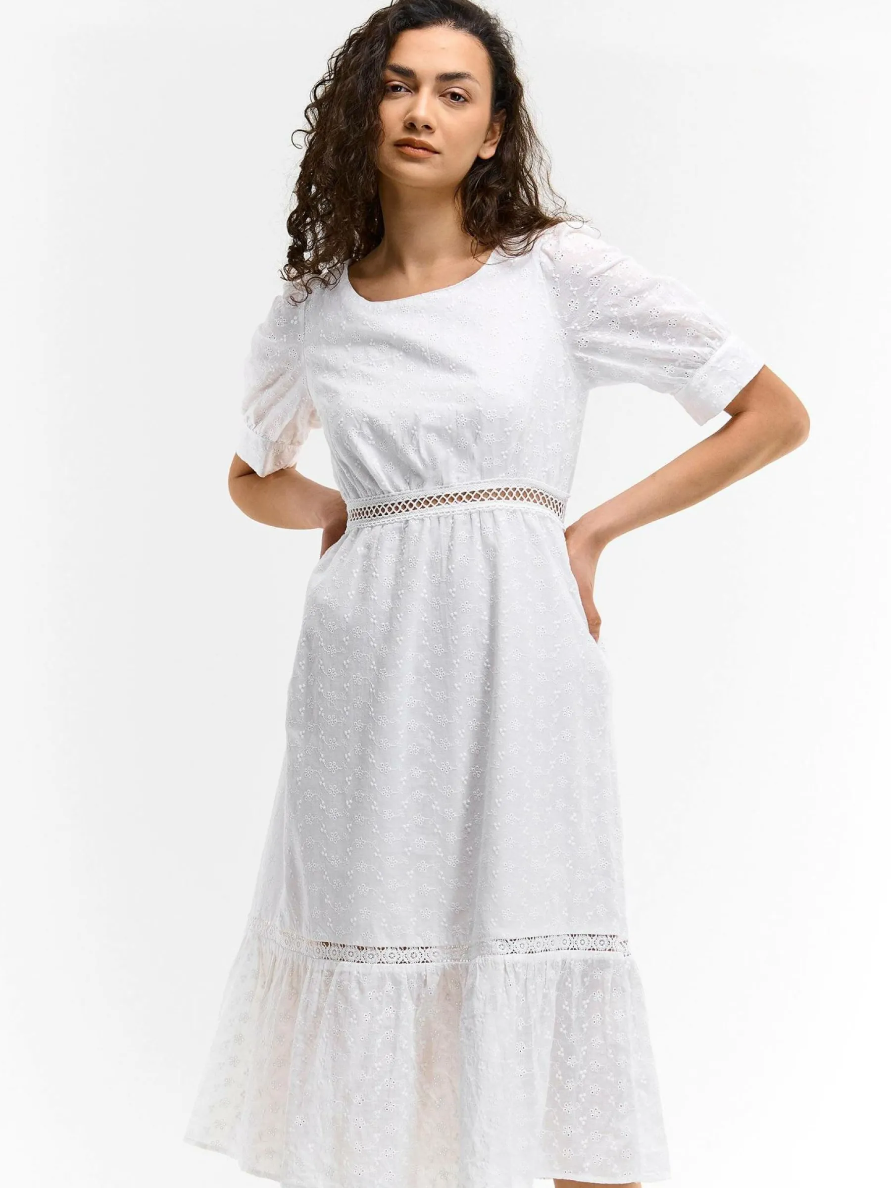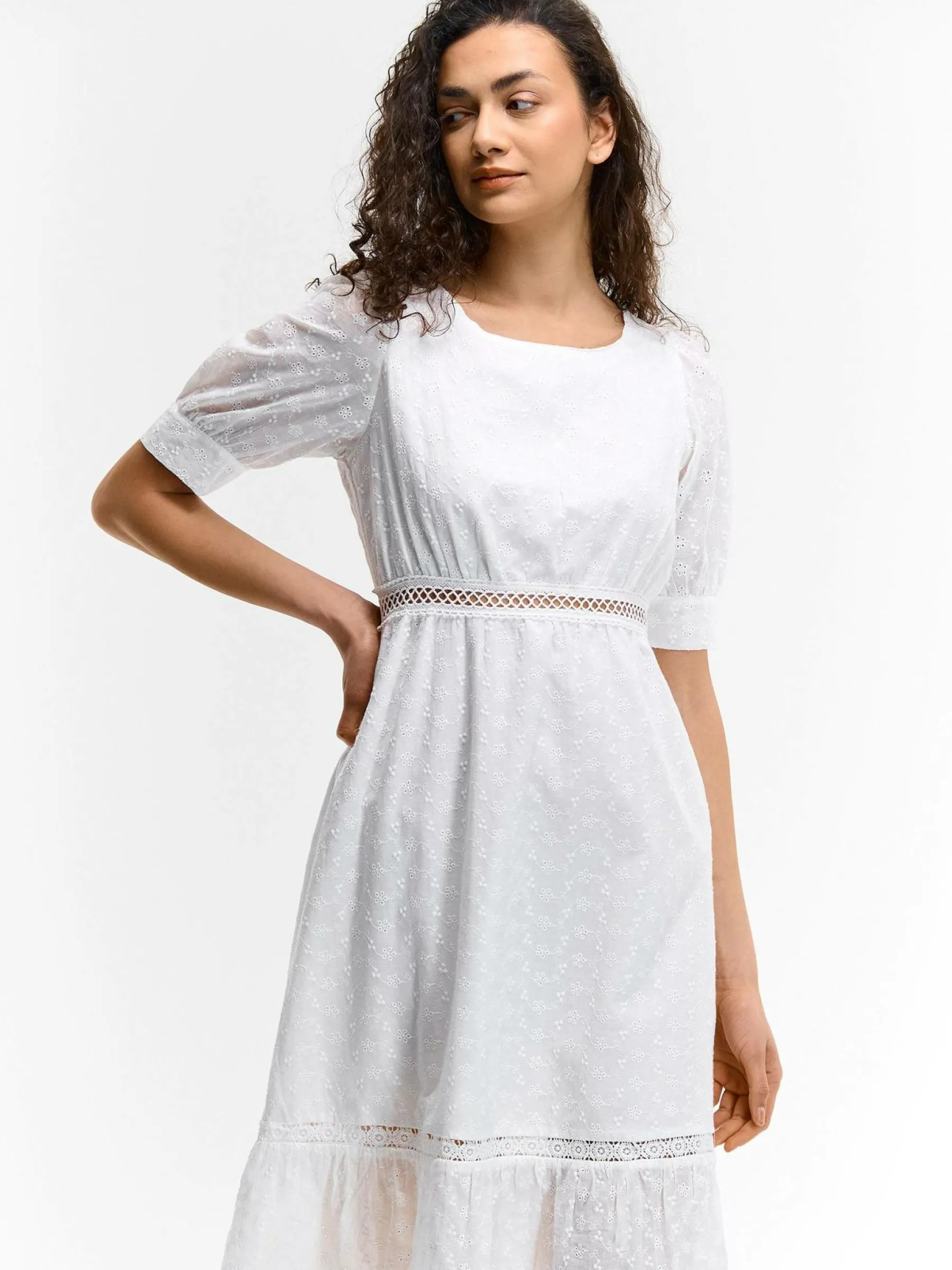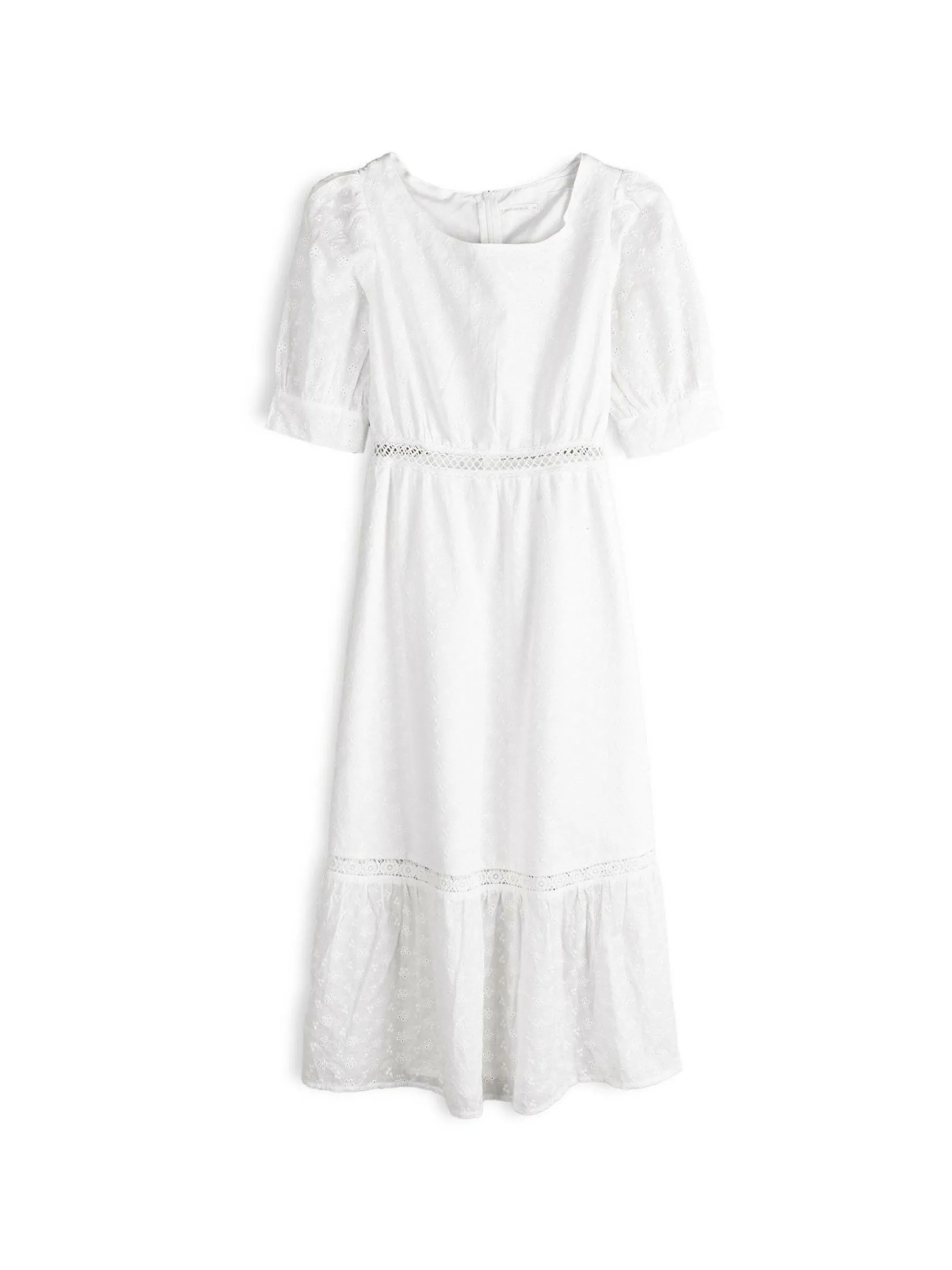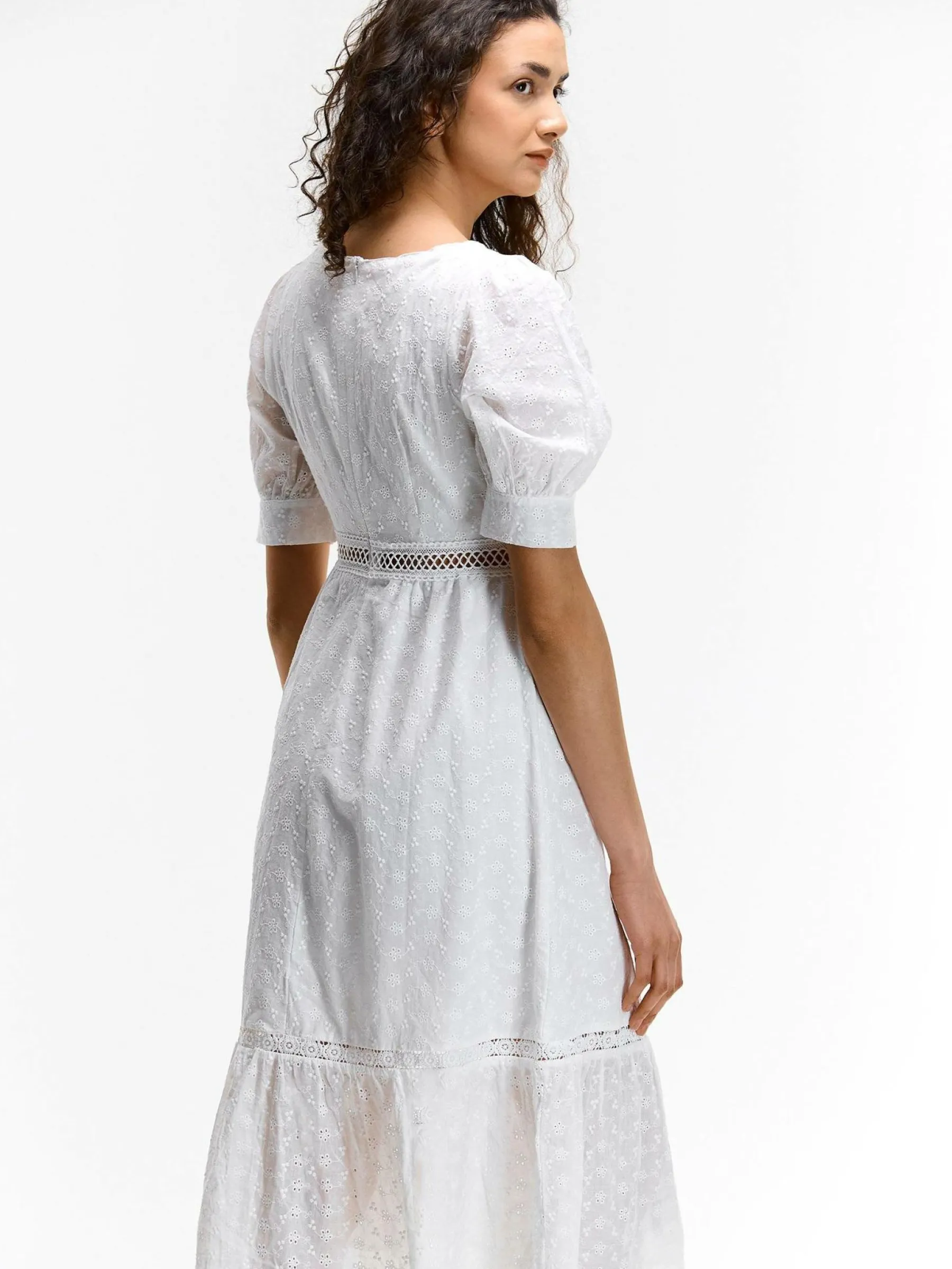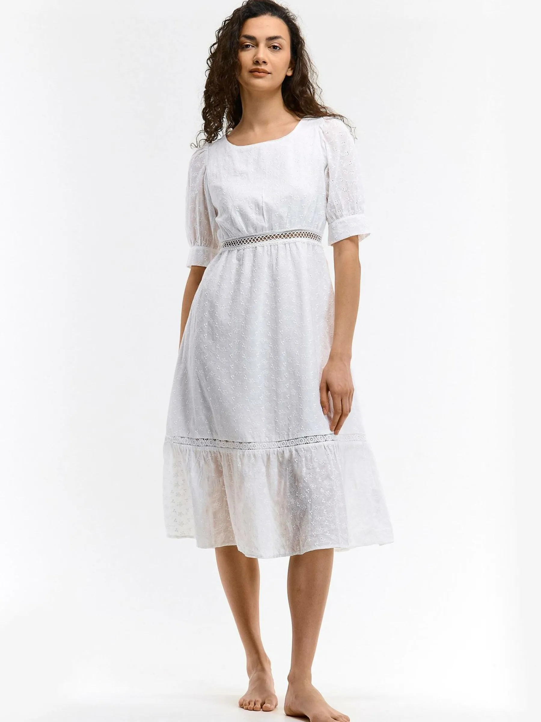 Kolor: białyKrój: z falbanąTyp: sukienkaRekaw: krótki rękawDługość: midiPattern style: pojedynczy kolor, haftowa…