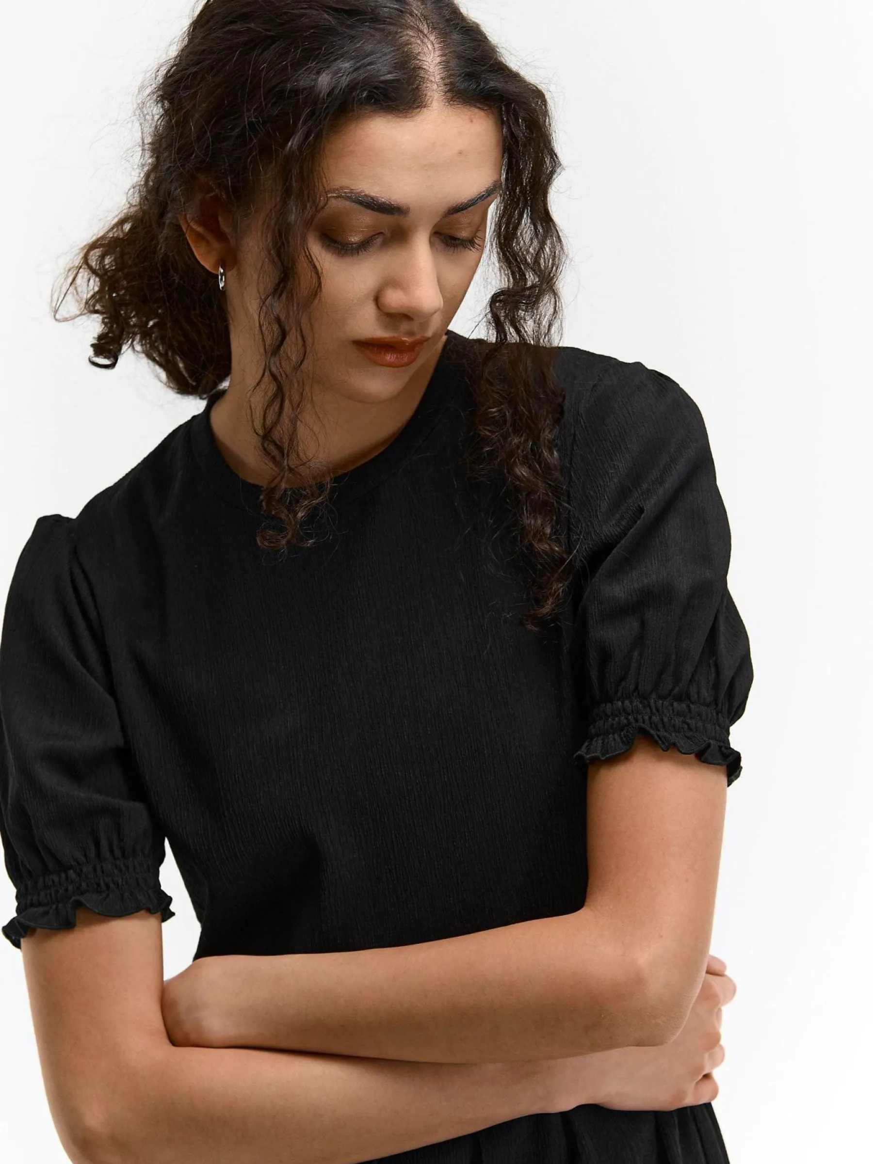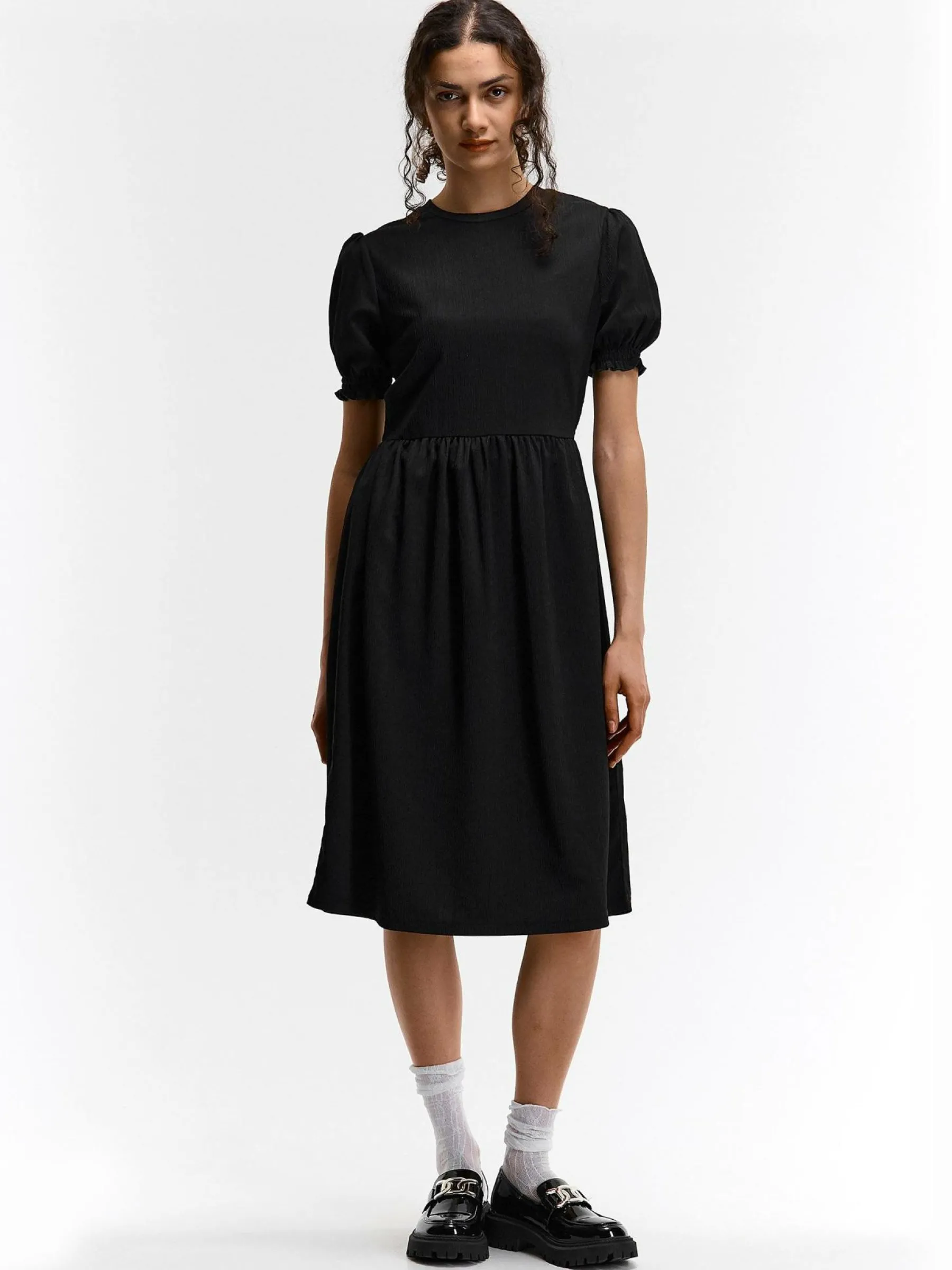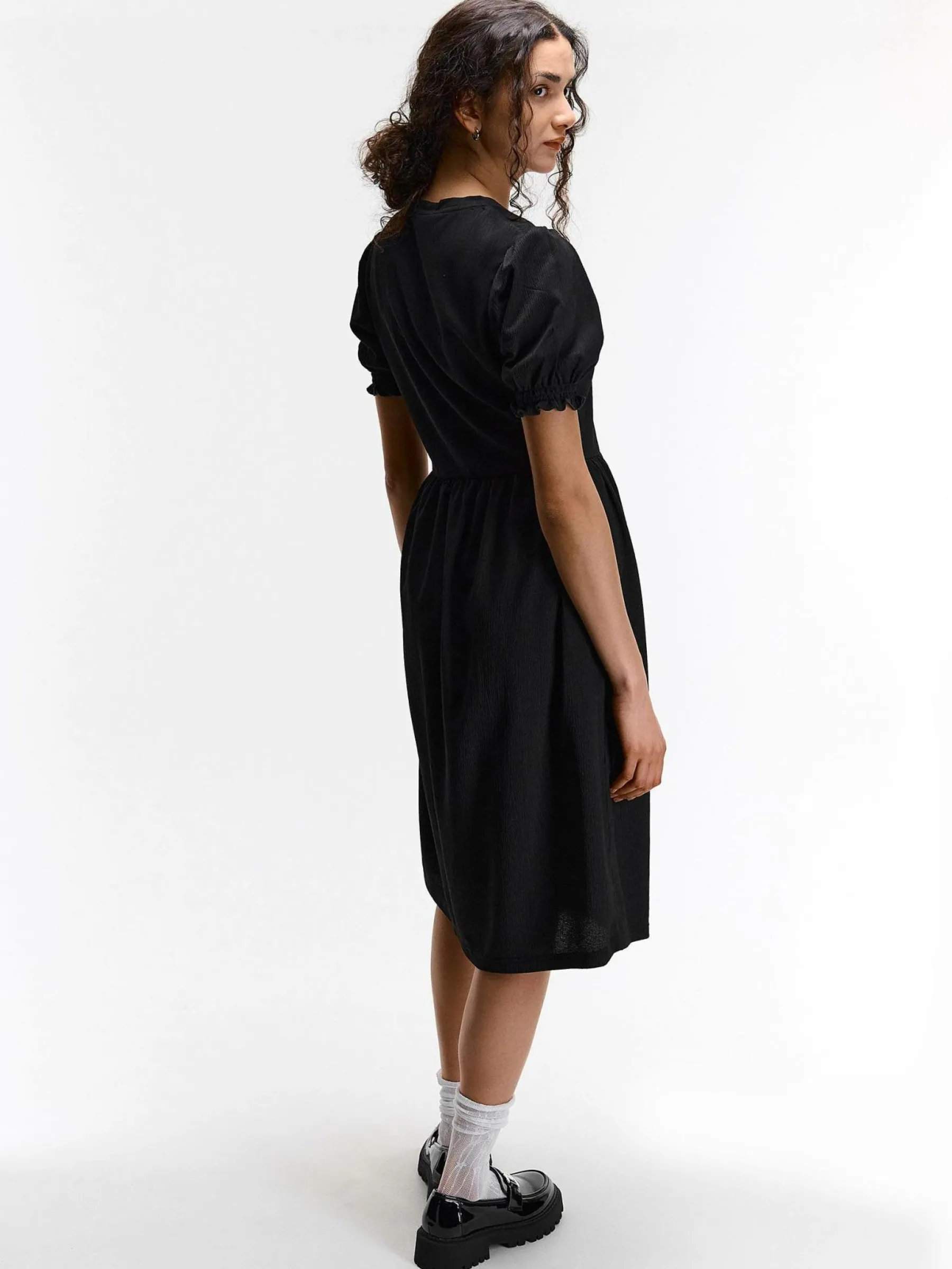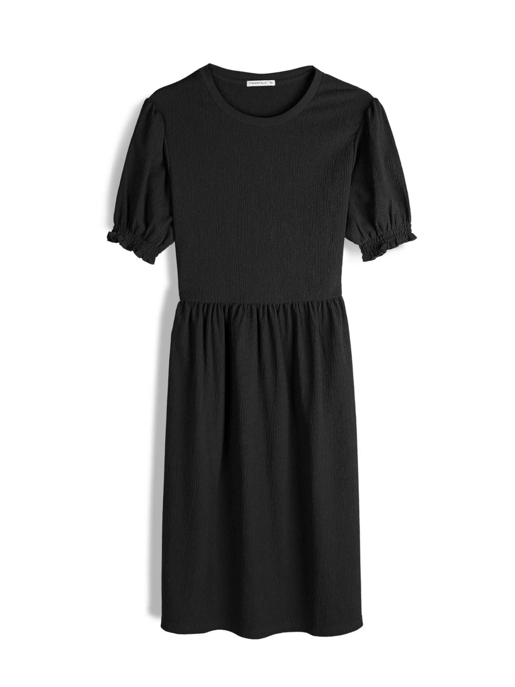 Kolor: czarnyKrój: asyTyp: sukienkaRekaw: krótki rękawDługość: midiPattern style: pojedynczy kolor, strukturowaneD…