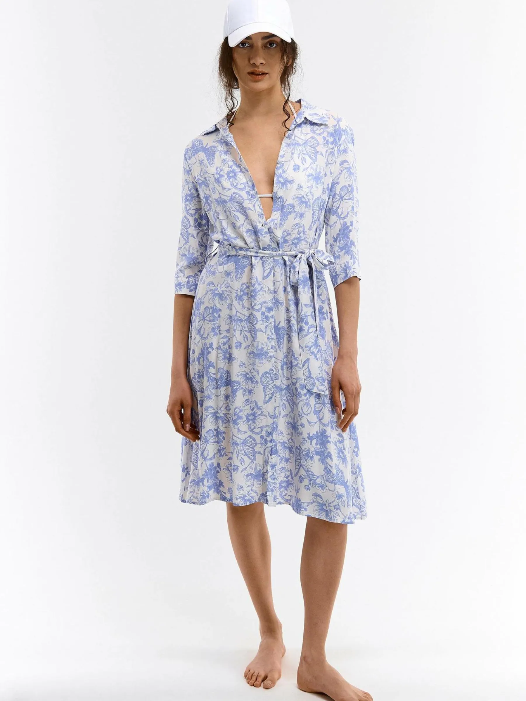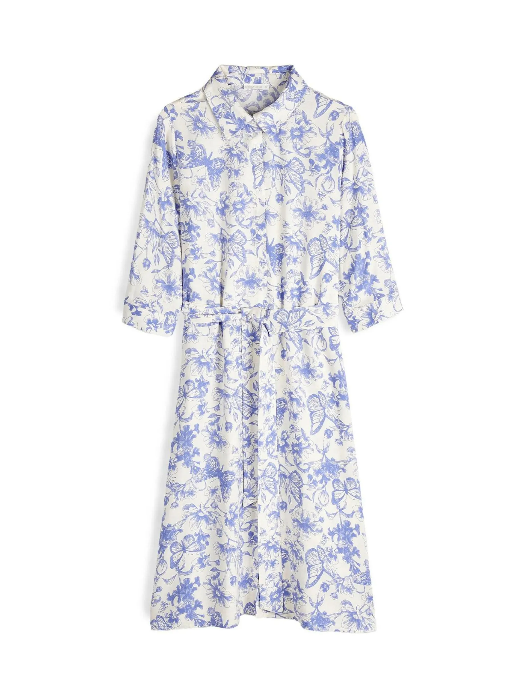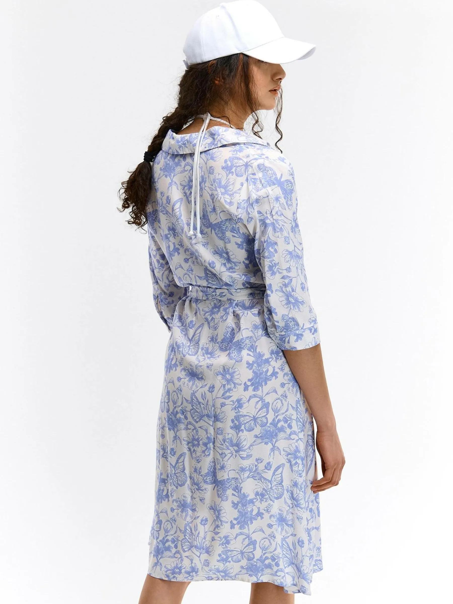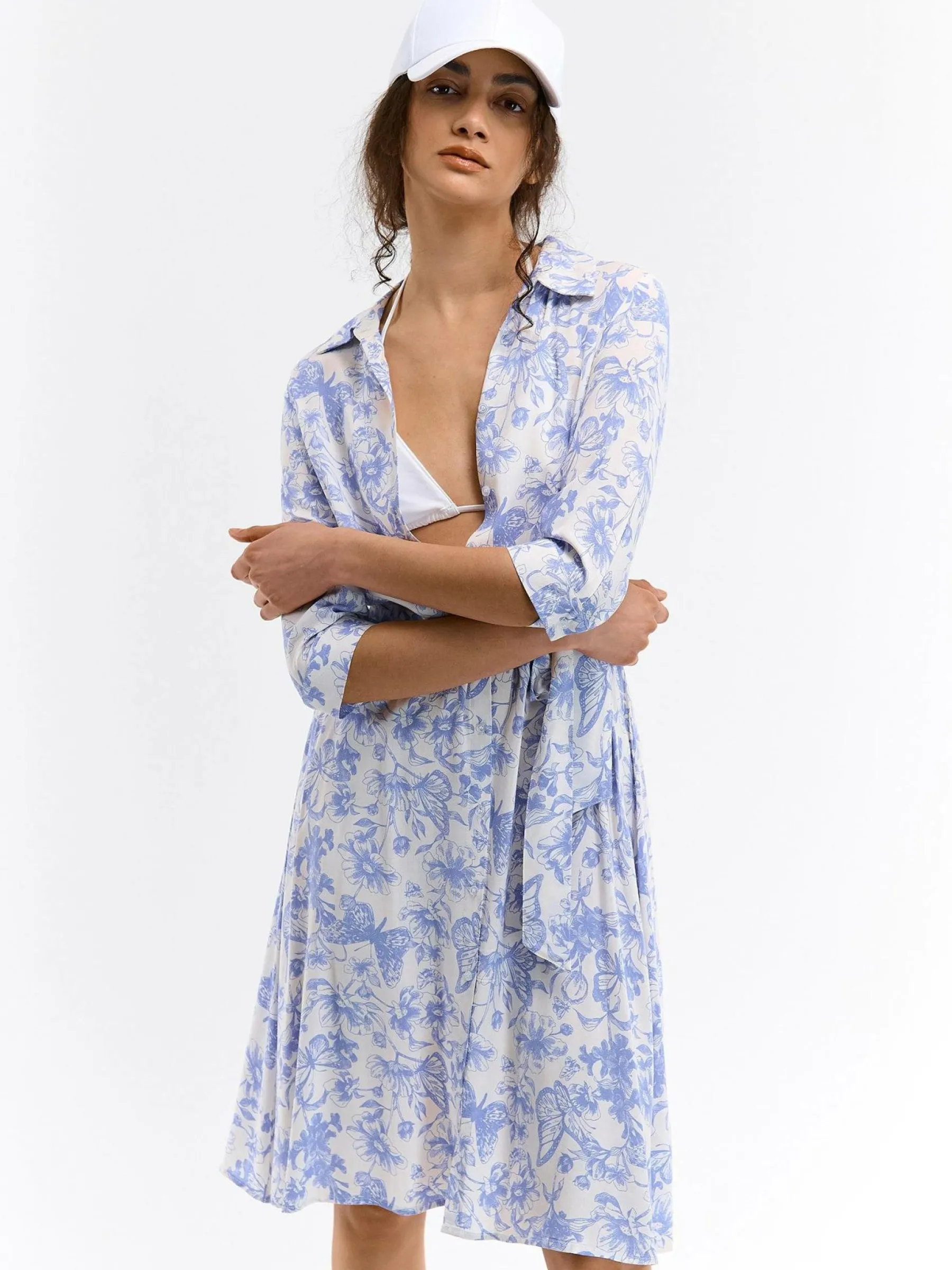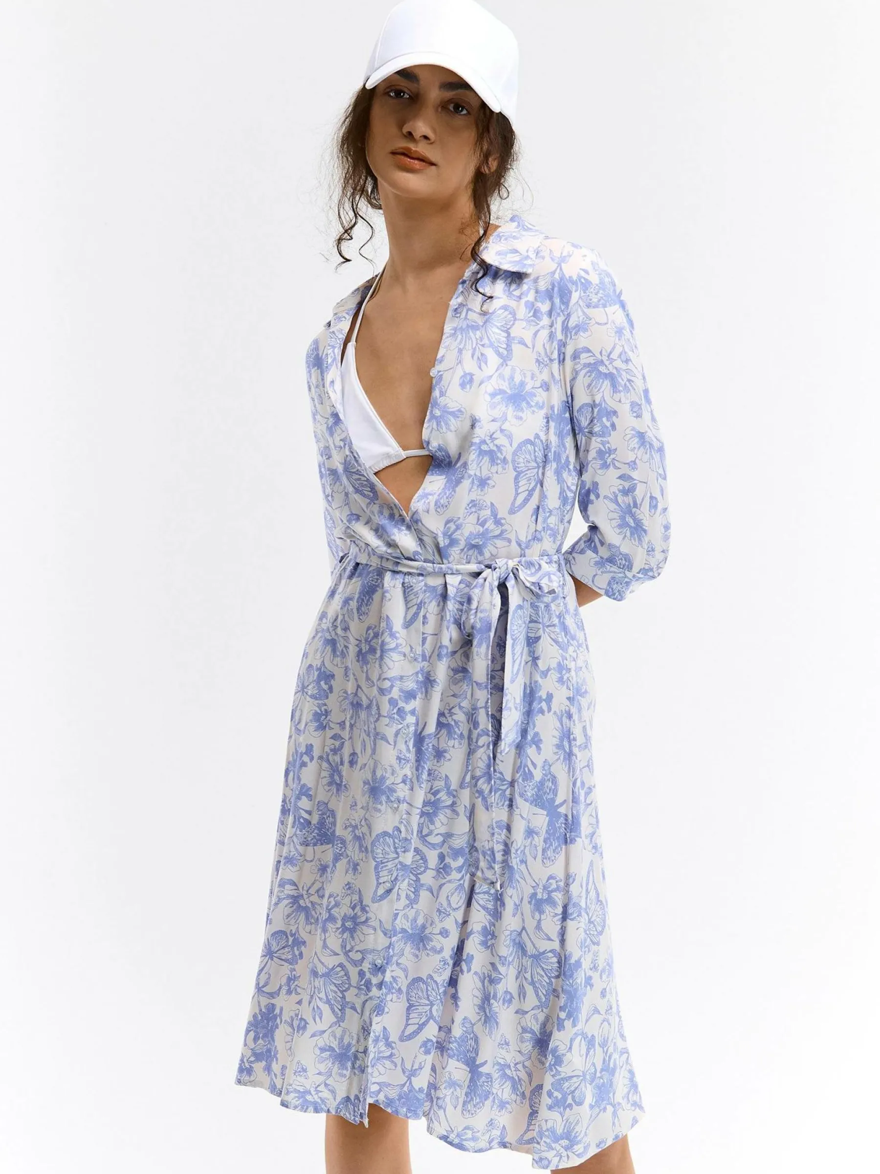 Kolor: beżowyKrój: koszuloweTyp: sukienkaRekaw: rękaw 3/4Długość: midiPattern style: kwiatoweDetal: na guziki, z p…