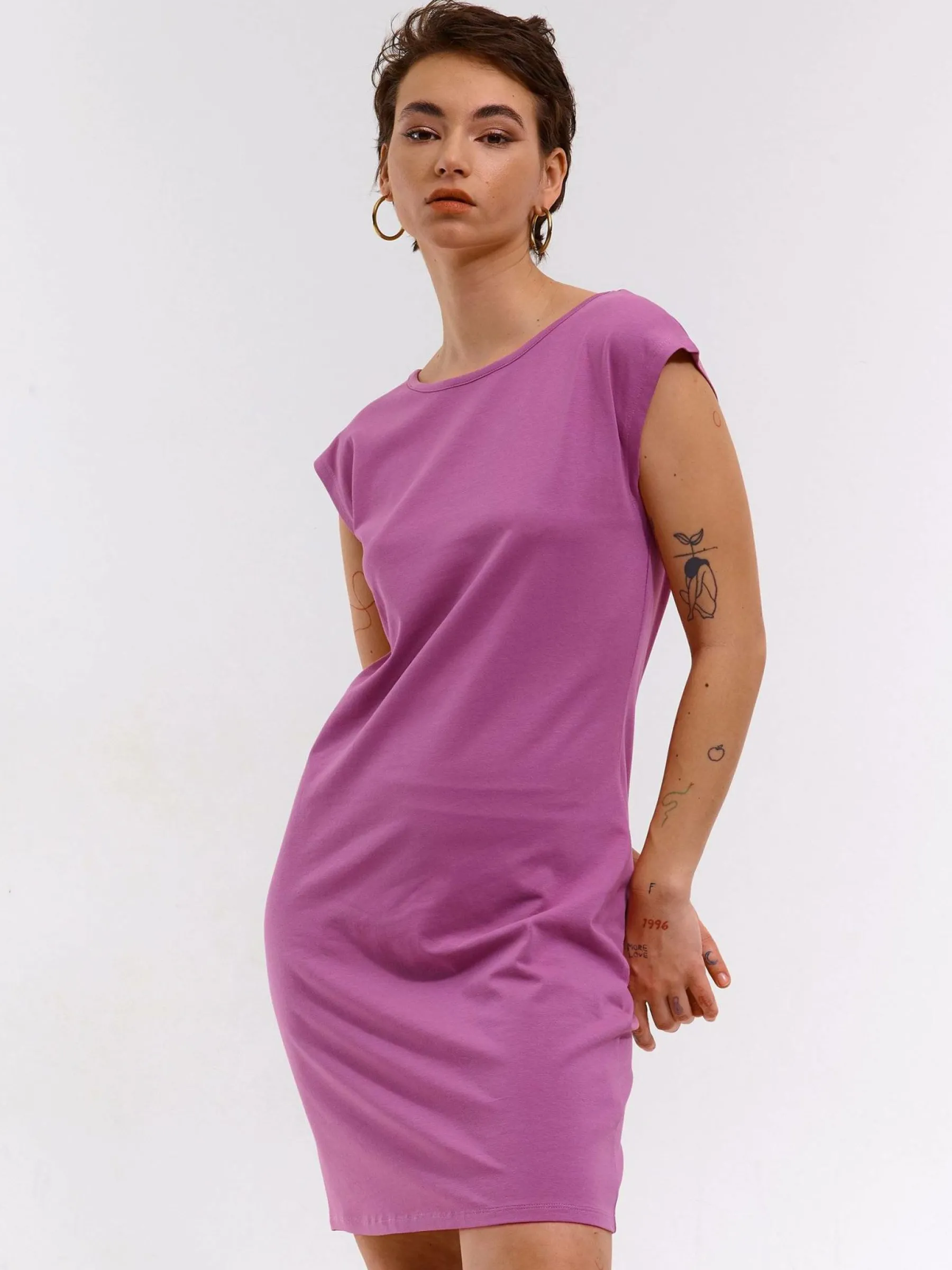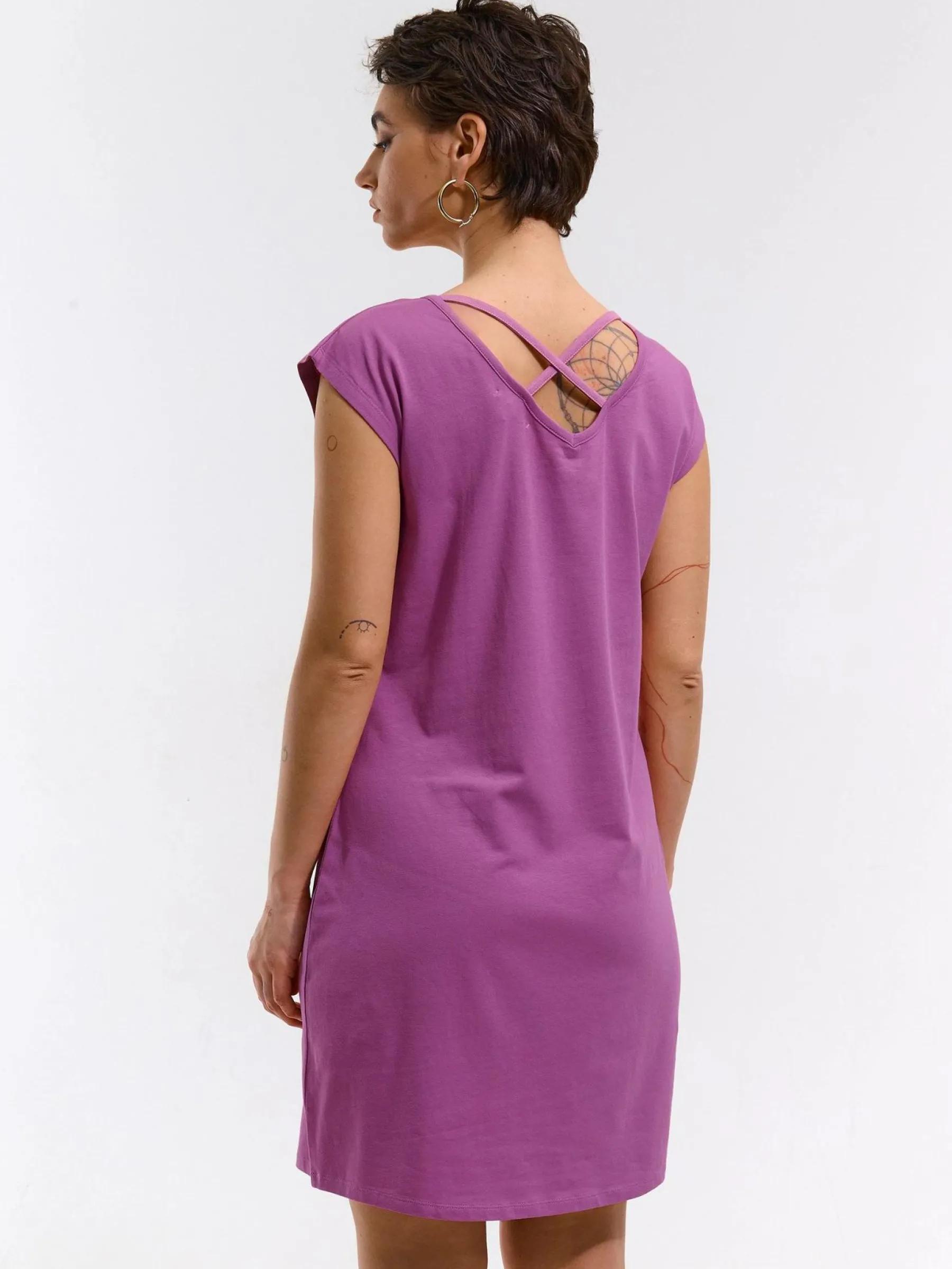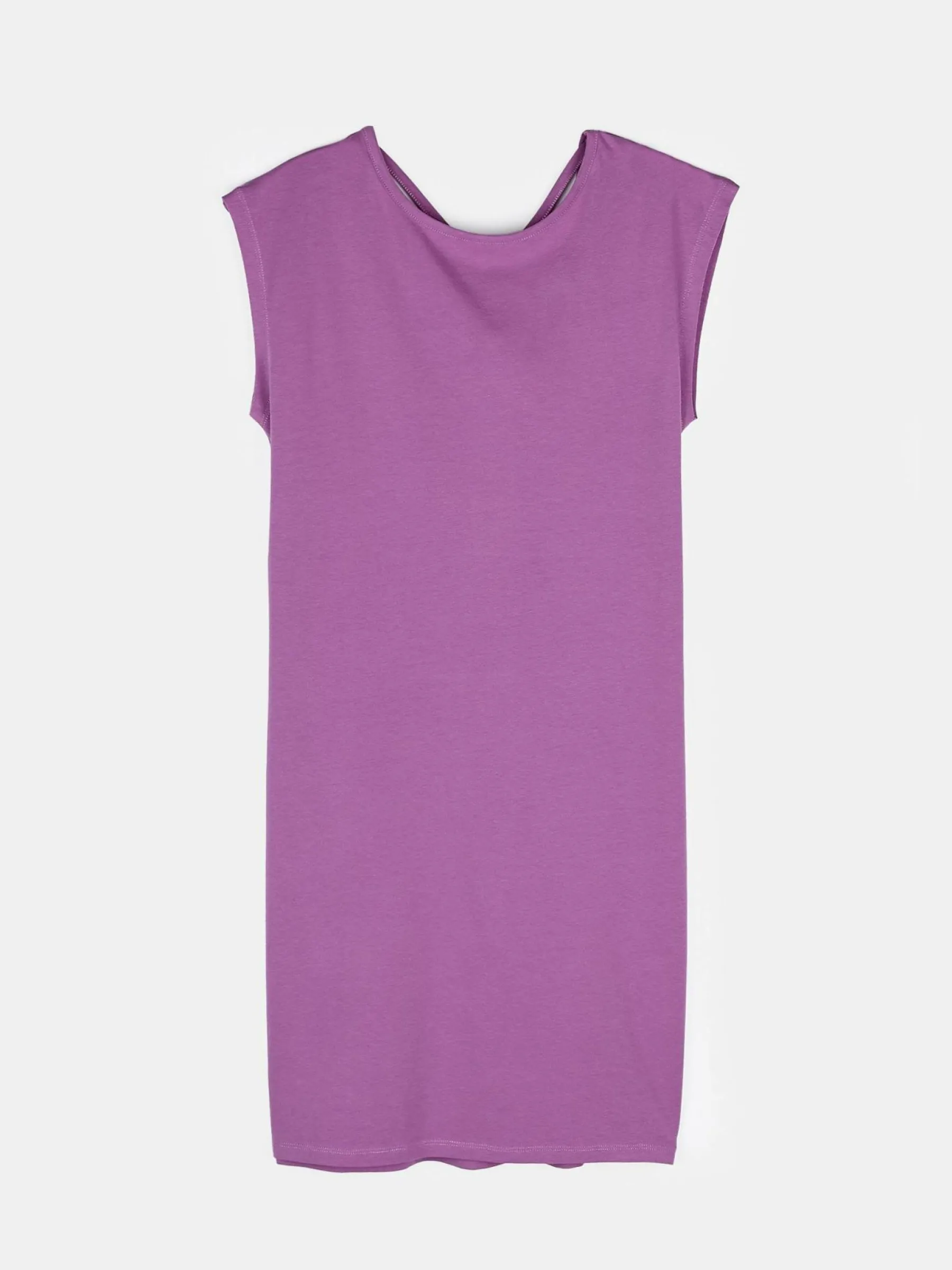 Kolor: purpurowyKrój: regularTyp: sukienkaRekaw: bez rękawówDługość: miniPattern style: pojedynczy kolorDetal: nad…