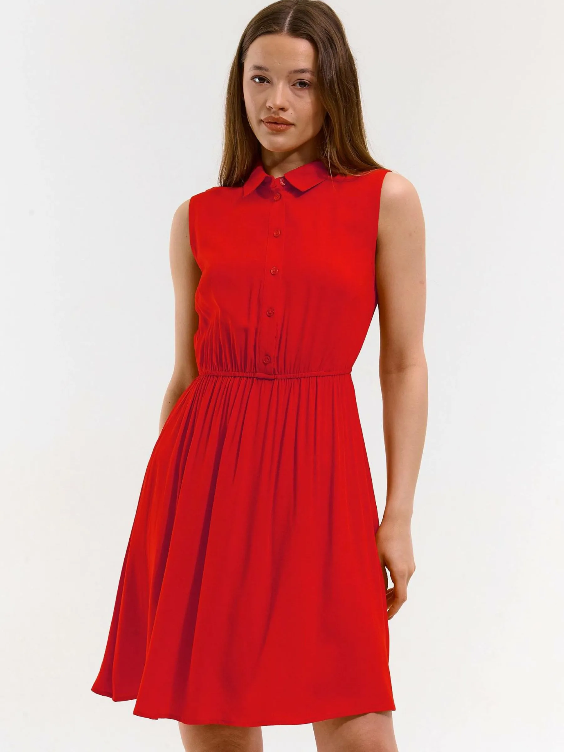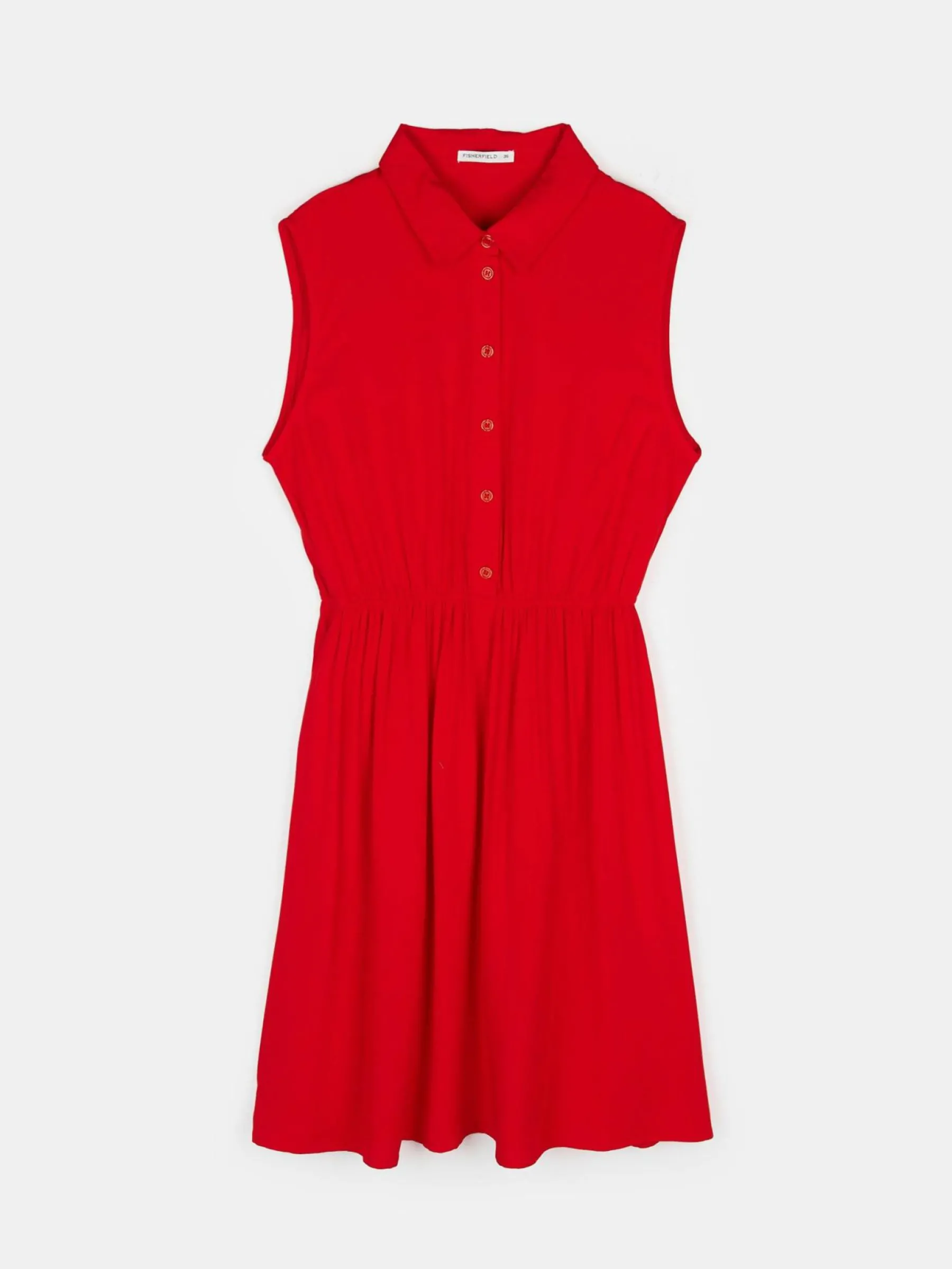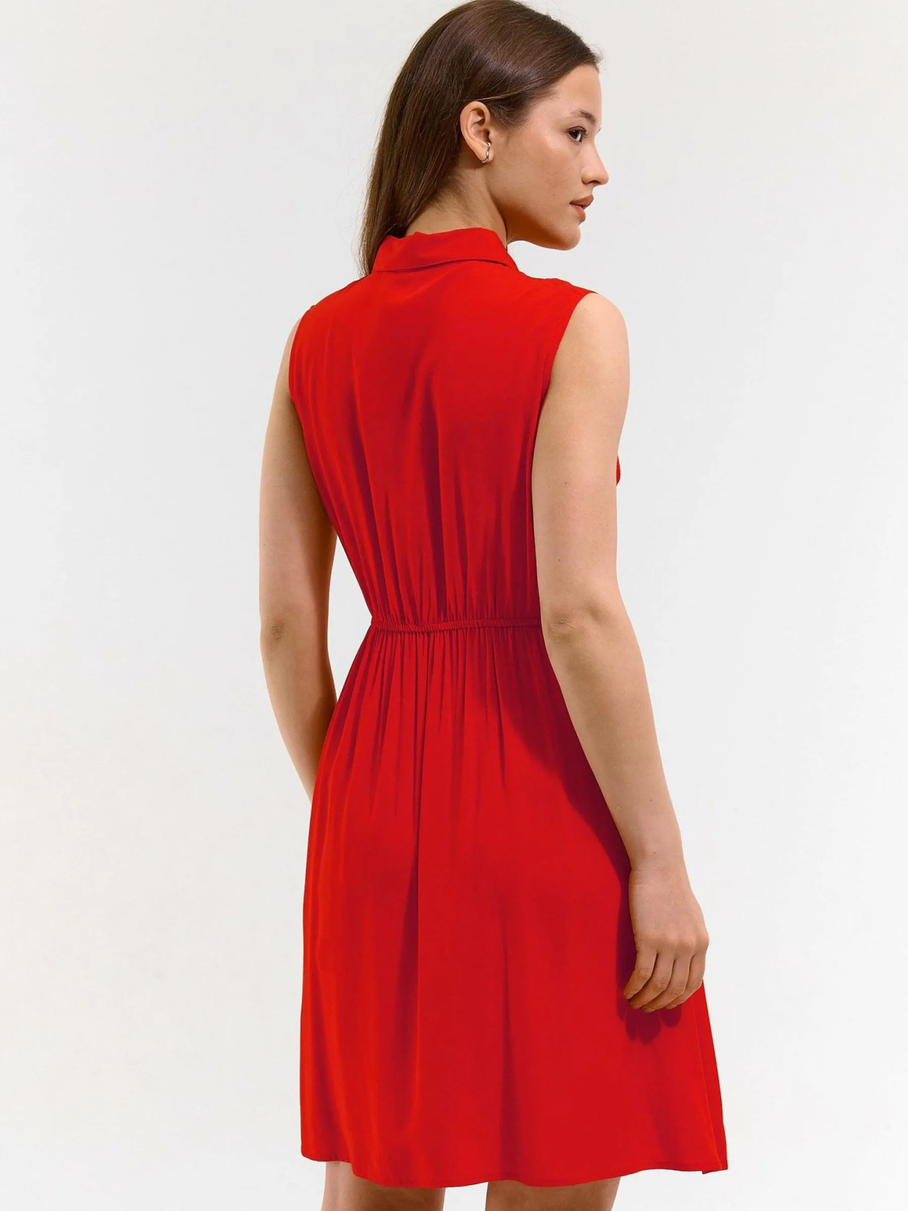 Kolor: czerwonyKrój: koszuloweTyp: sukienkaRekaw: bez rękawówDługość: miniPattern style: pojedynczy kolorDetal: z …