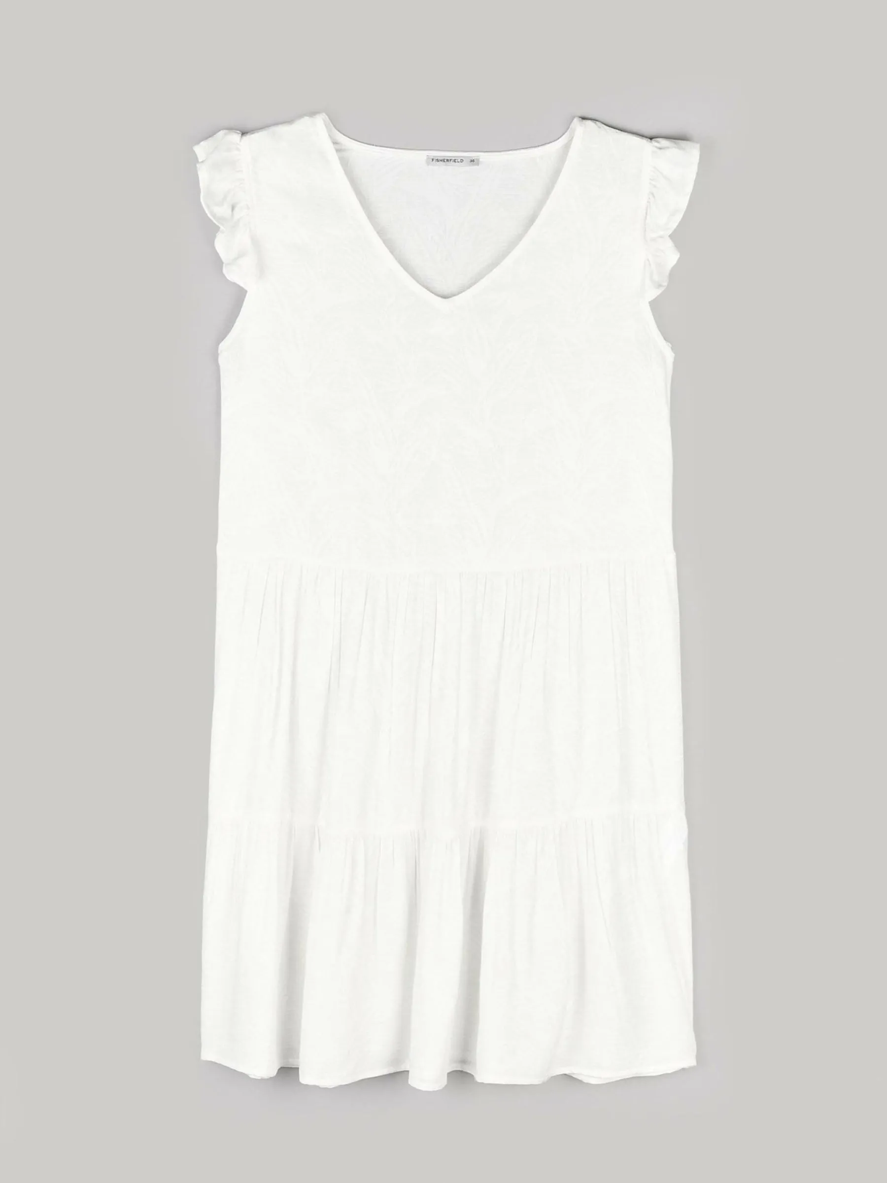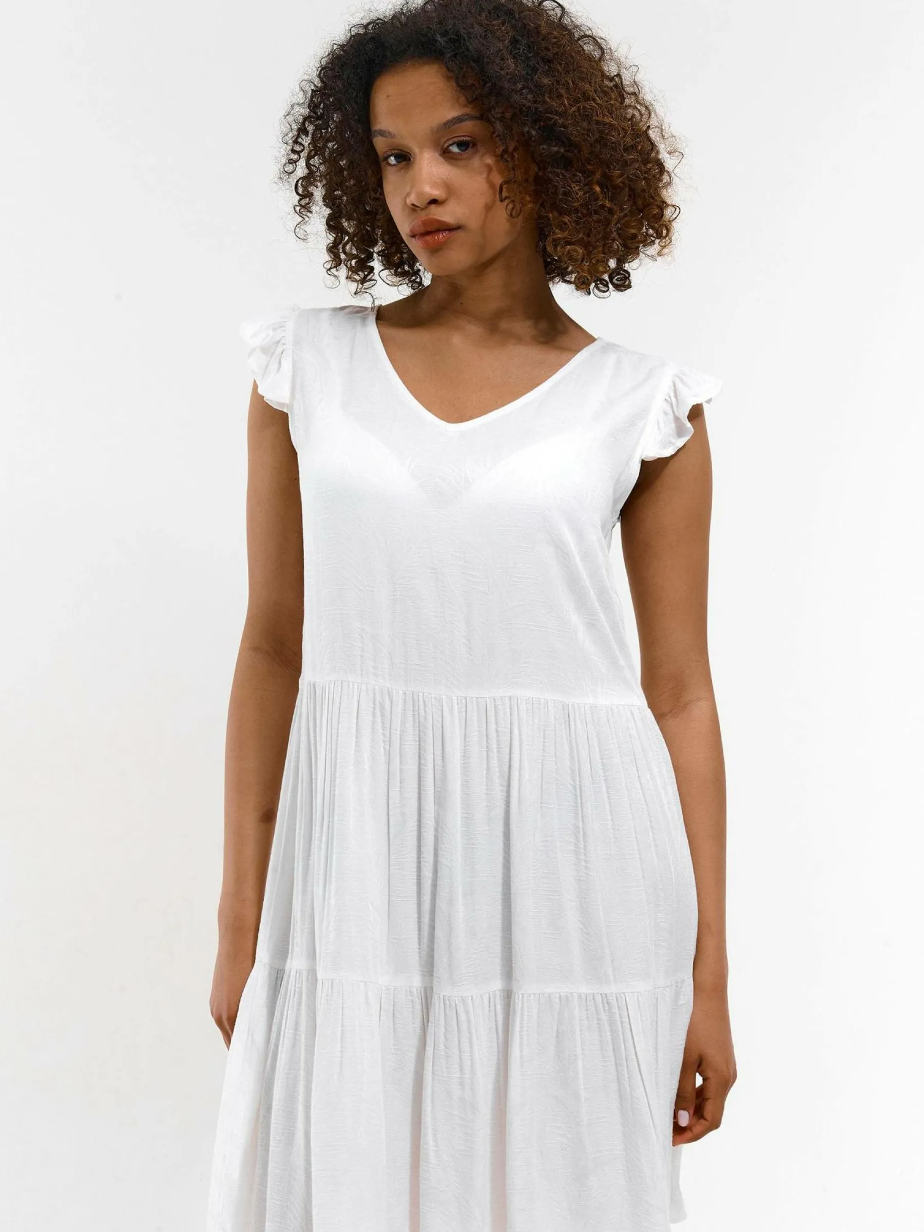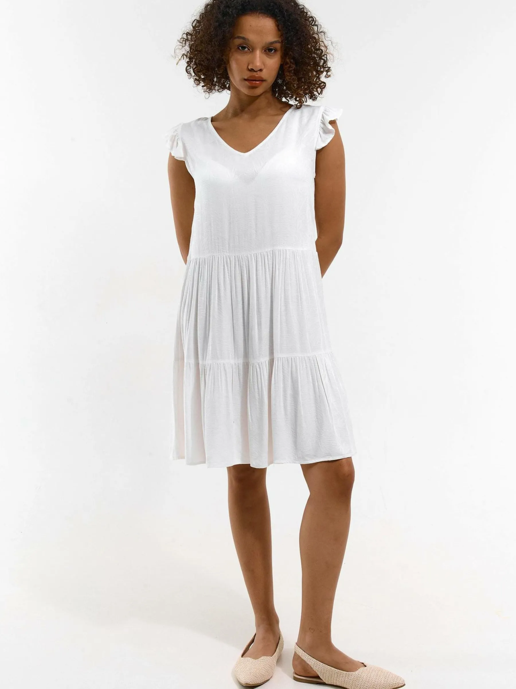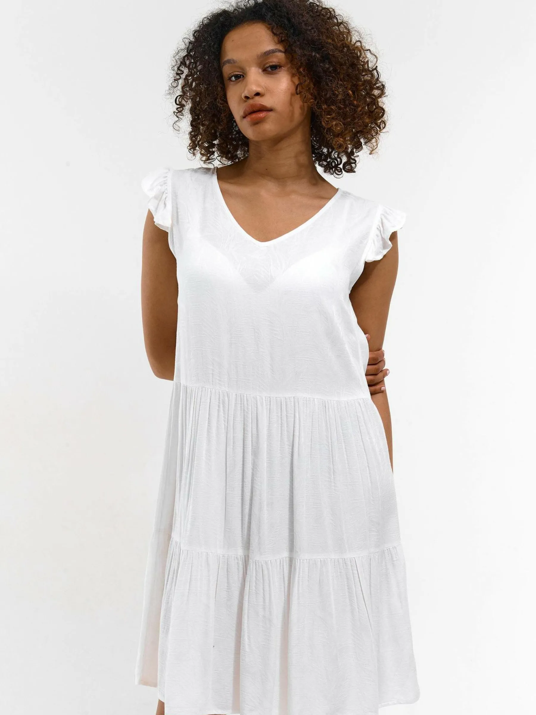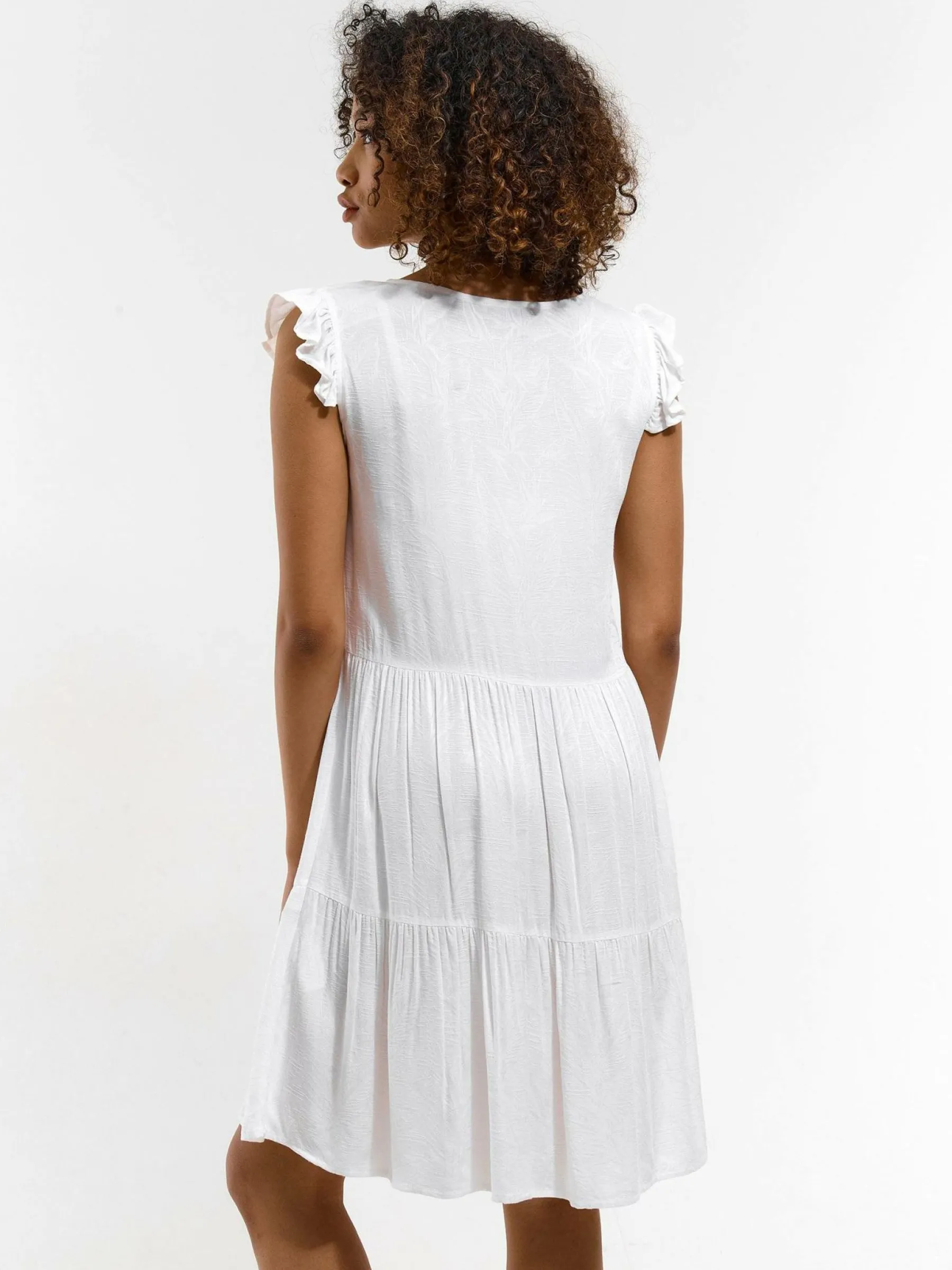Kolor: białyKrój: z falbanąTyp: sukienkaRekaw: krótki rękawDługość: miniPattern style: pojedynczy kolorDetal: na…