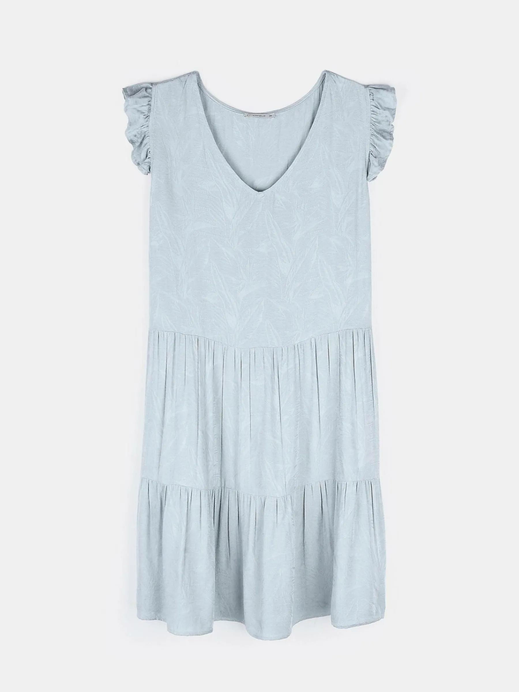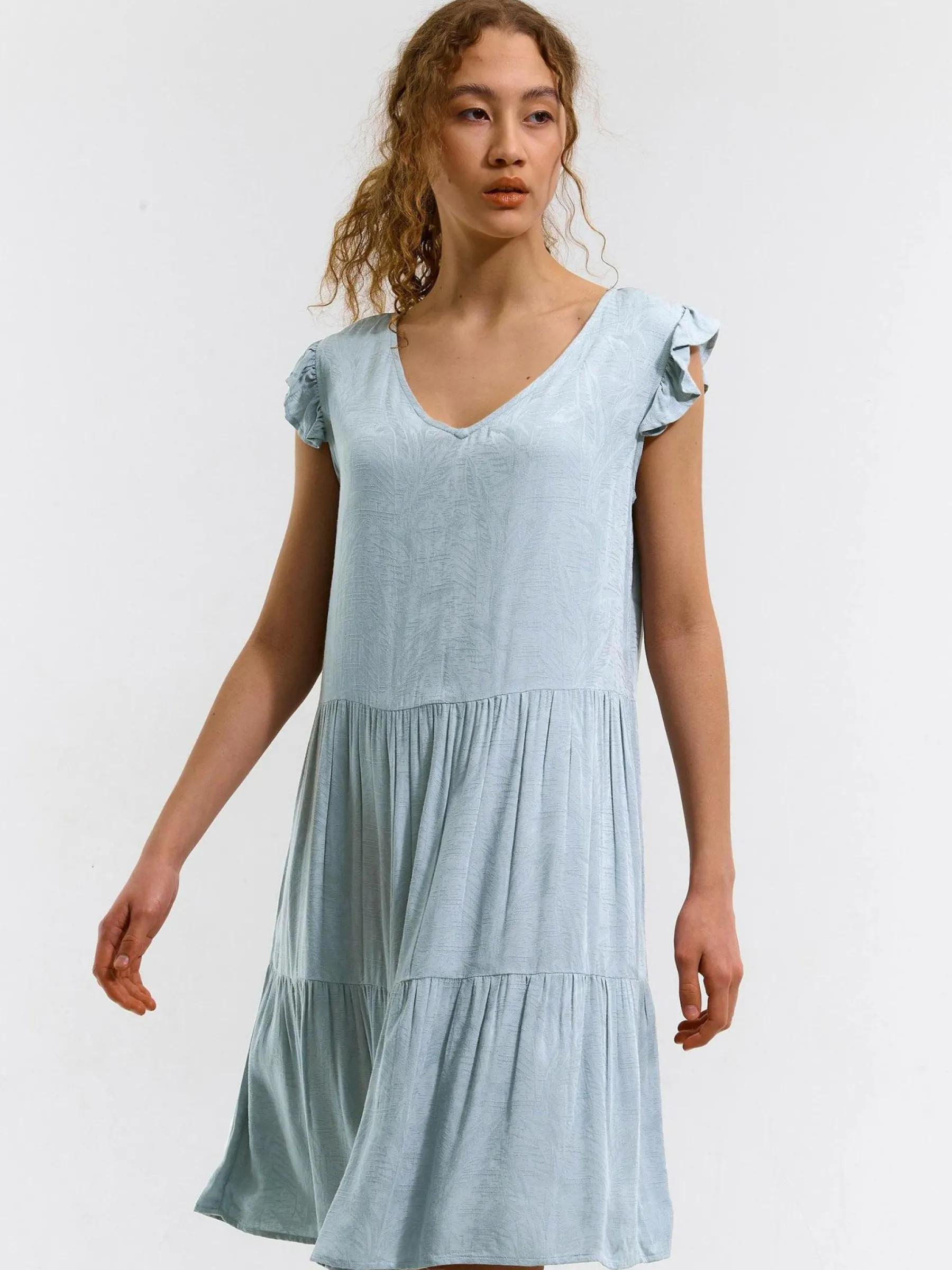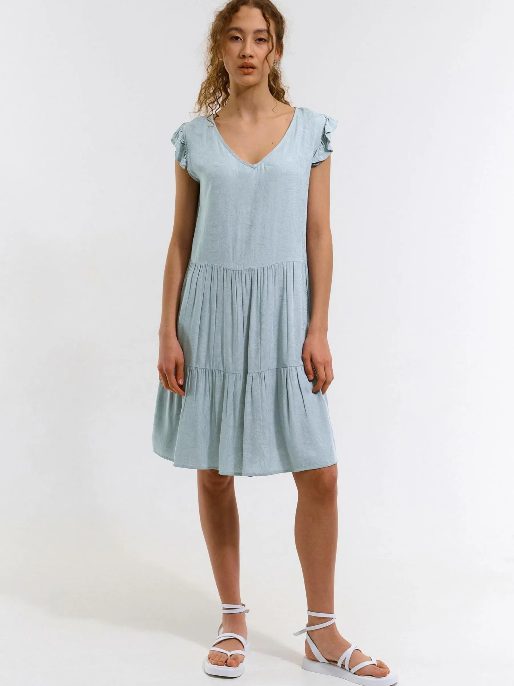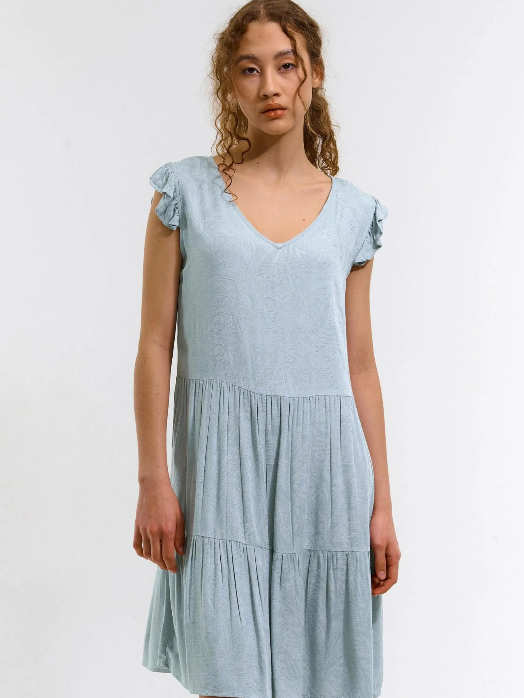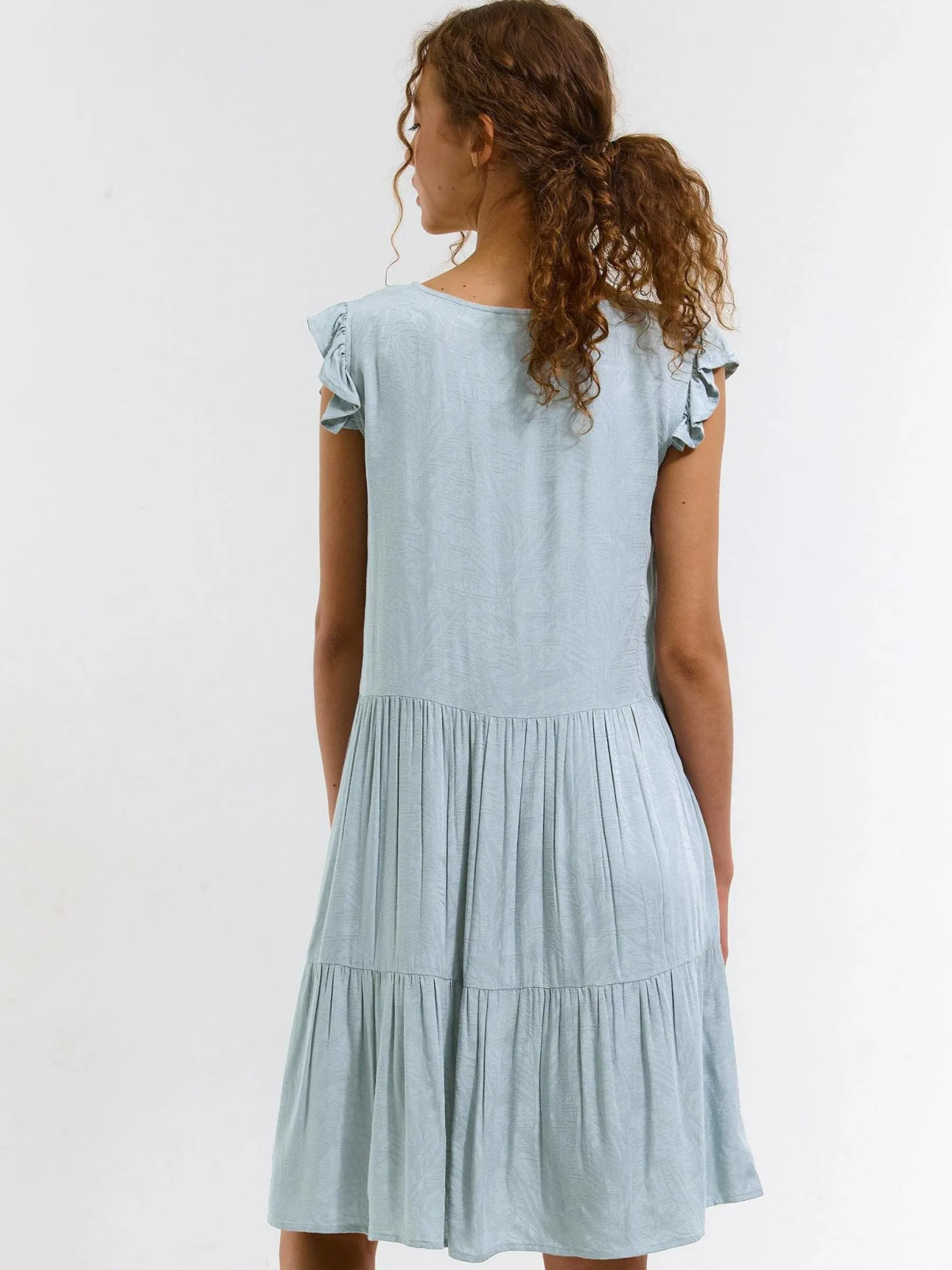 Kolor: niebieskiKrój: z falbanąTyp: sukienkaRekaw: krótki rękawDługość: miniPattern style: pojedynczy kolorDetal:…