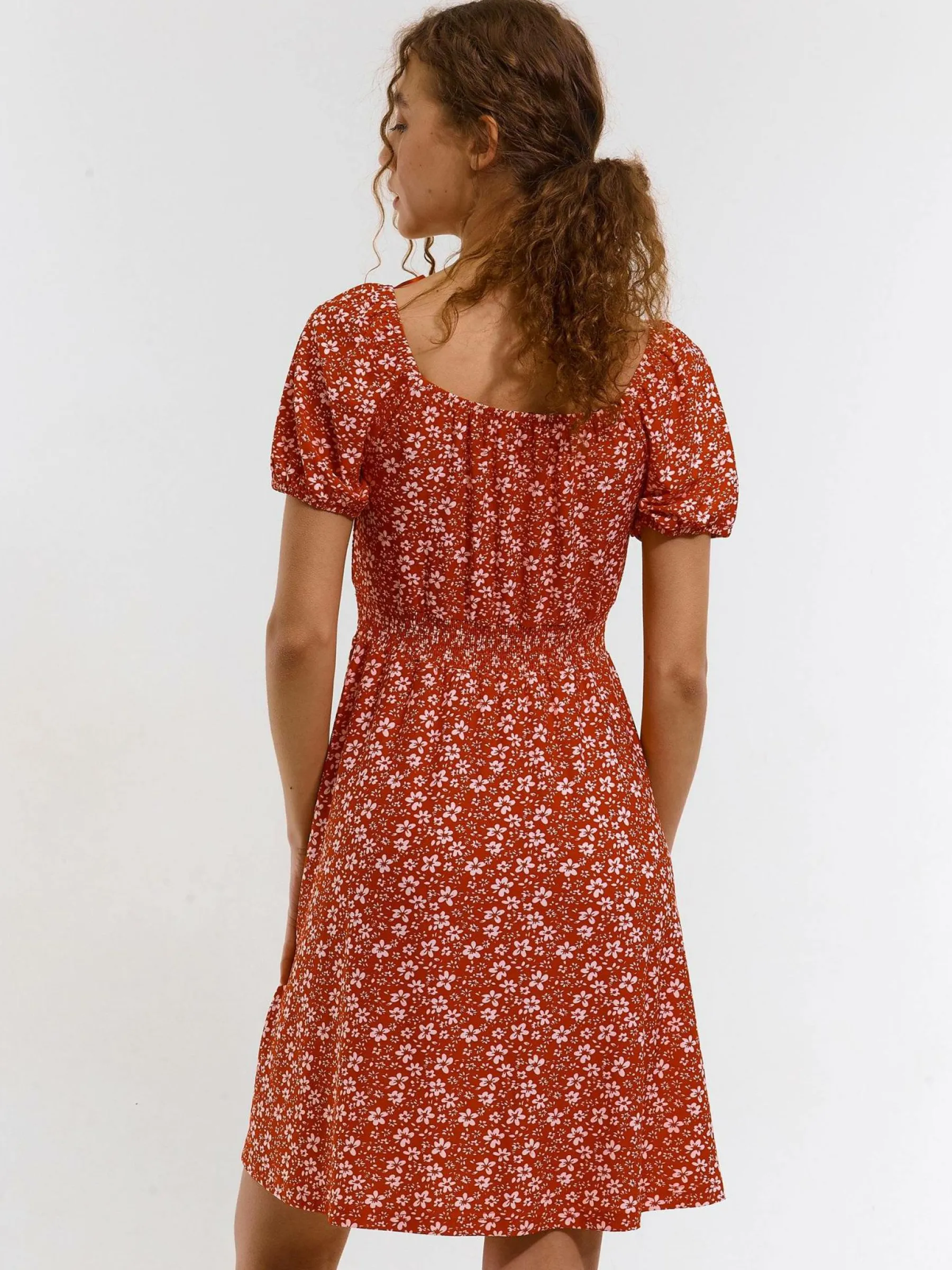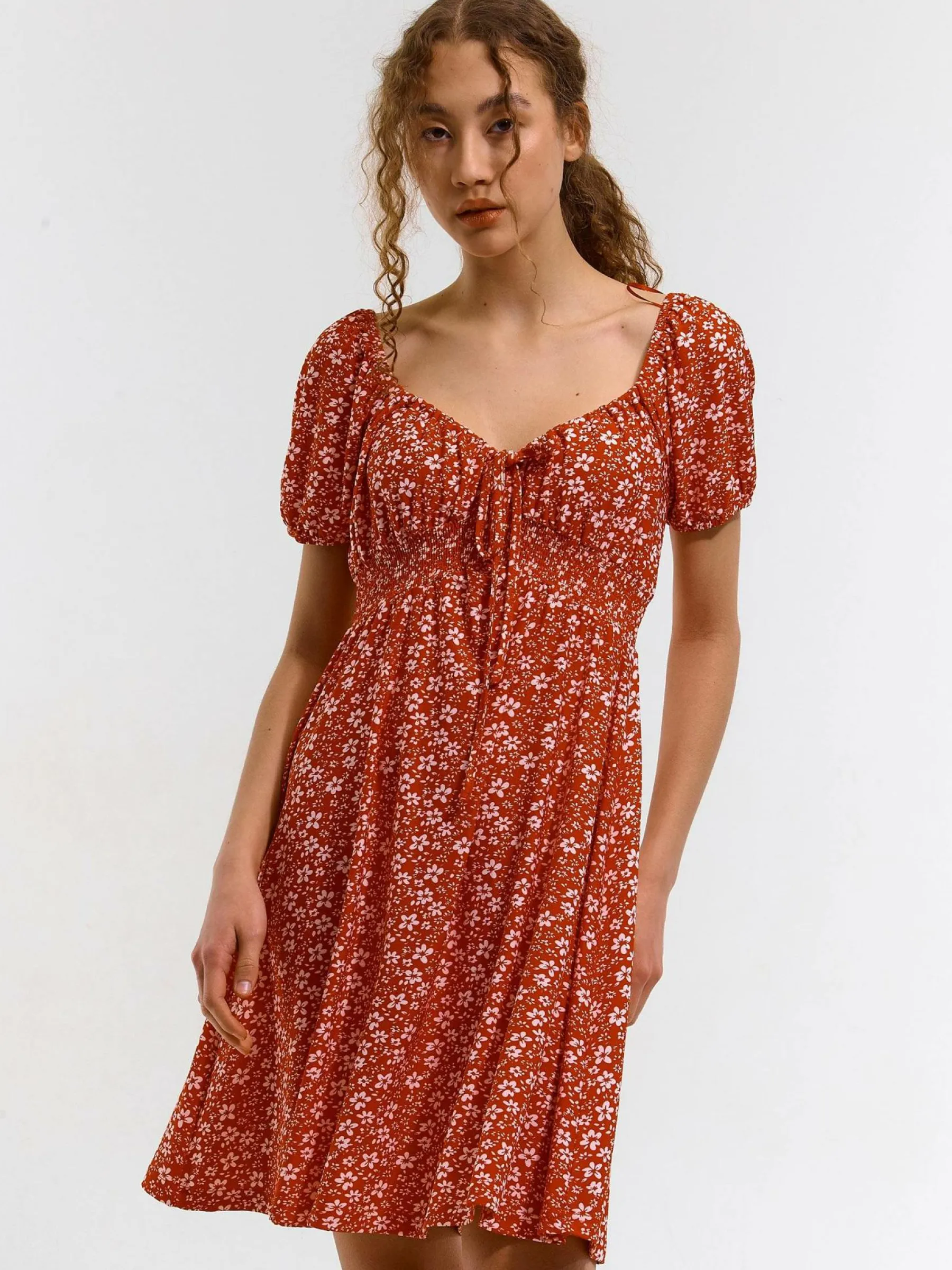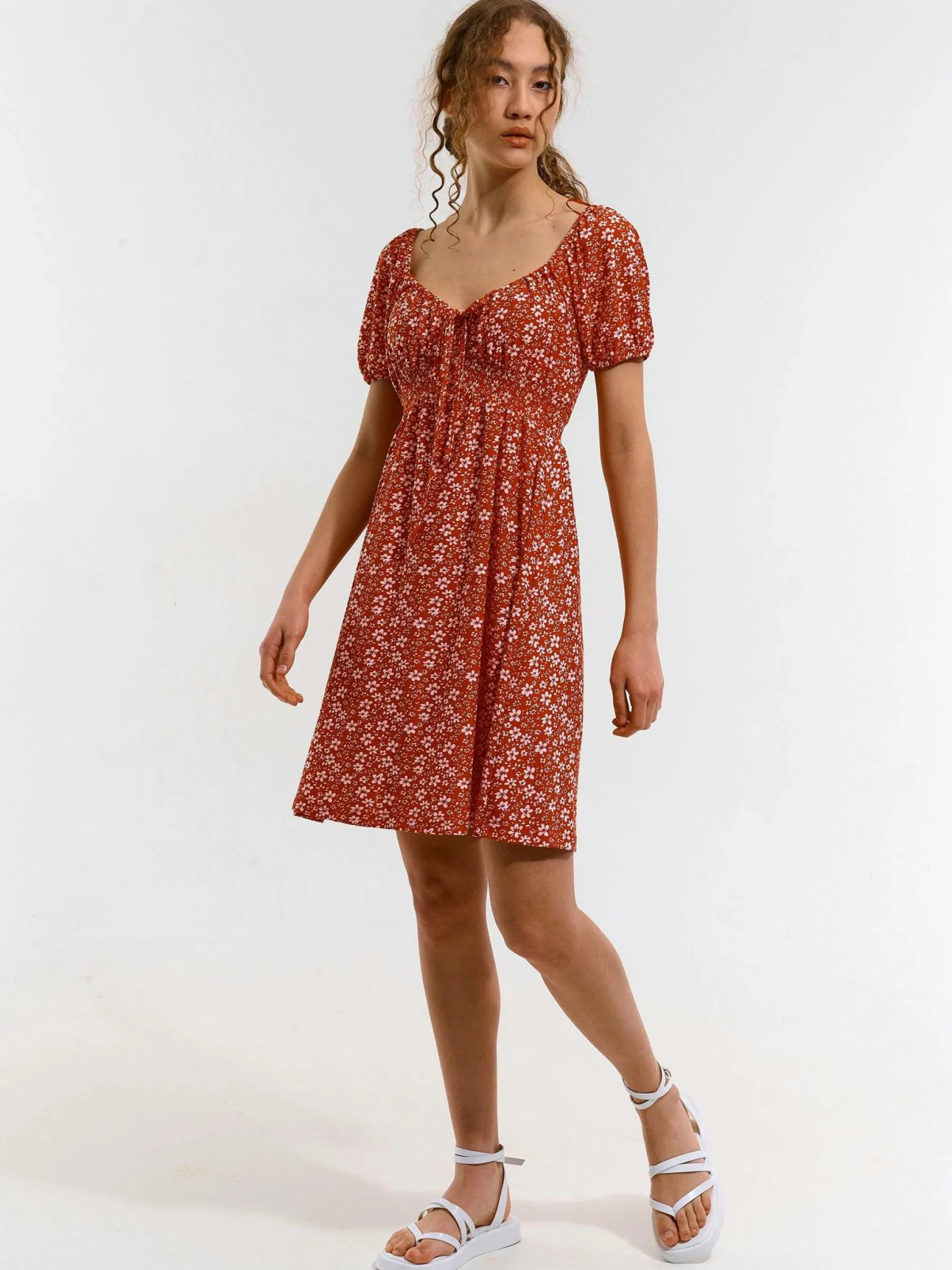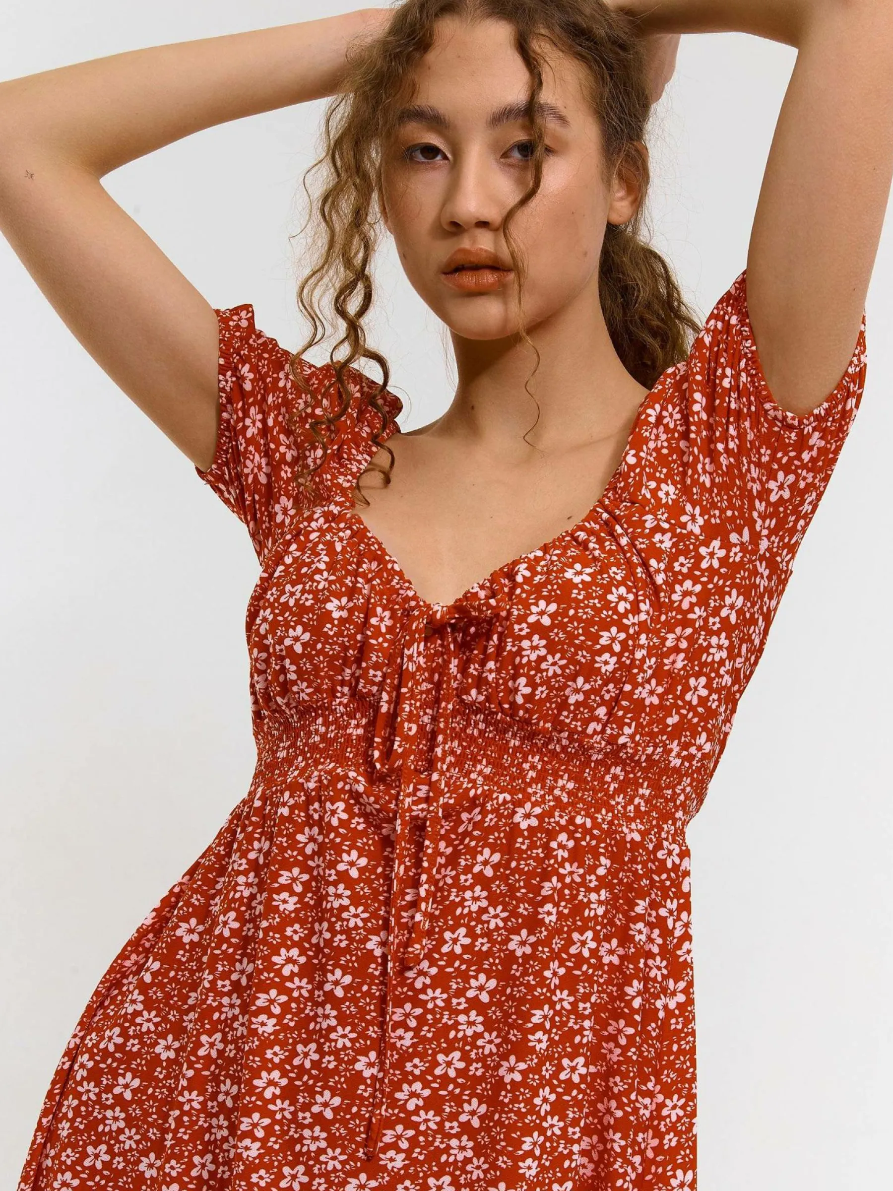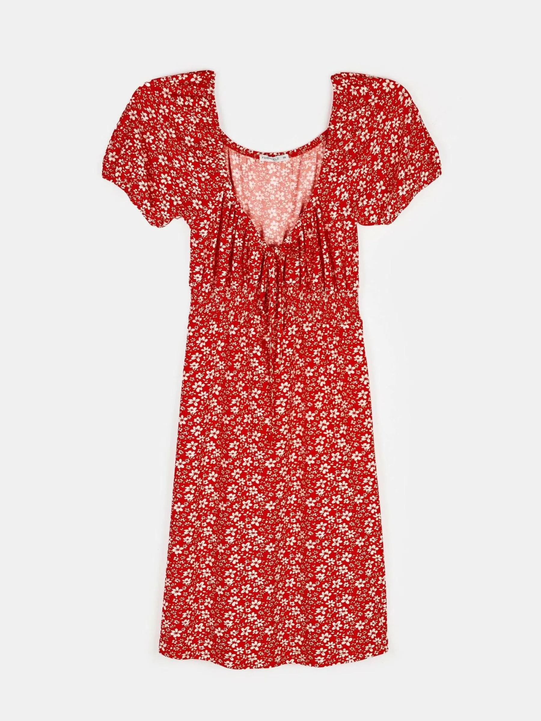 Kolor: czerwonyKrój: asyTyp: sukienkaRekaw: krótki rękawDługość: miniPattern style: kwiatoweDetal: z falbankami, n…