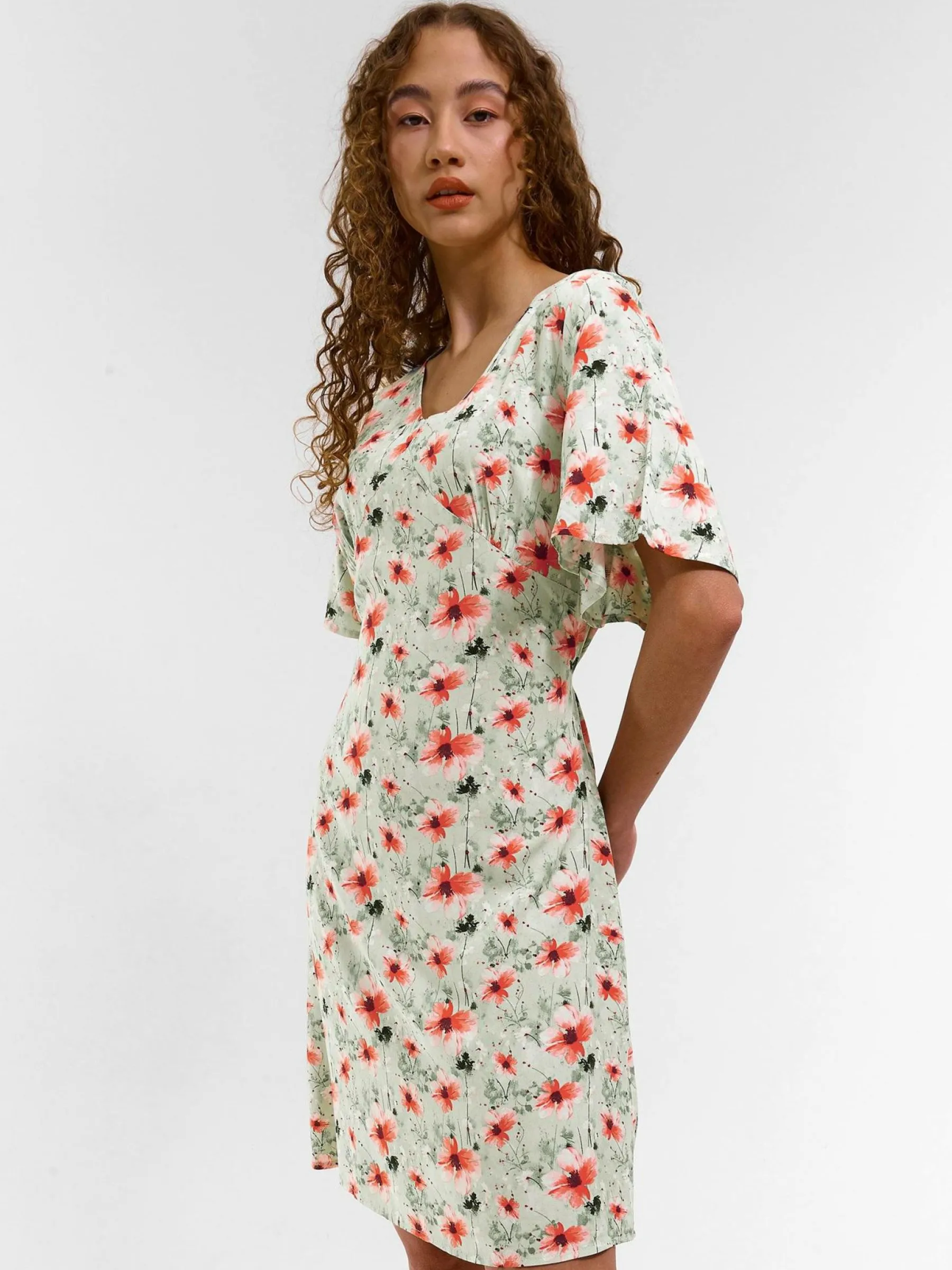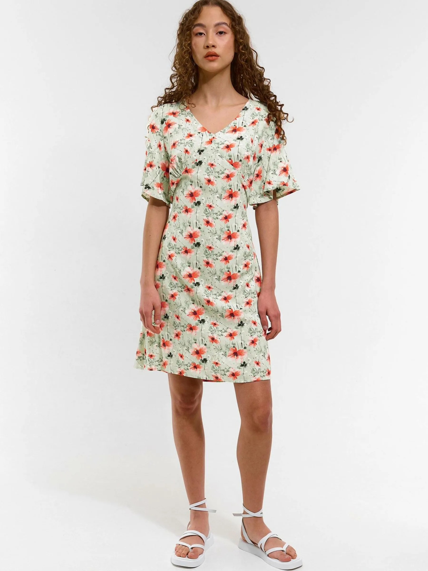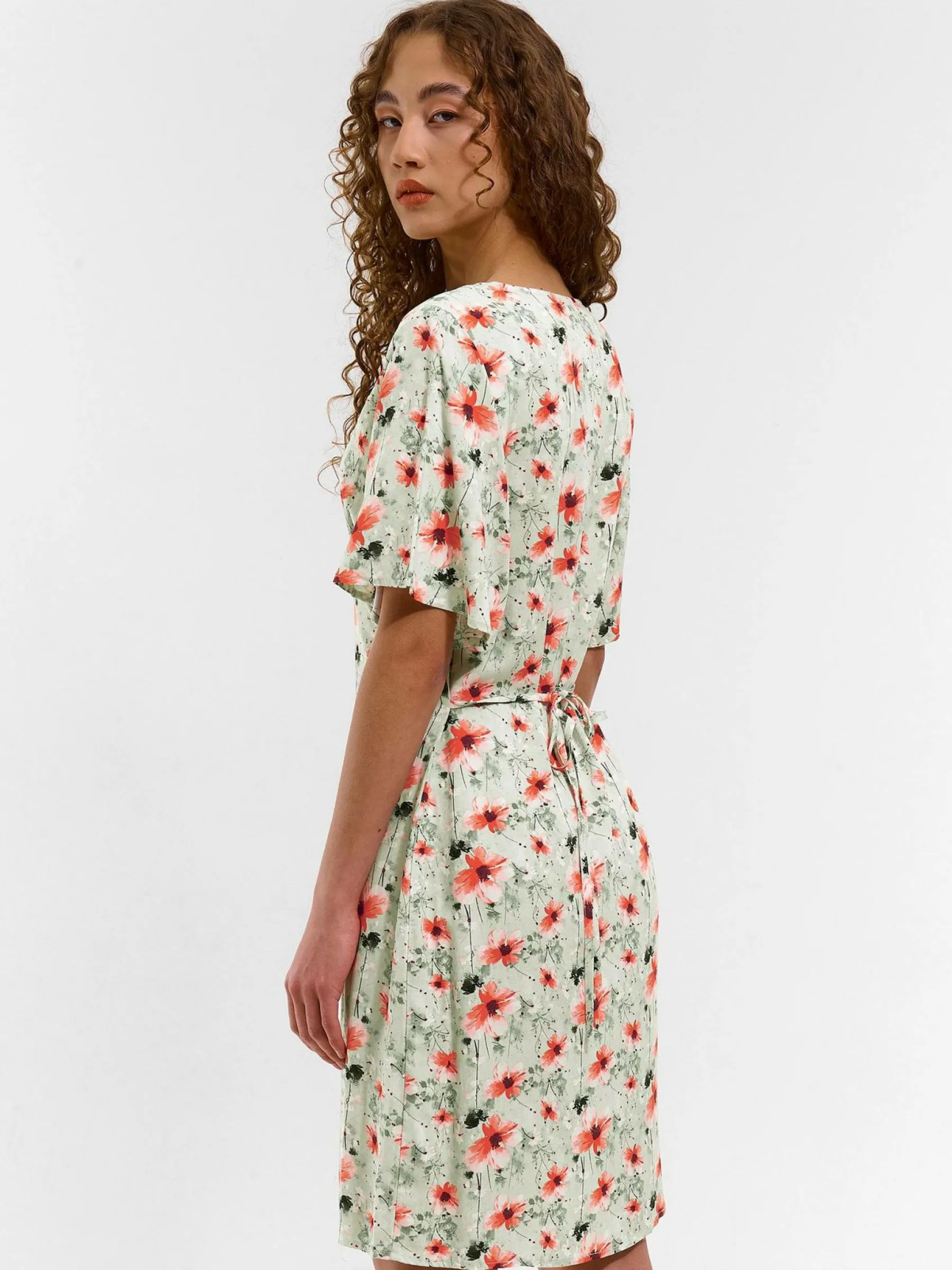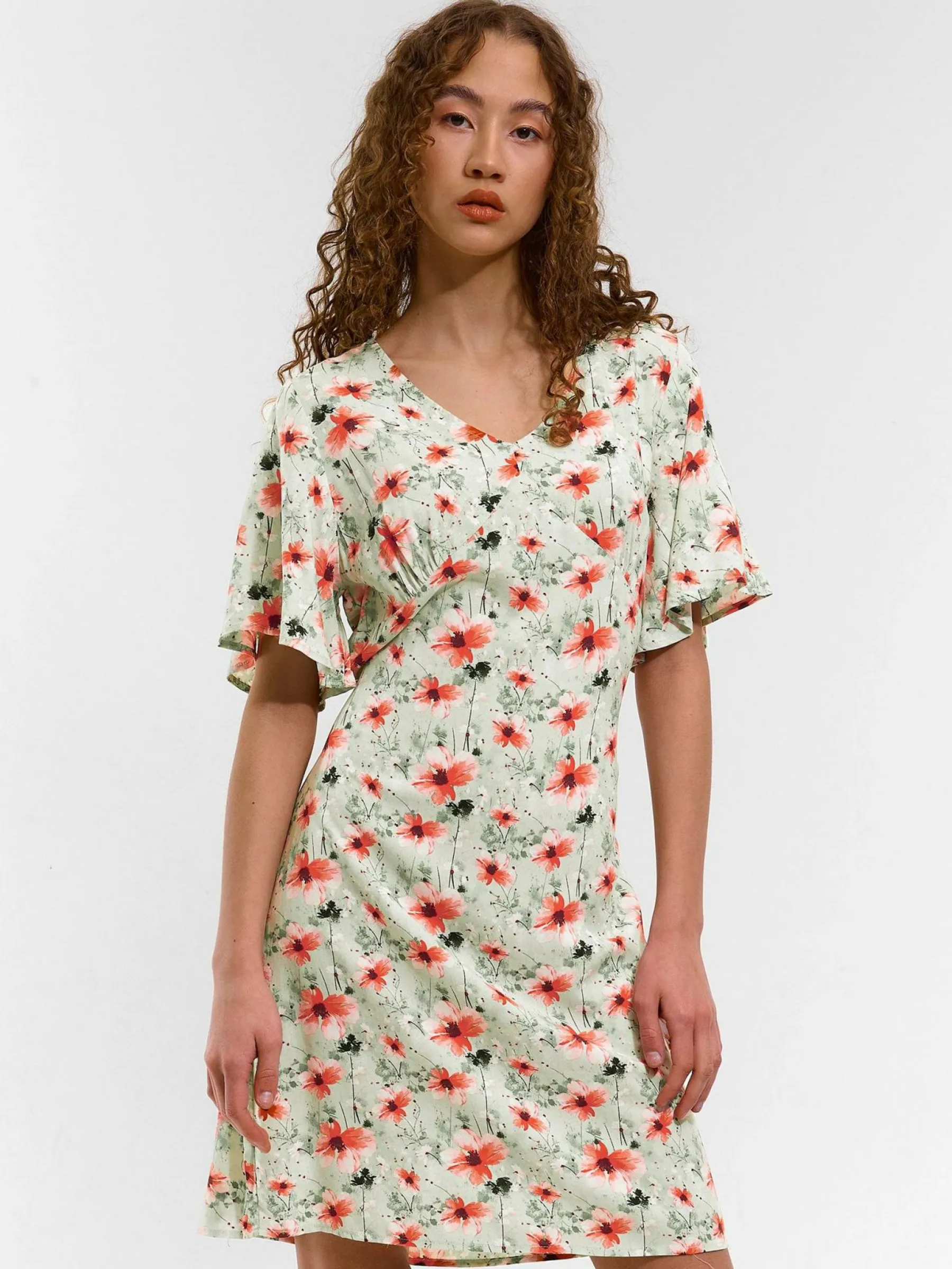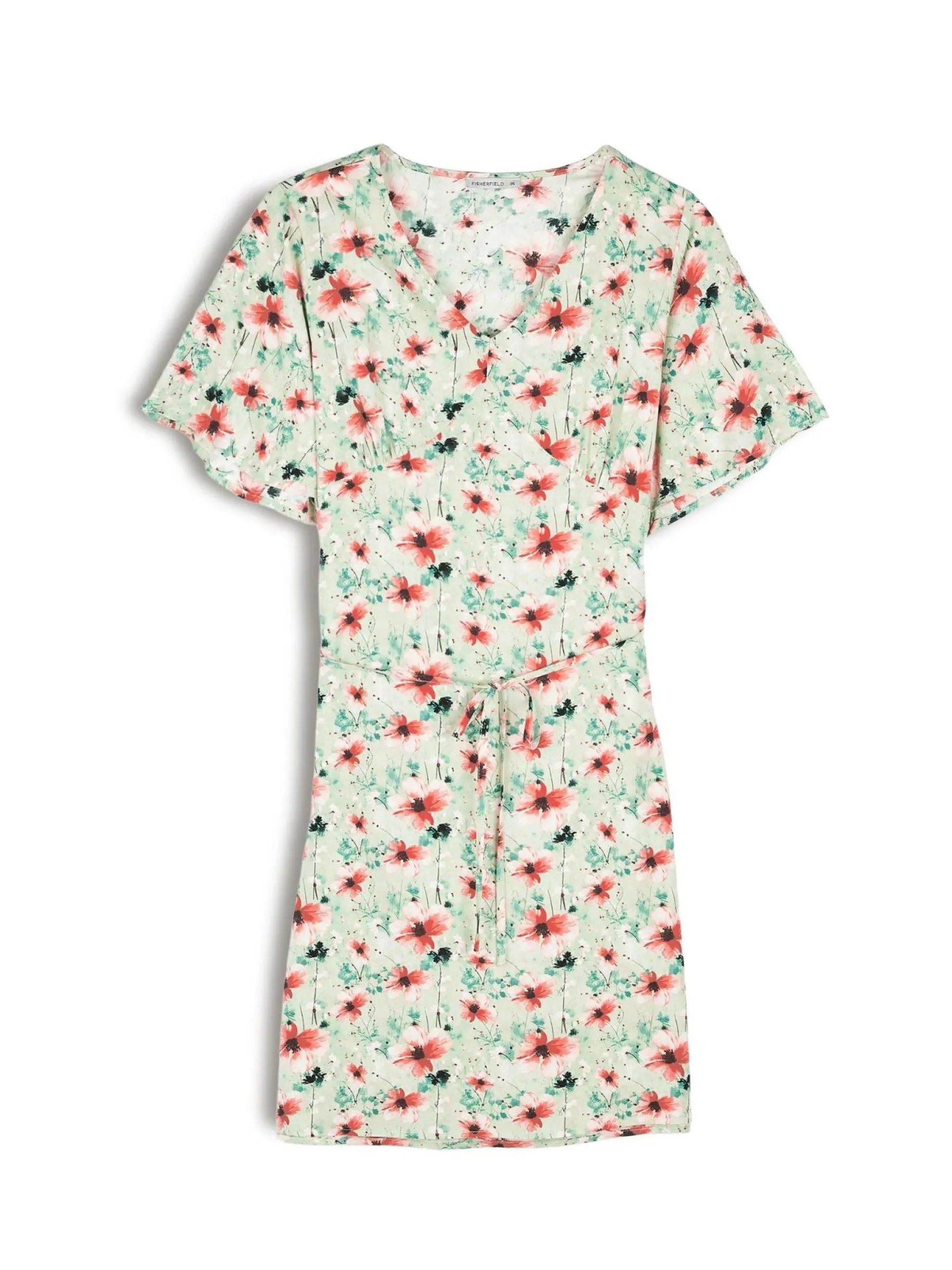 Kolor: zielonyKrój: regularTyp: sukienkaRekaw: krótki rękawDługość: miniPattern style: kwiatoweDetal: v-neck, z pa…