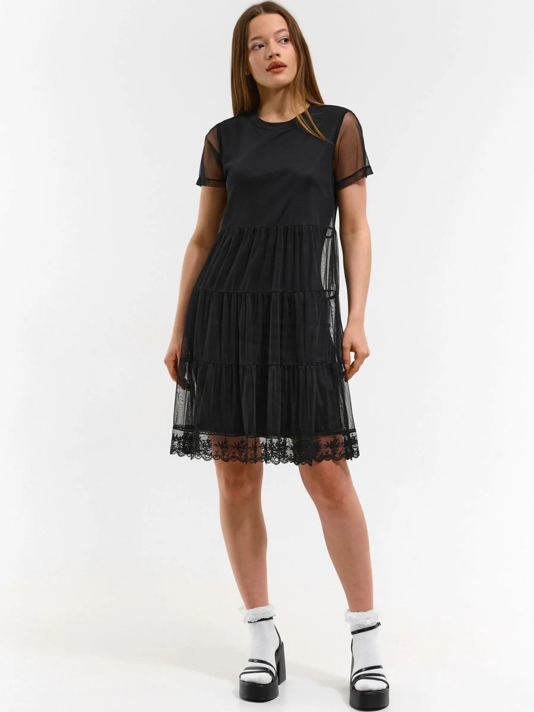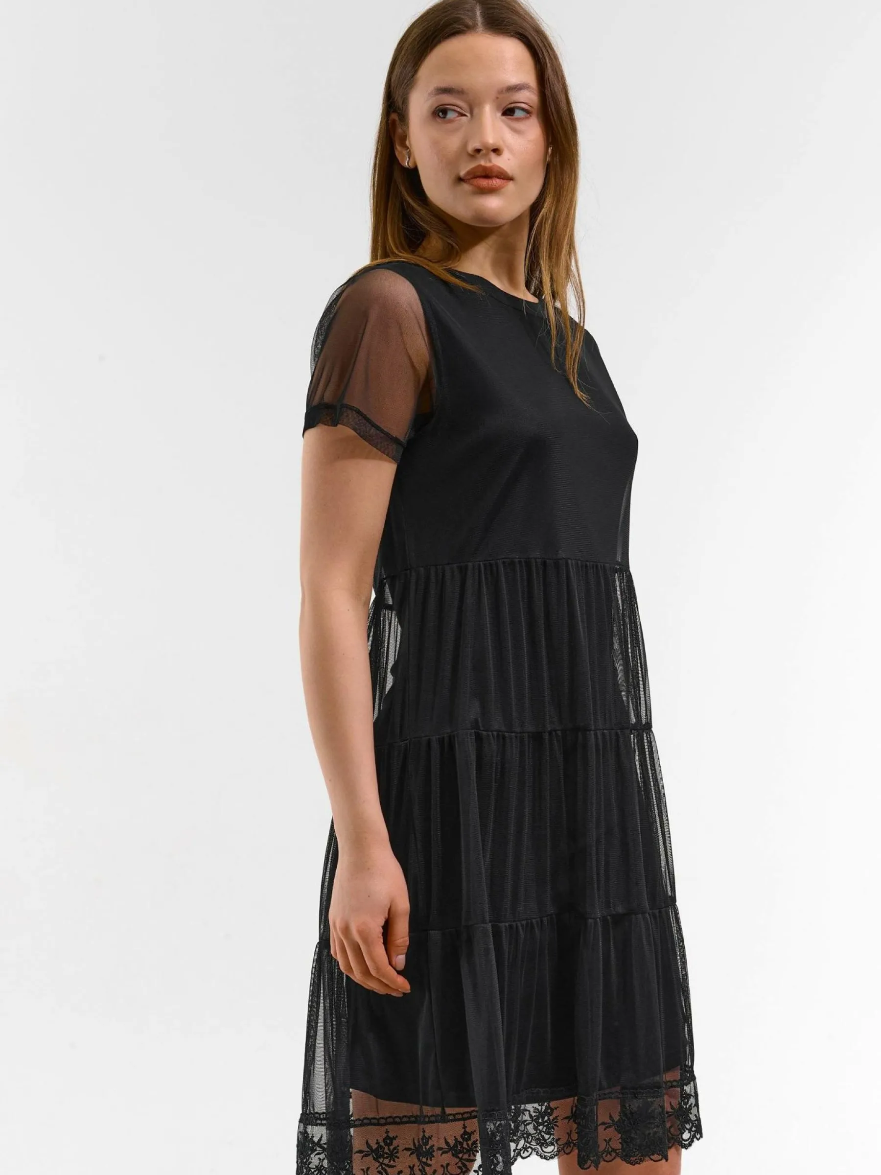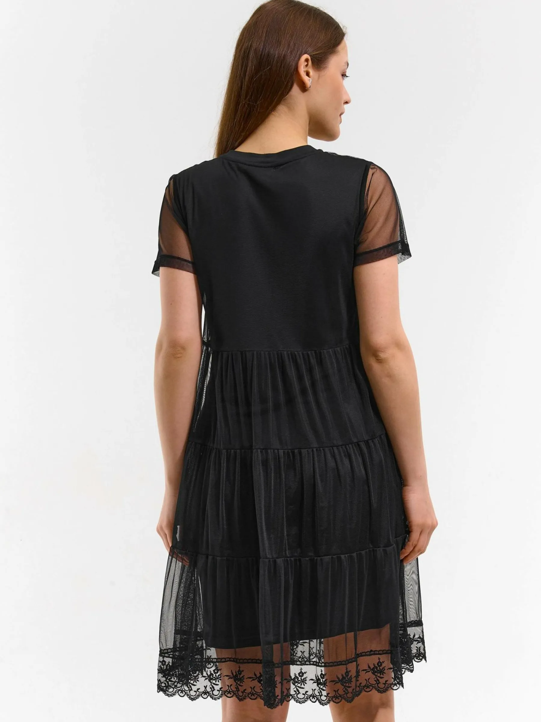 Kolor: czarnyKrój: z falbanąTyp: sukienkaRekaw: krótki rękawDługość: miniPattern style: pojedynczy kolorDetal: na…