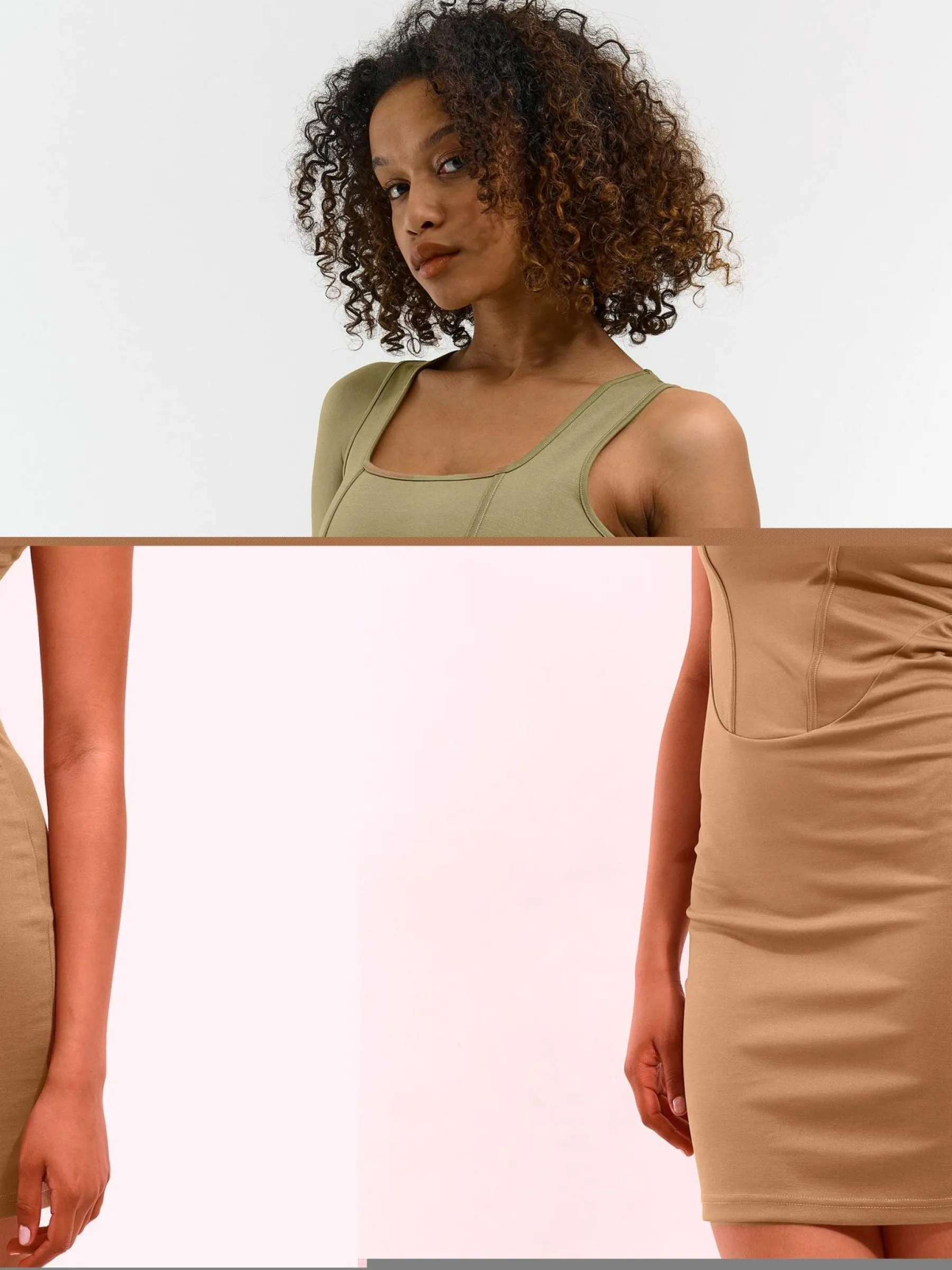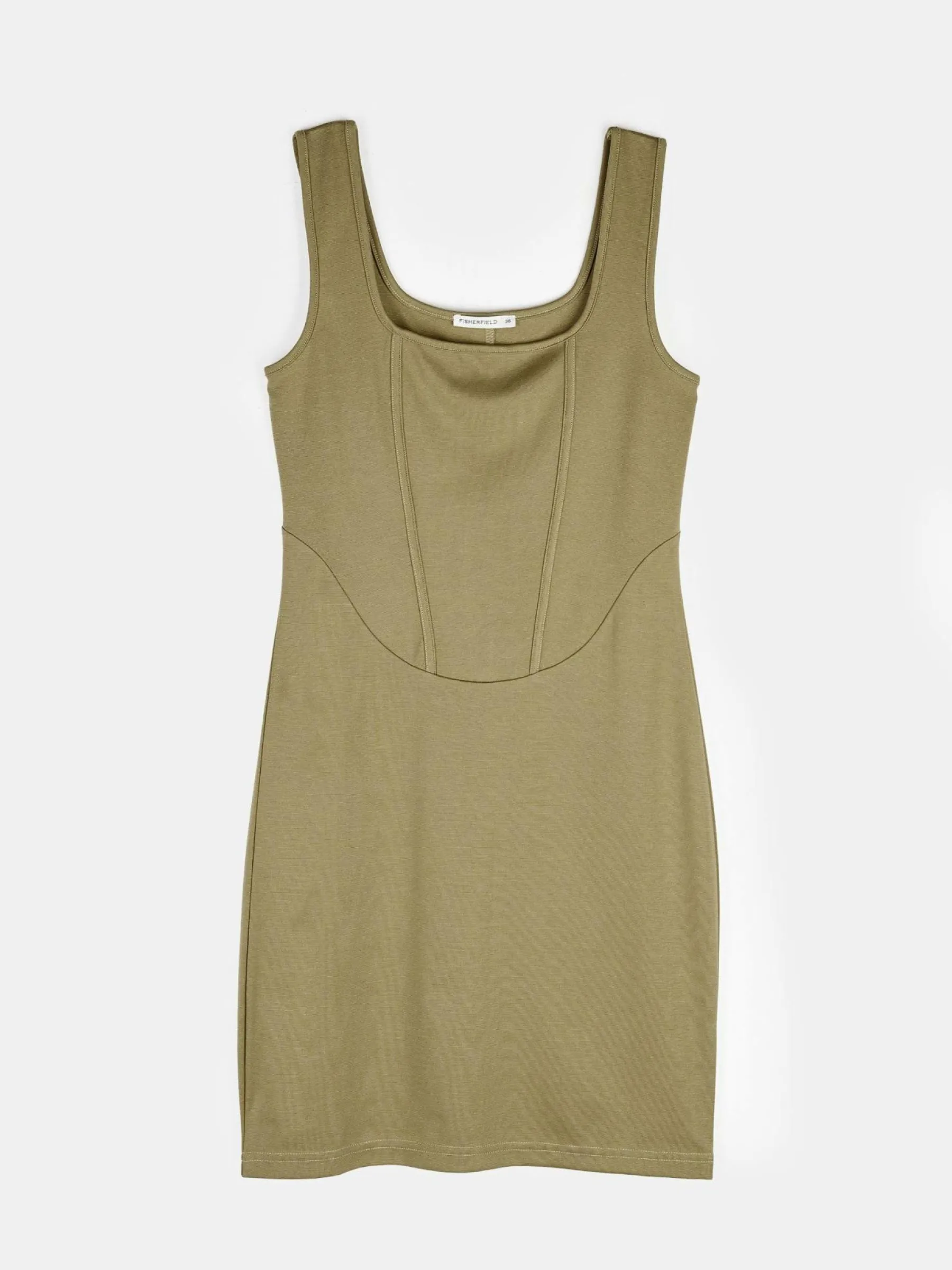 Kolor: beżowyKrój: ołówkoweTyp: sukienkaRekaw: bez rękawówDługość: miniPattern style: pojedynczy kolorMateriał…