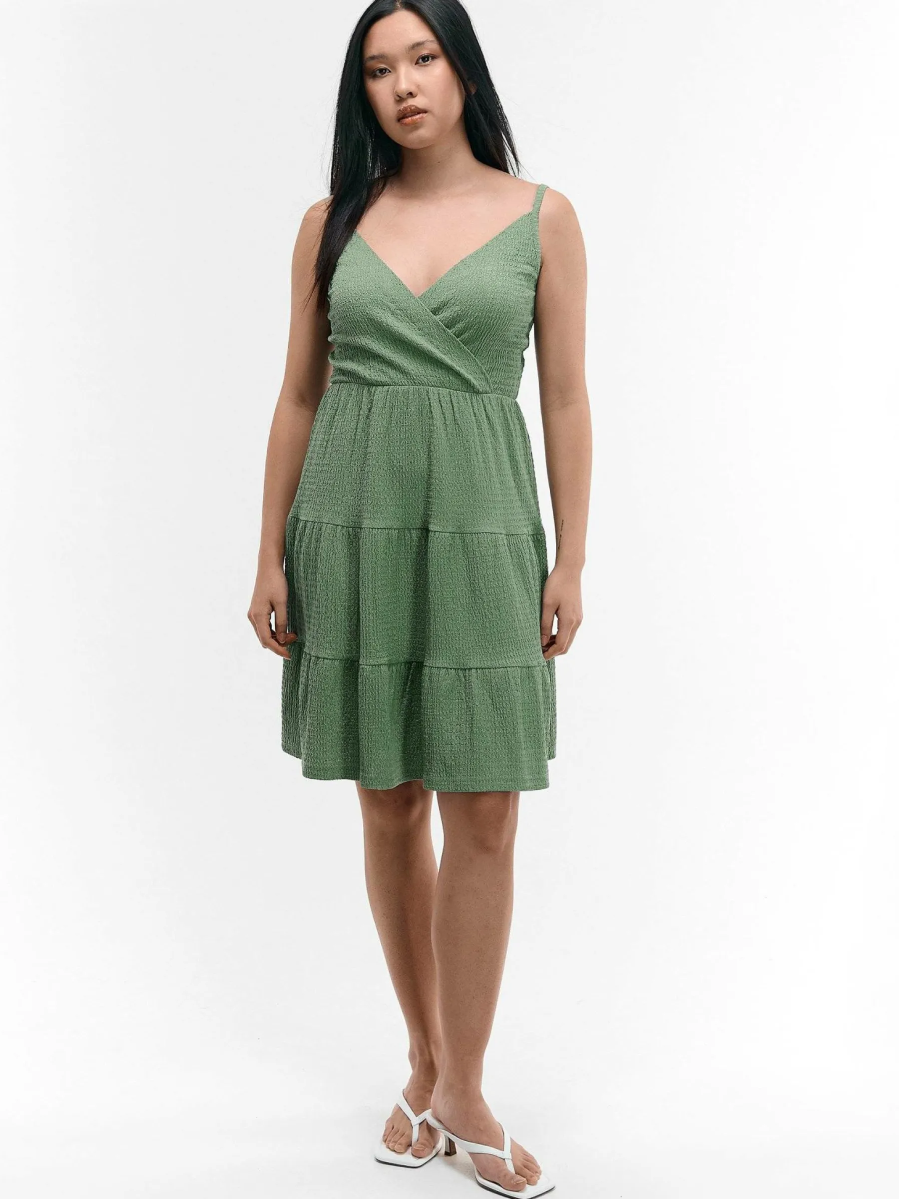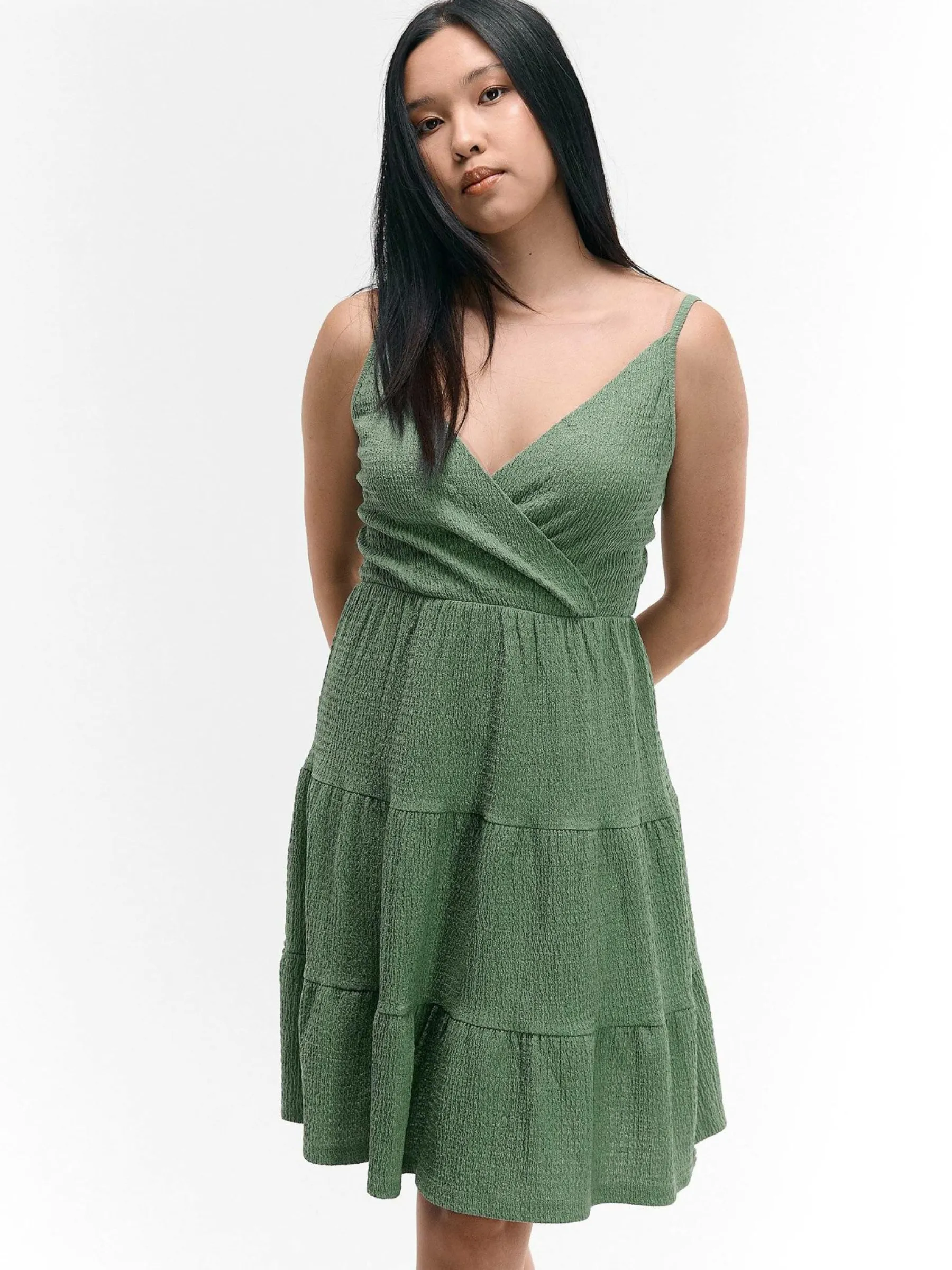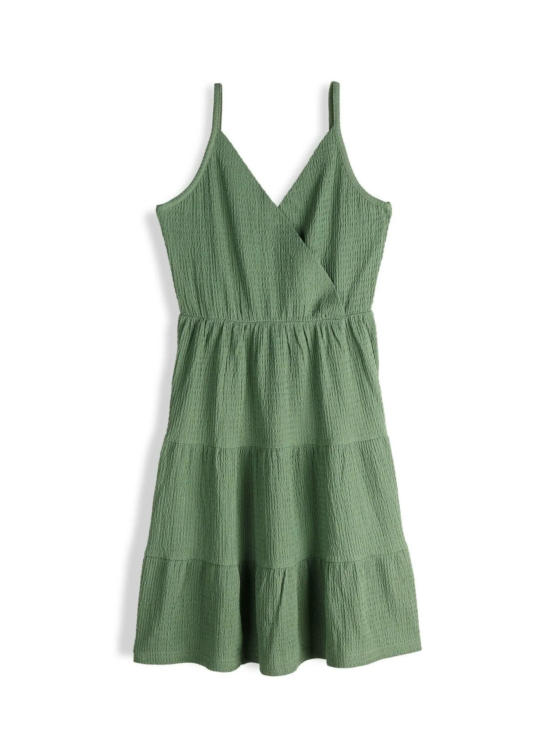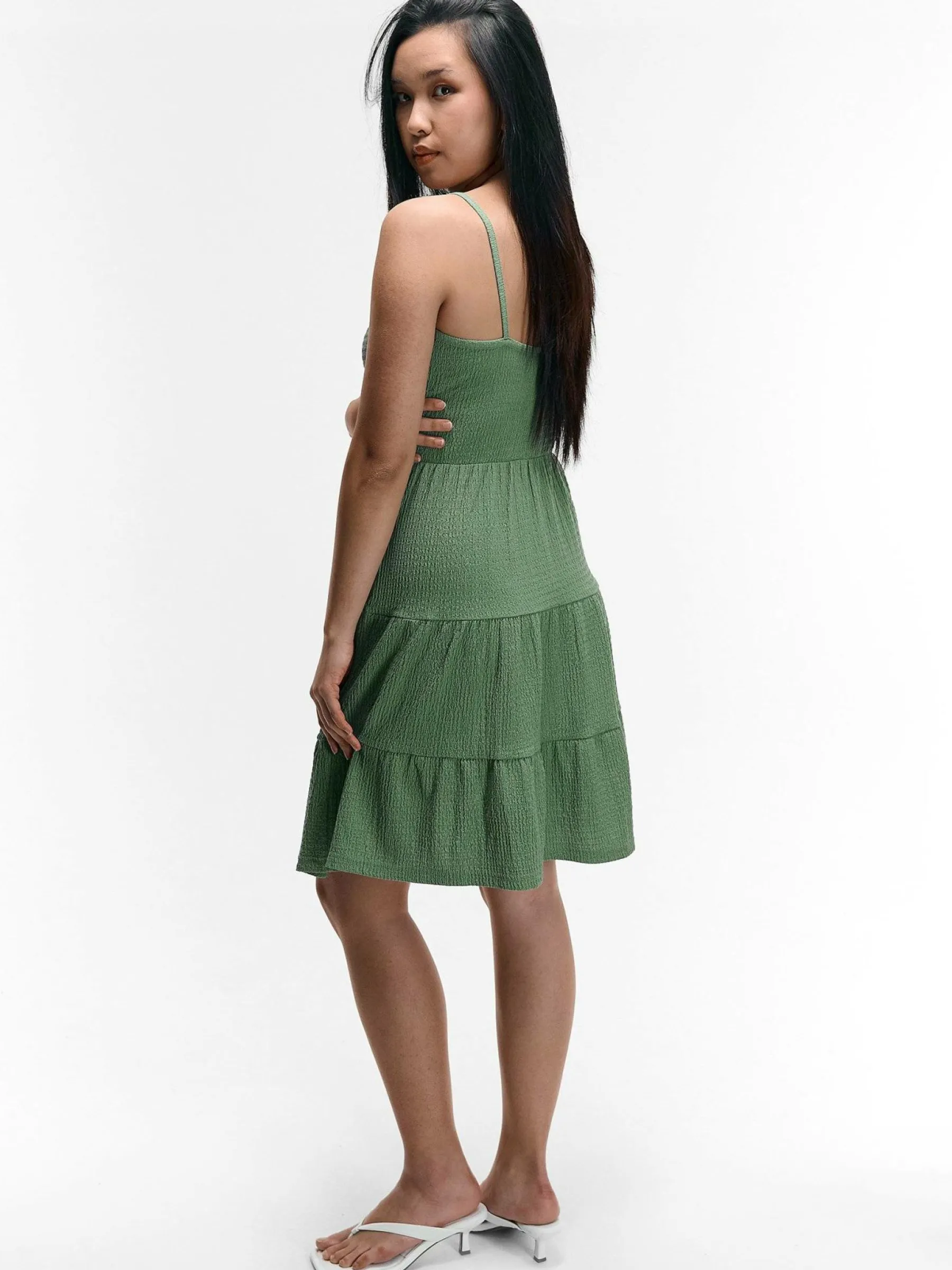 Kolor: zielonyKrój: z falbanąTyp: sukienkaRekaw: bez rękawówDługość: miniPattern style: pojedynczy kolor, struktu…