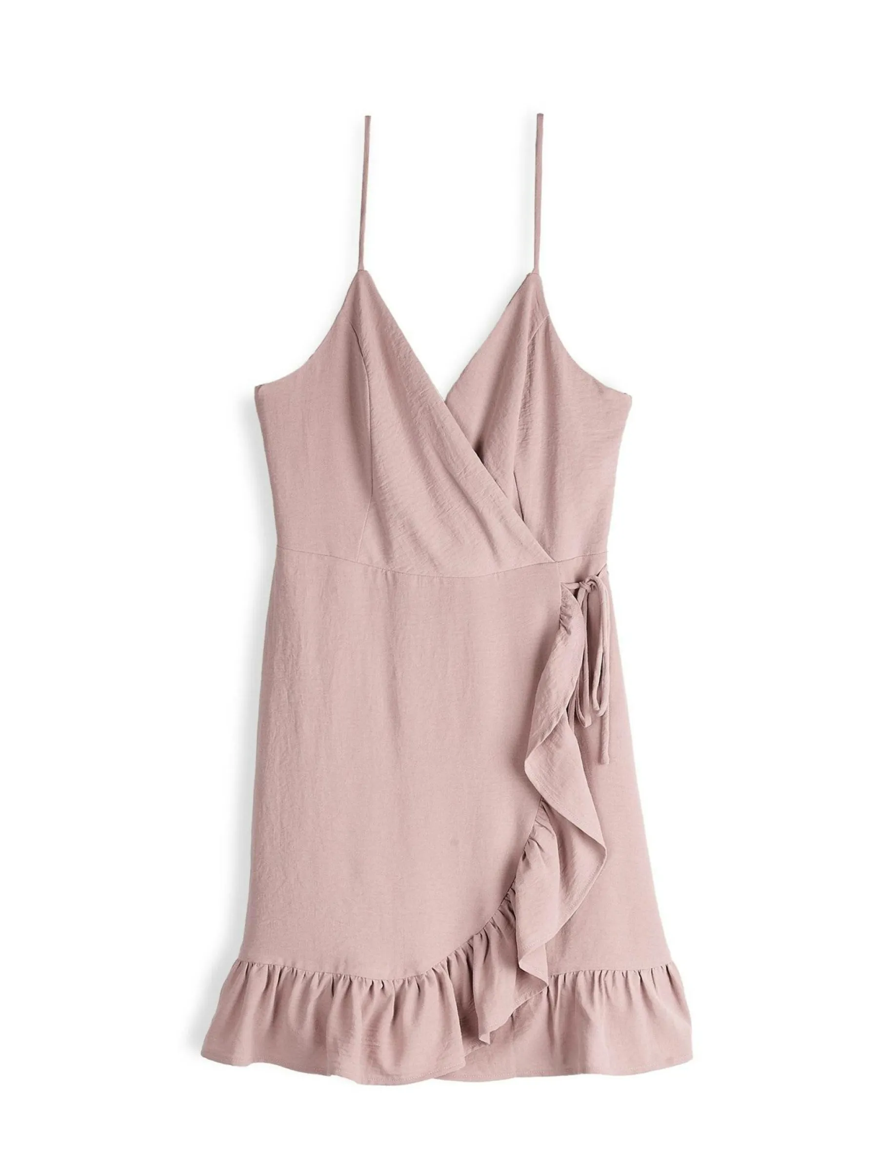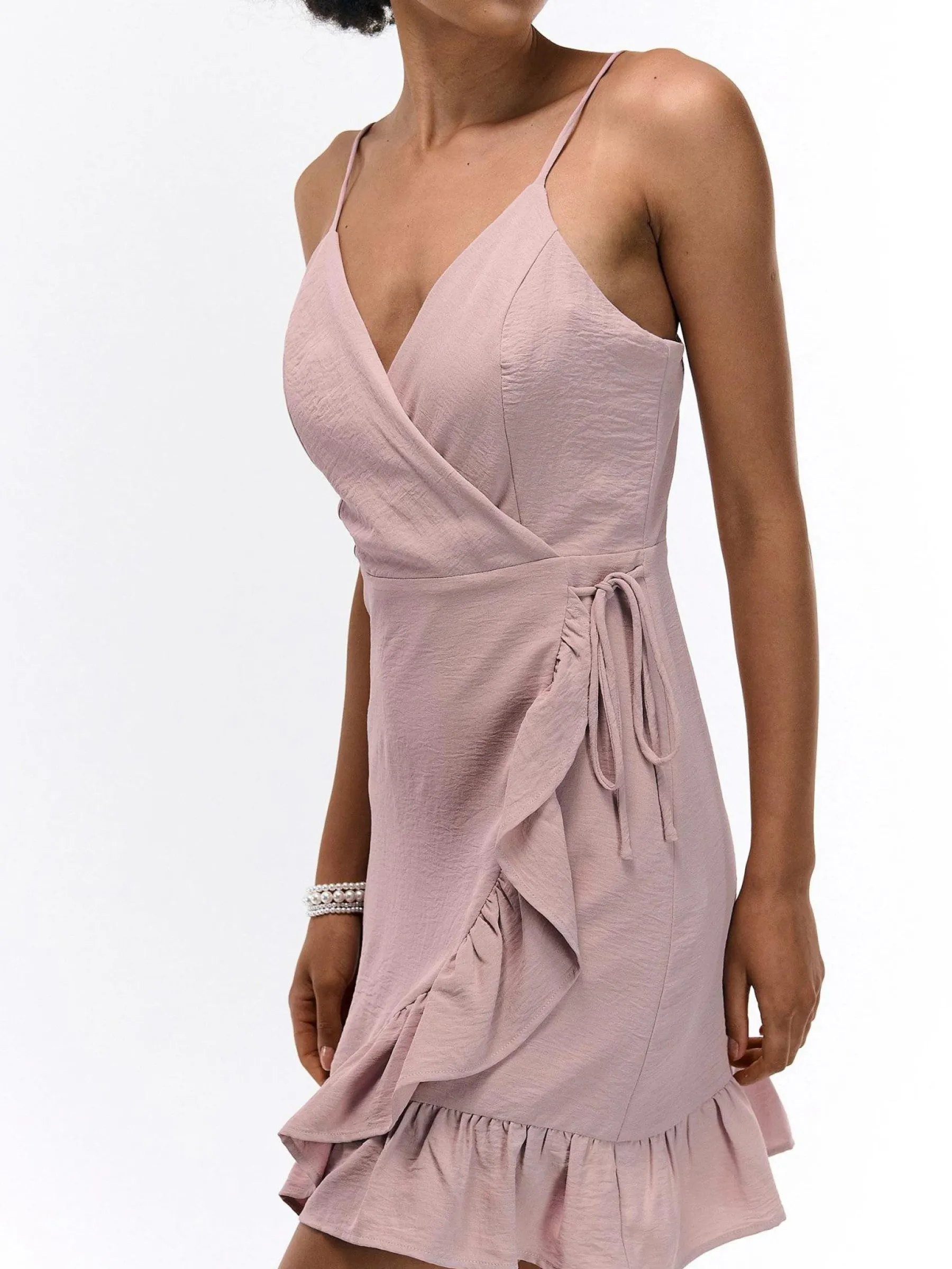 Kolor: różowyKrój: z falbanąTyp: sukienkaRekaw: bez rękawówDługość: miniPattern style: pojedynczy kolorDetal: n…