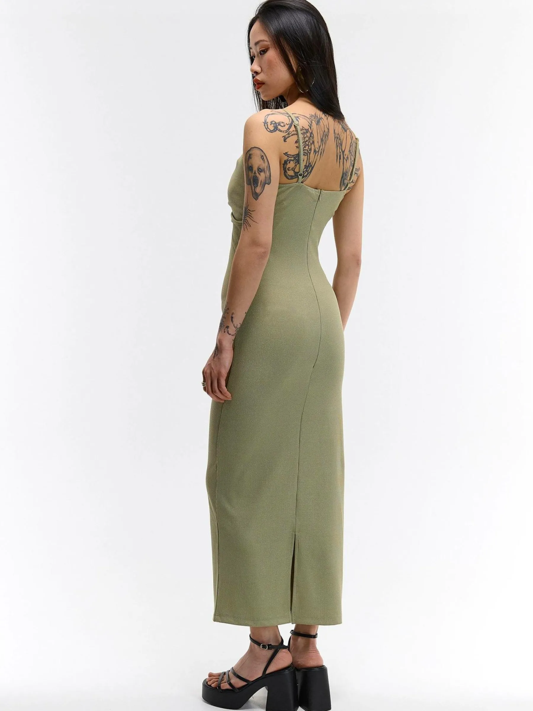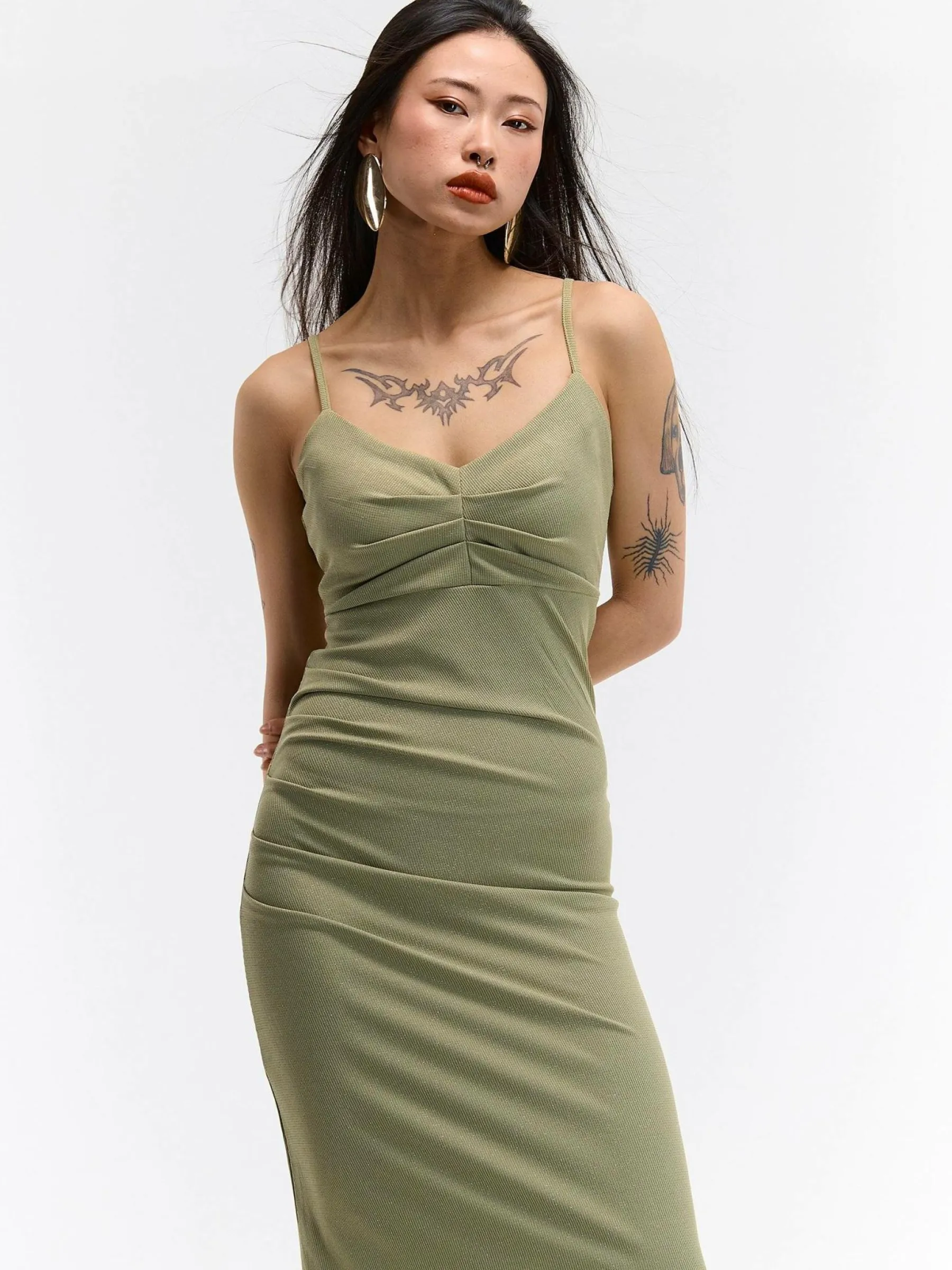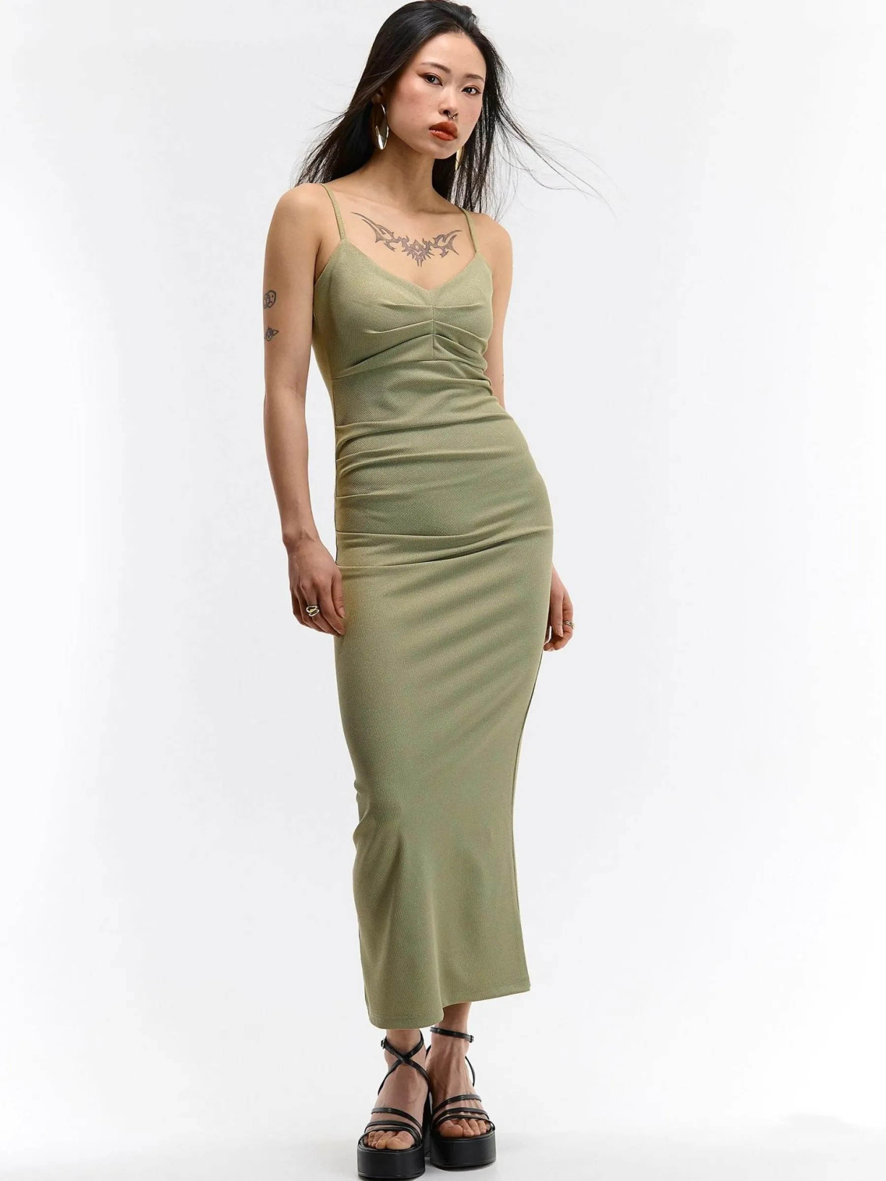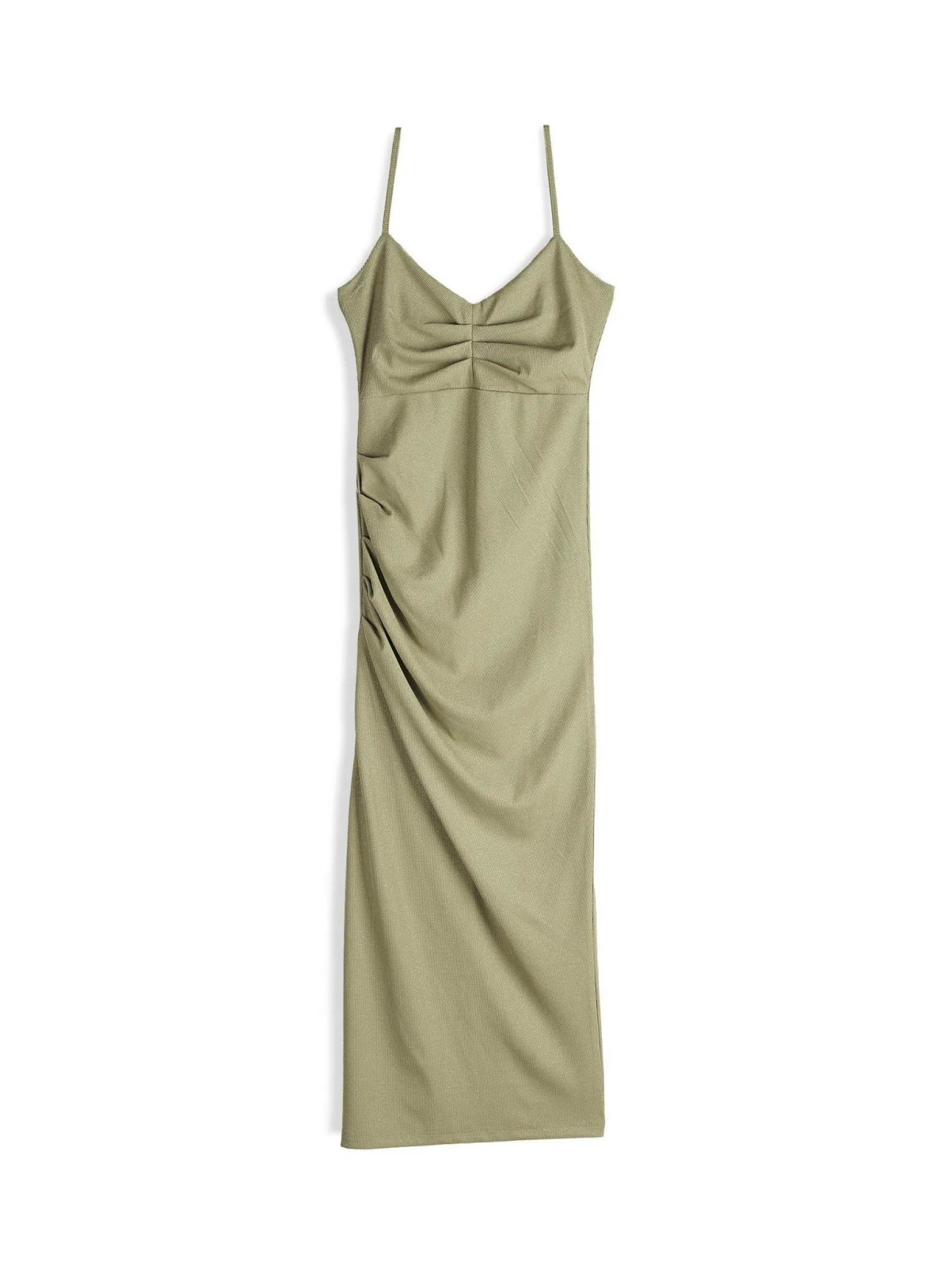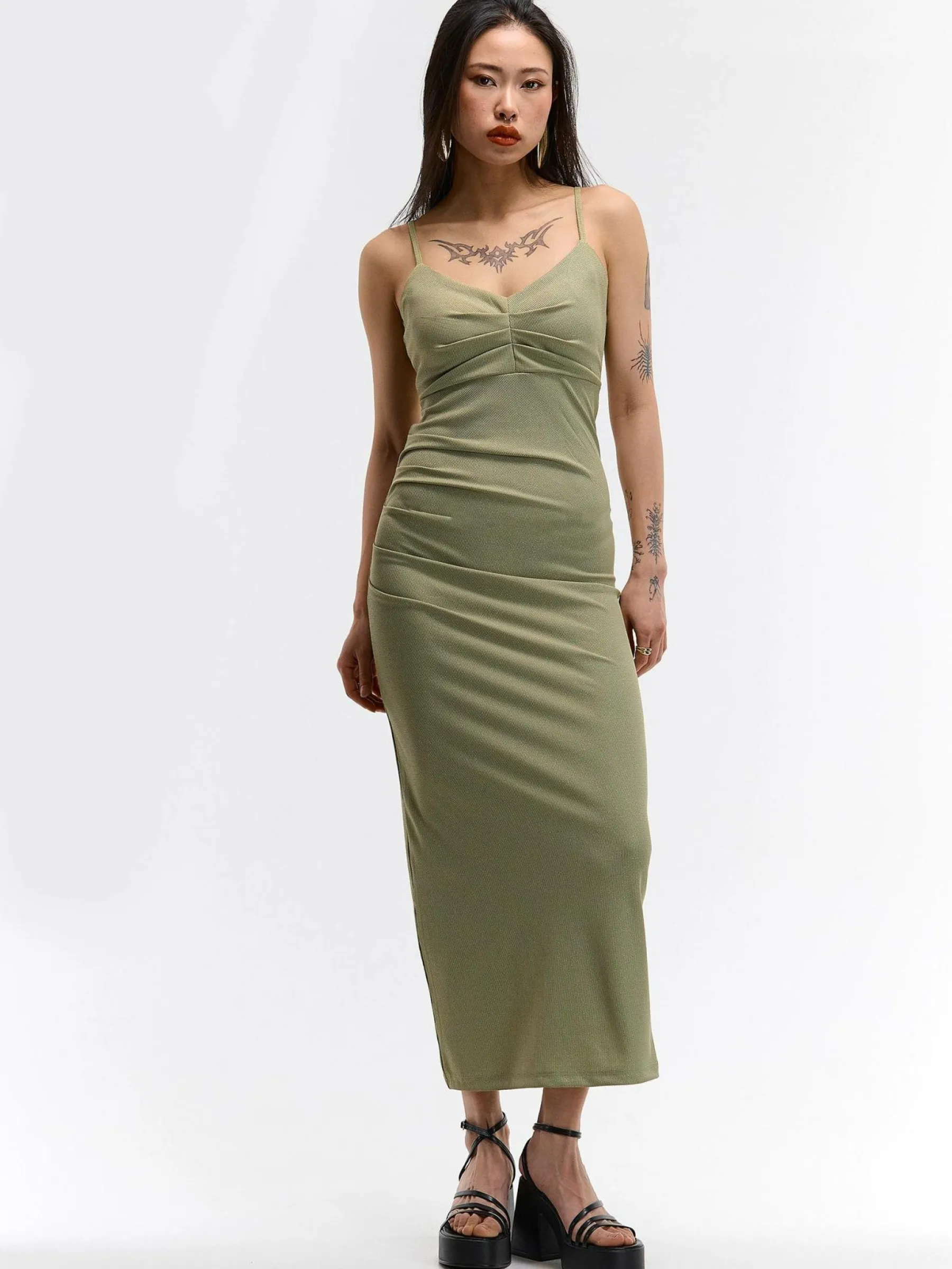 Kolor: zielonyKrój: z marszczeniemTyp: sukienkaRekaw: bez rękawówDługość: midiPattern style: z włóknem metaliczn…