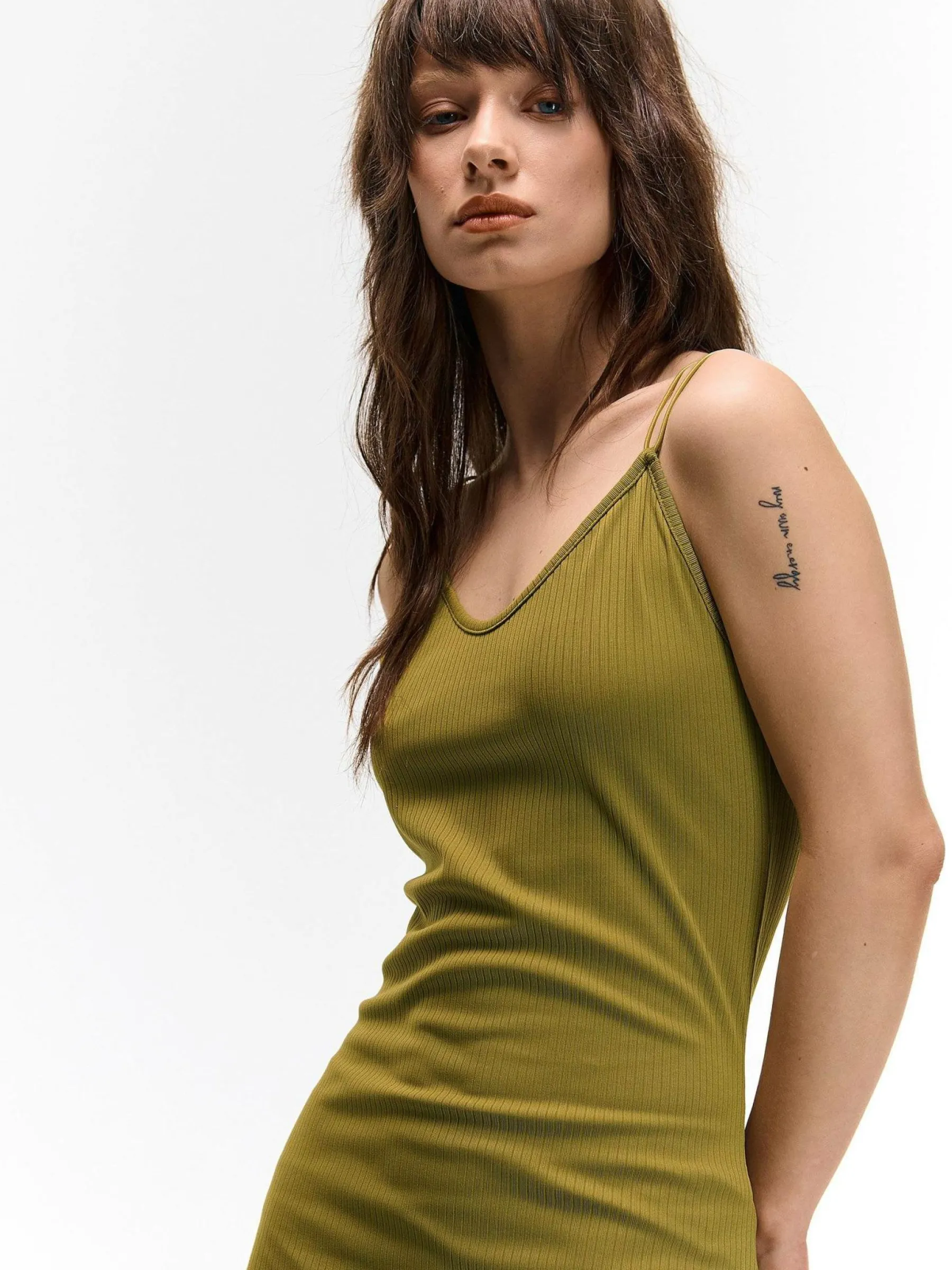 Kolor: zielonyKrój: ołówkoweTyp: sukienkaRekaw: bez rękawówDługość: miniPattern style: pojedynczy kolor, żebrow…