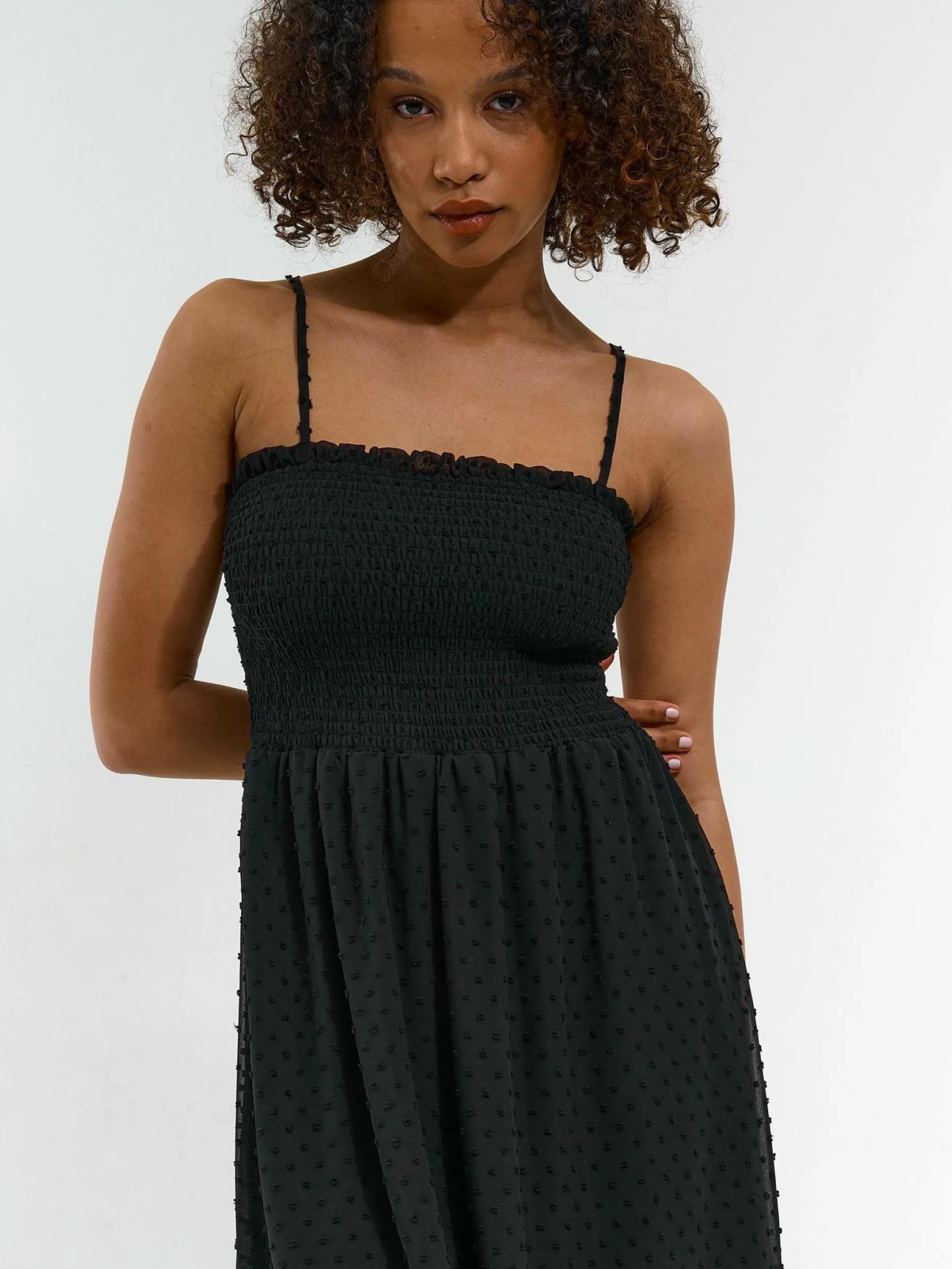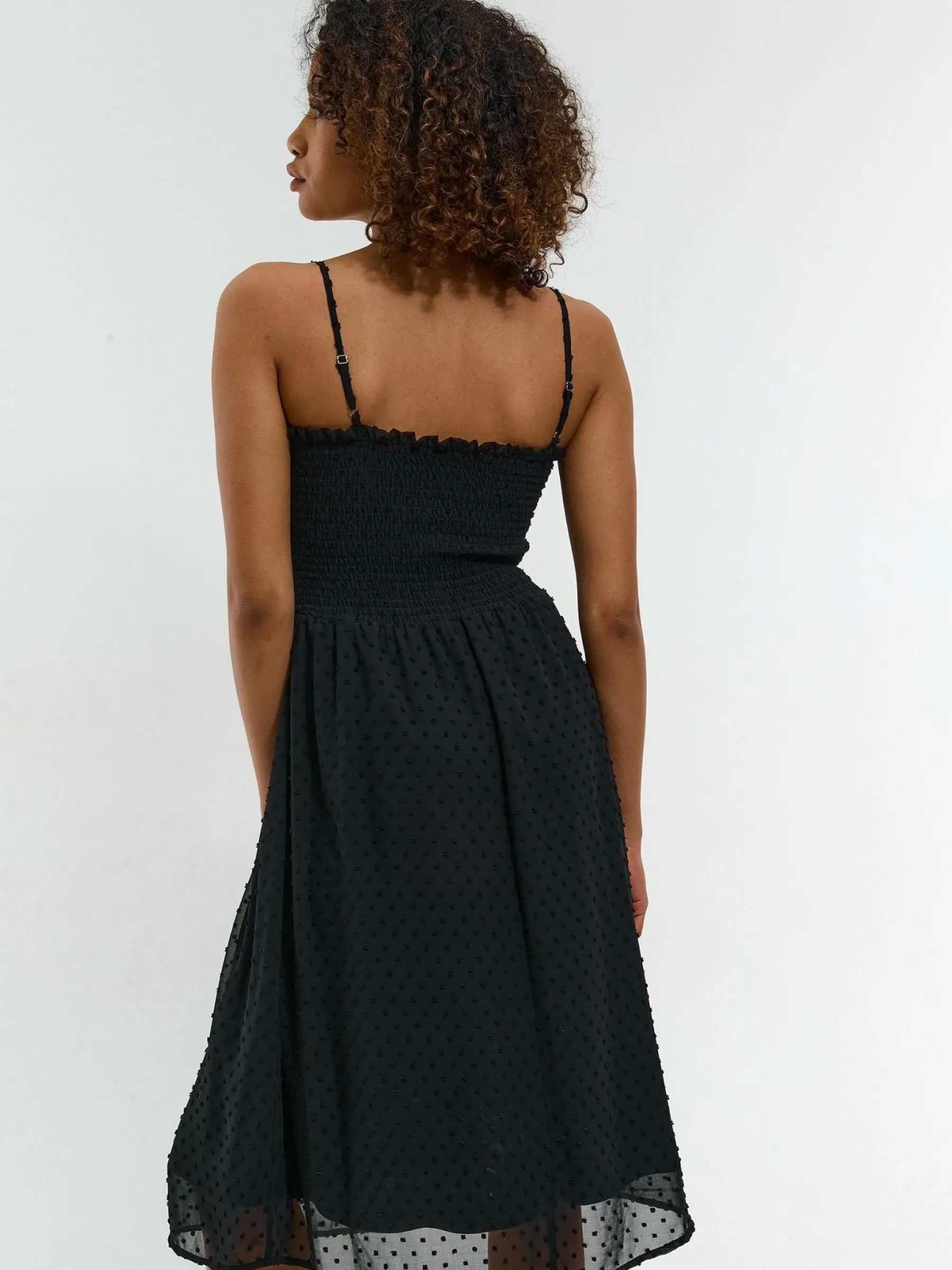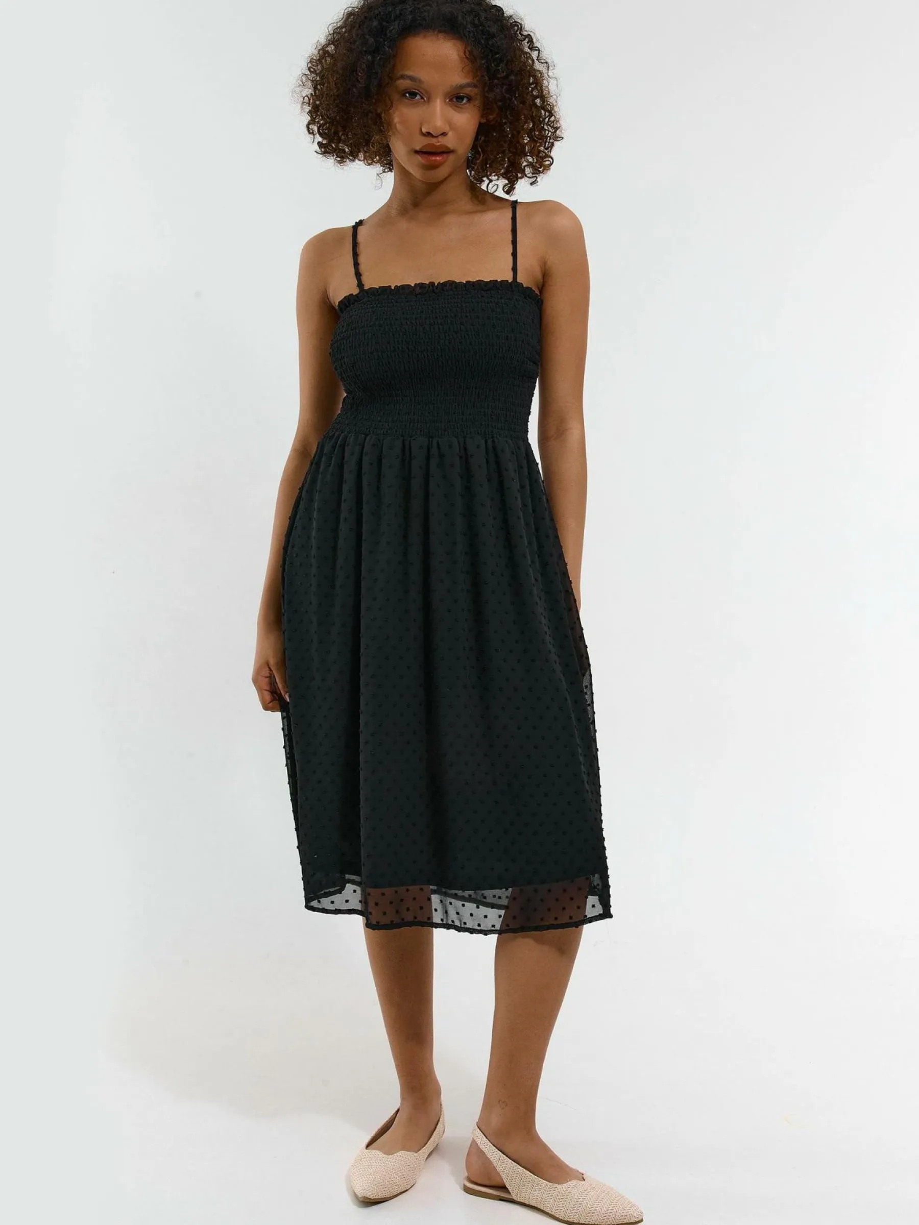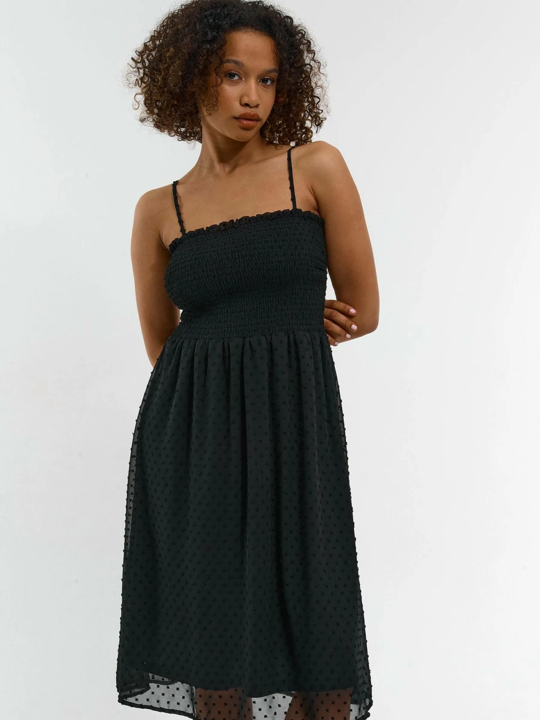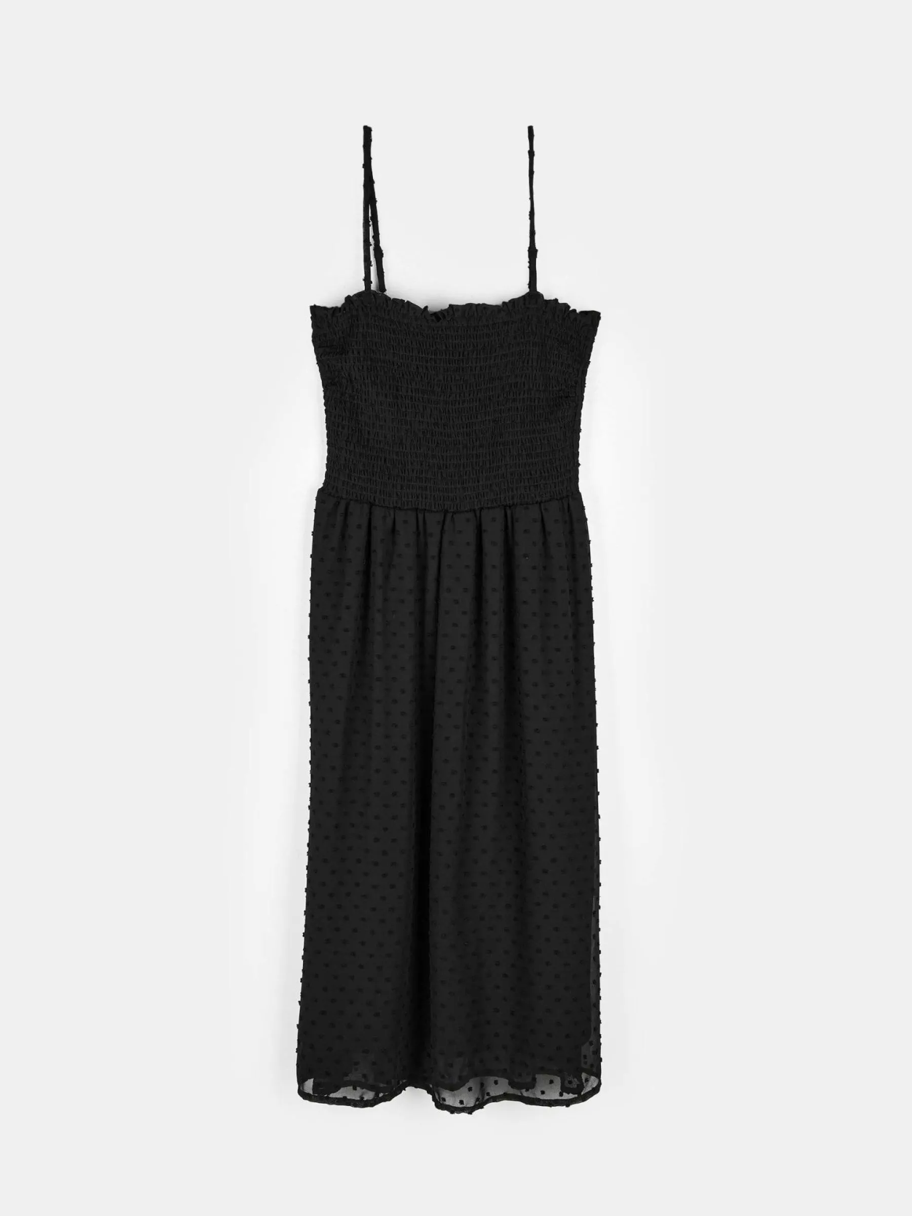 Kolor: czarnyKrój: z marszczeniemTyp: sukienkaRekaw: bez rękawówDługość: midiPattern style: pojedynczy kolor, stru…