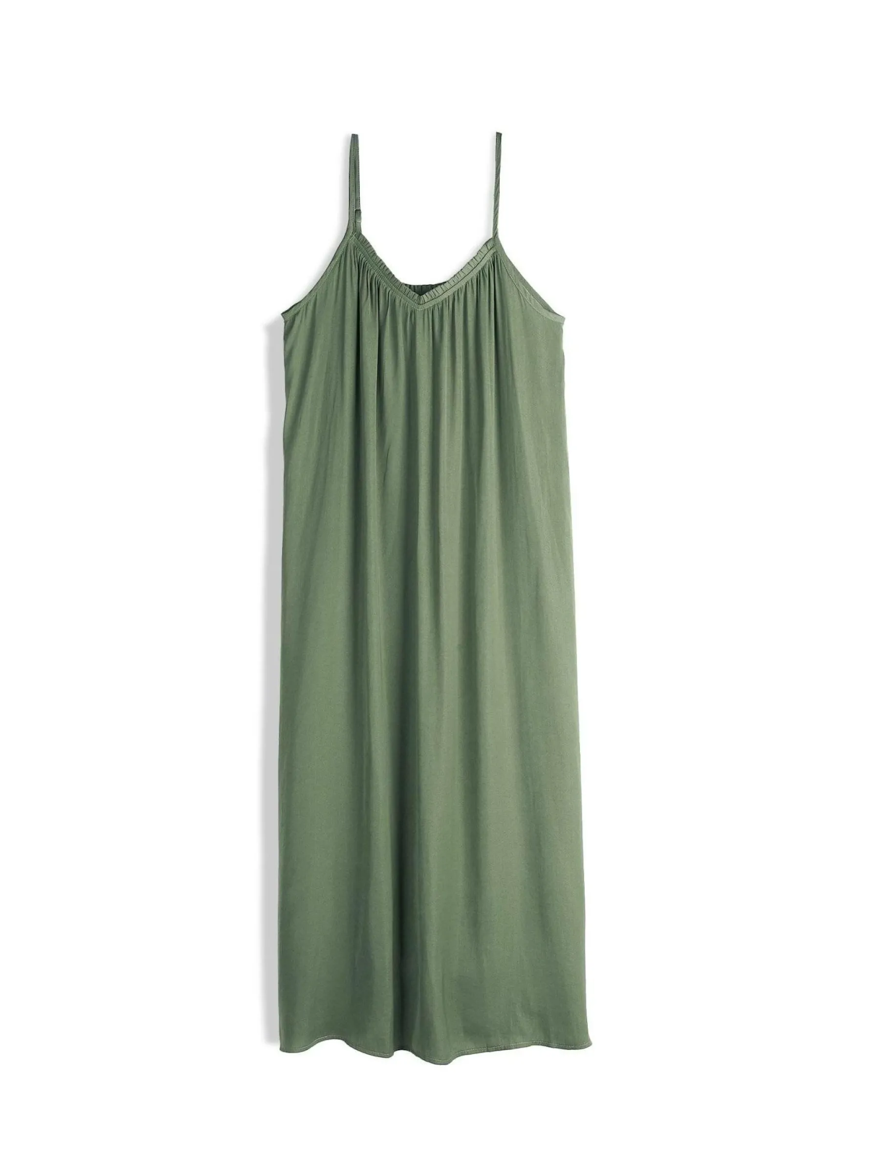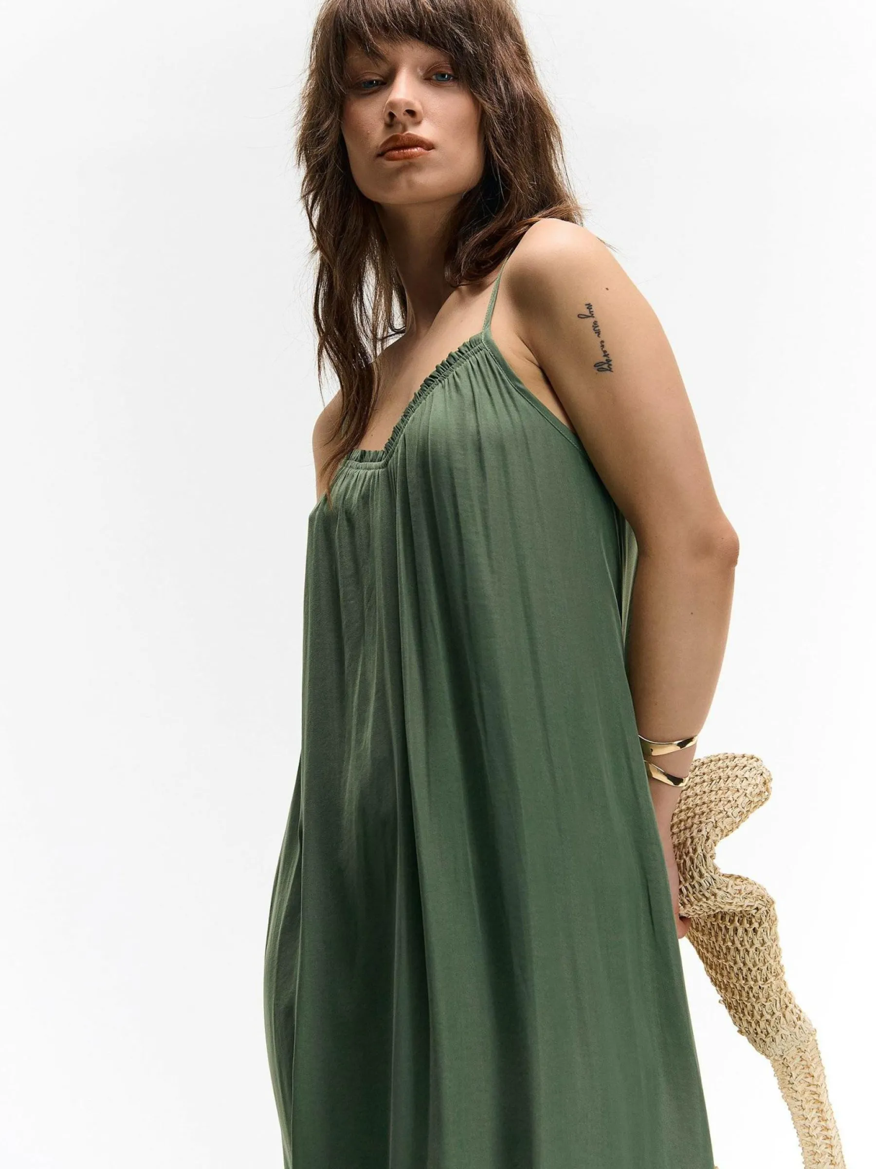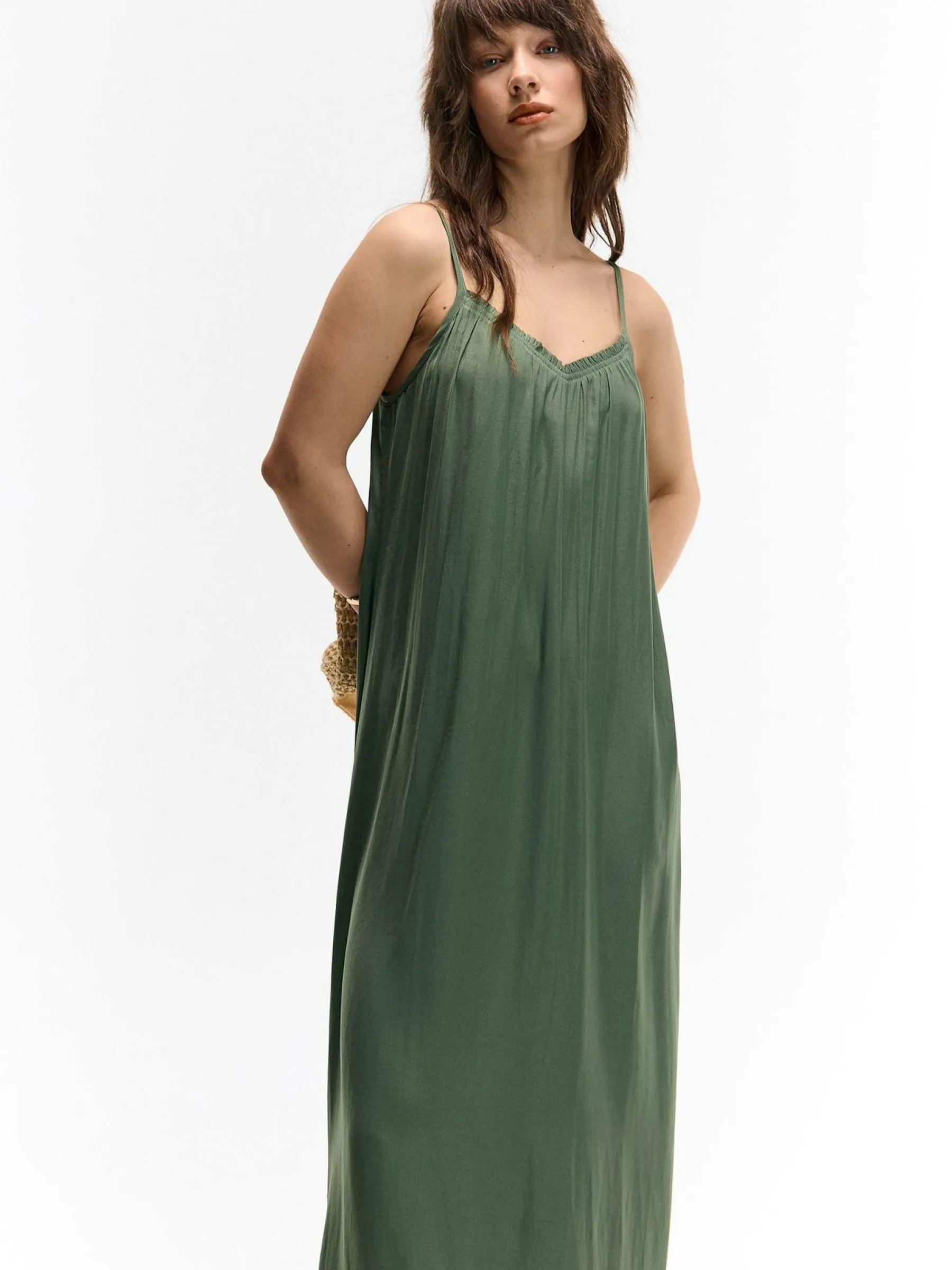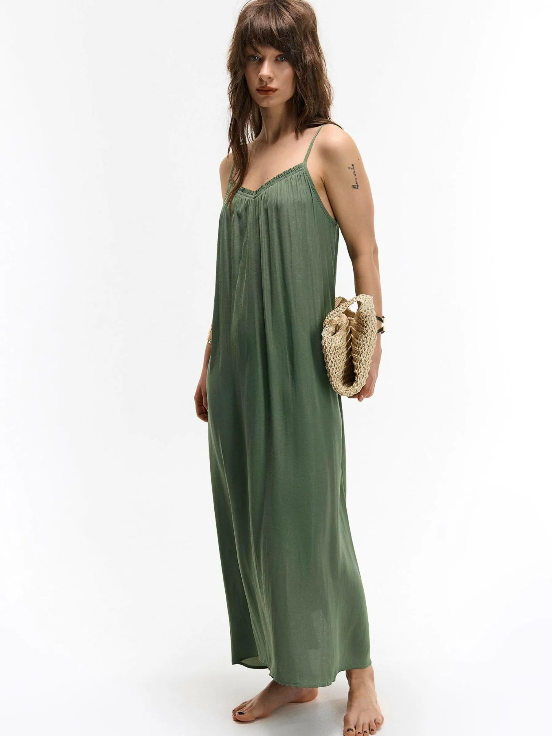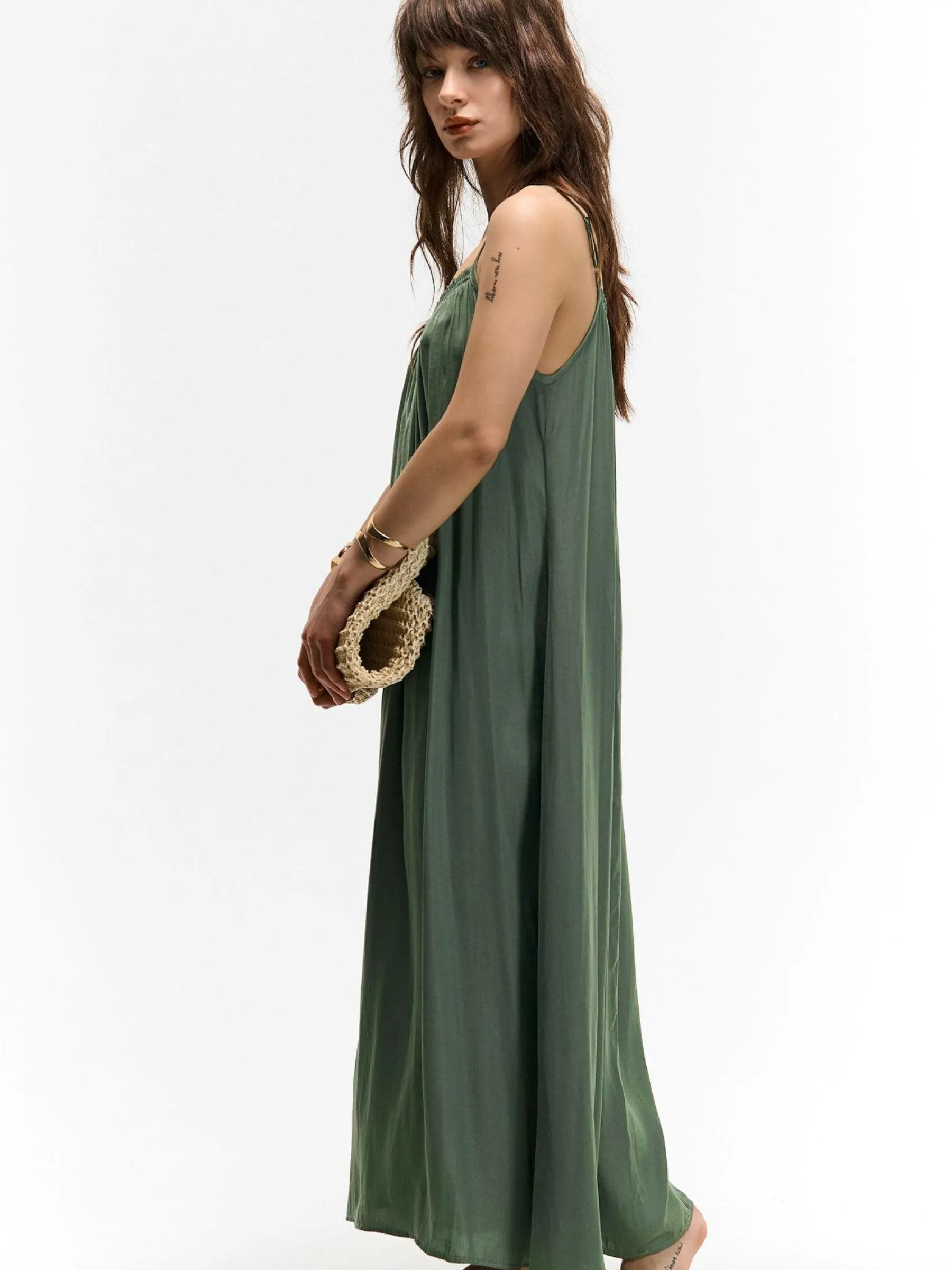 Kolor: zielonyKrój: regularTyp: sukienkaRekaw: bez rękawówDługość: maxiPattern style: pojedynczy kolorDetal: v-nec…