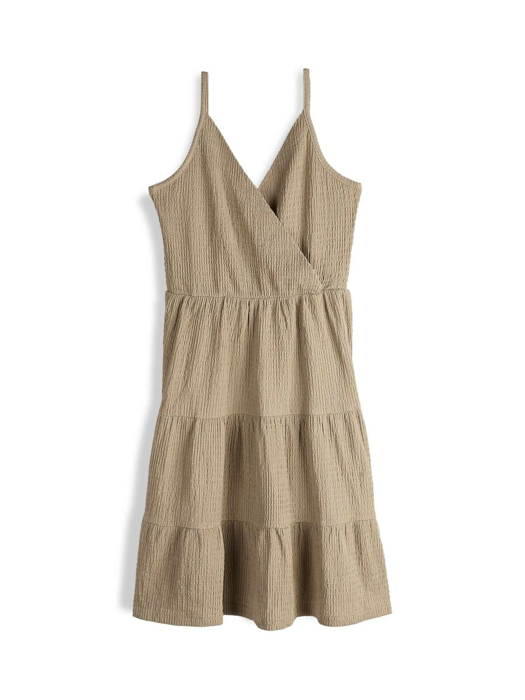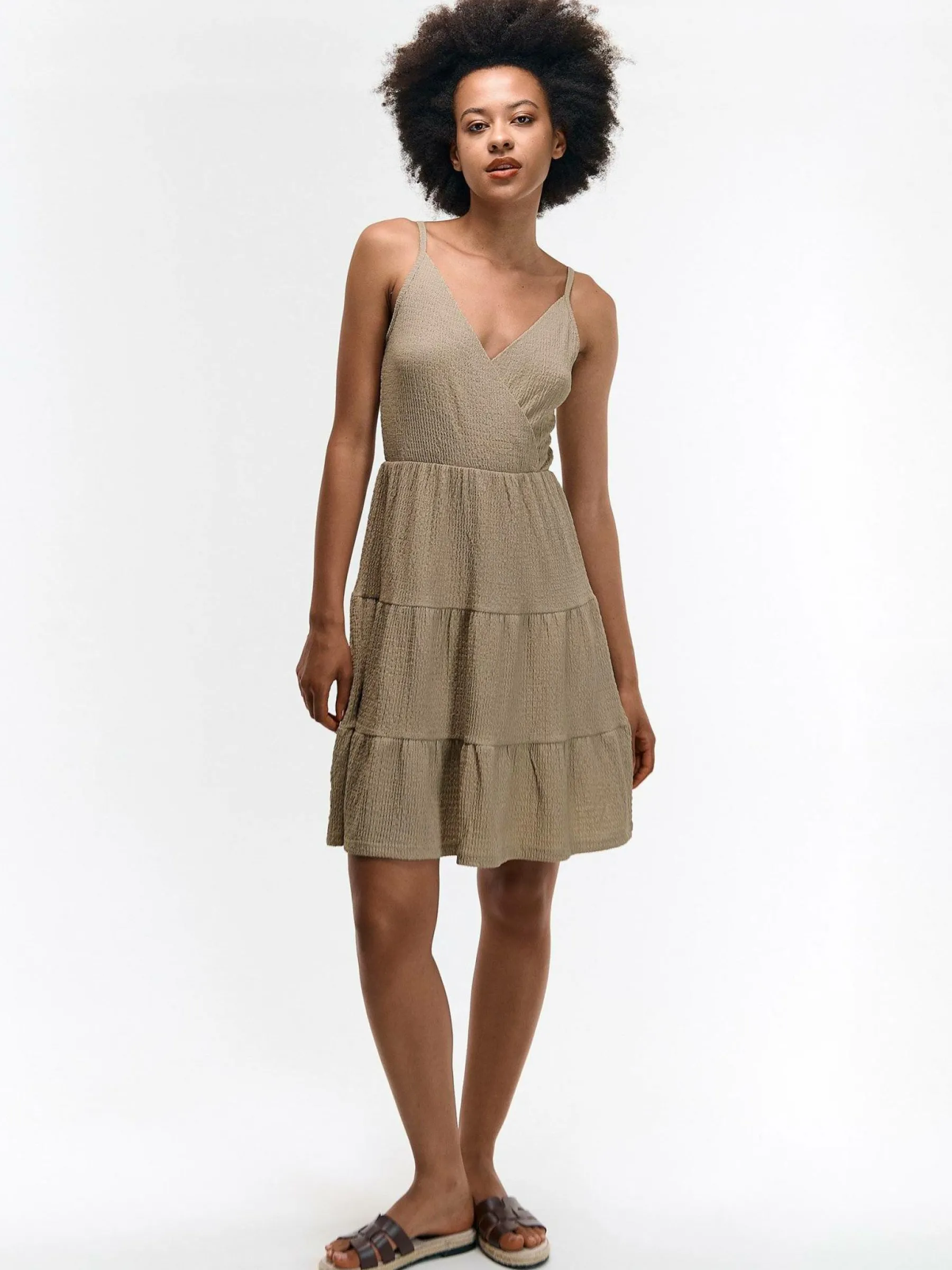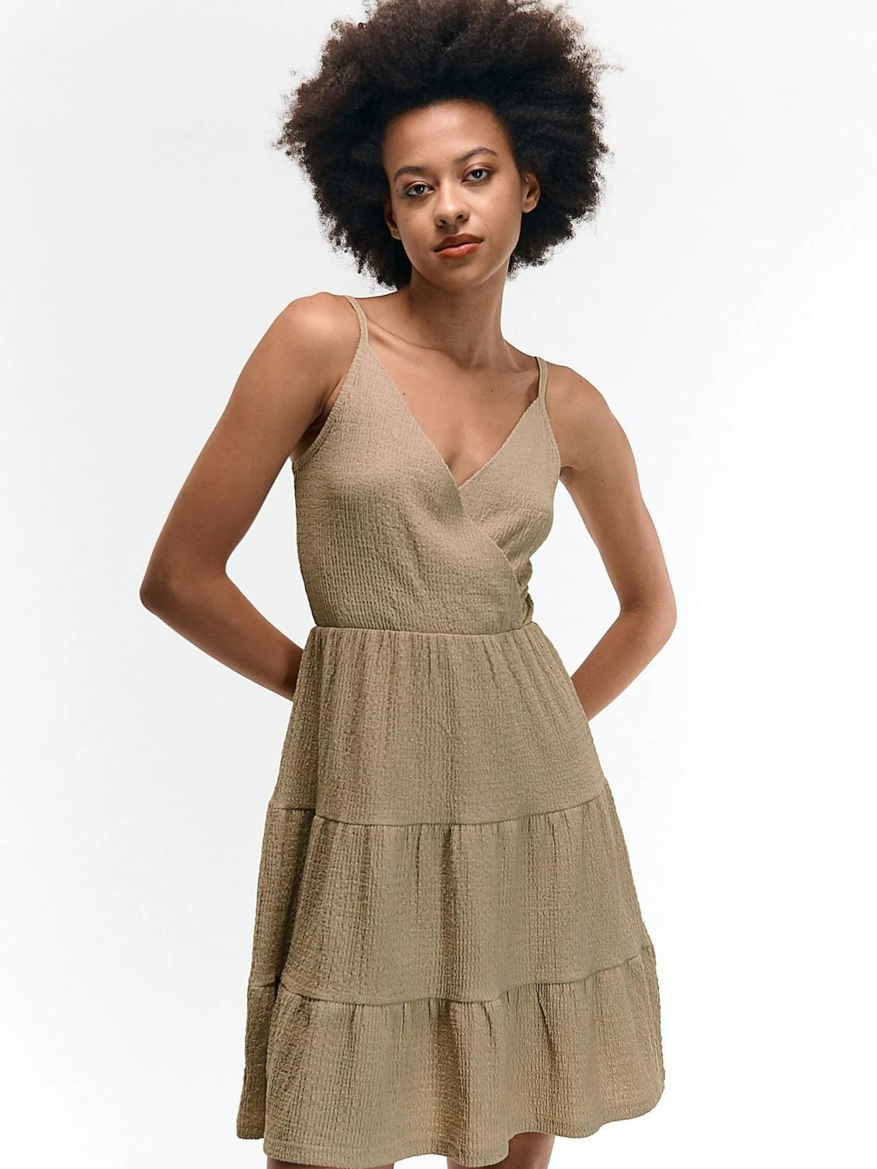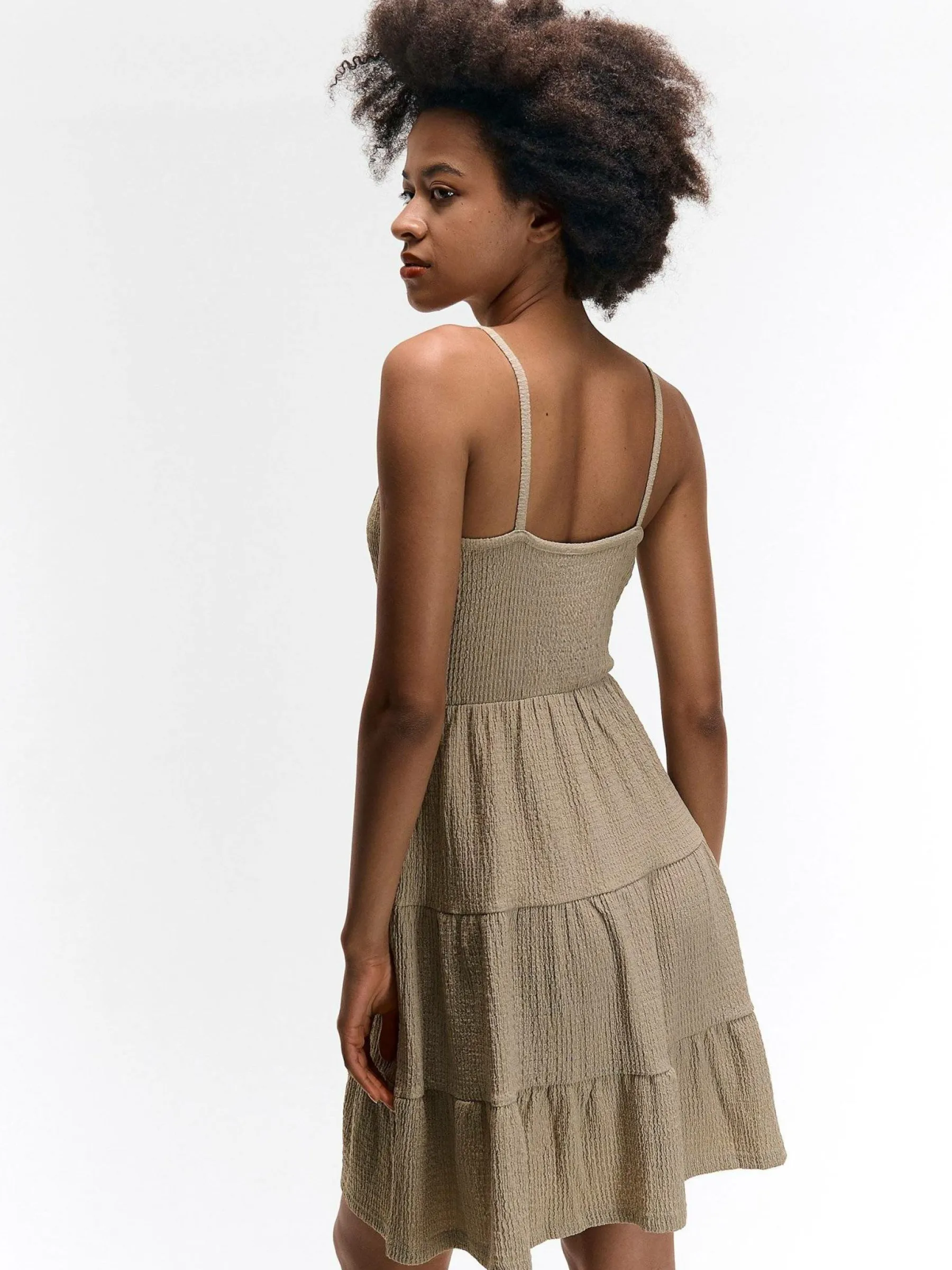 Kolor: beżowyKrój: z falbanąTyp: sukienkaRekaw: bez rękawówDługość: miniPattern style: pojedynczy kolor, struktu…
