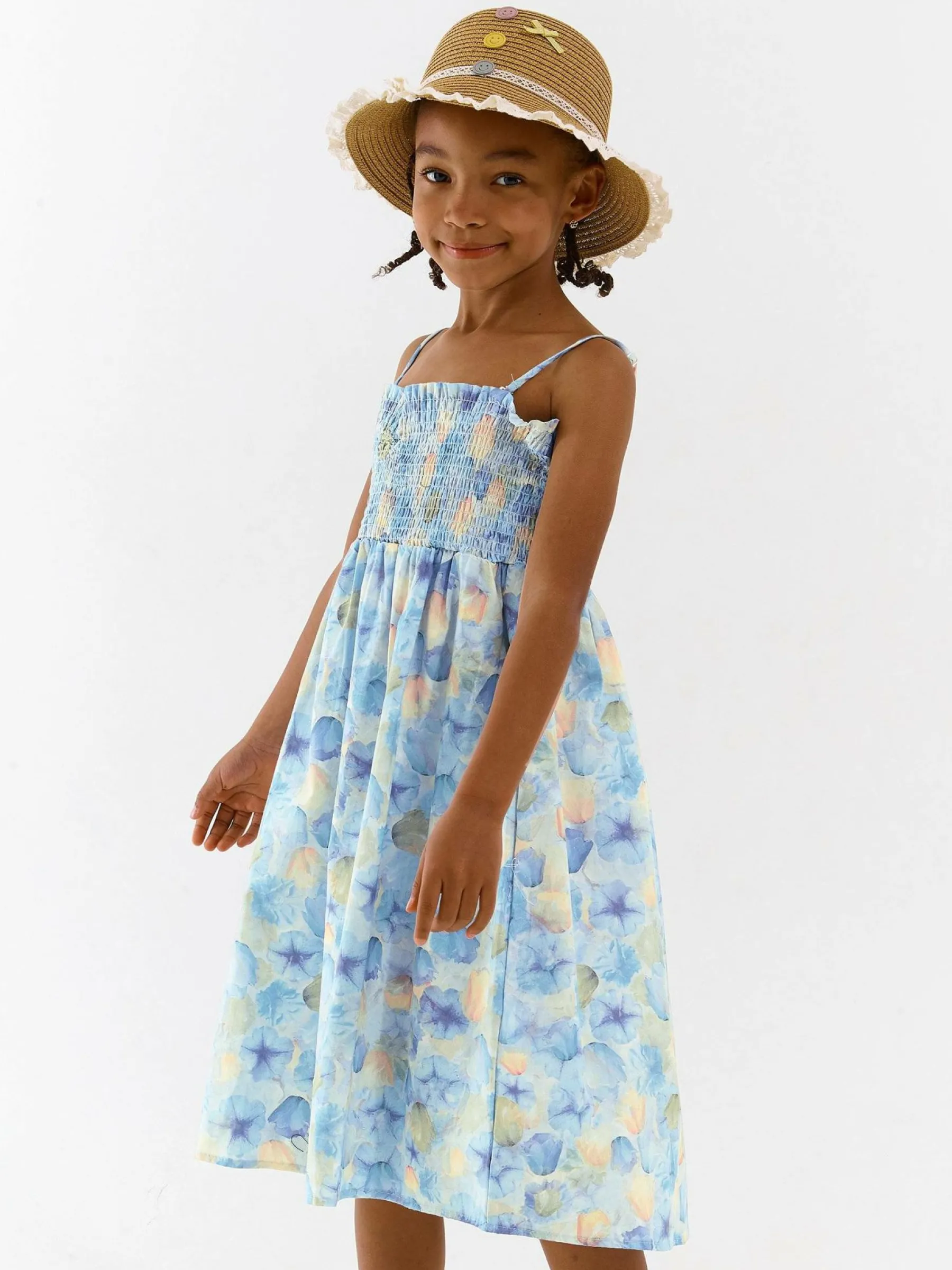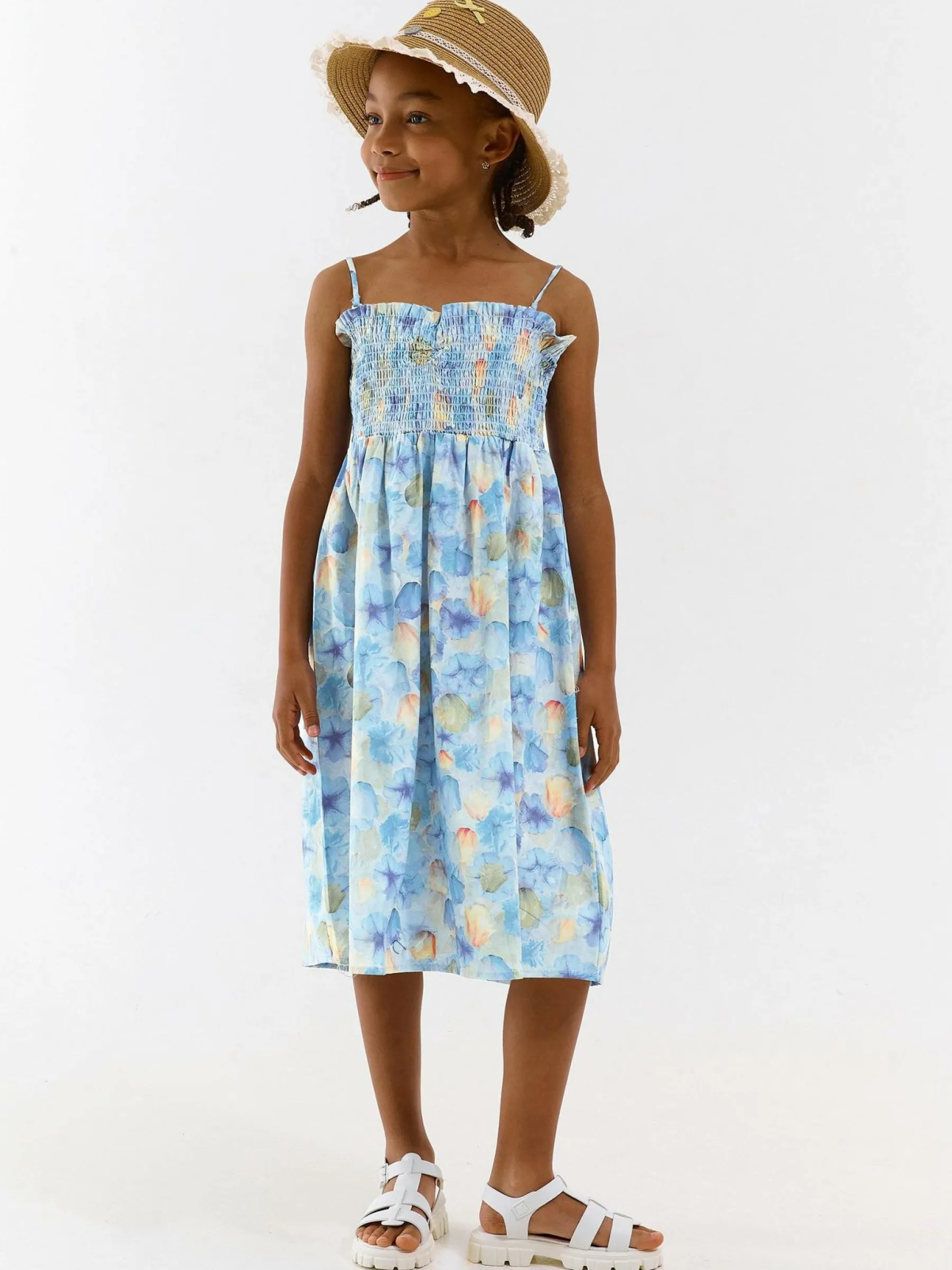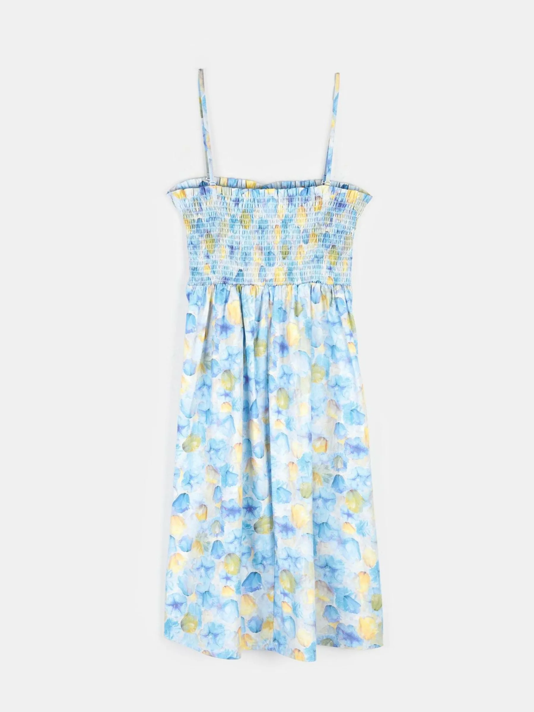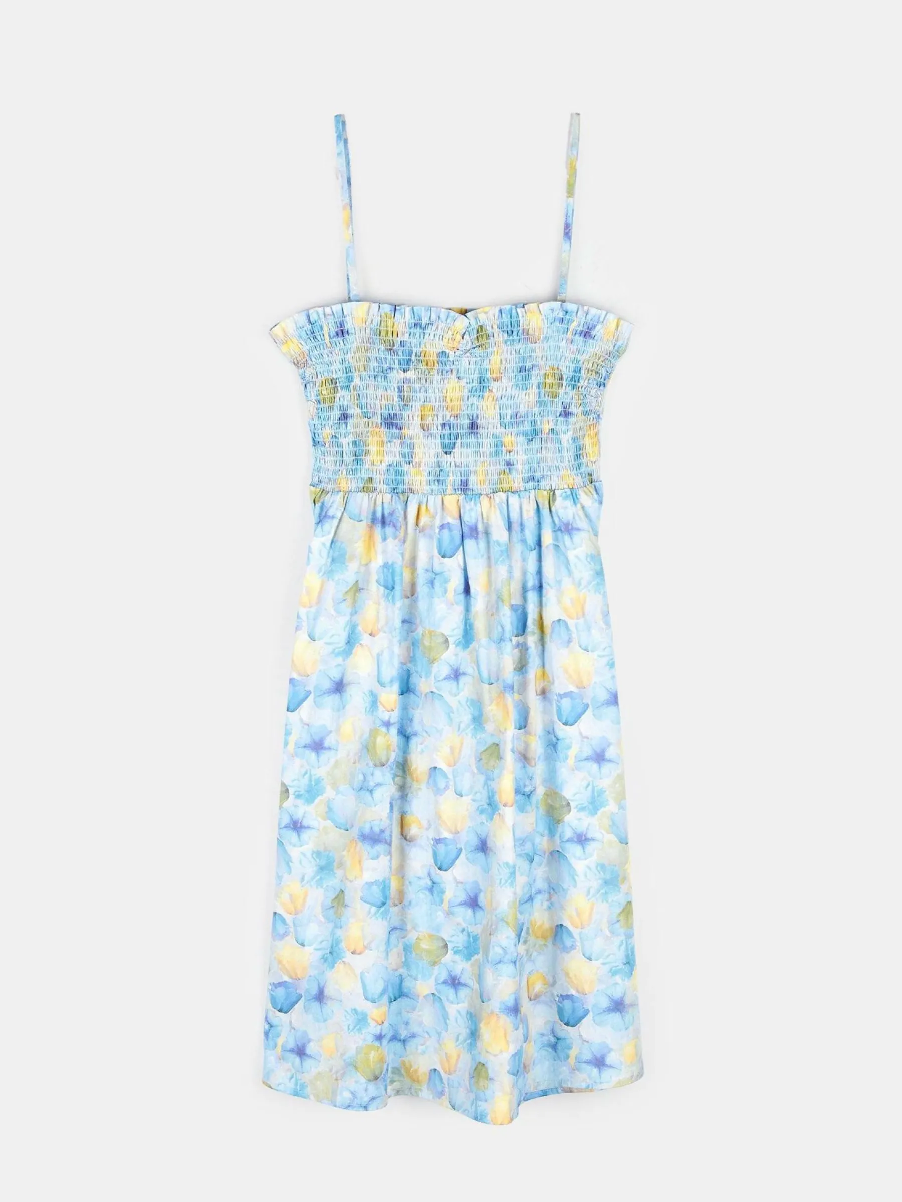 Kolor: niebieskiKrój: asyTyp: sukienkaRekaw: bez rękawówDługość: miniPattern style: kwiatoweDetal: z falbankamiMat…