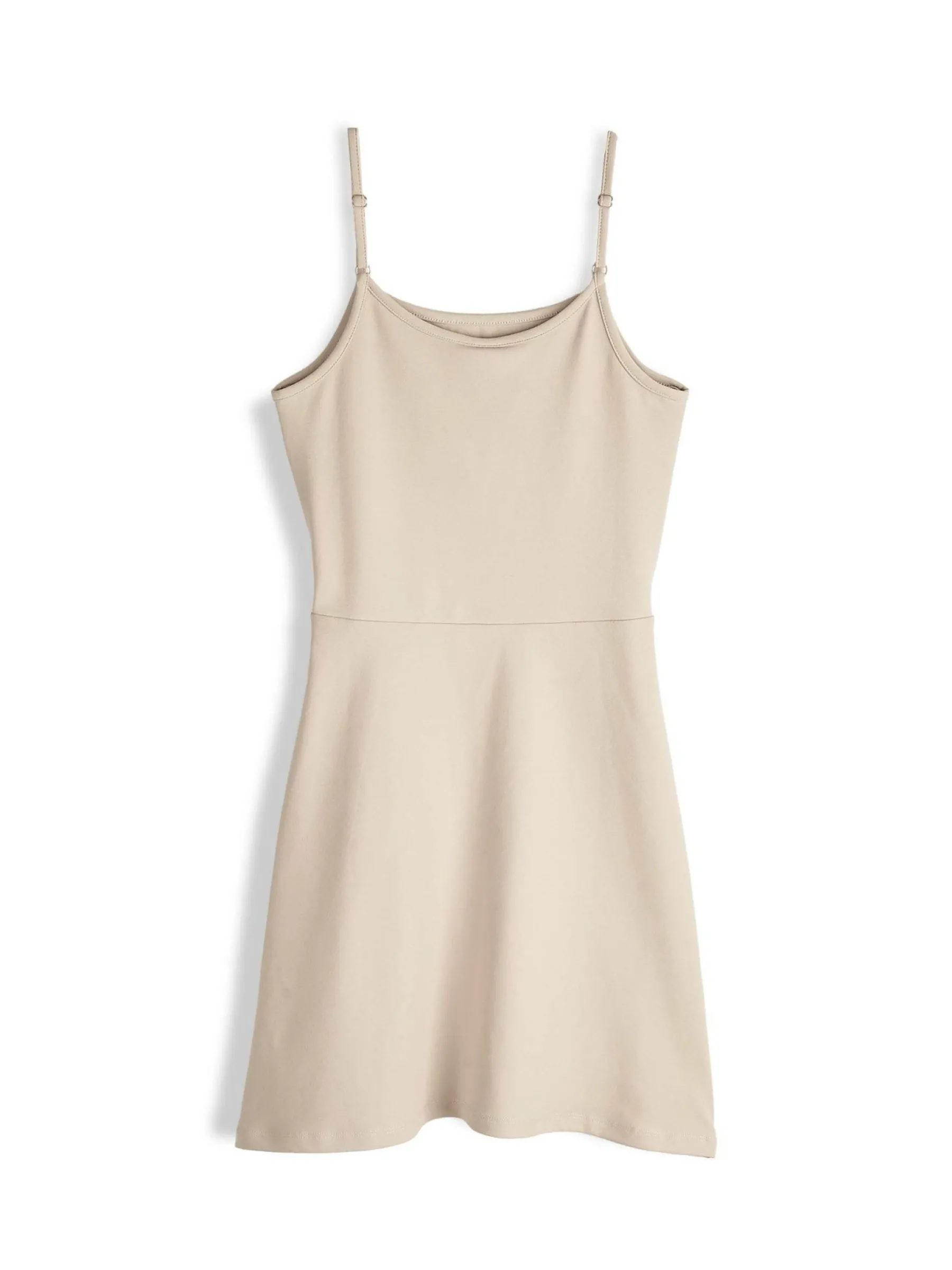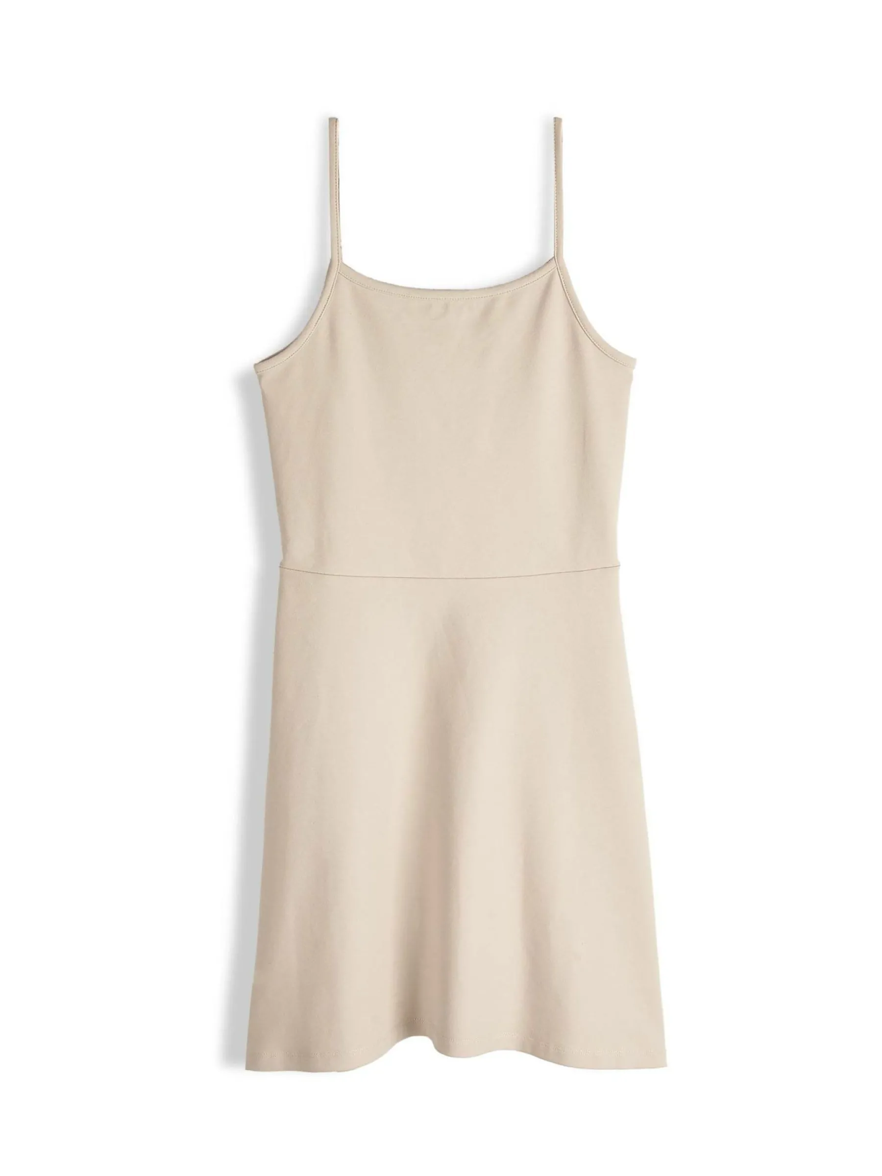 Kolor: beżowyKrój: asyTyp: sukienkaRekaw: bez rękawówDługość: miniPattern style: pojedynczy kolorDetal: z regulow…