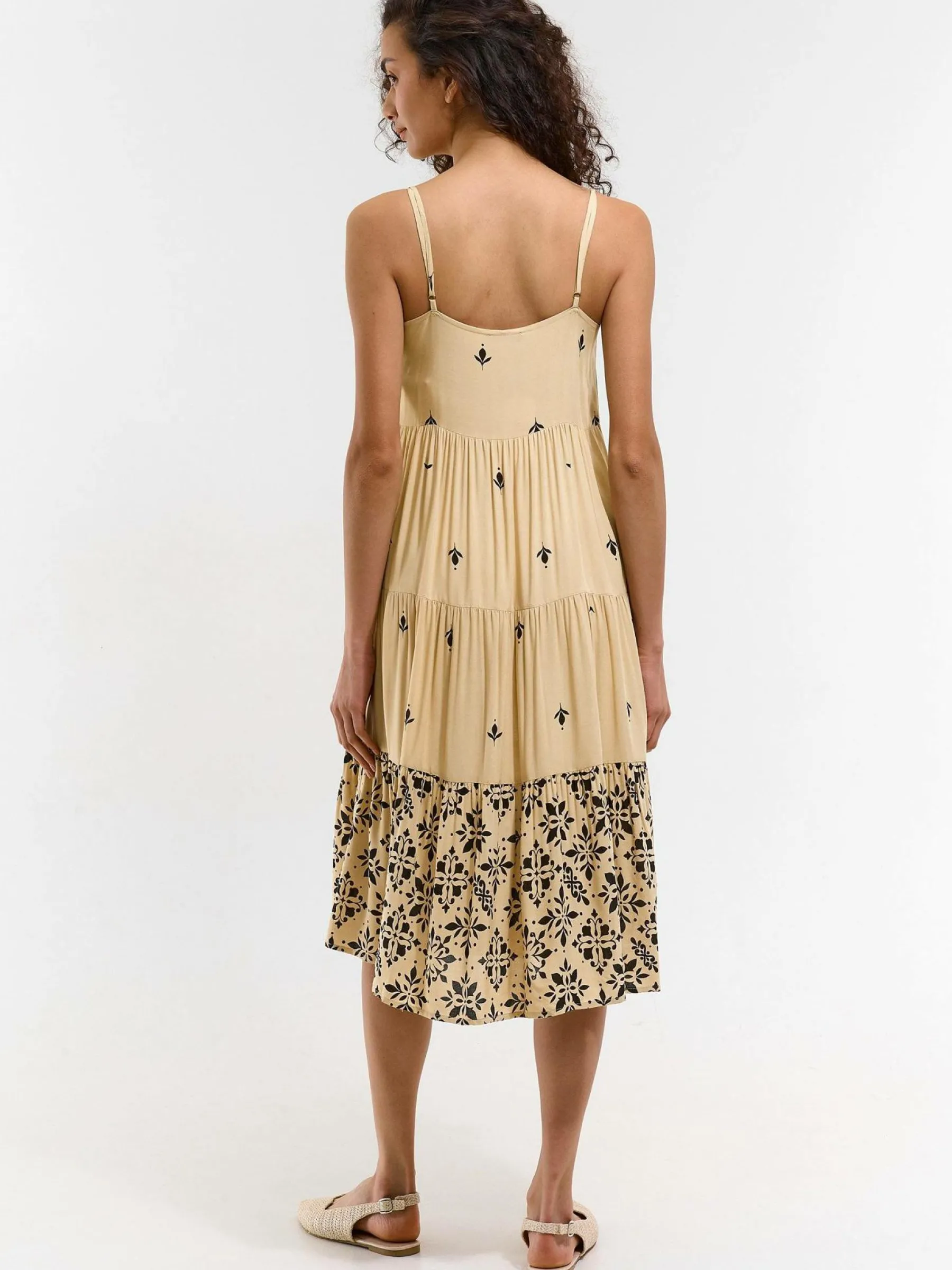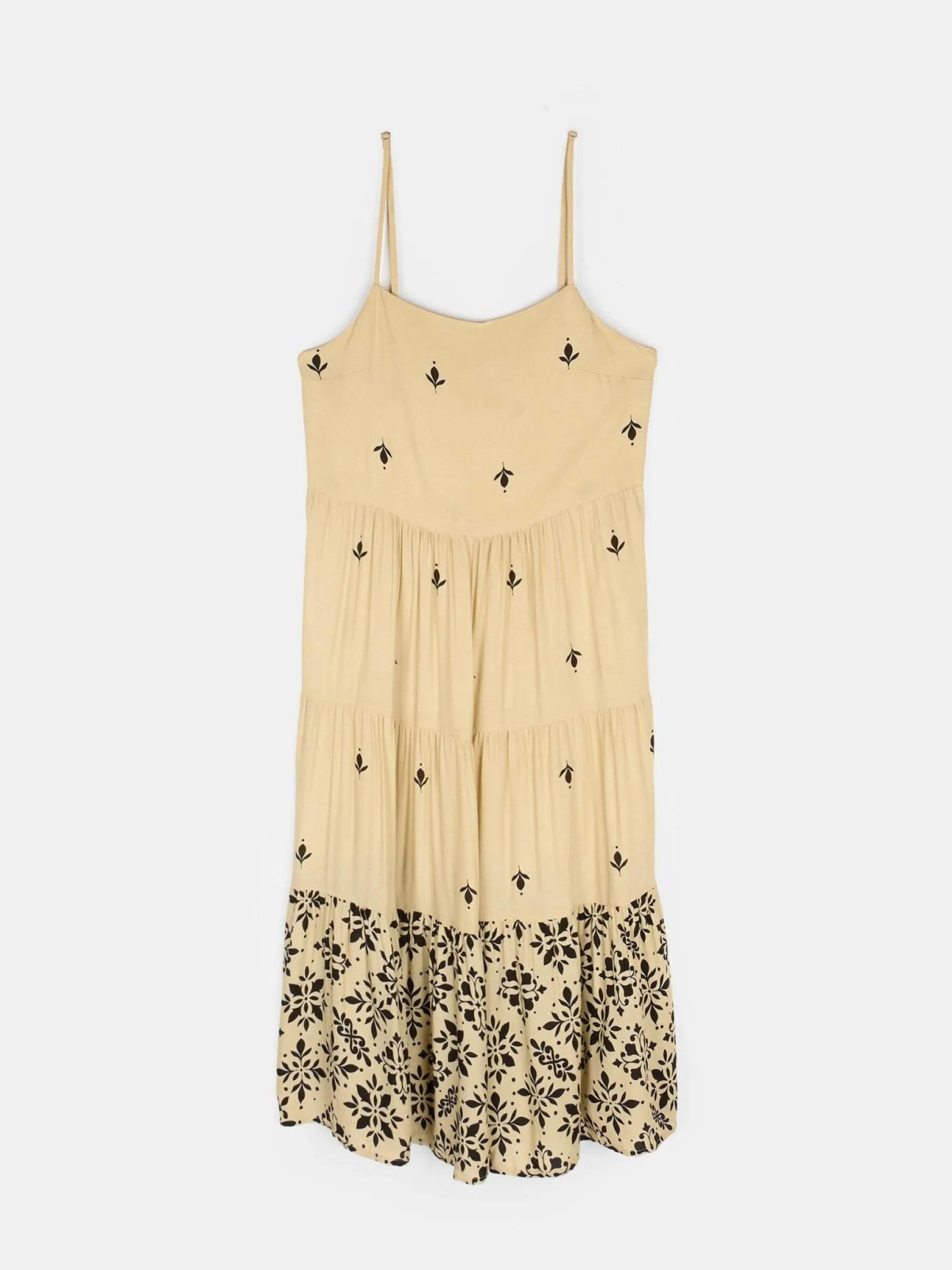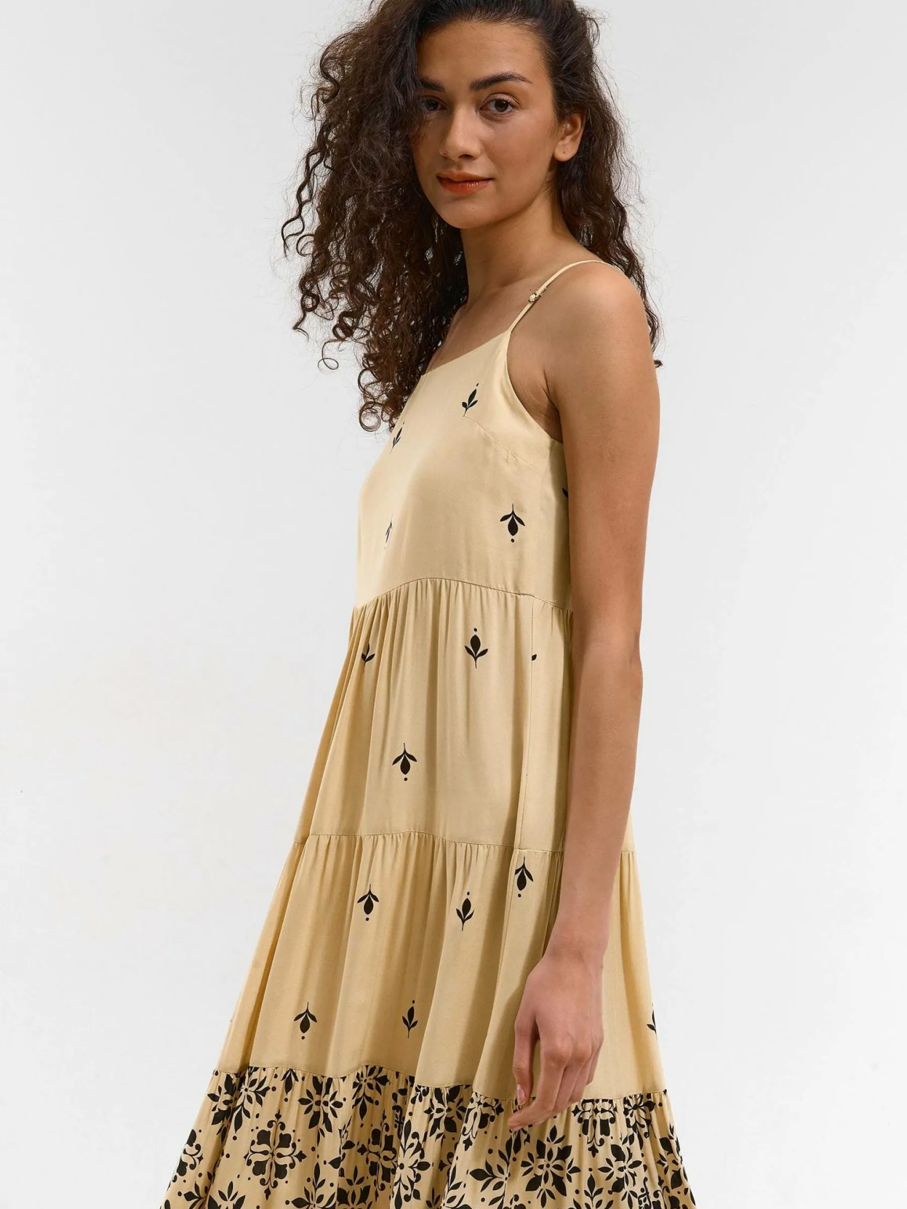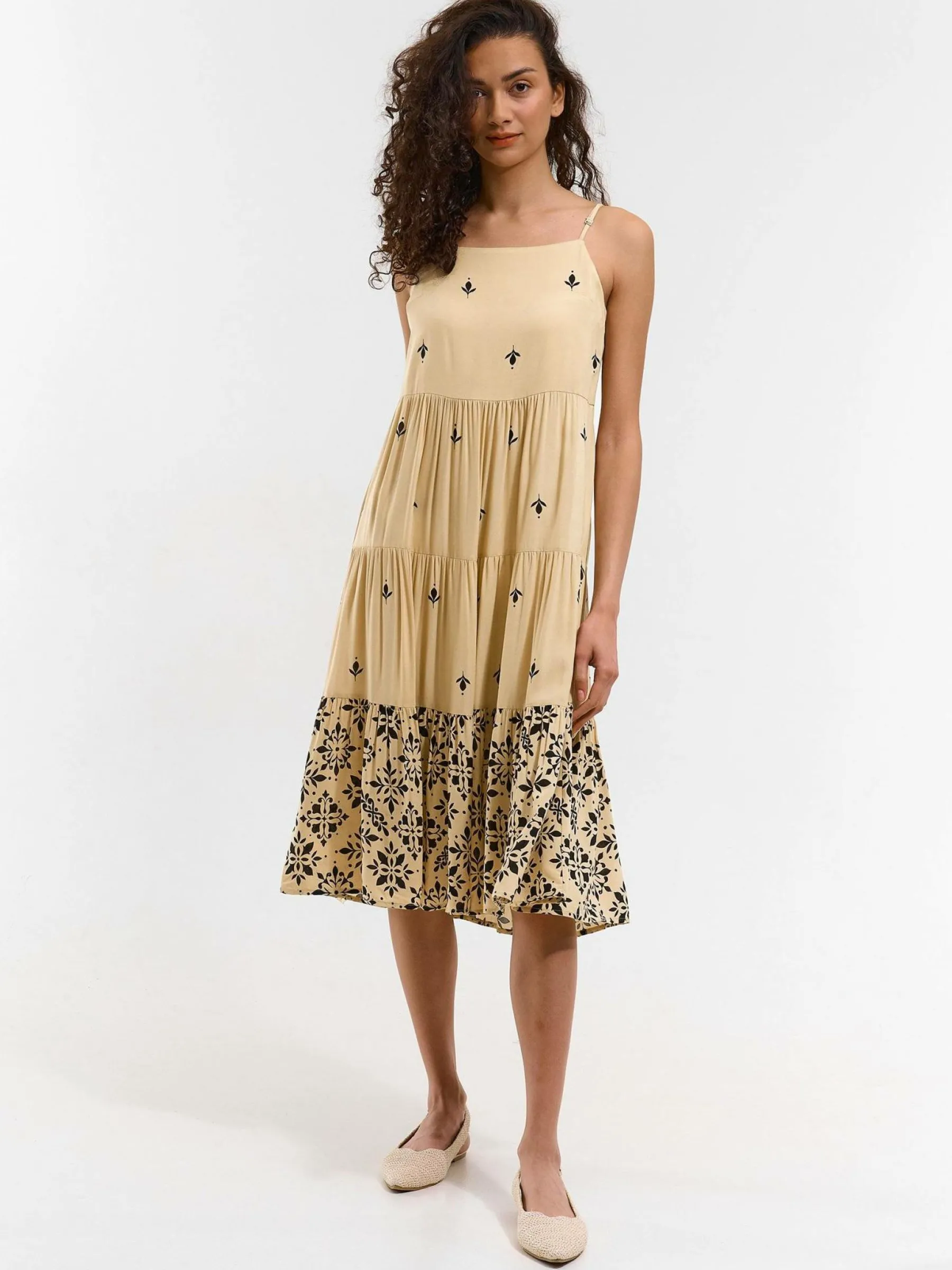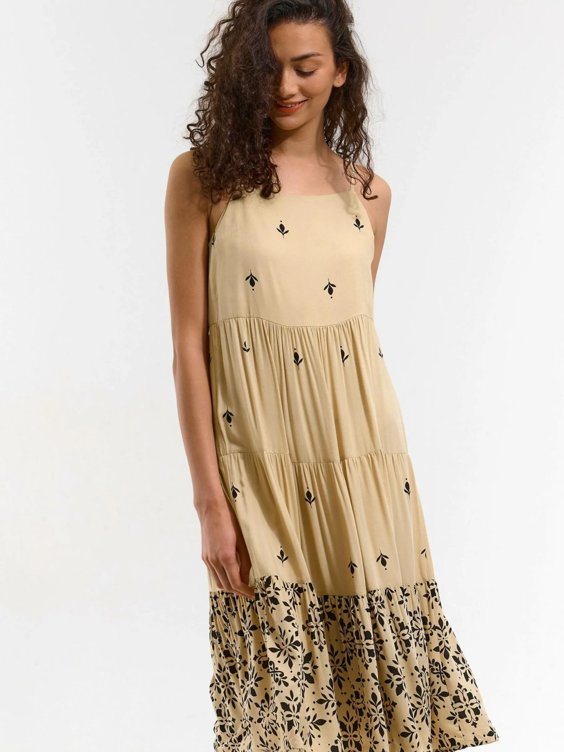 Kolor: beżowyKrój: z falbanąTyp: sukienkaRekaw: bez rękawówDługość: midiPattern style: z nadrukiemDetal: nad gł…