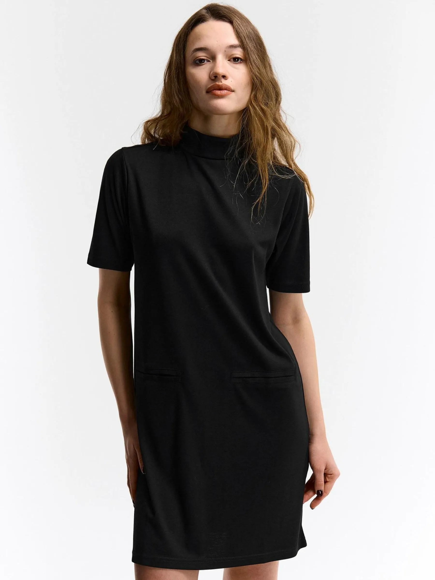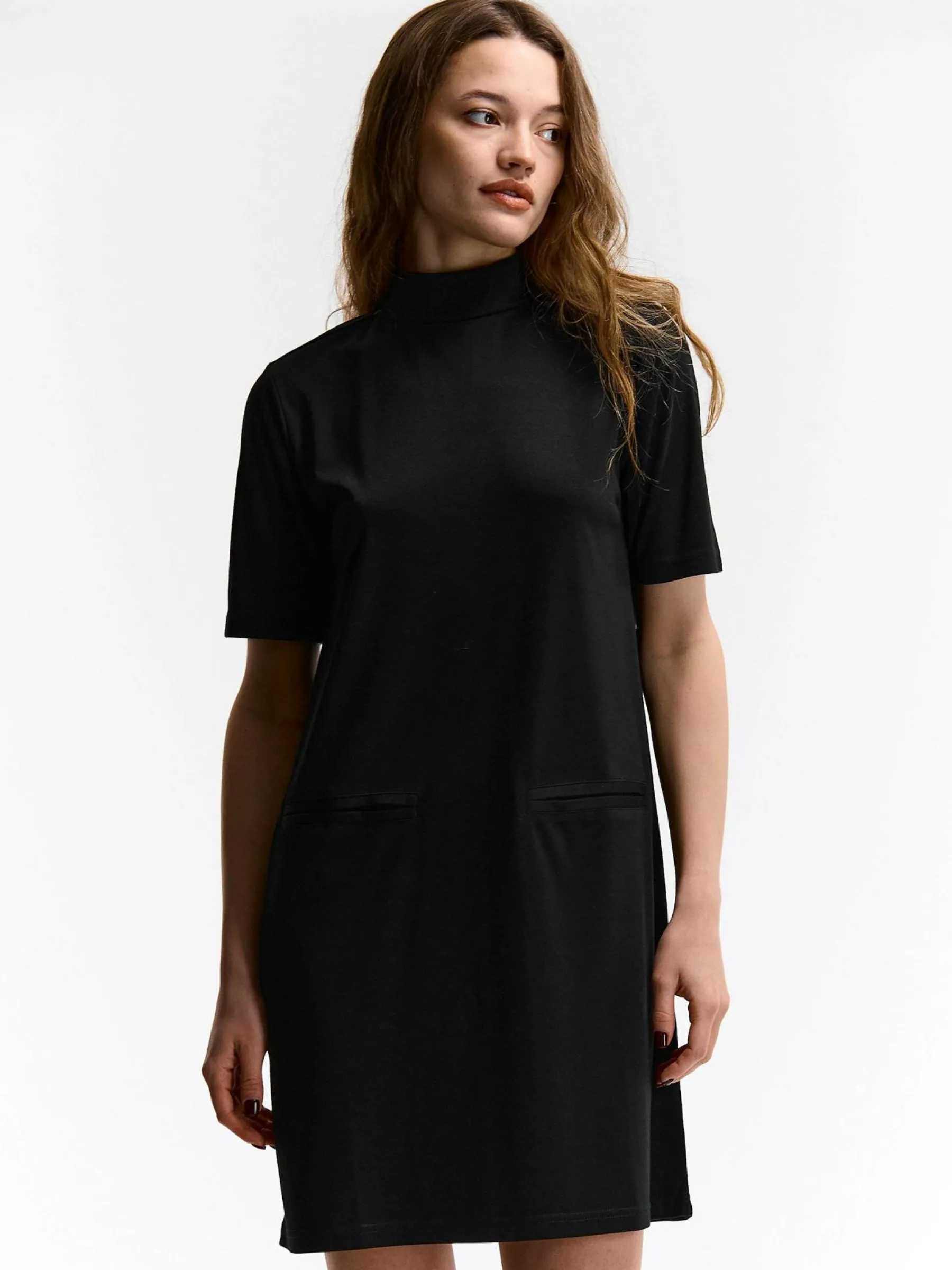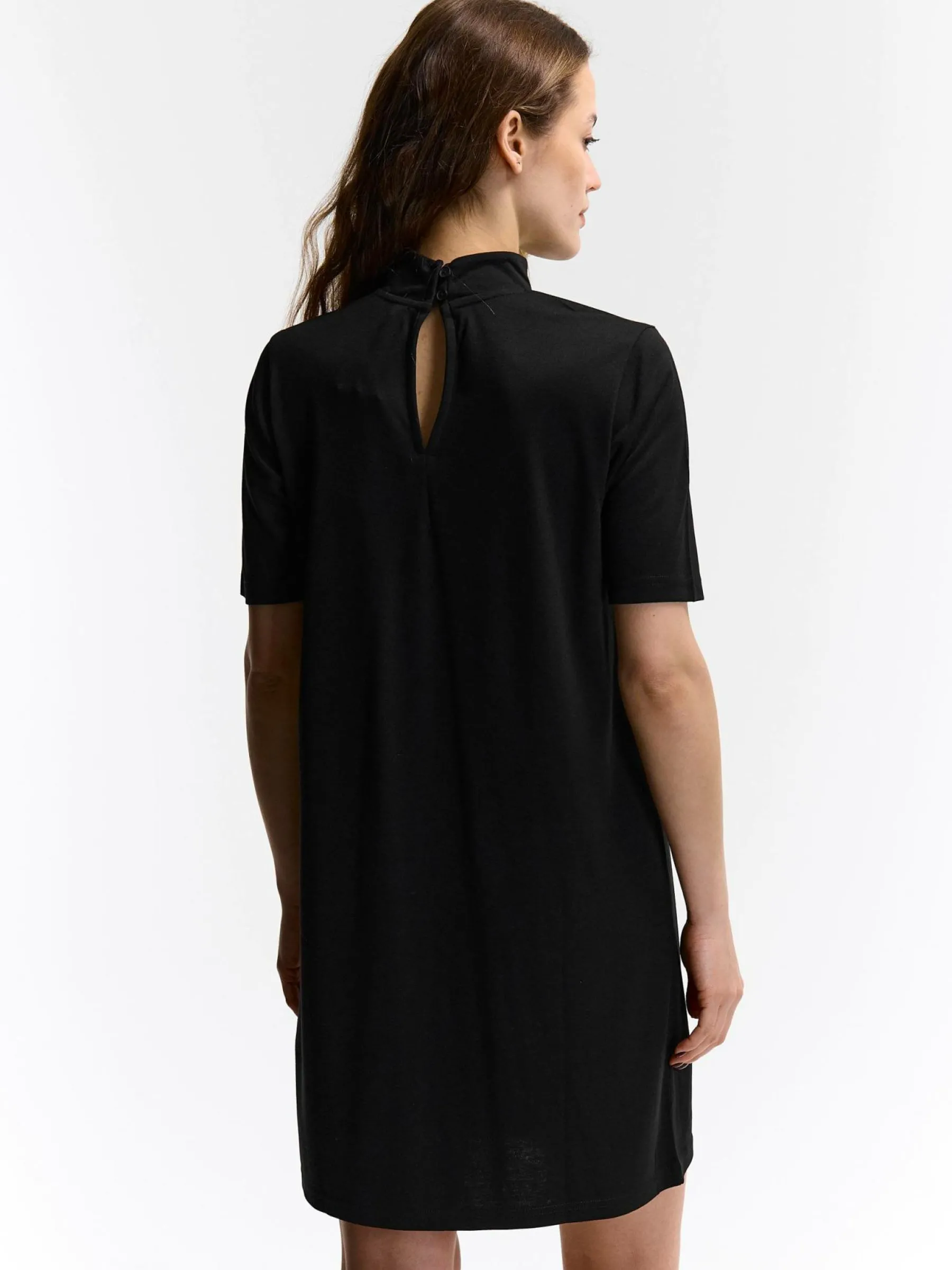 Kolor: czarnyKrój: regularTyp: sukienkaRekaw: krótki rękawDługość: miniPattern style: pojedynczy kolorDetal: nad g…