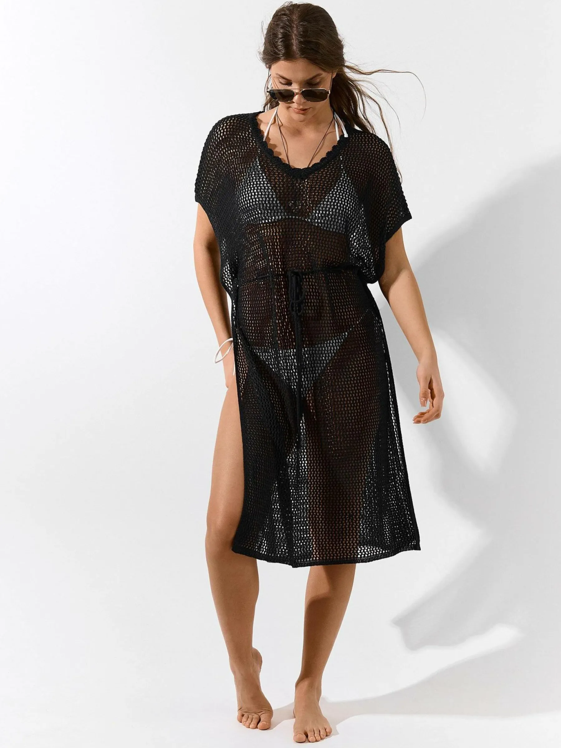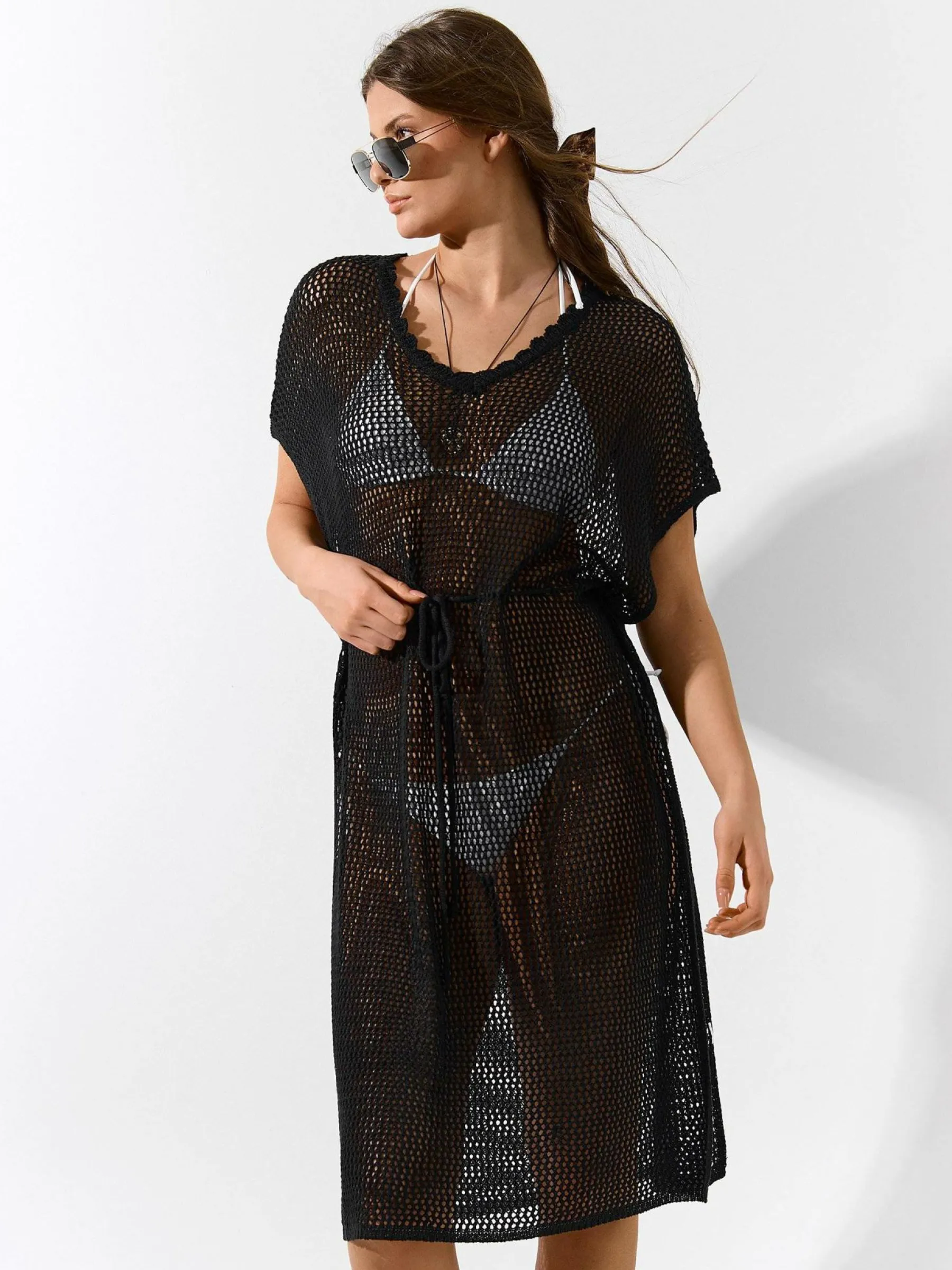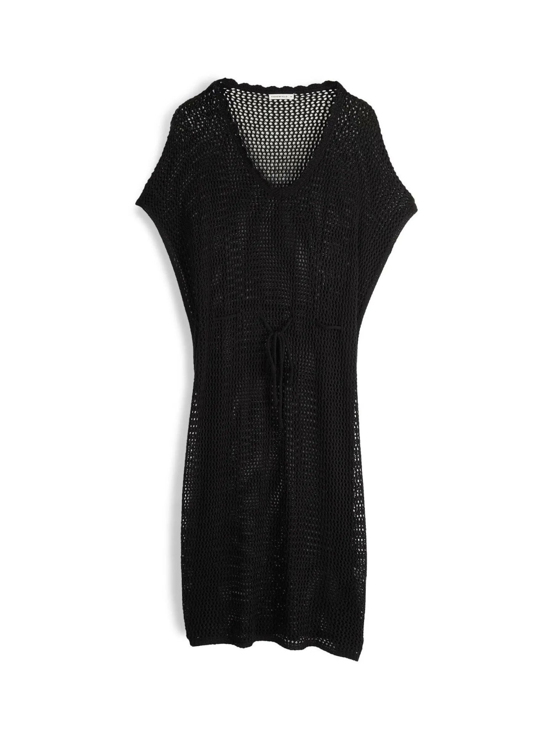 Kolor: czarnyKrój: regularTyp: sukienkaRekaw: krótki rękawDługość: midiPattern style: szydełkowaneDetal: nad gło…