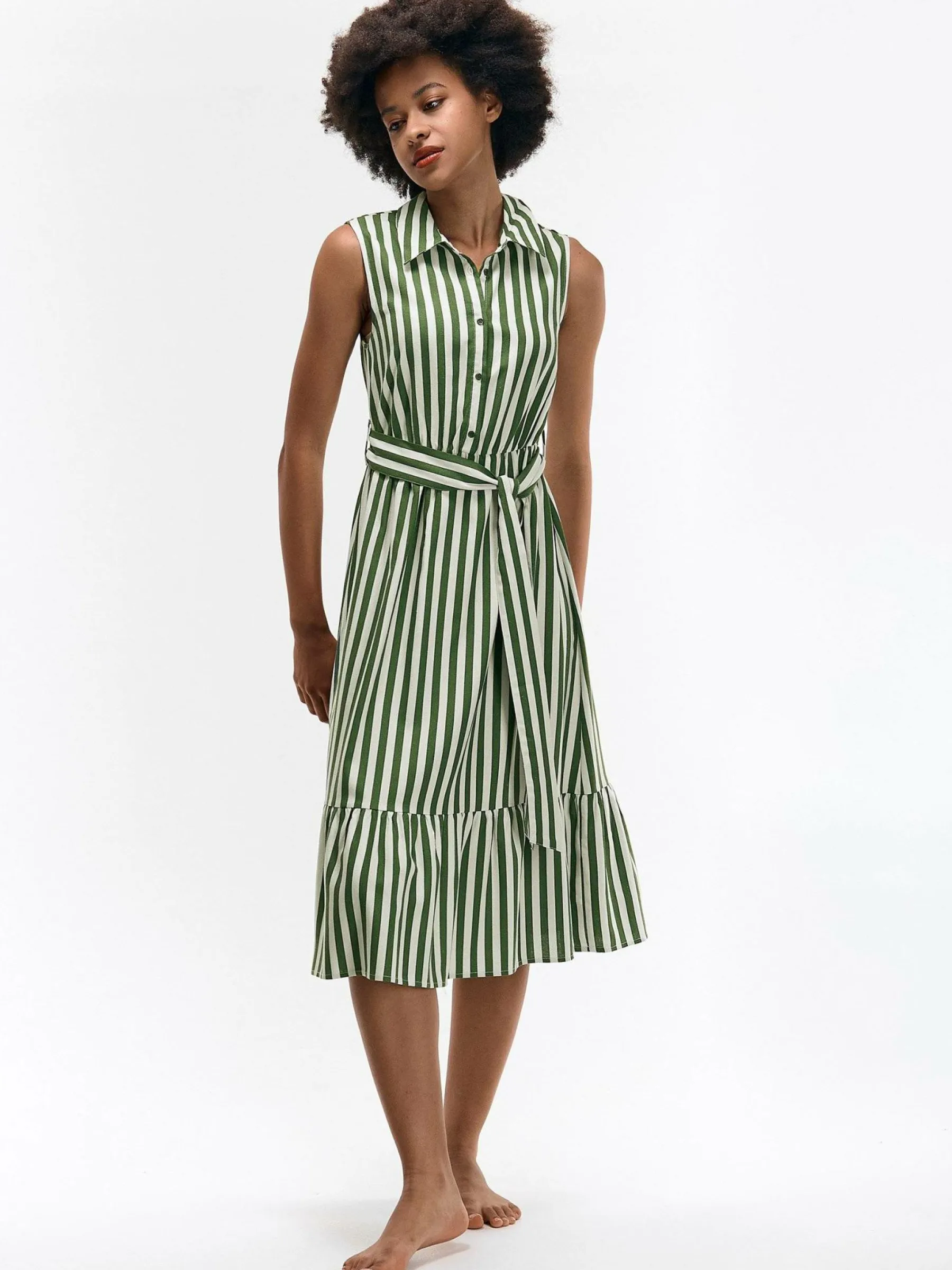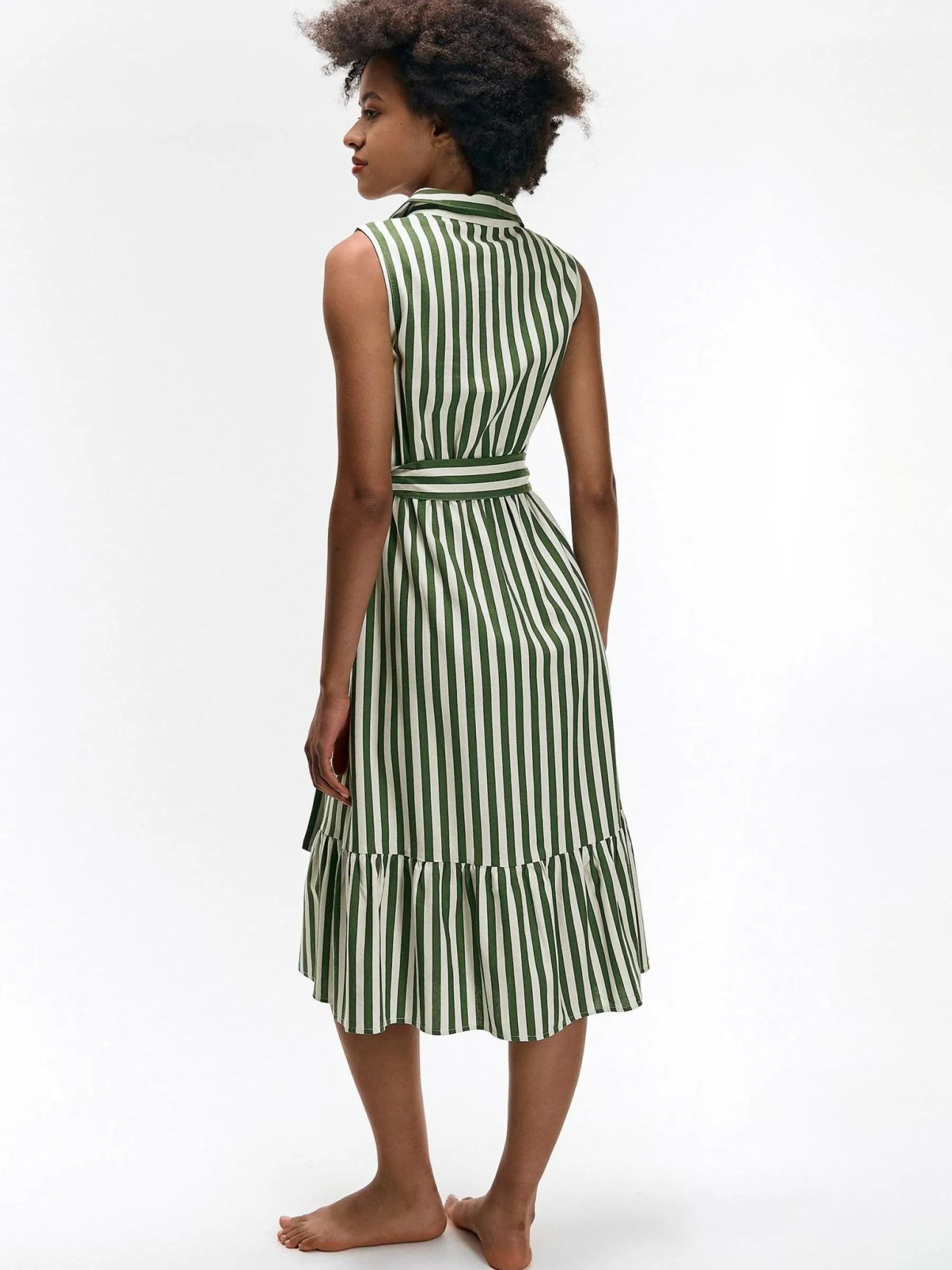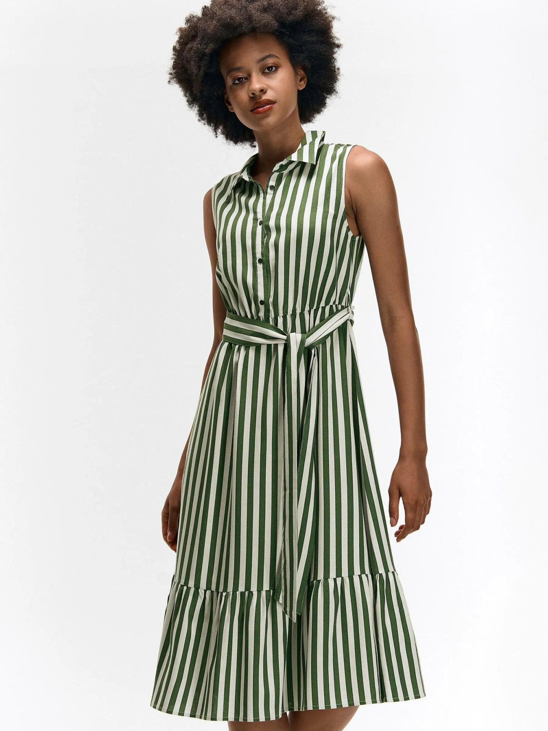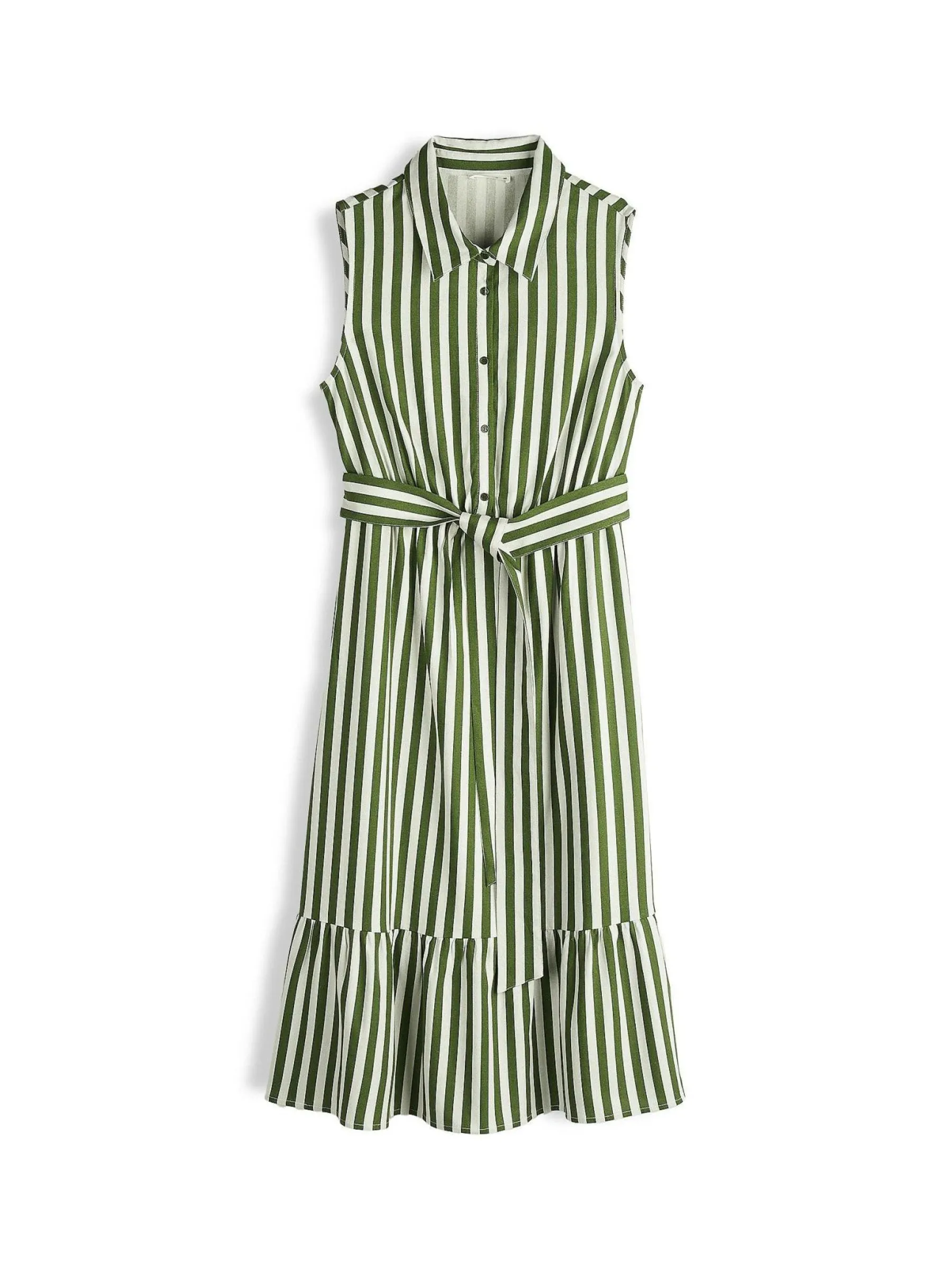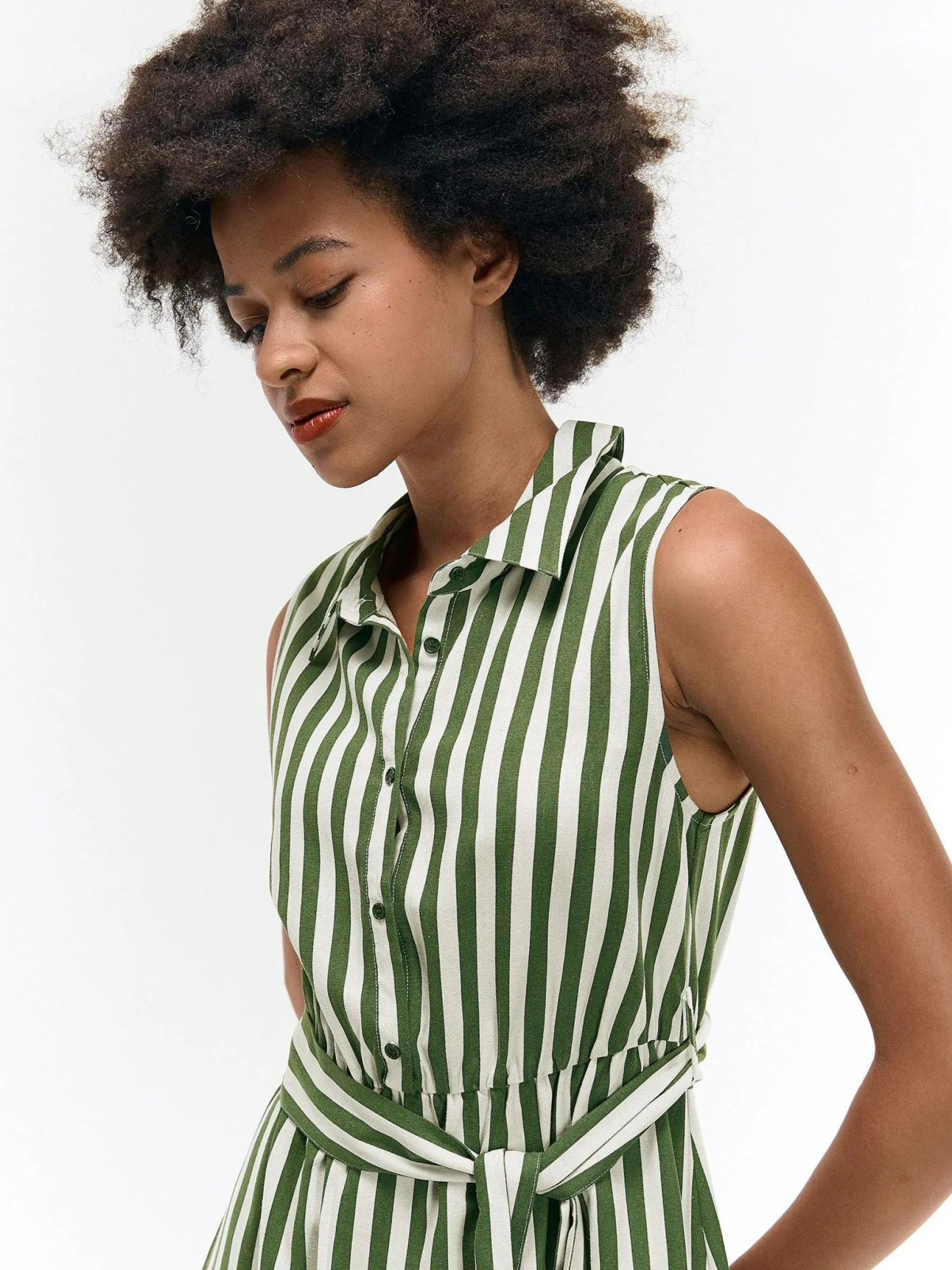 Kolor: zielonyKrój: koszuloweTyp: sukienkaRekaw: bez rękawówDługość: midiPattern style: w prążkiDetal: z paskiem…