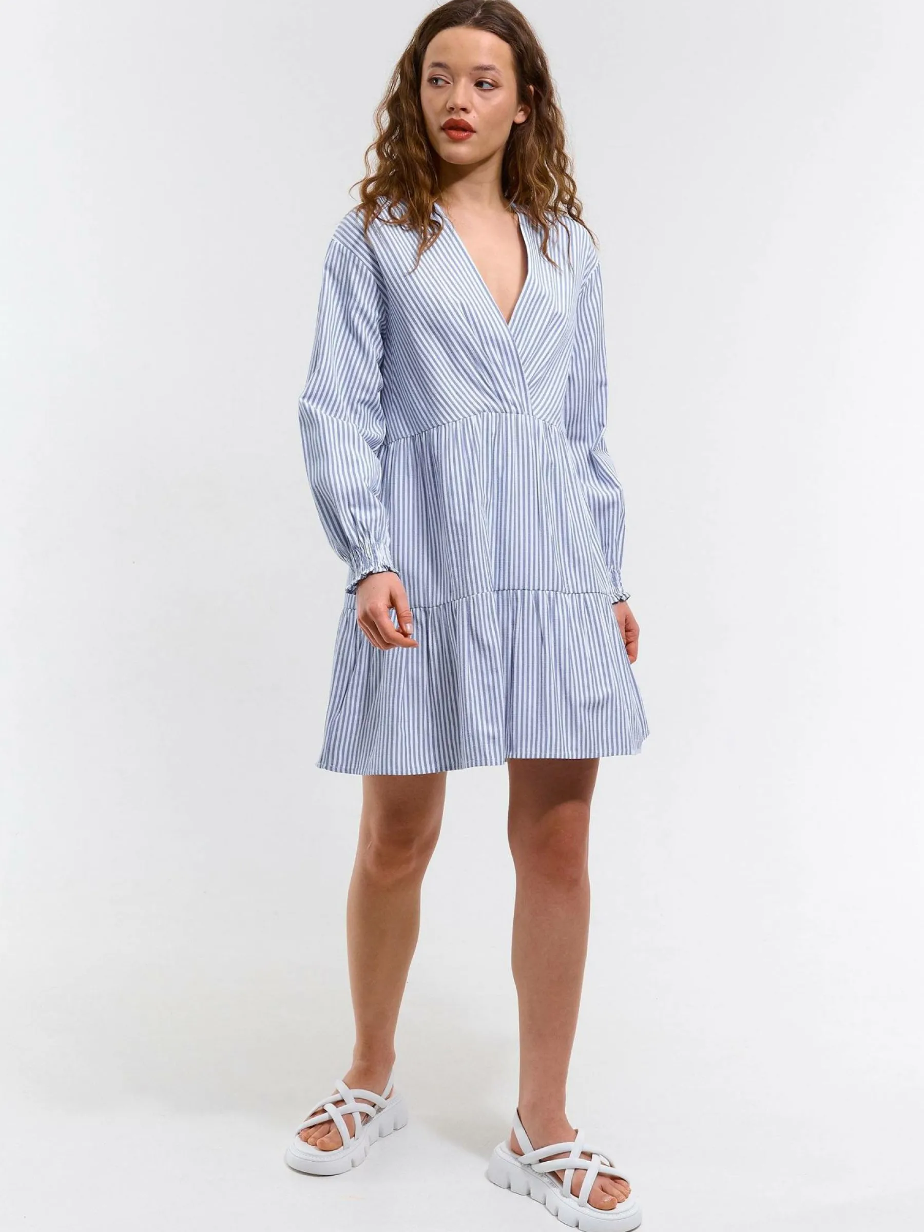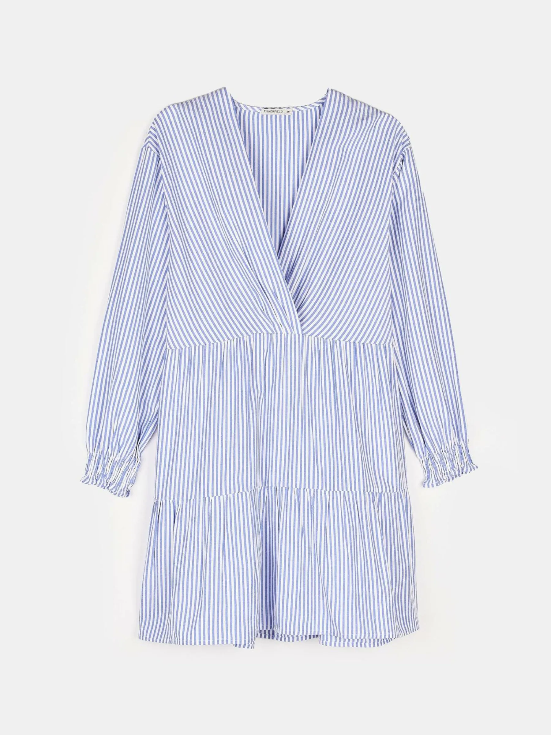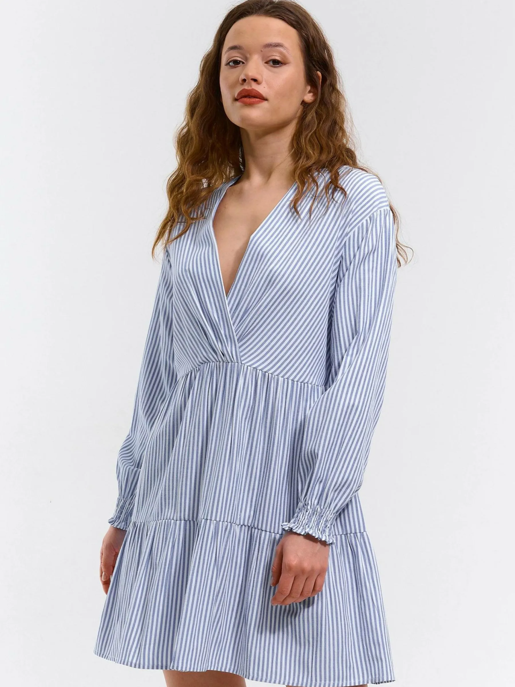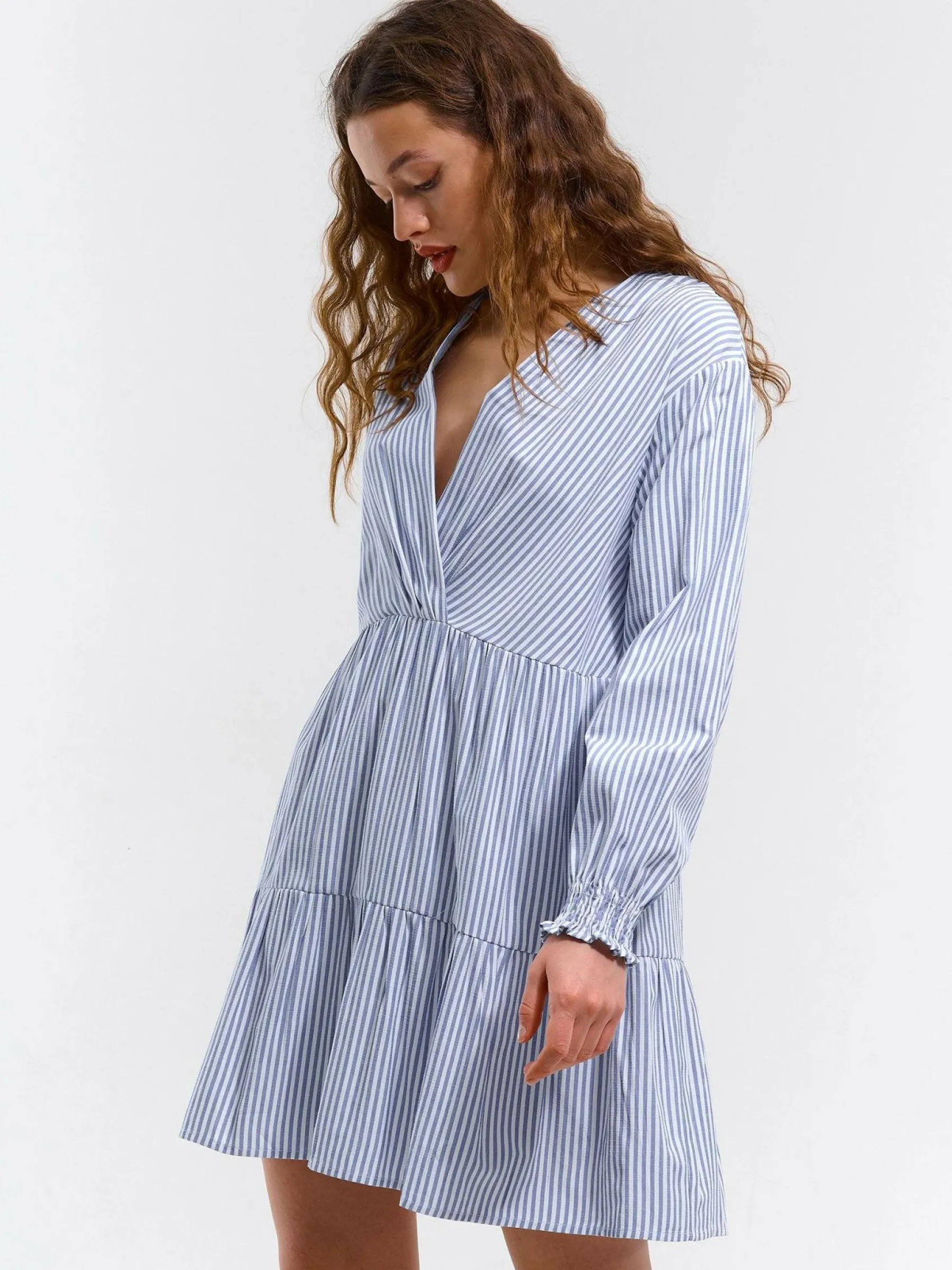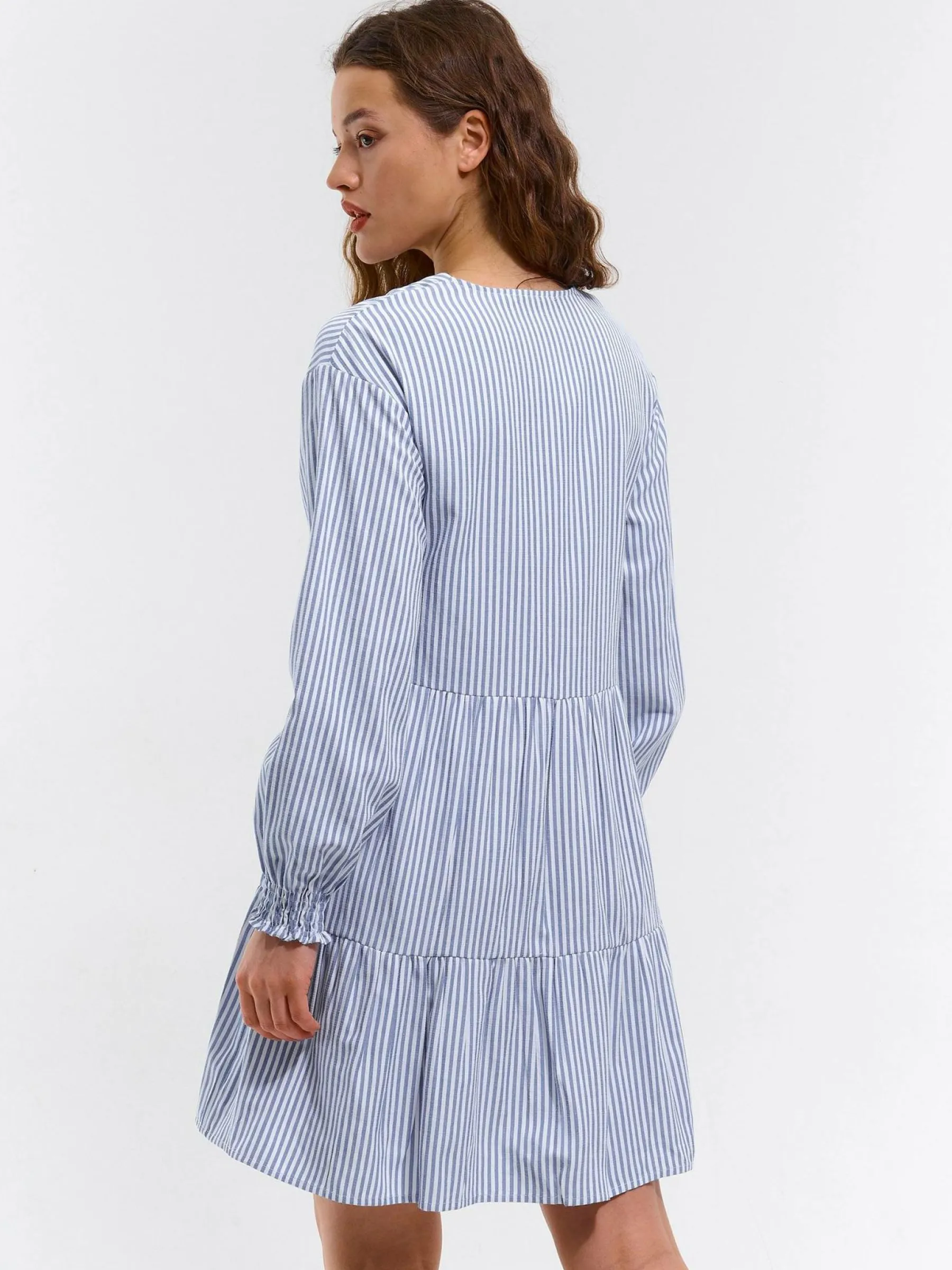 Kolor: niebieskiKrój: z falbaną, kopertówkiTyp: sukienkaRekaw: długi rękawDługość: miniPattern style: w prążki…