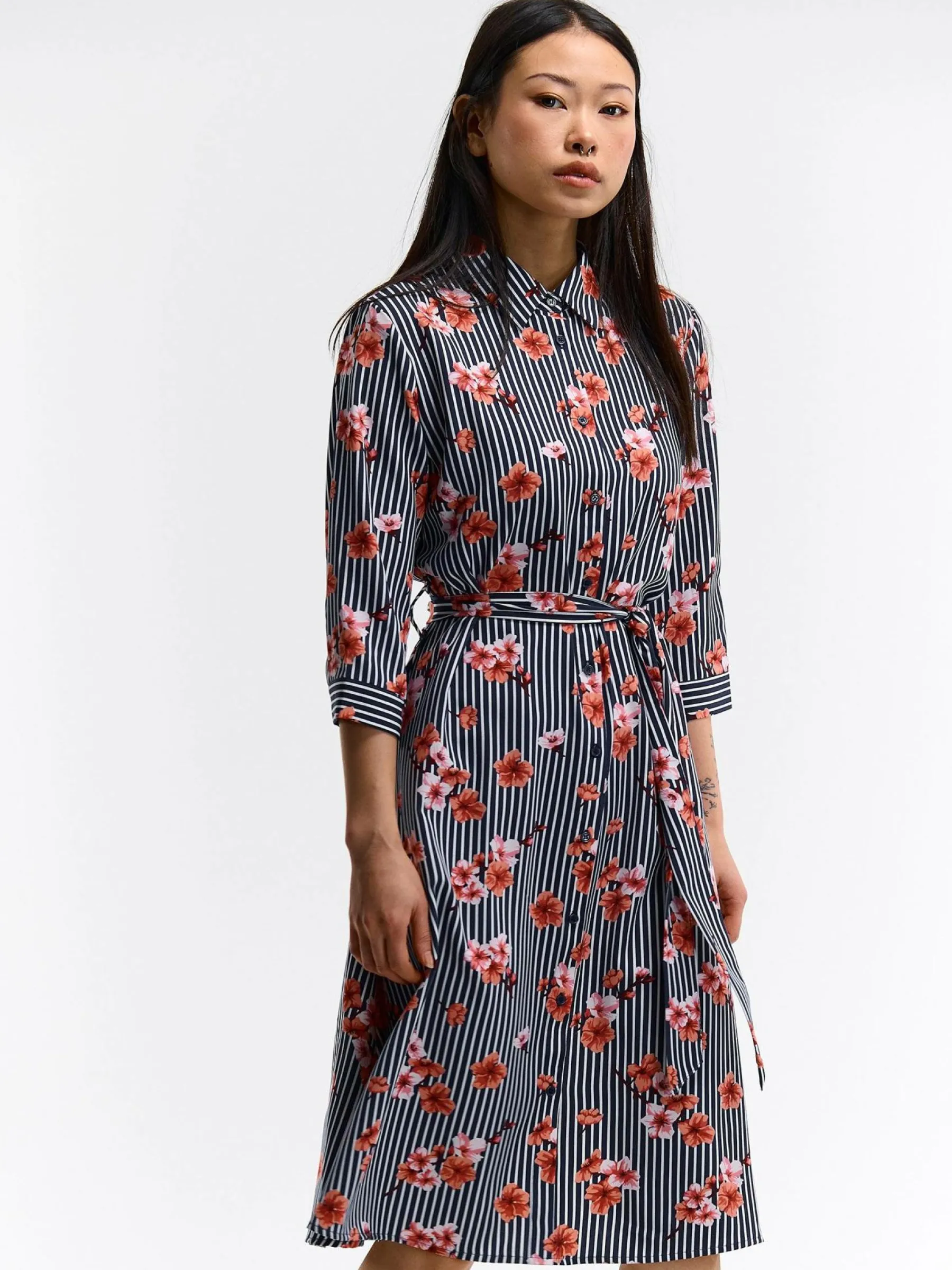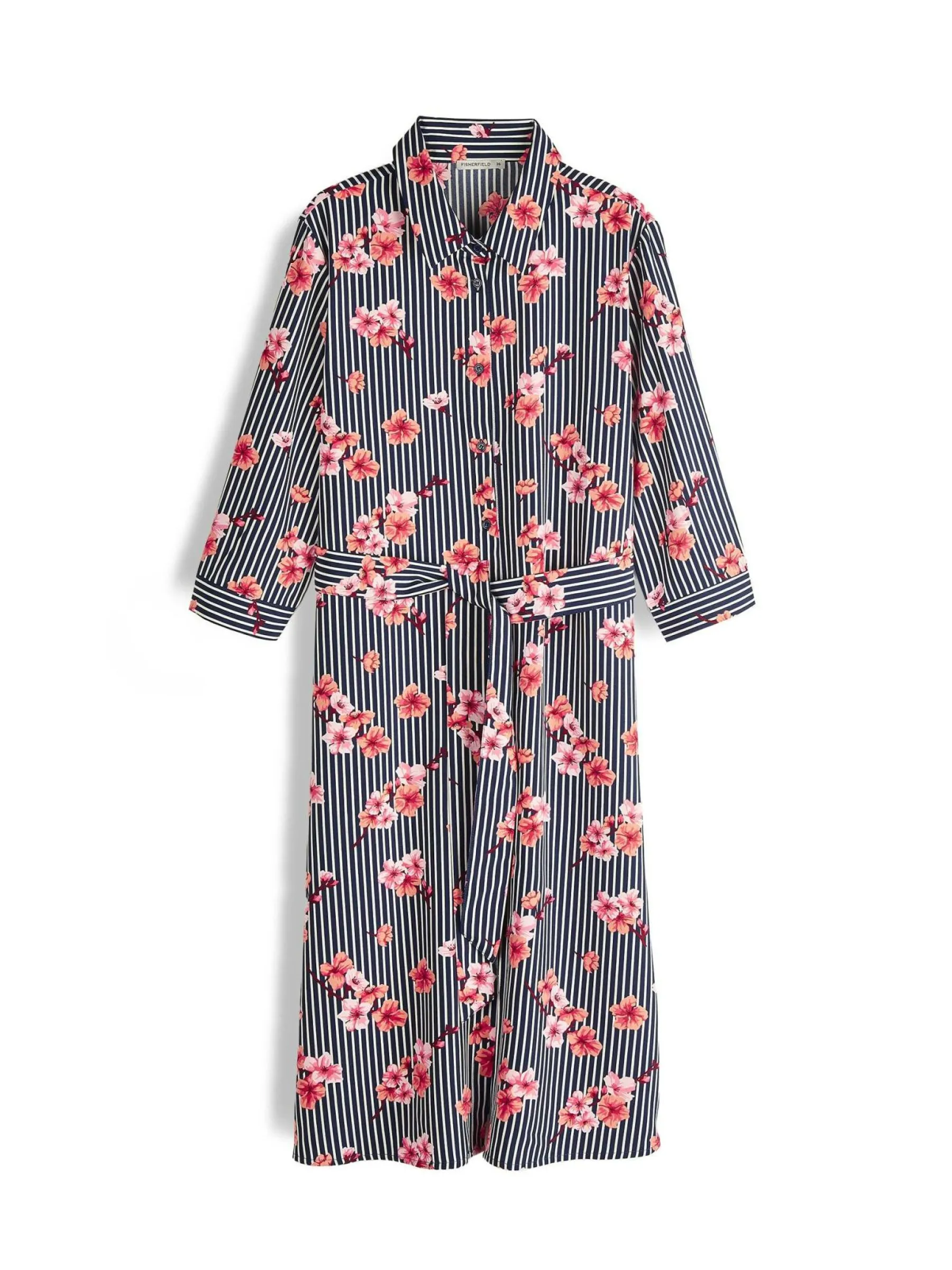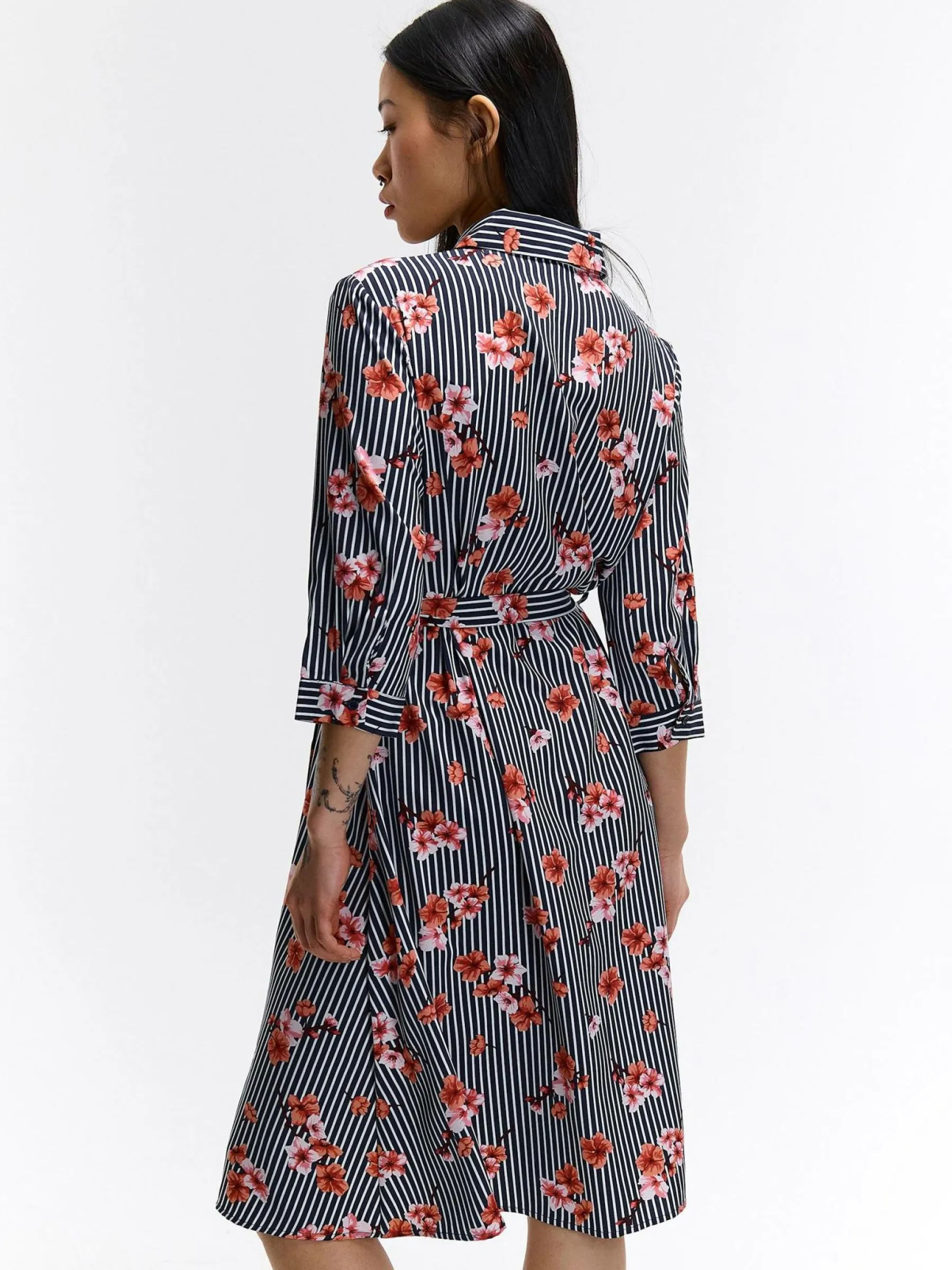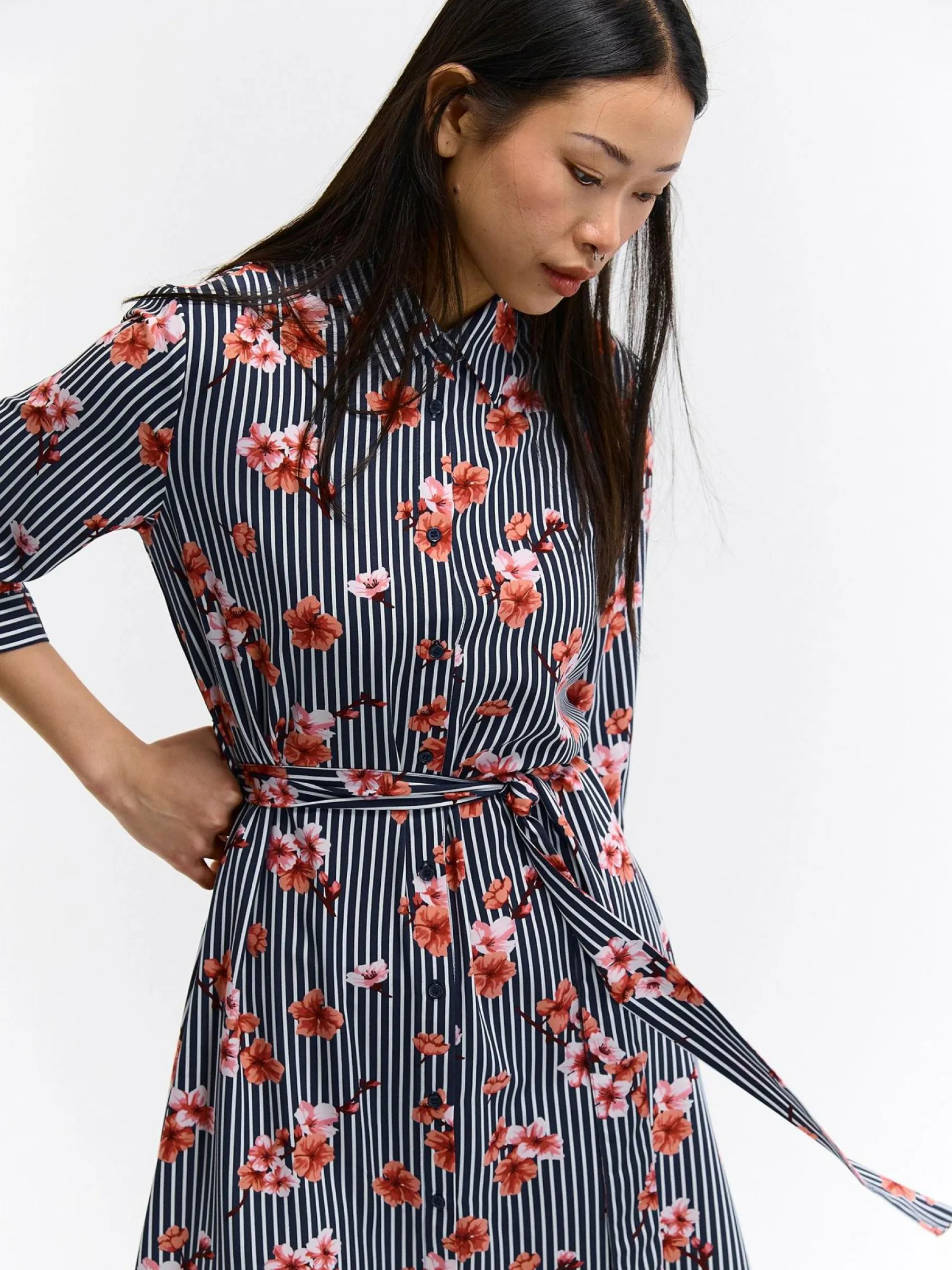 Kolor: granatowyKrój: koszuloweTyp: sukienkaRekaw: rękaw 3/4Długość: midiPattern style: w prążki, kwiatowe, z nad…