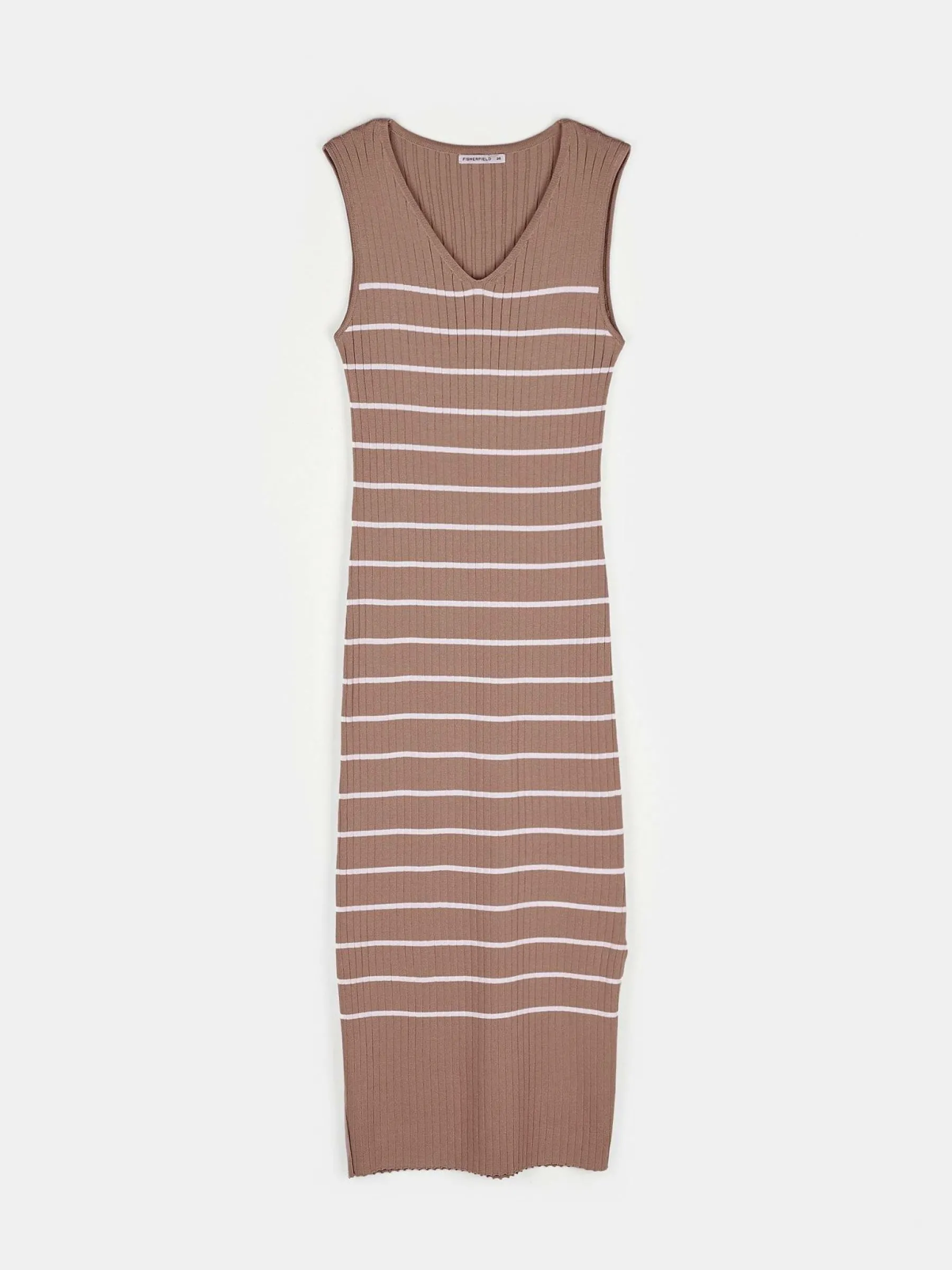 Kolor: beżowyKrój: ołówkoweTyp: sukienkaRekaw: bez rękawówDługość: midiPattern style: w prążkiDetal: nad gło…