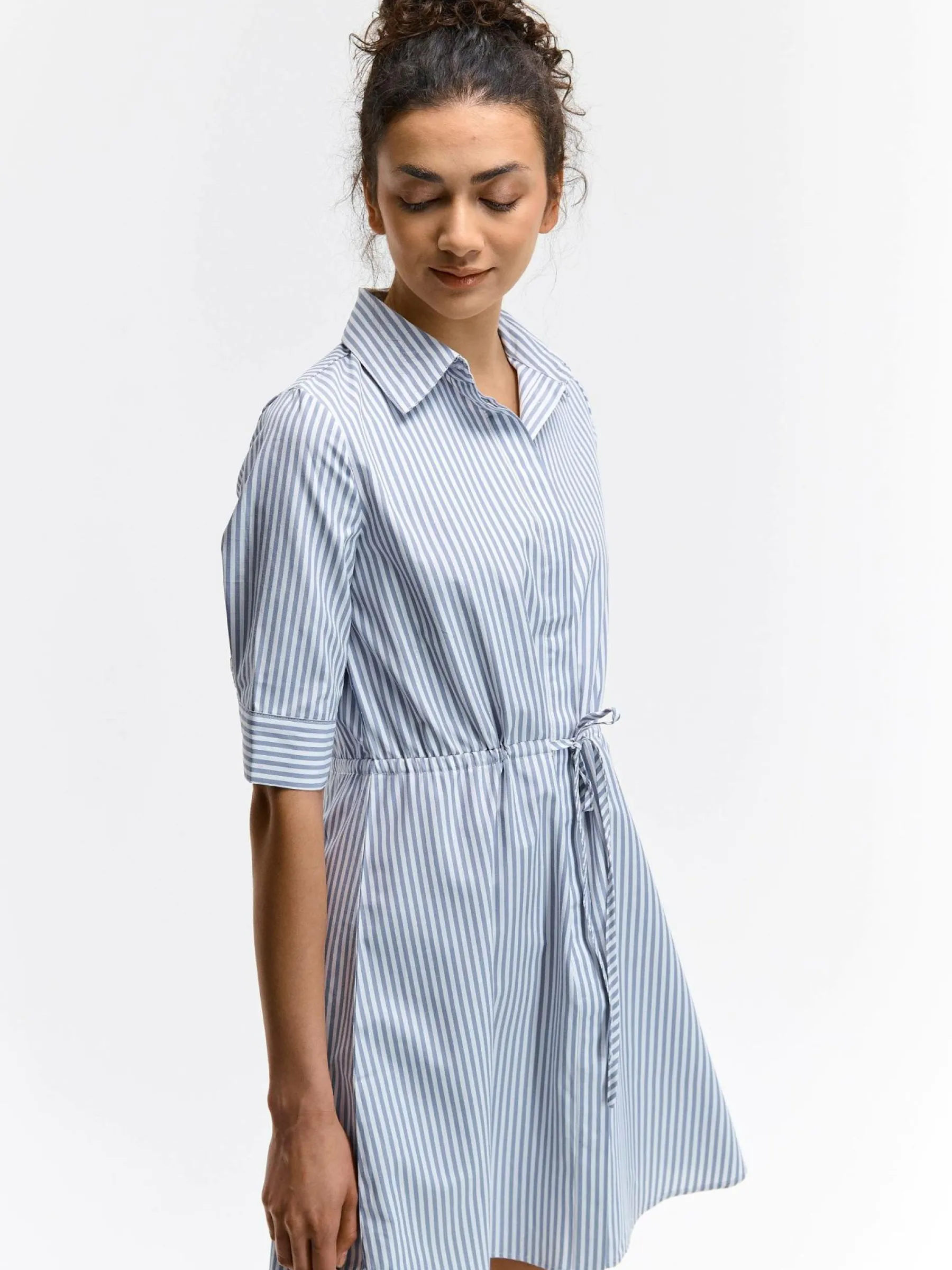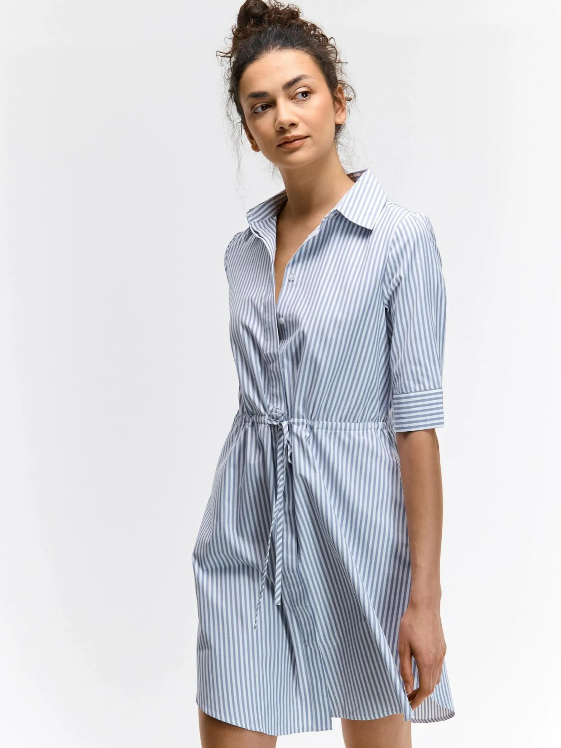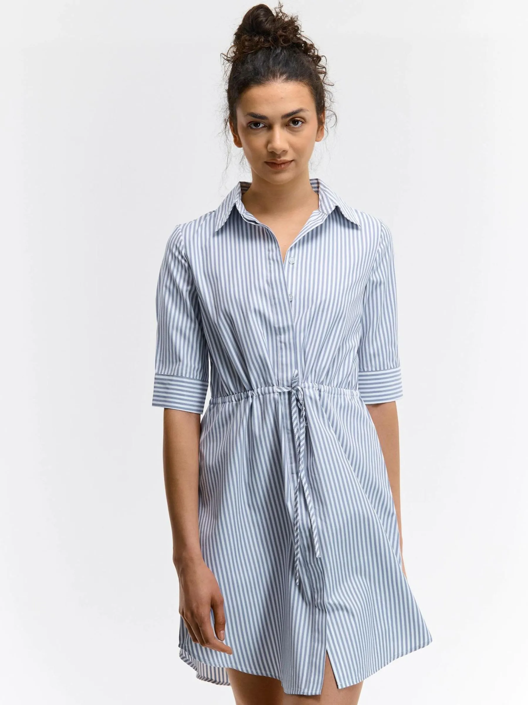 Kolor: niebieskiKrój: koszuloweTyp: sukienkaRekaw: krótki rękawDługość: miniPattern style: w prążkiDetal: ze szn…