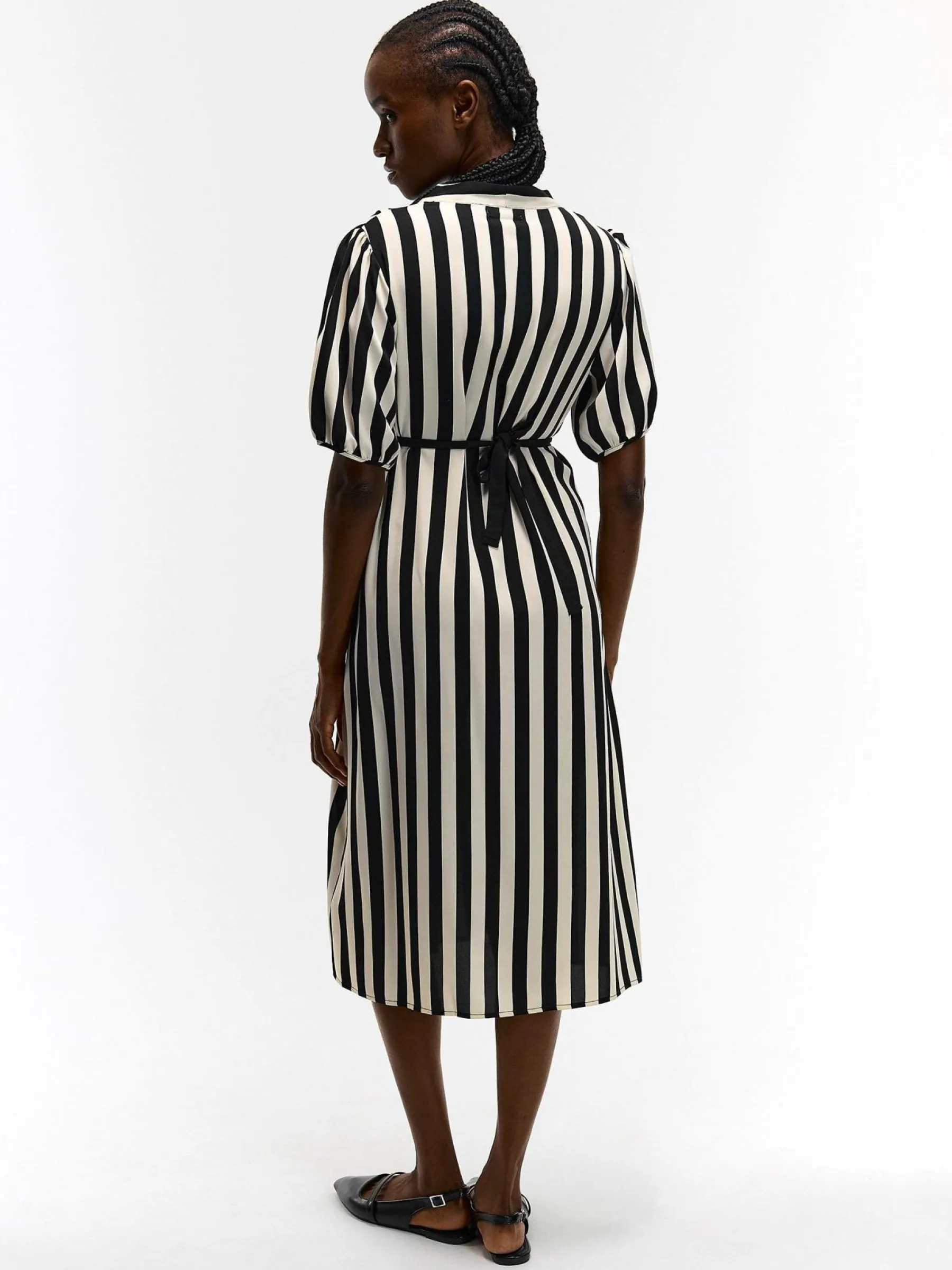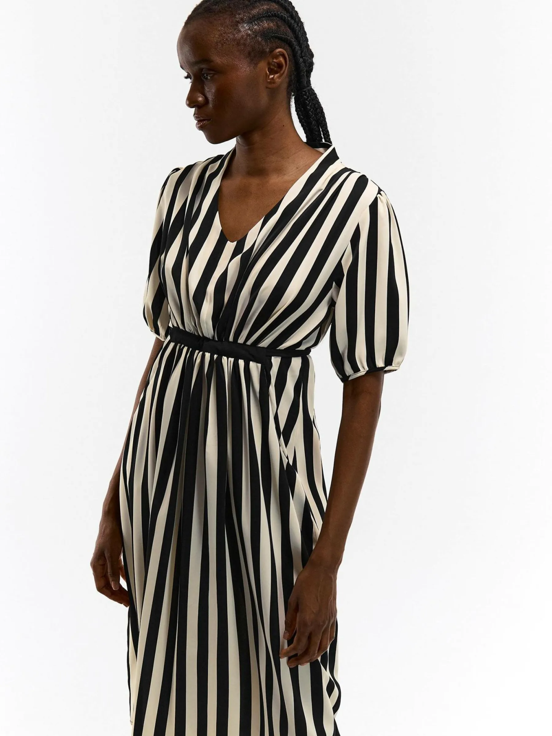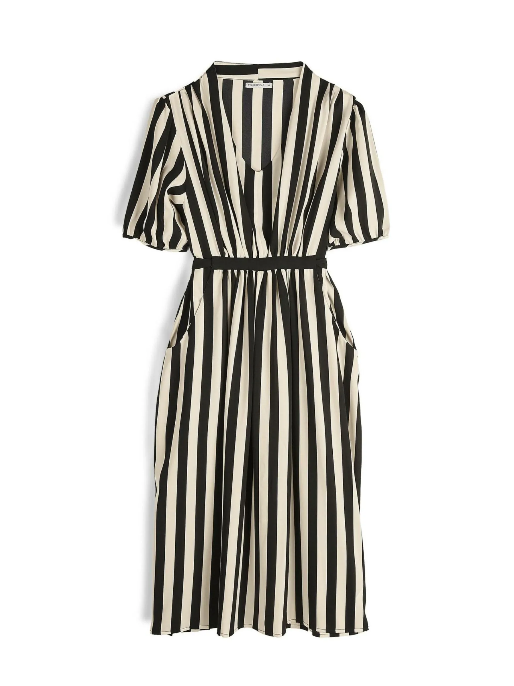 Kolor: beżowyKrój: asyTyp: sukienkaRekaw: krótki rękawDługość: midiPattern style: w prążkiDetal: z paskiem, z k…