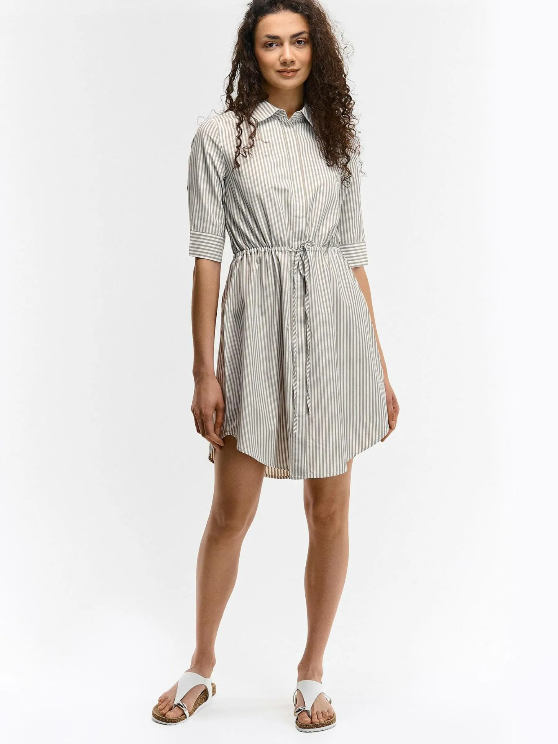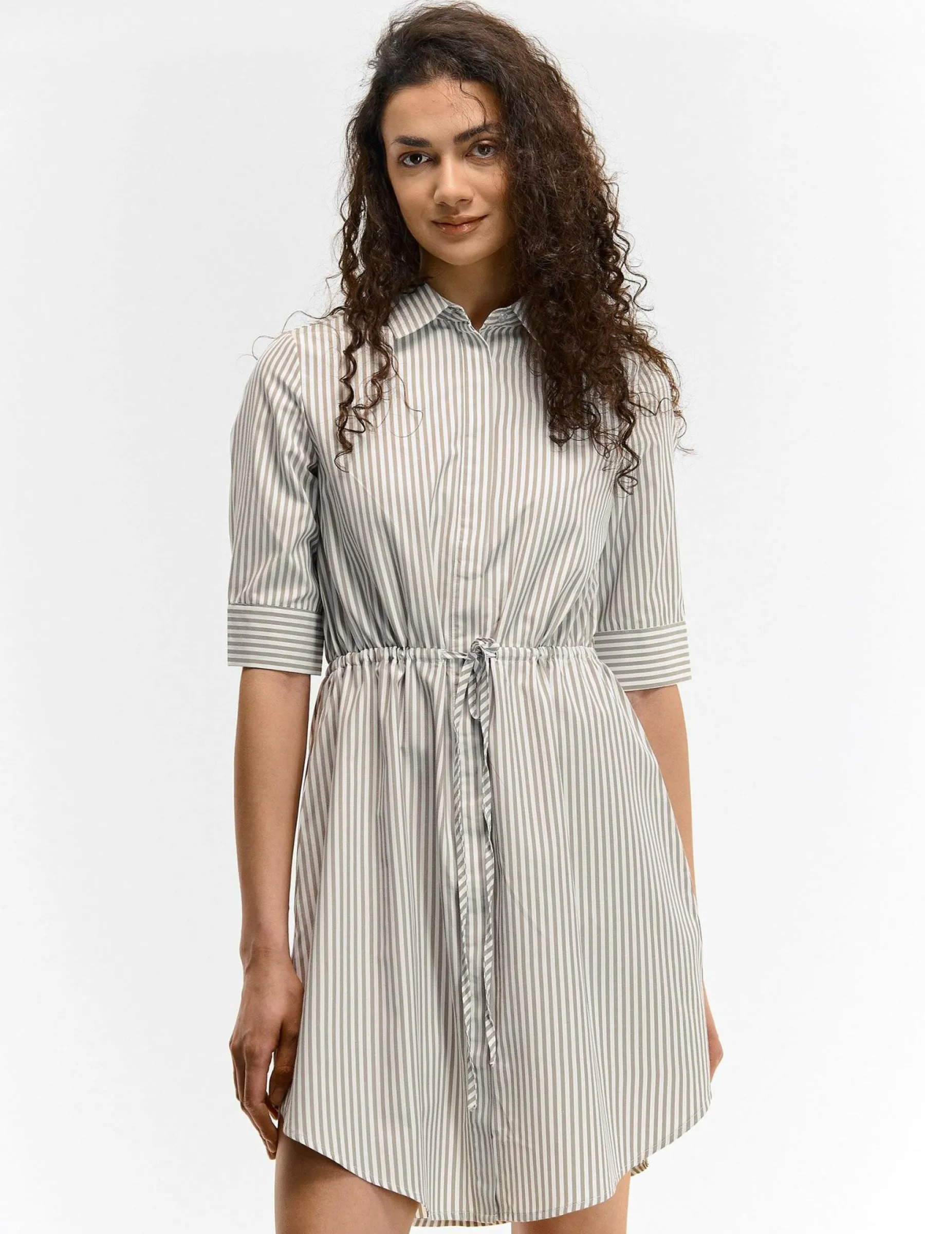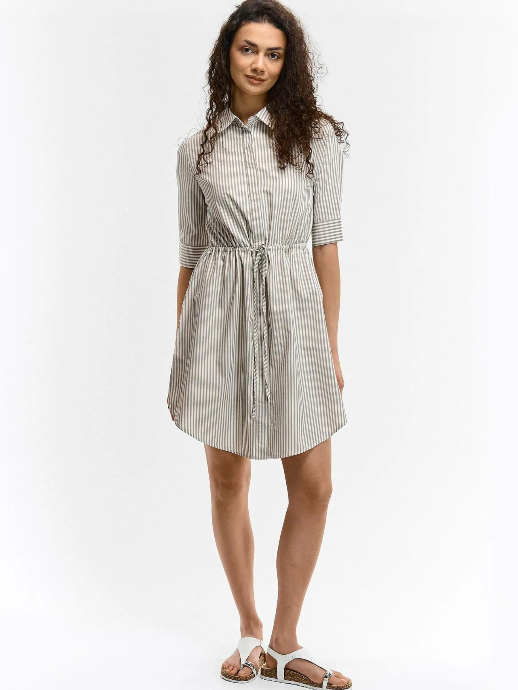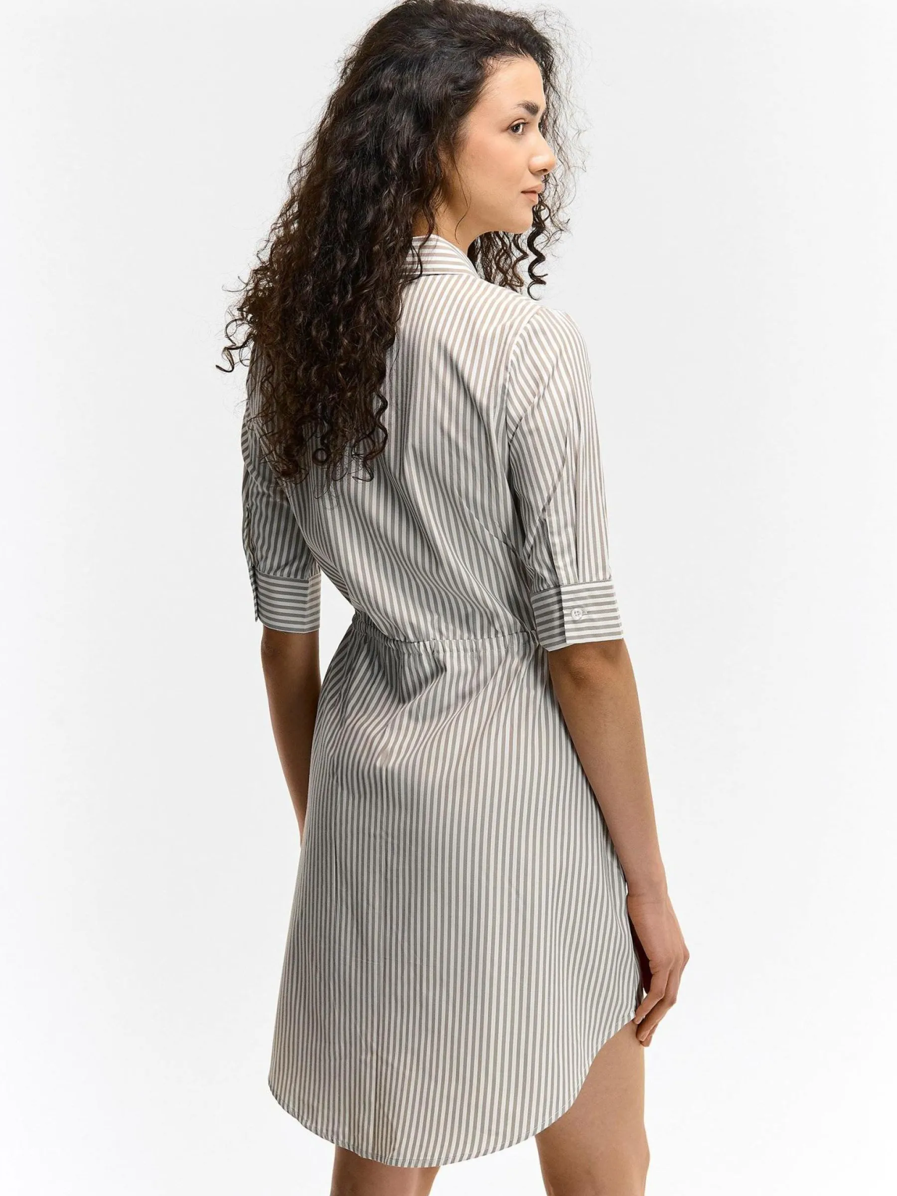 Kolor: beżowyKrój: koszuloweTyp: sukienkaRekaw: rękaw 3/4Długość: miniPattern style: w prążkiDetal: nad głowąM…
