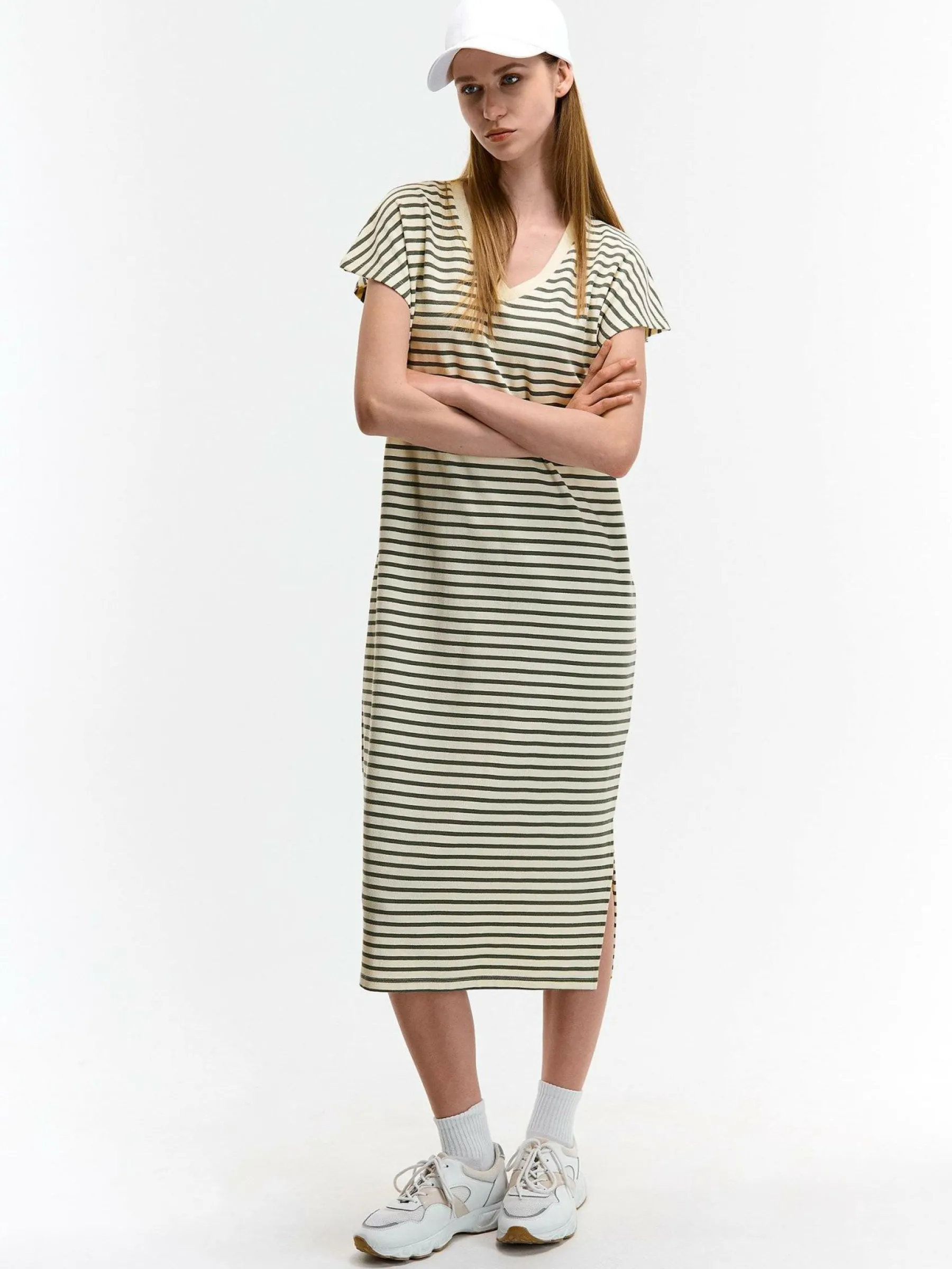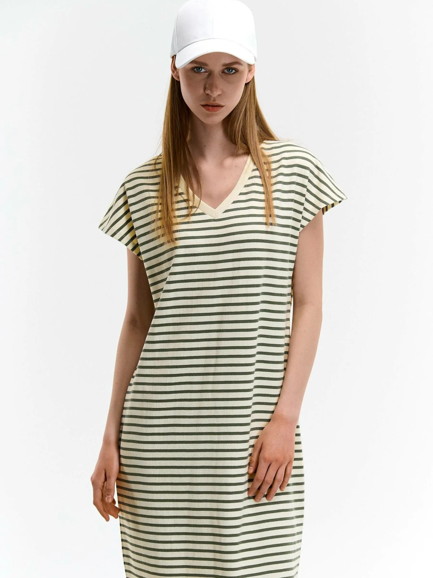 Kolor: beżowyKrój: regularTyp: sukienkaRekaw: krótki rękawDługość: midiPattern style: w prążkiDetal: v-neck, na…