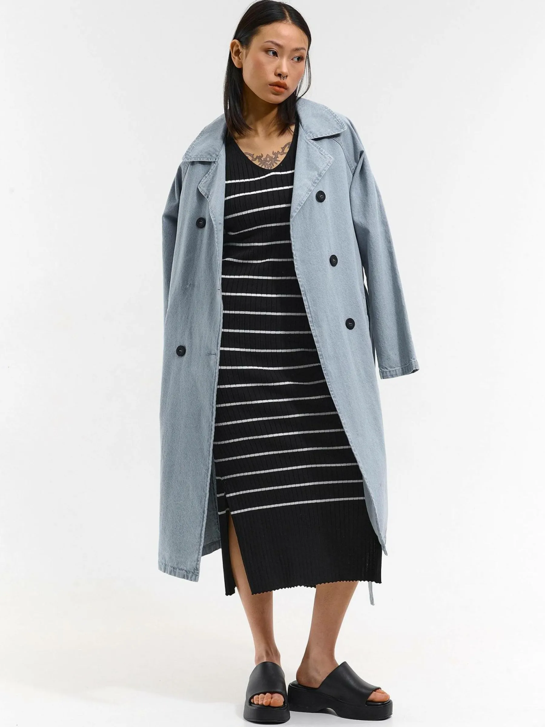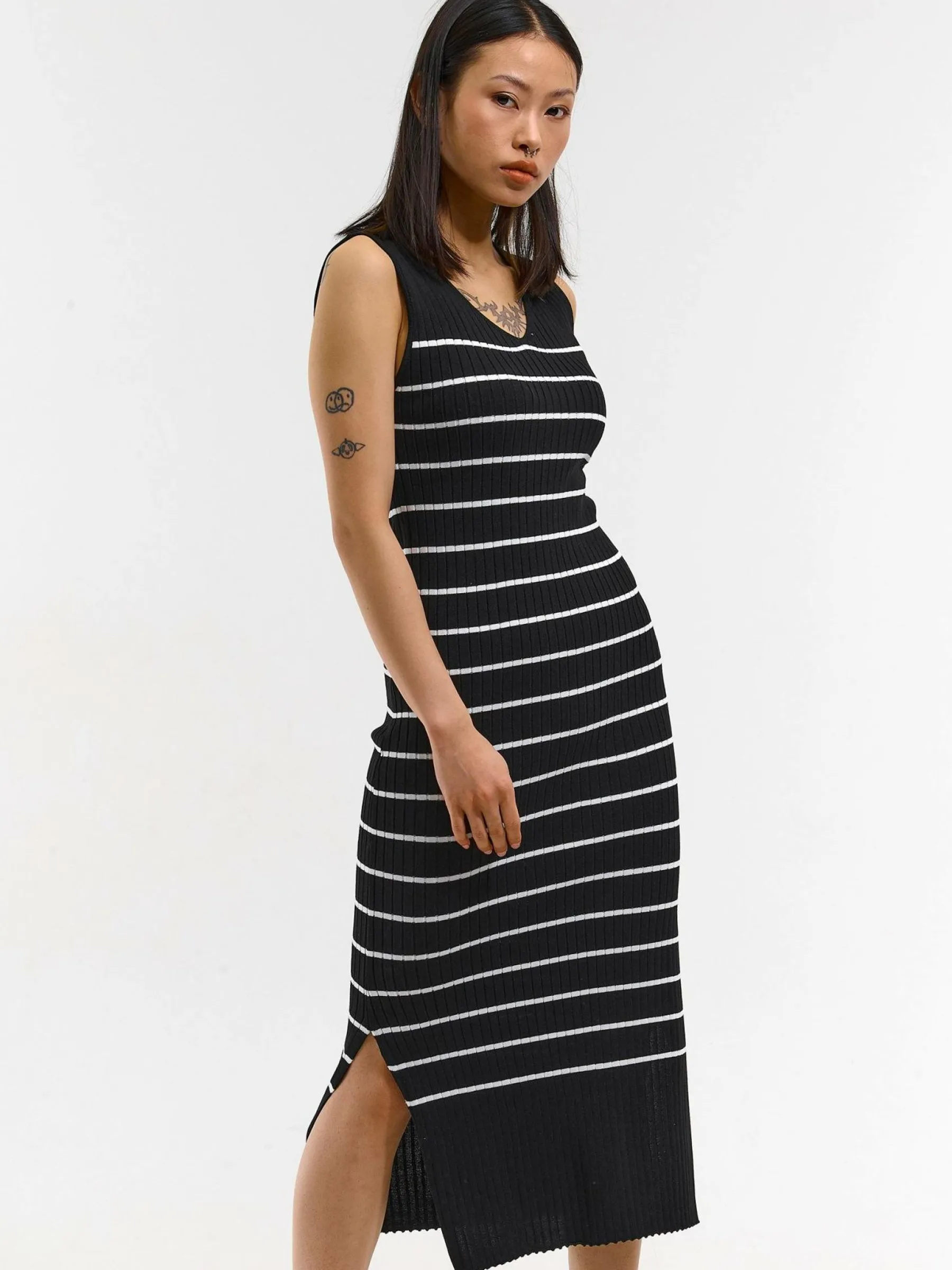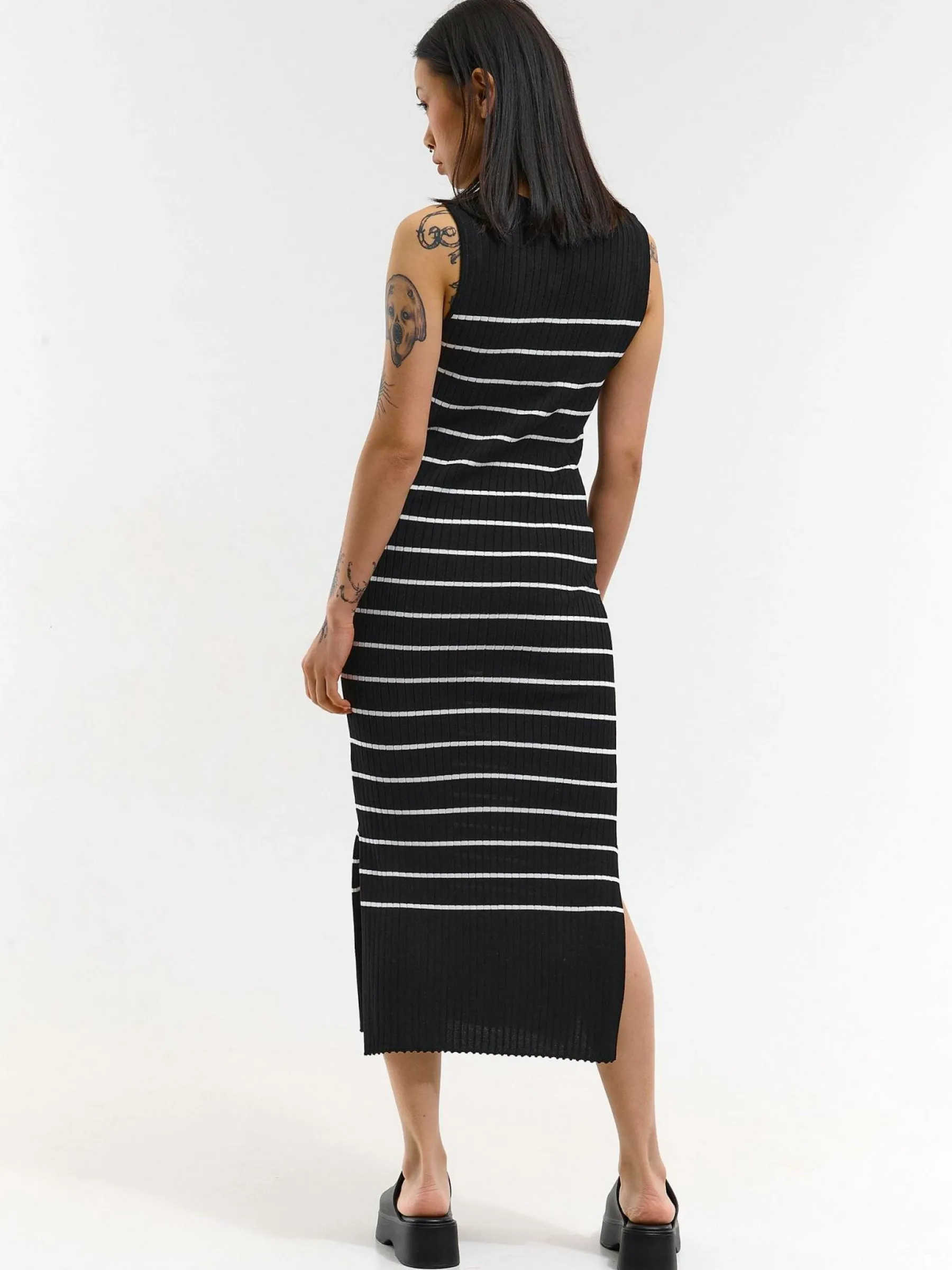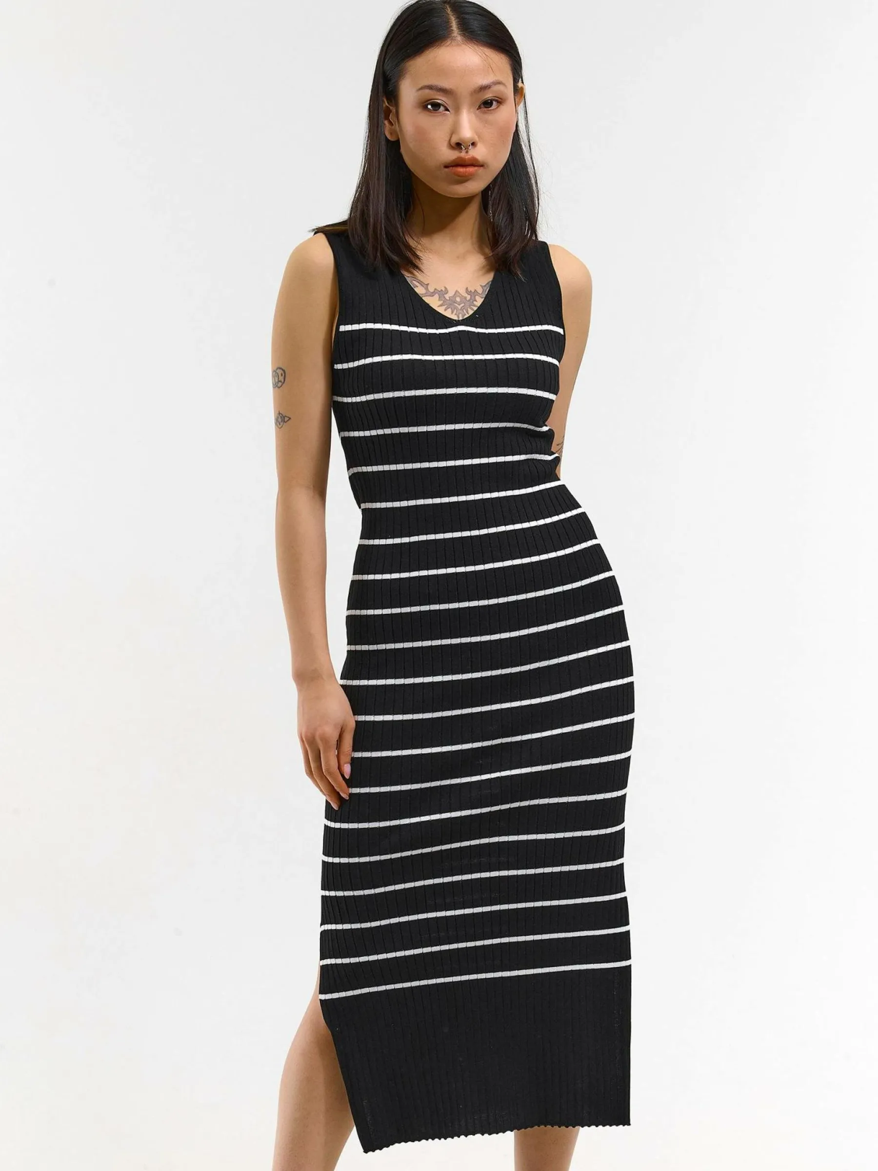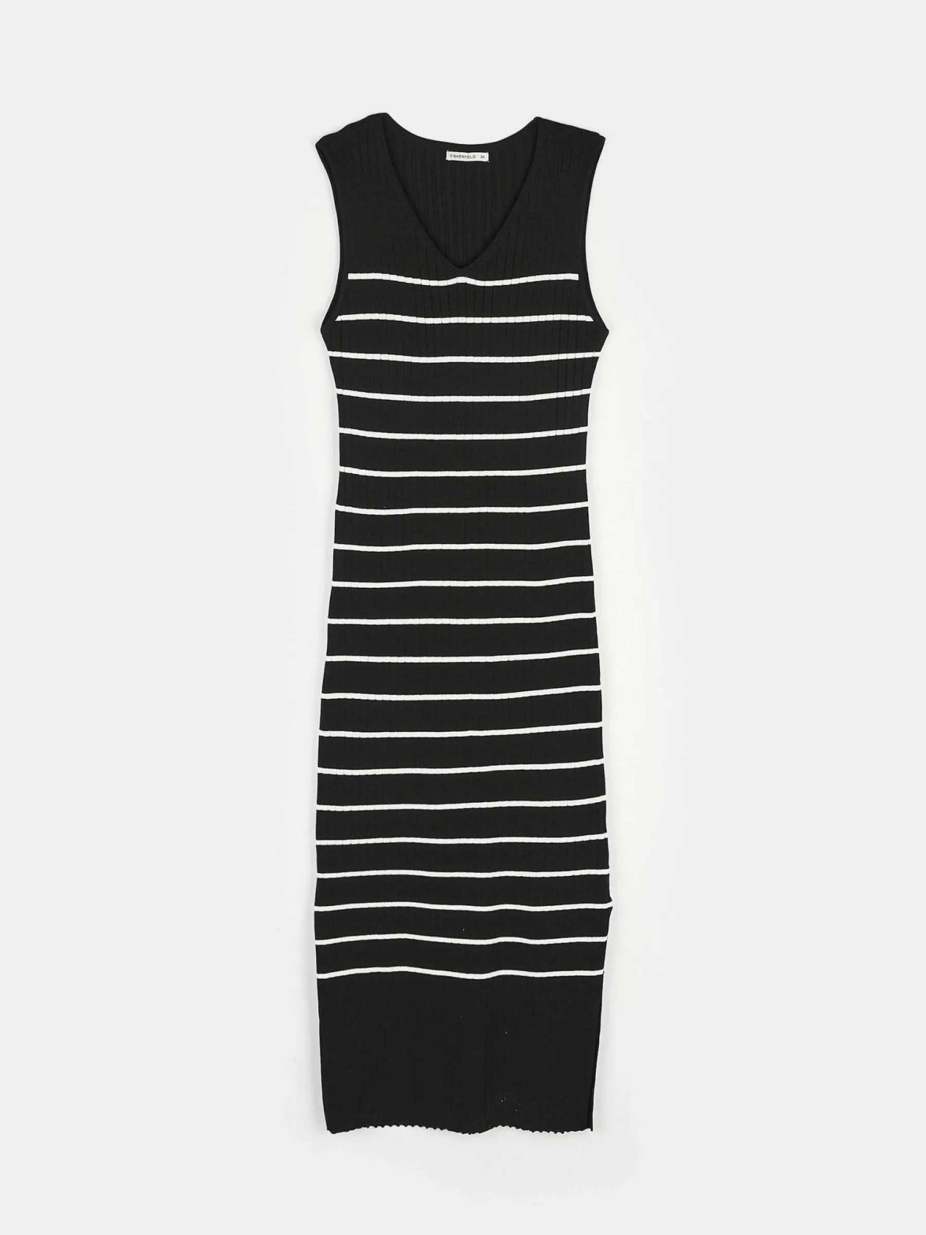 Kolor: czarnyKrój: ołówkoweTyp: sukienkaRekaw: bez rękawówDługość: midiPattern style: w prążkiDetal: z rozcię…