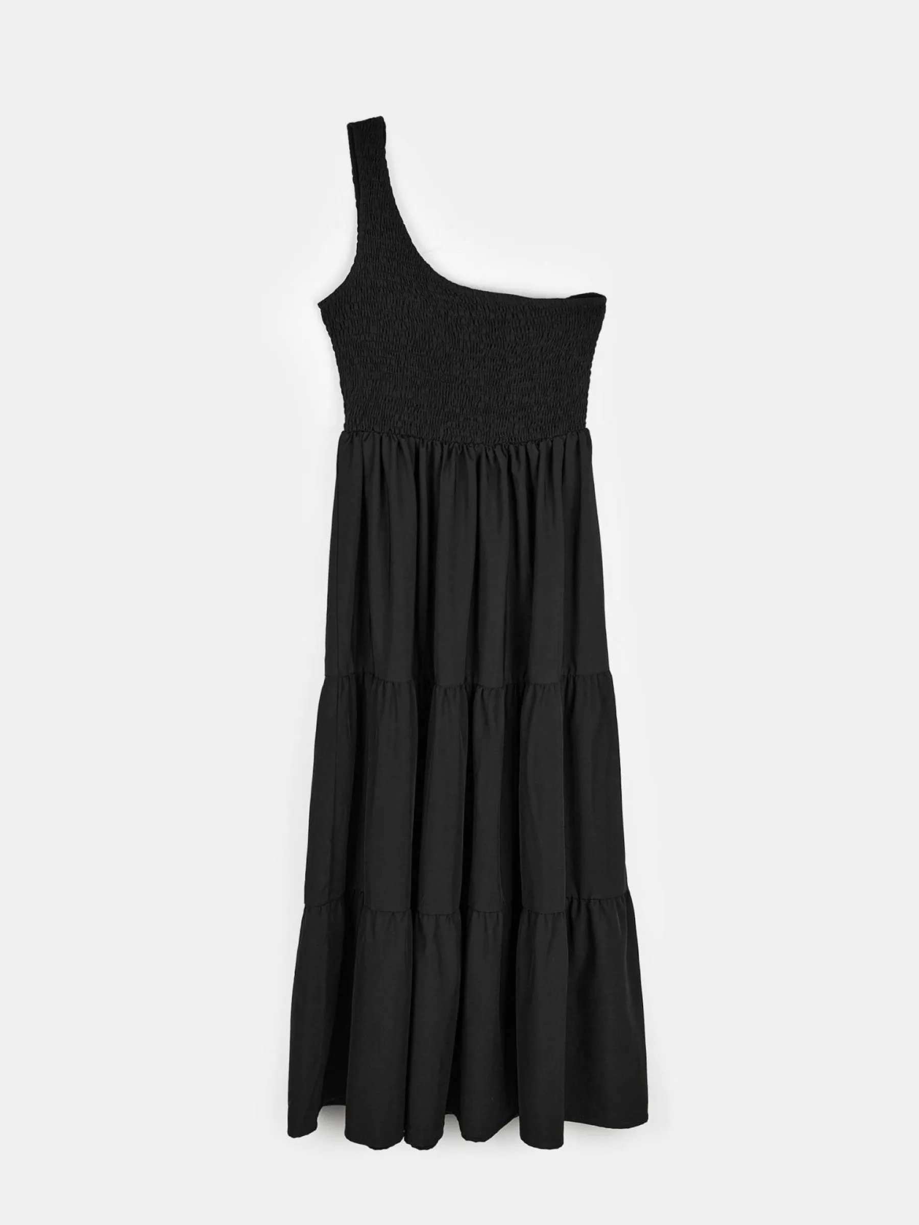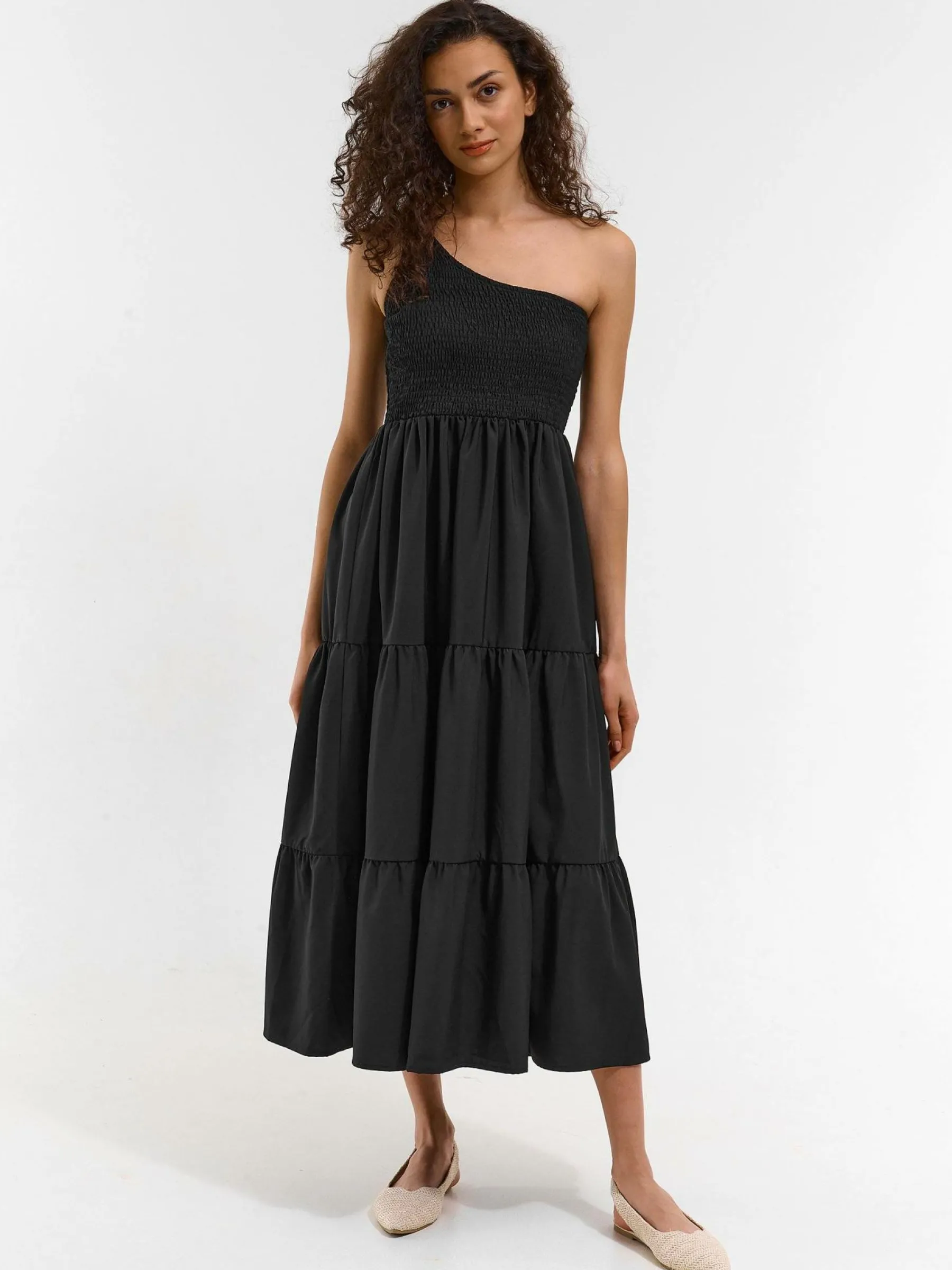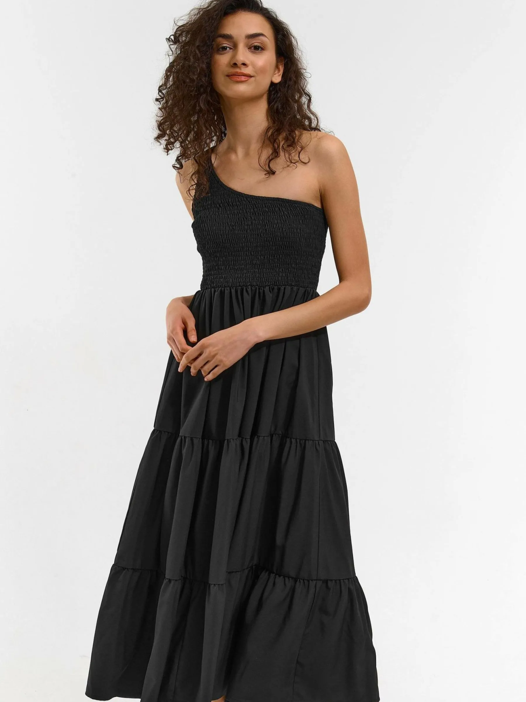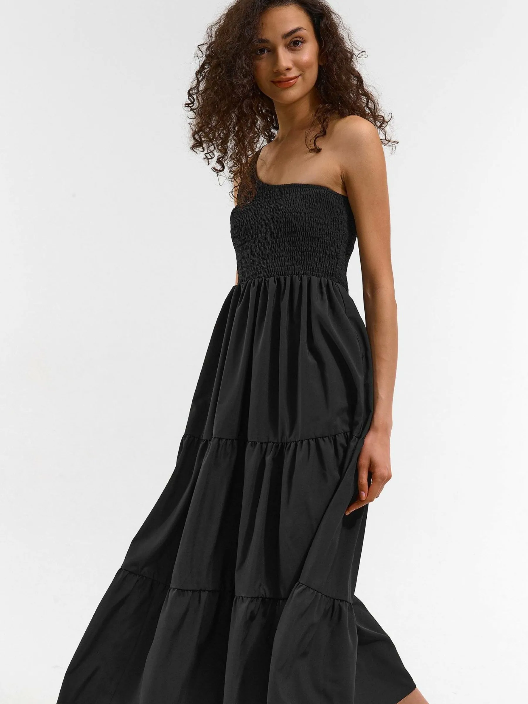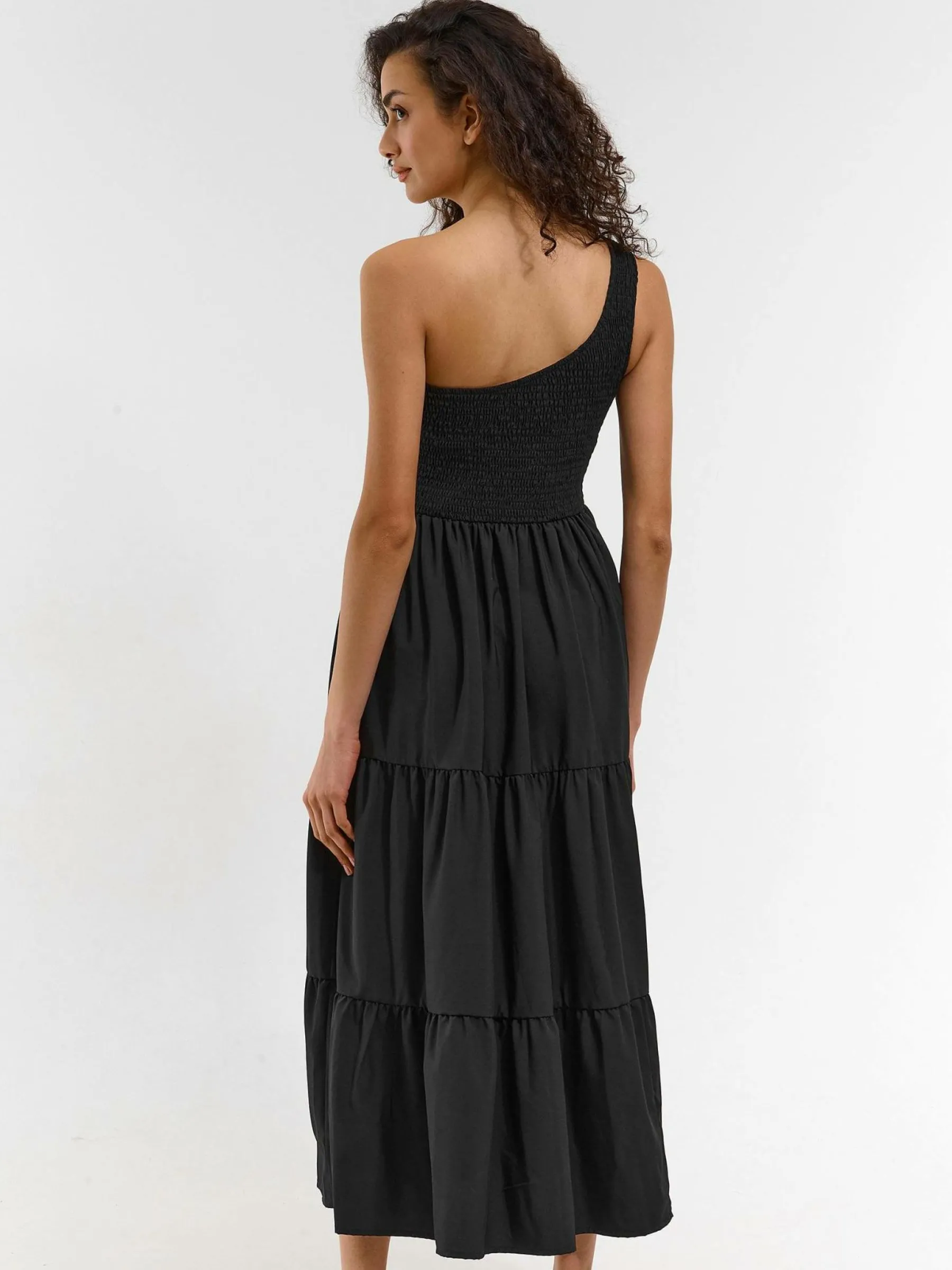 Kolor: czarnyKrój: z falbaną, asymetryczneTyp: sukienkaRekaw: bez rękawówDługość: midiPattern style: pojedynczy k…