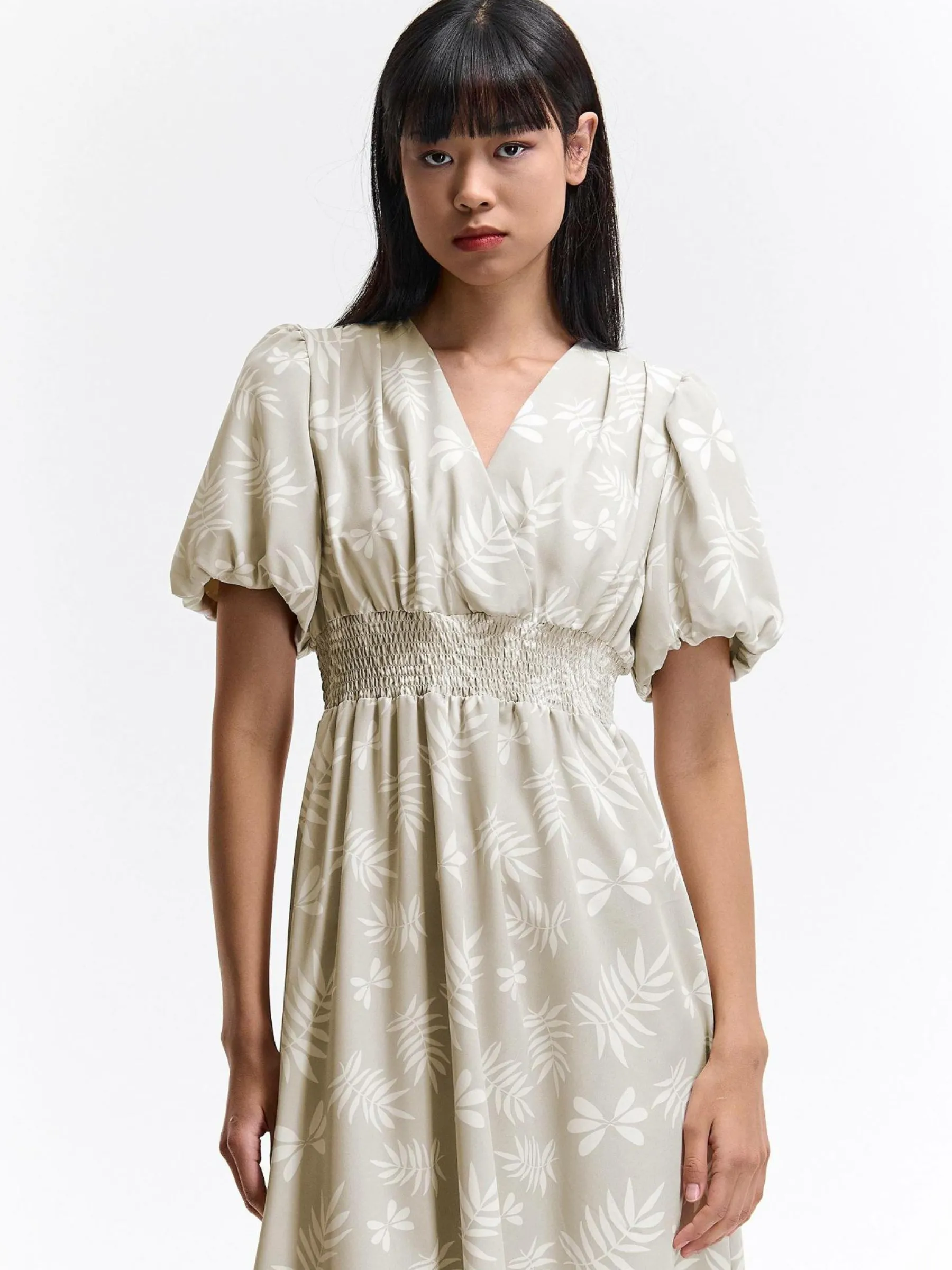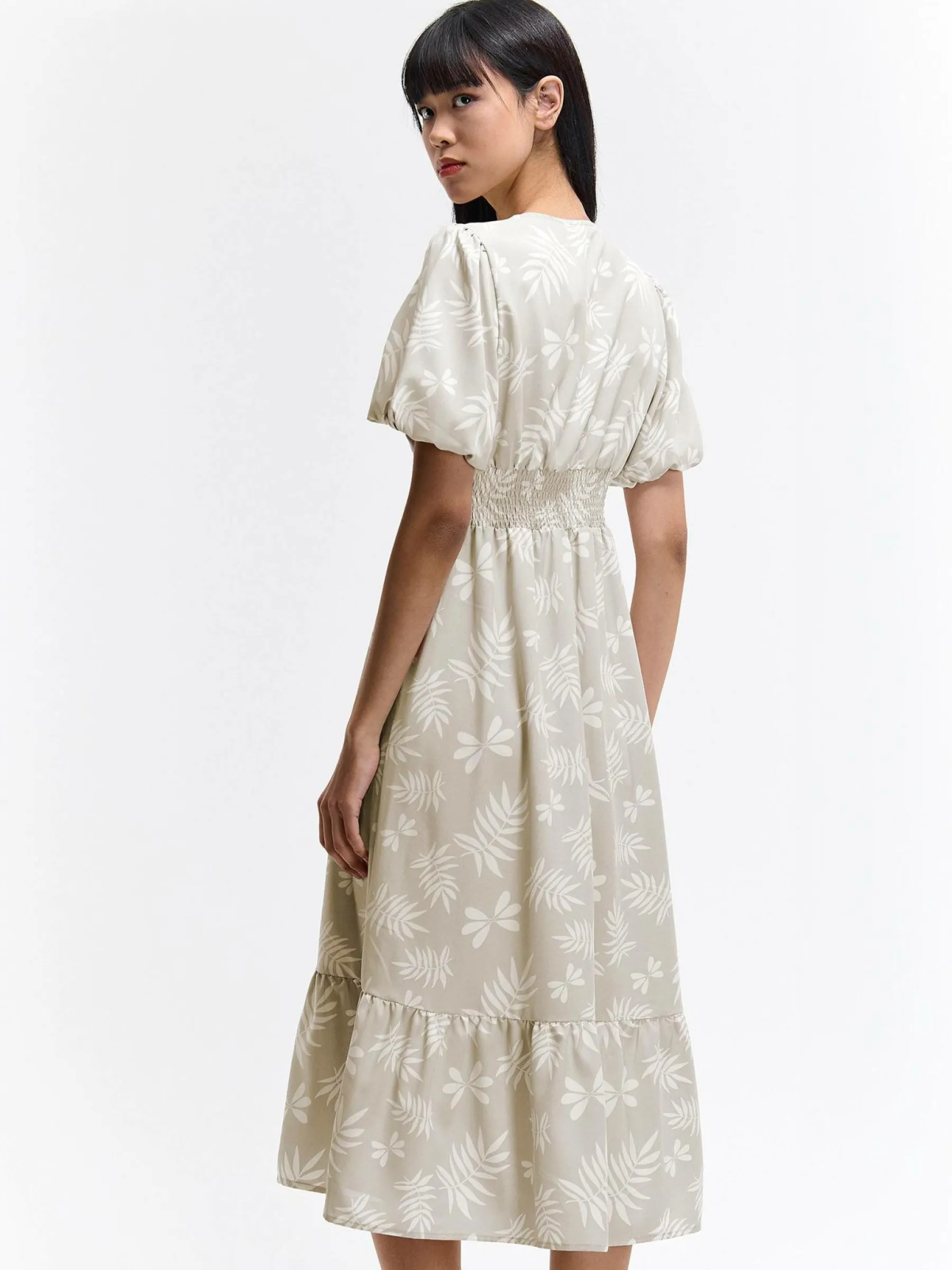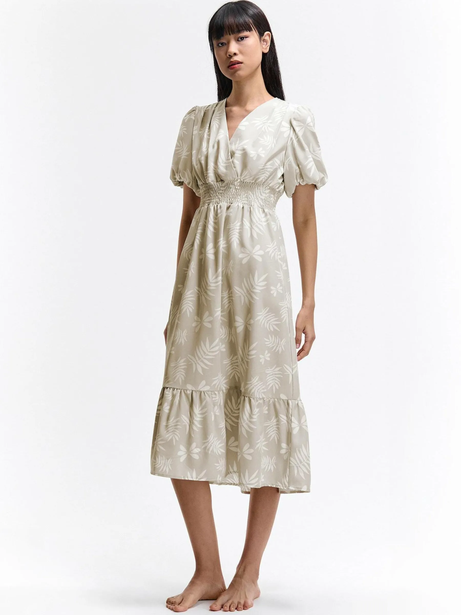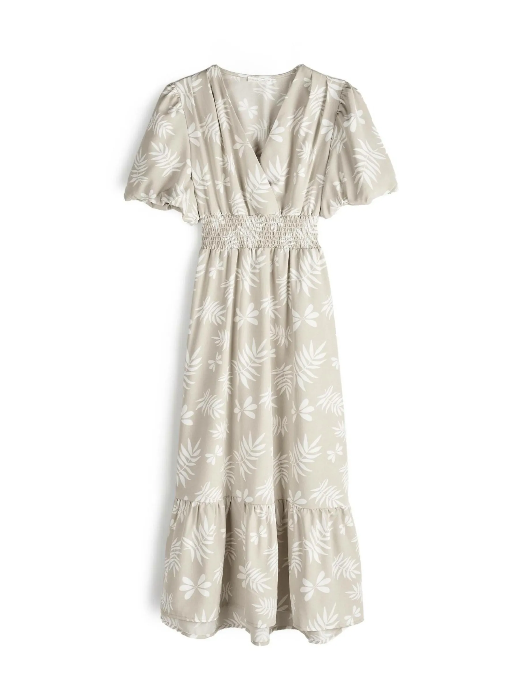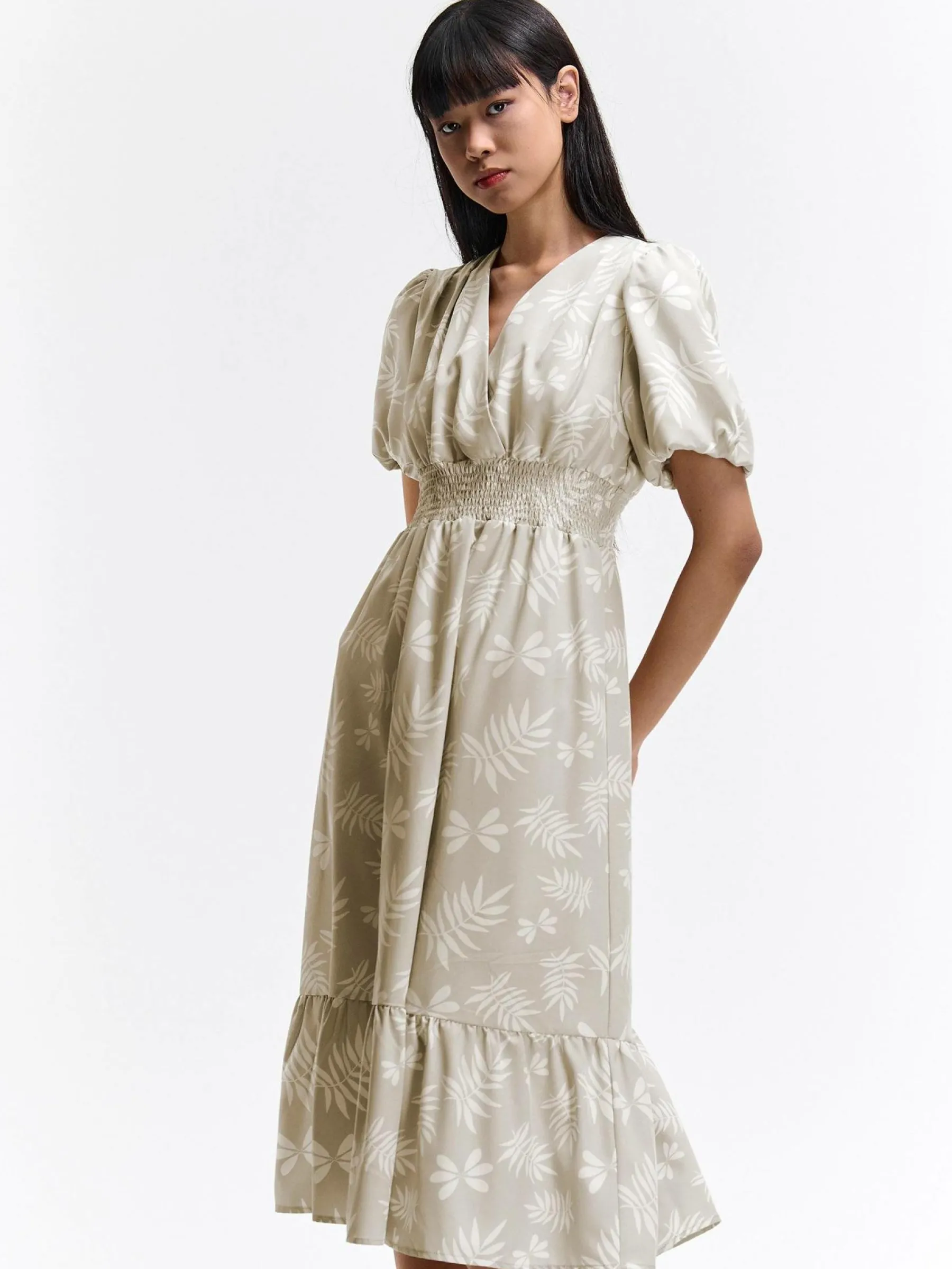 Kolor: beżowyKrój: z falbanąTyp: sukienkaRekaw: krótki rękawDługość: midiPattern style: z nadrukiem, kwiatoweDet…