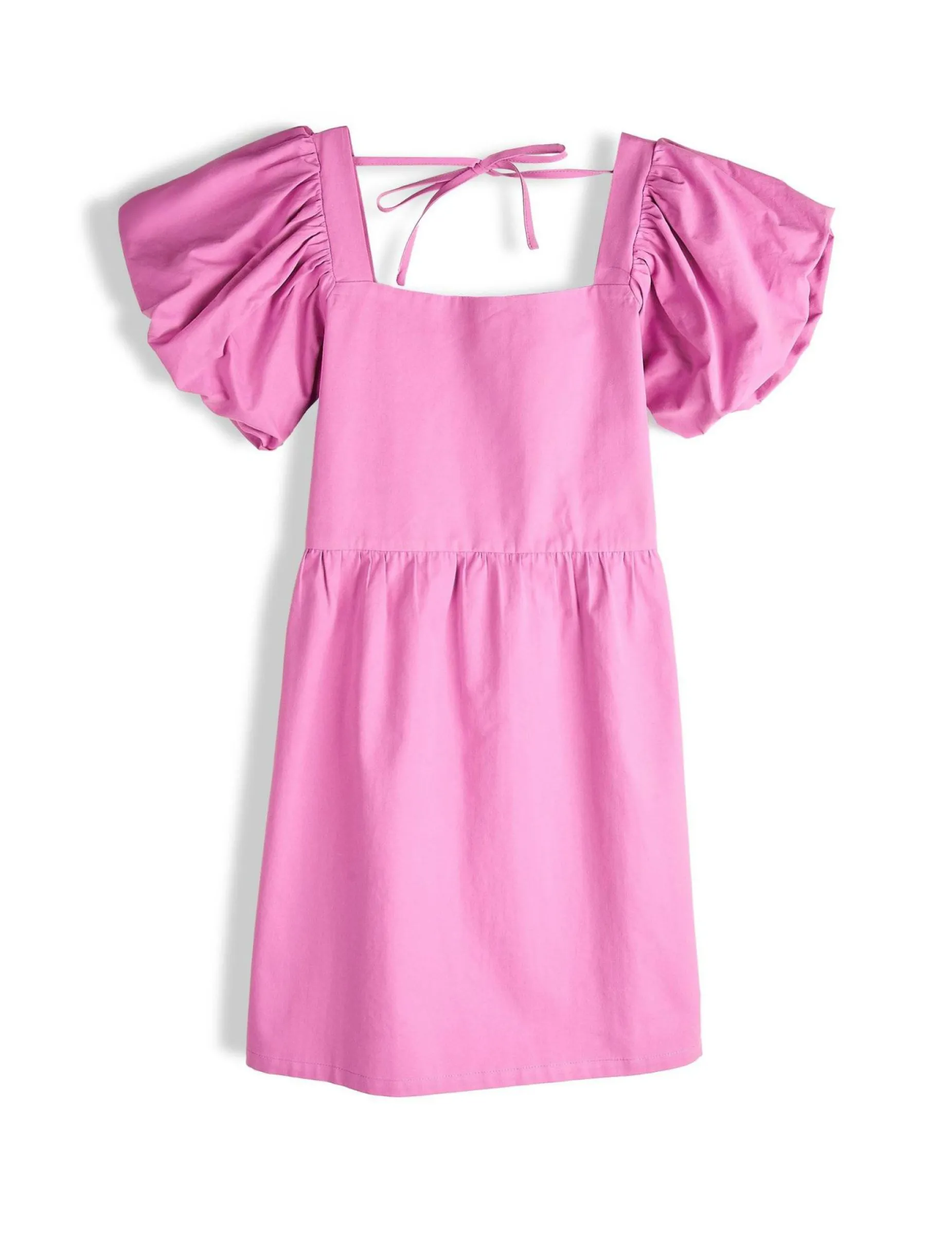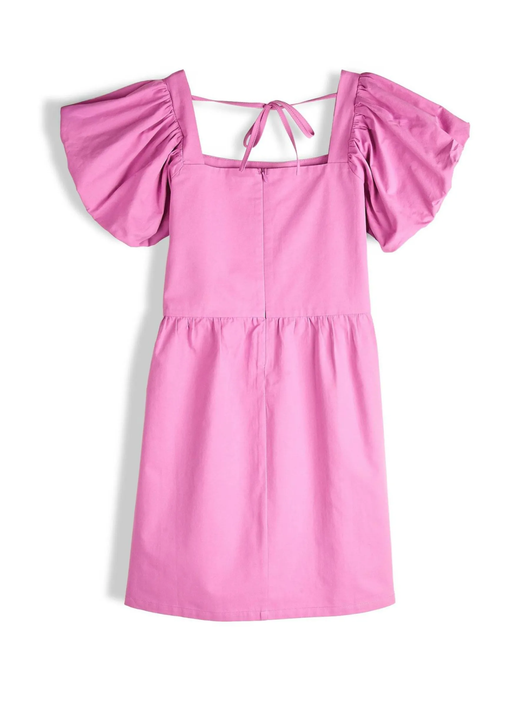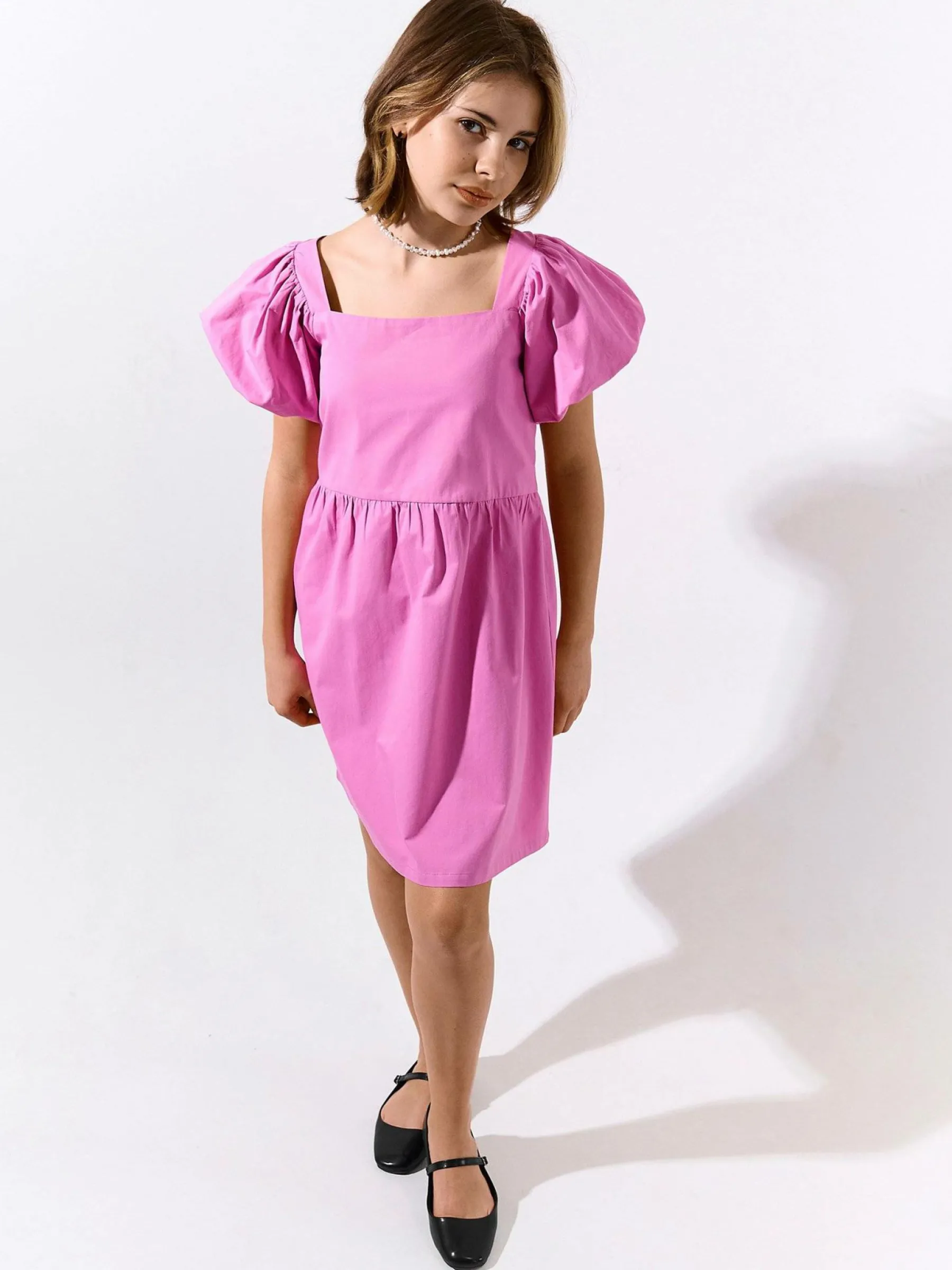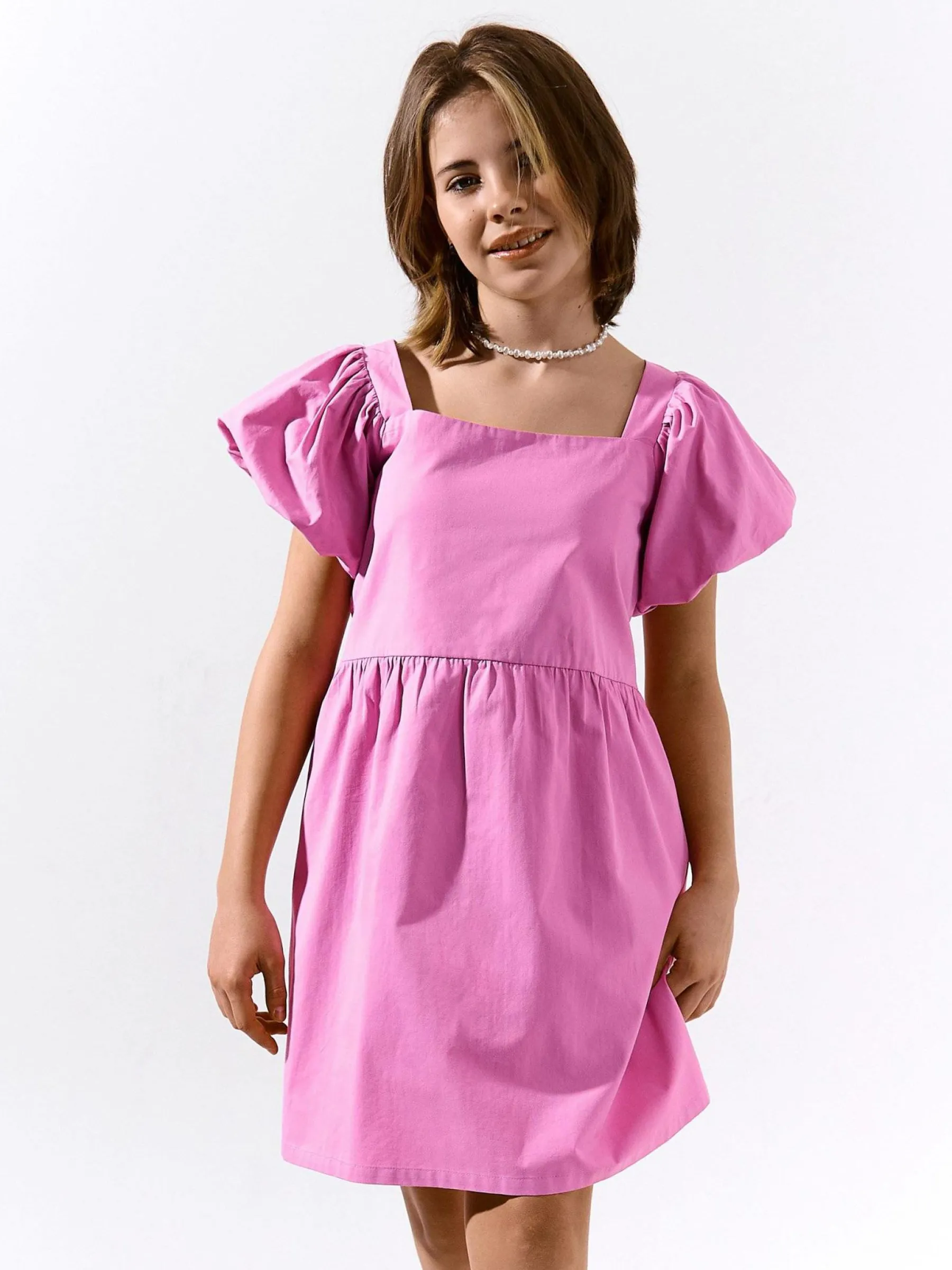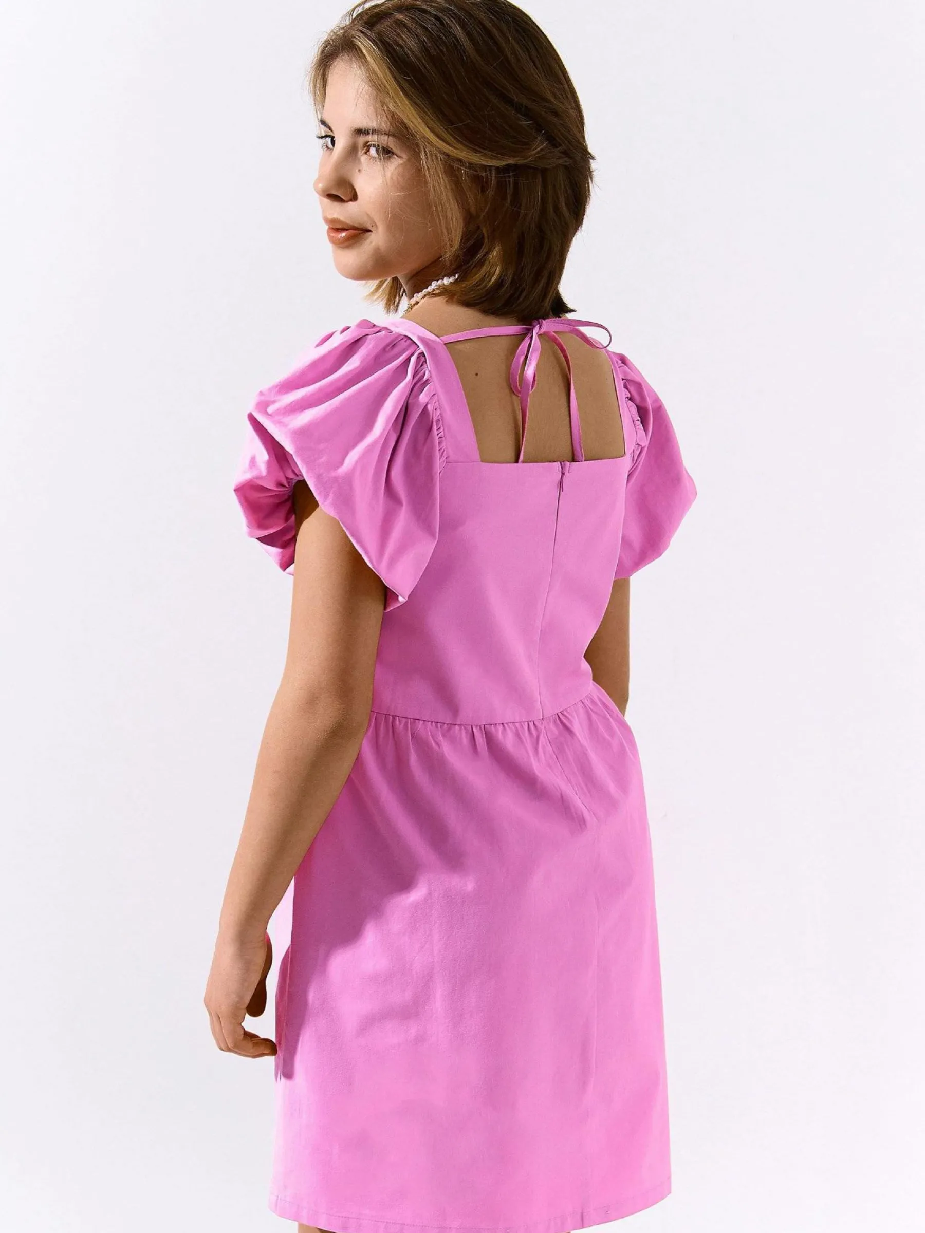 Kolor: różowyKrój: z falbanąTyp: sukienkaRekaw: krótki rękawDługość: miniPattern style: pojedynczy kolorDetal: …