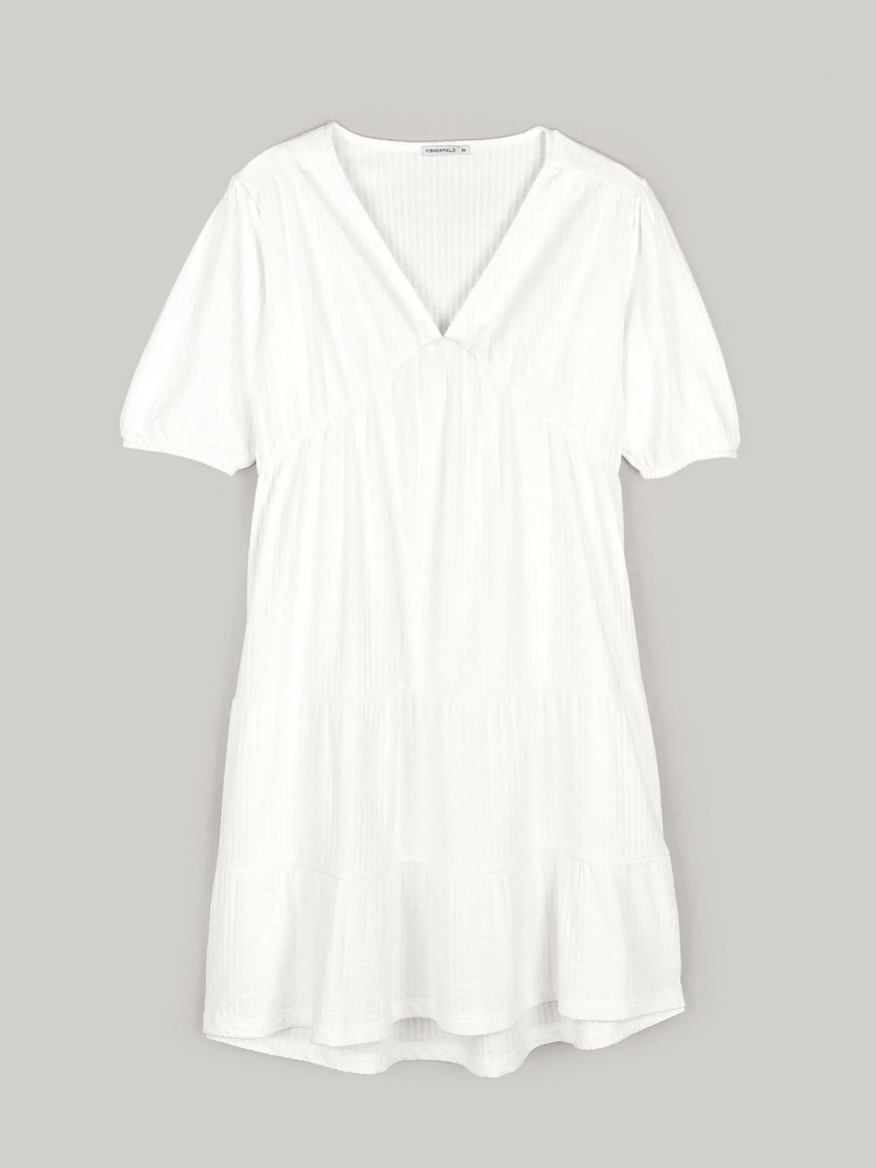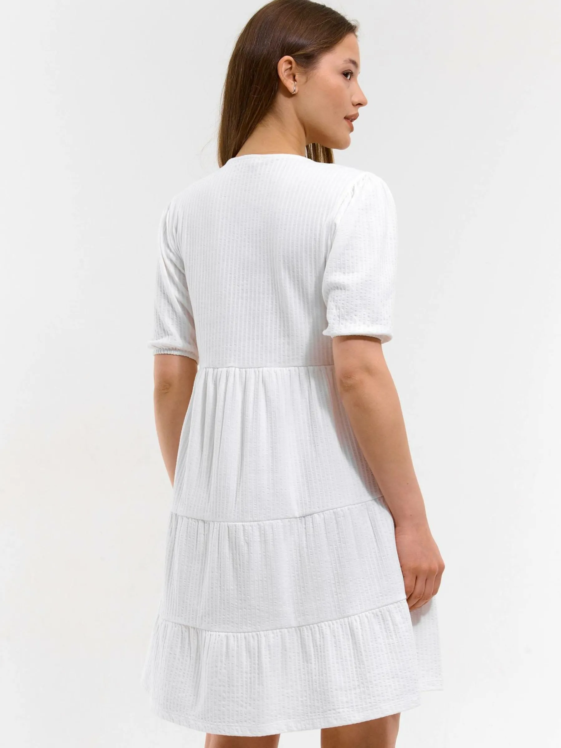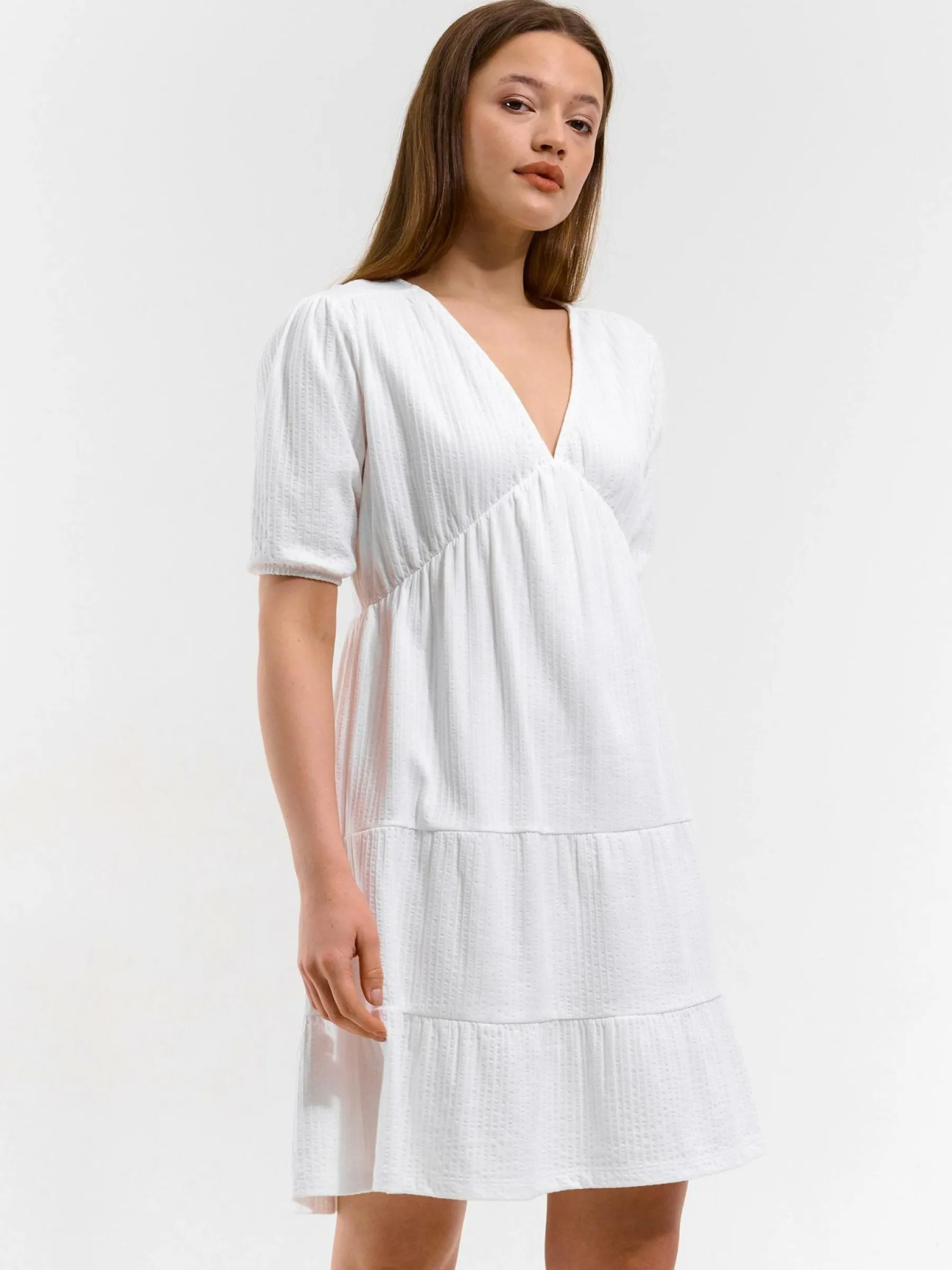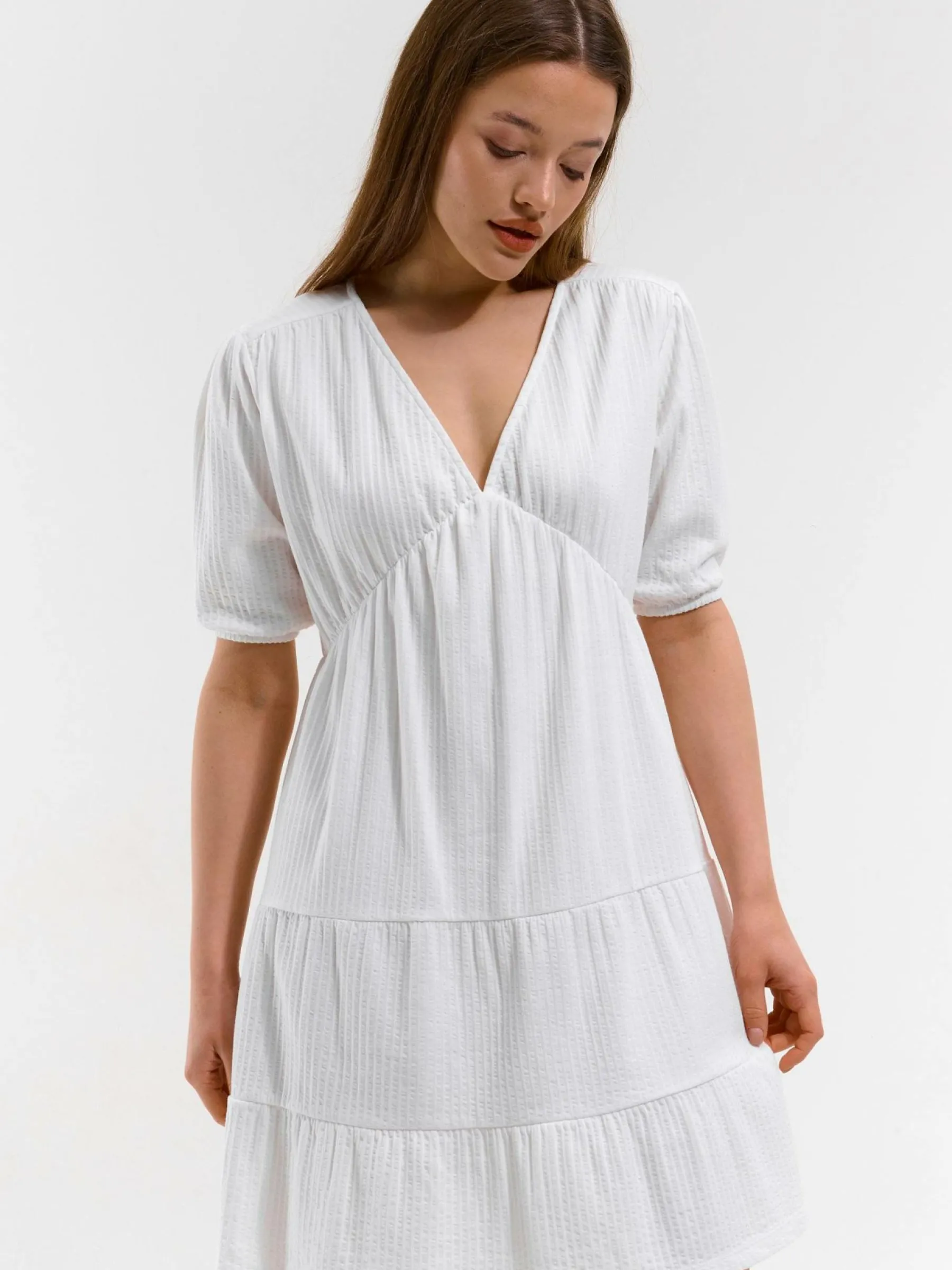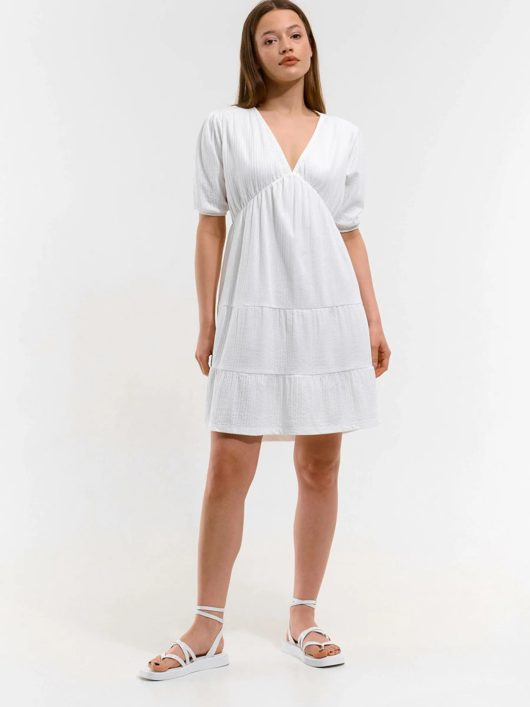 Kolor: białyKrój: z falbanąTyp: sukienkaRekaw: krótki rękawDługość: miniPattern style: pojedynczy kolorDetal: v-…