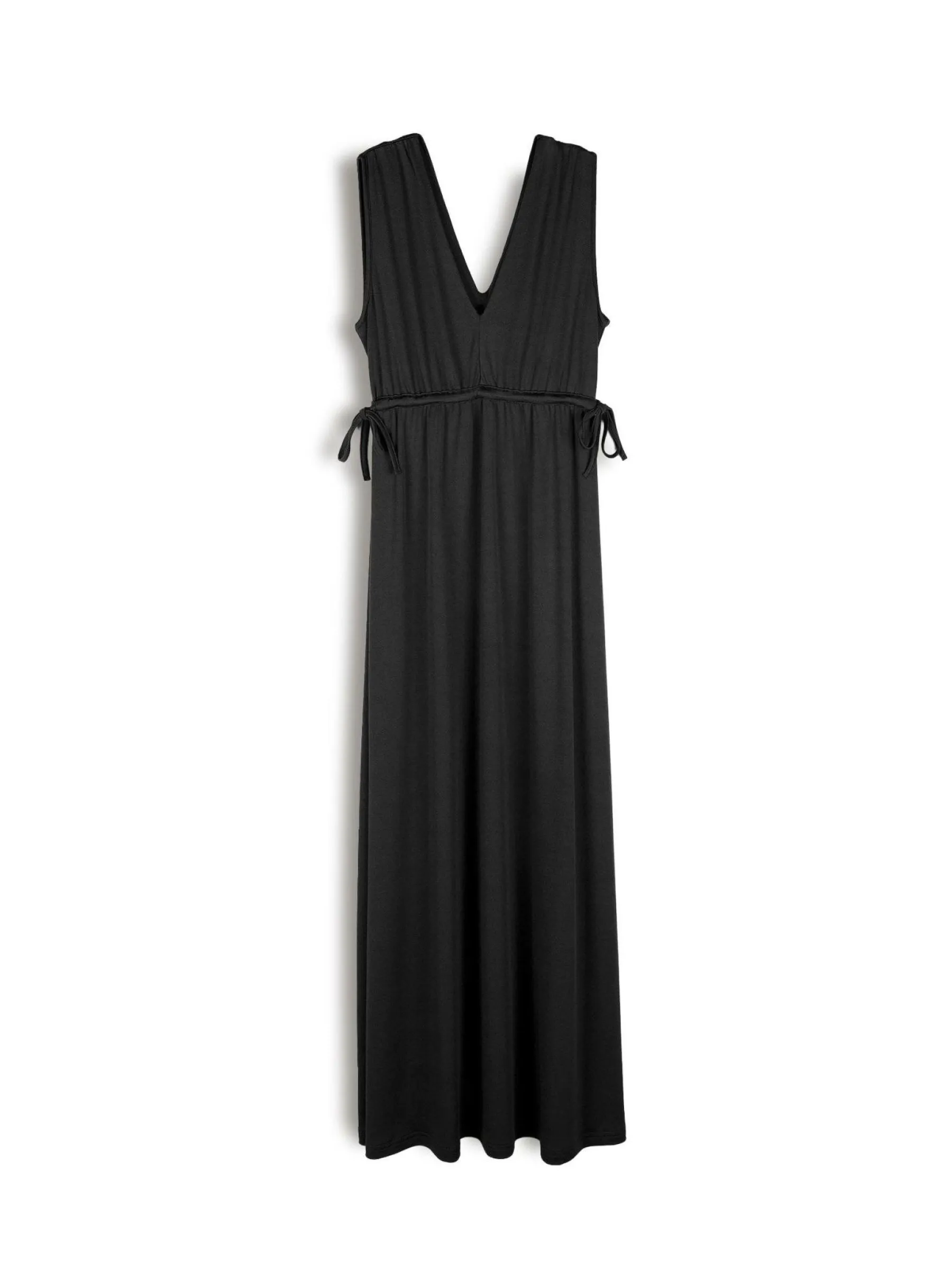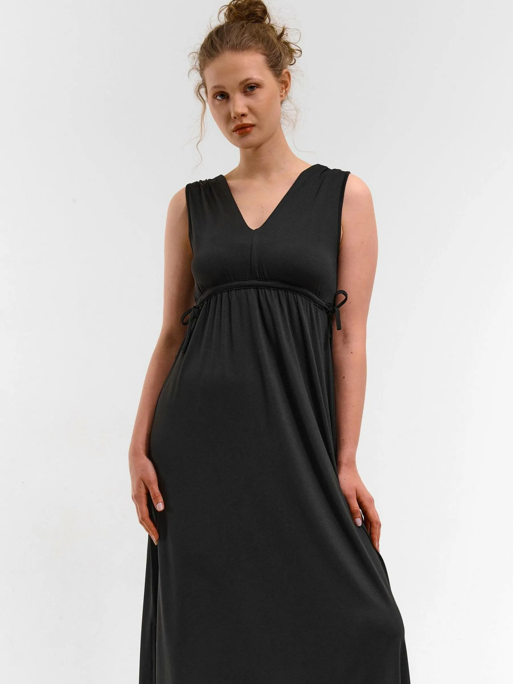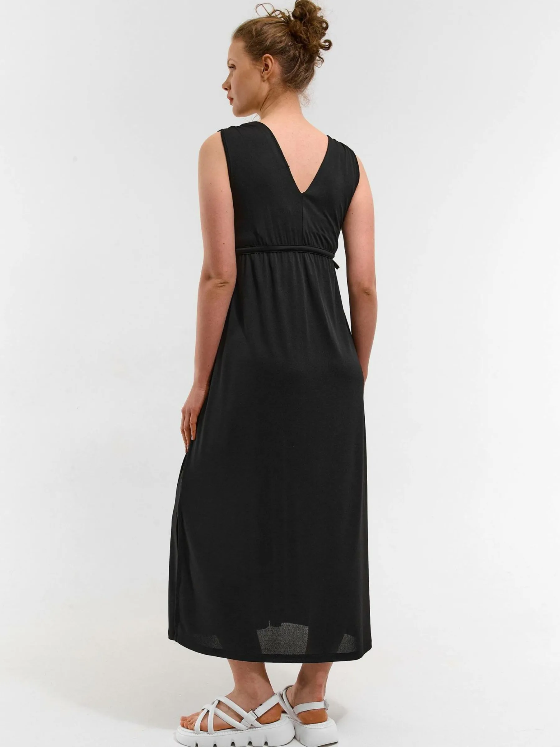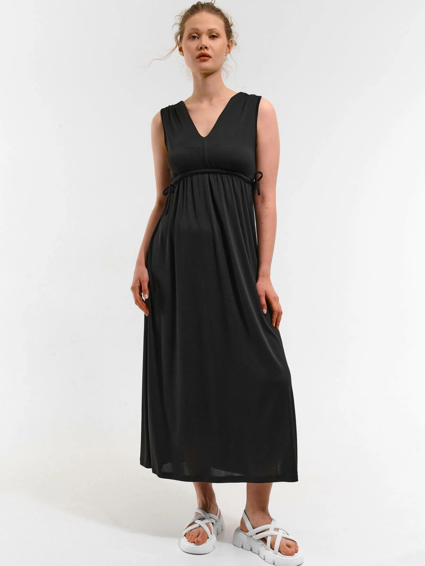 Kolor: czarnyKrój: z marszczeniemTyp: sukienkaRekaw: bez rękawówDługość: midiPattern style: pojedynczy kolorDetal:…