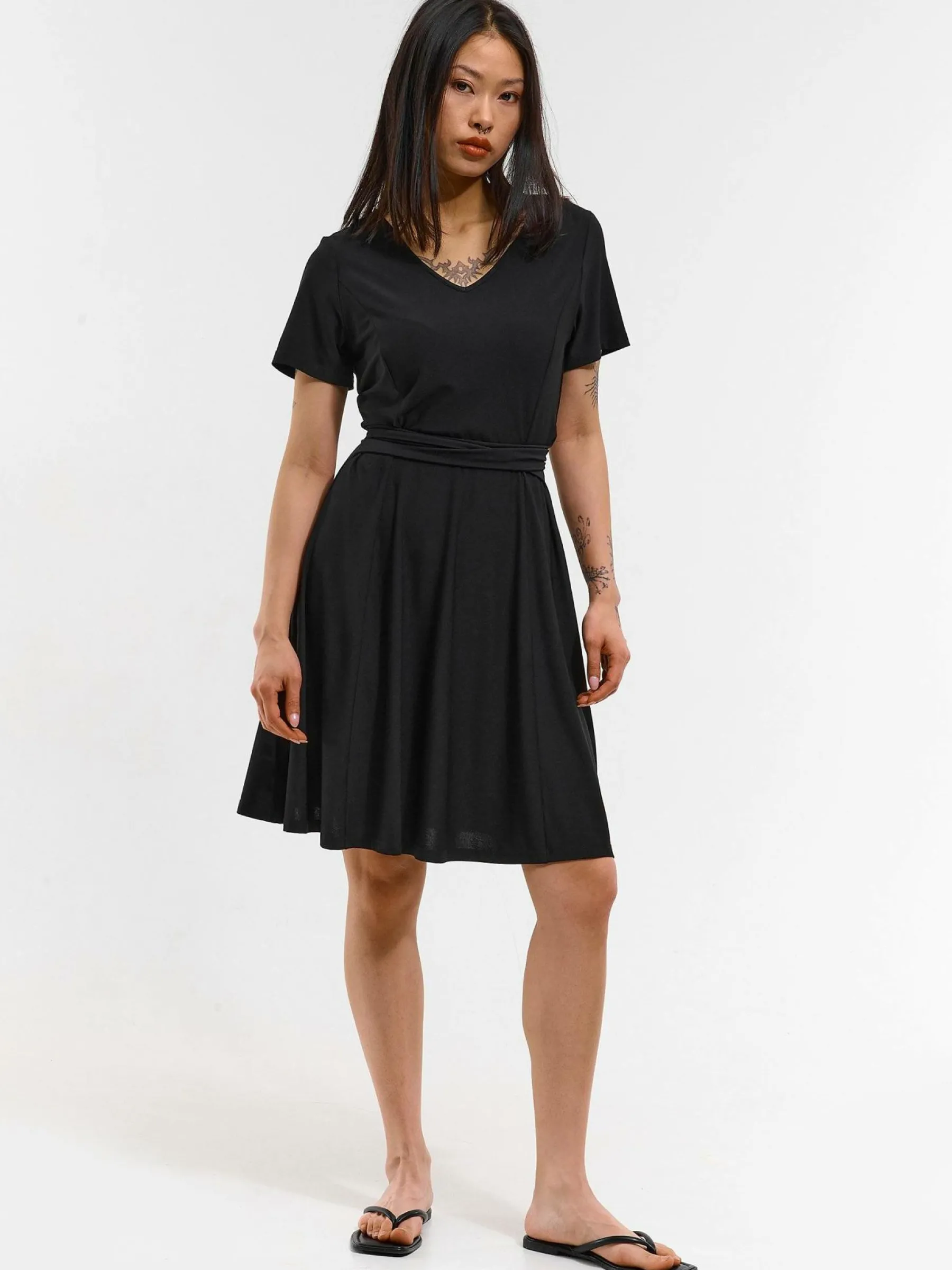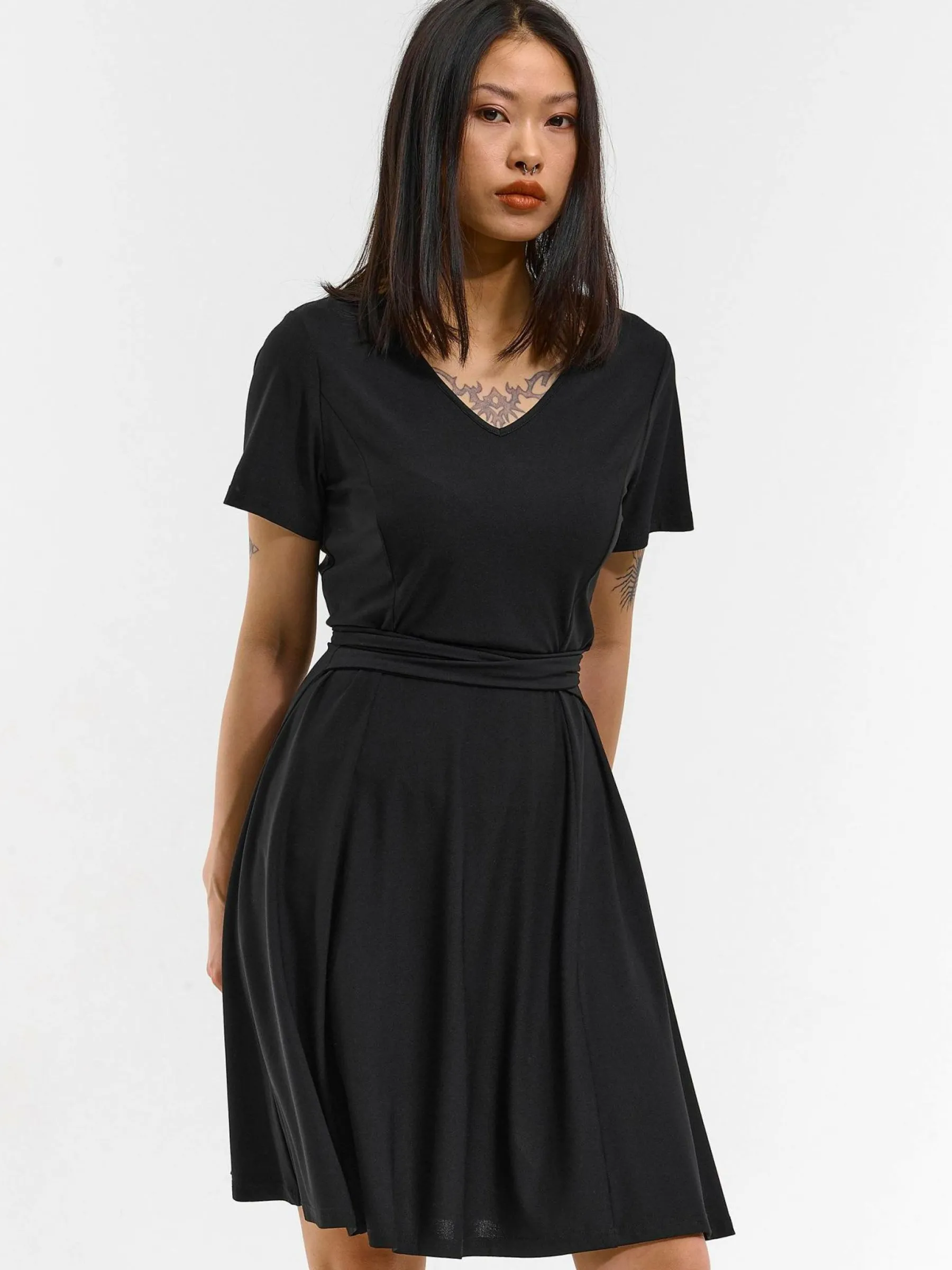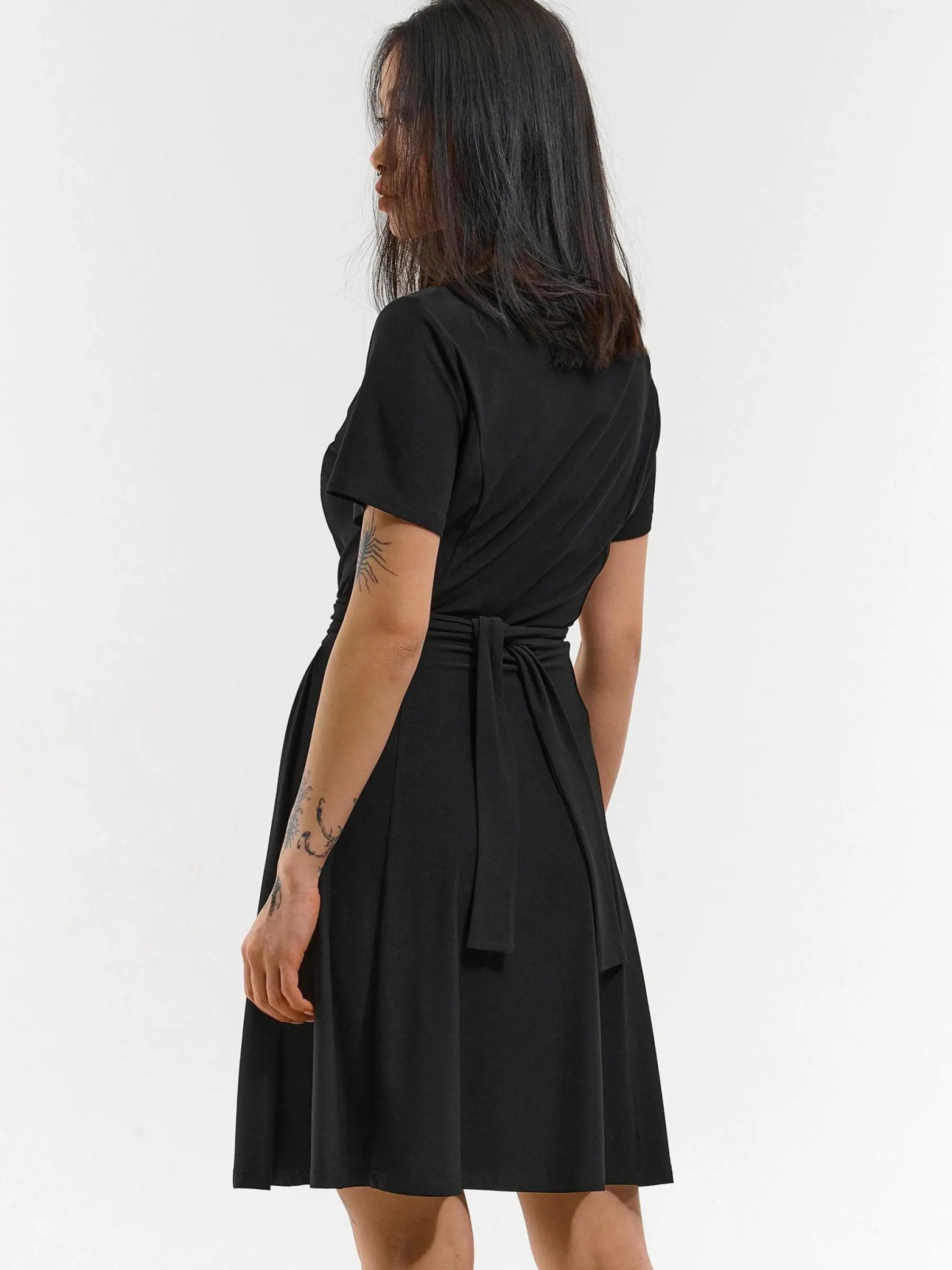 Kolor: czarnyKrój: asyTyp: sukienkaRekaw: krótki rękawDługość: miniPattern style: pojedynczy kolorDetal: z paskiem…